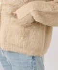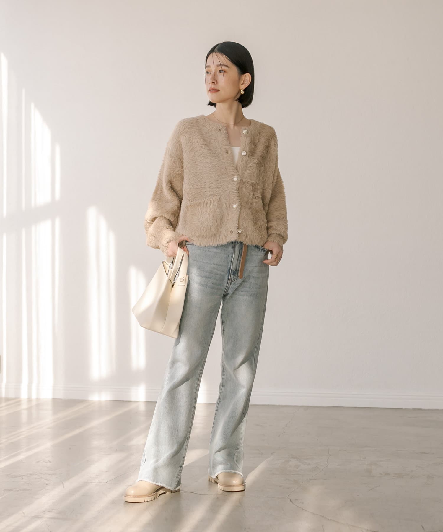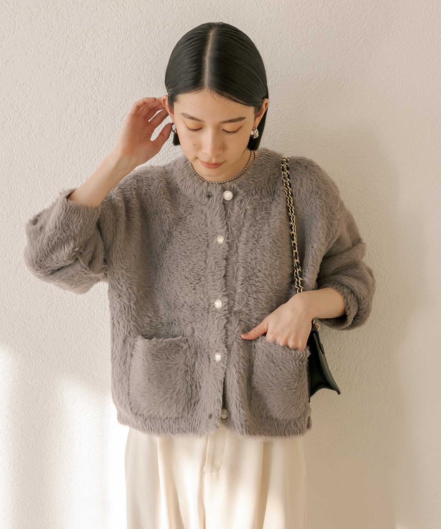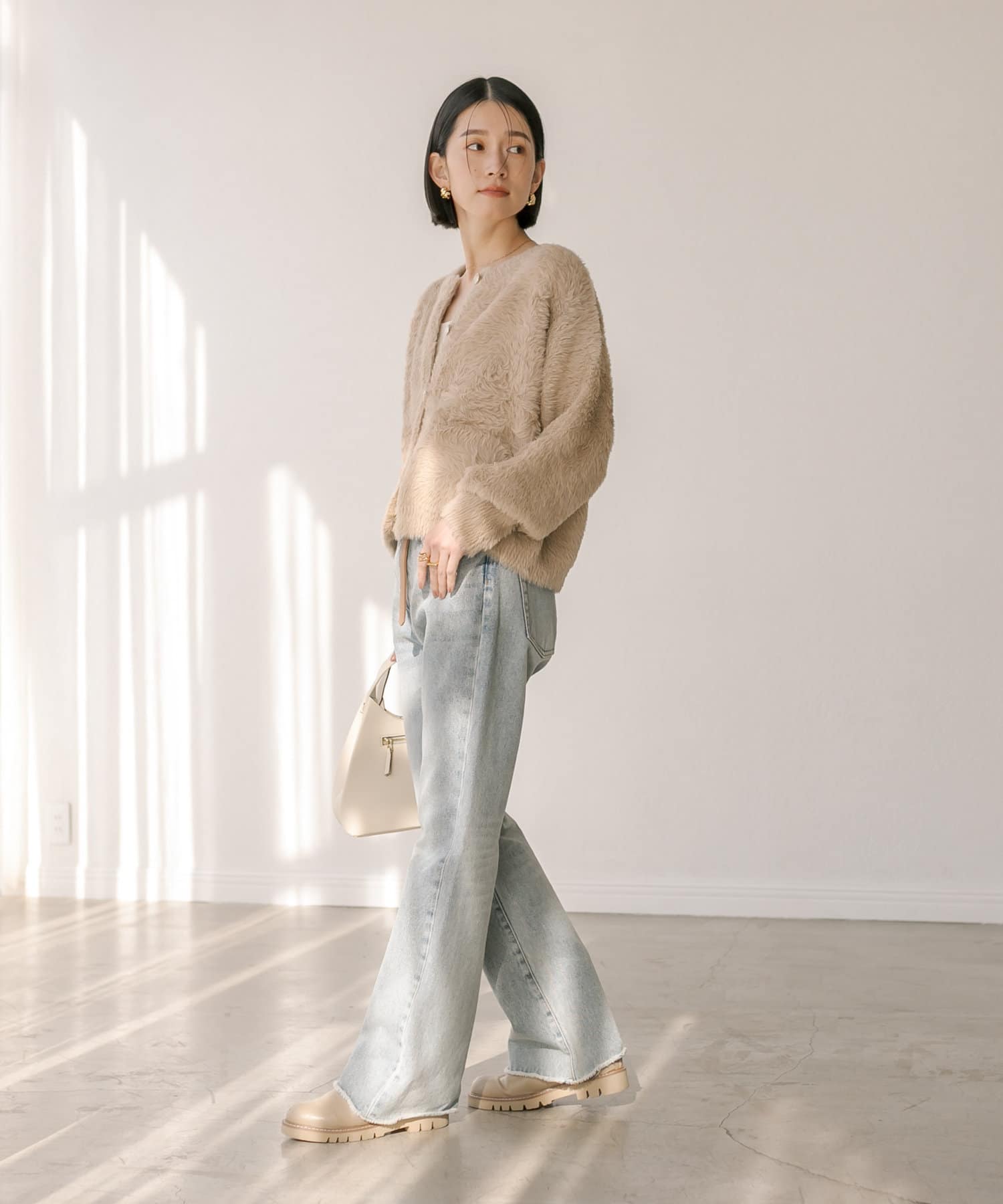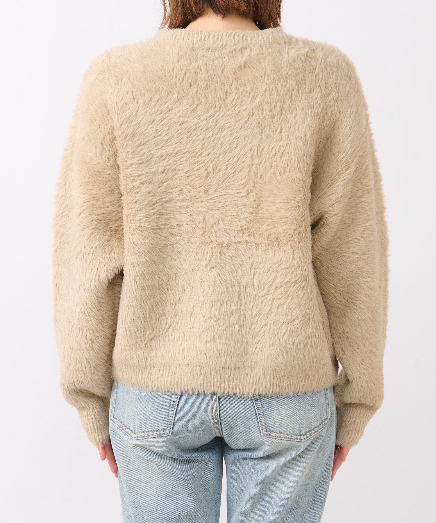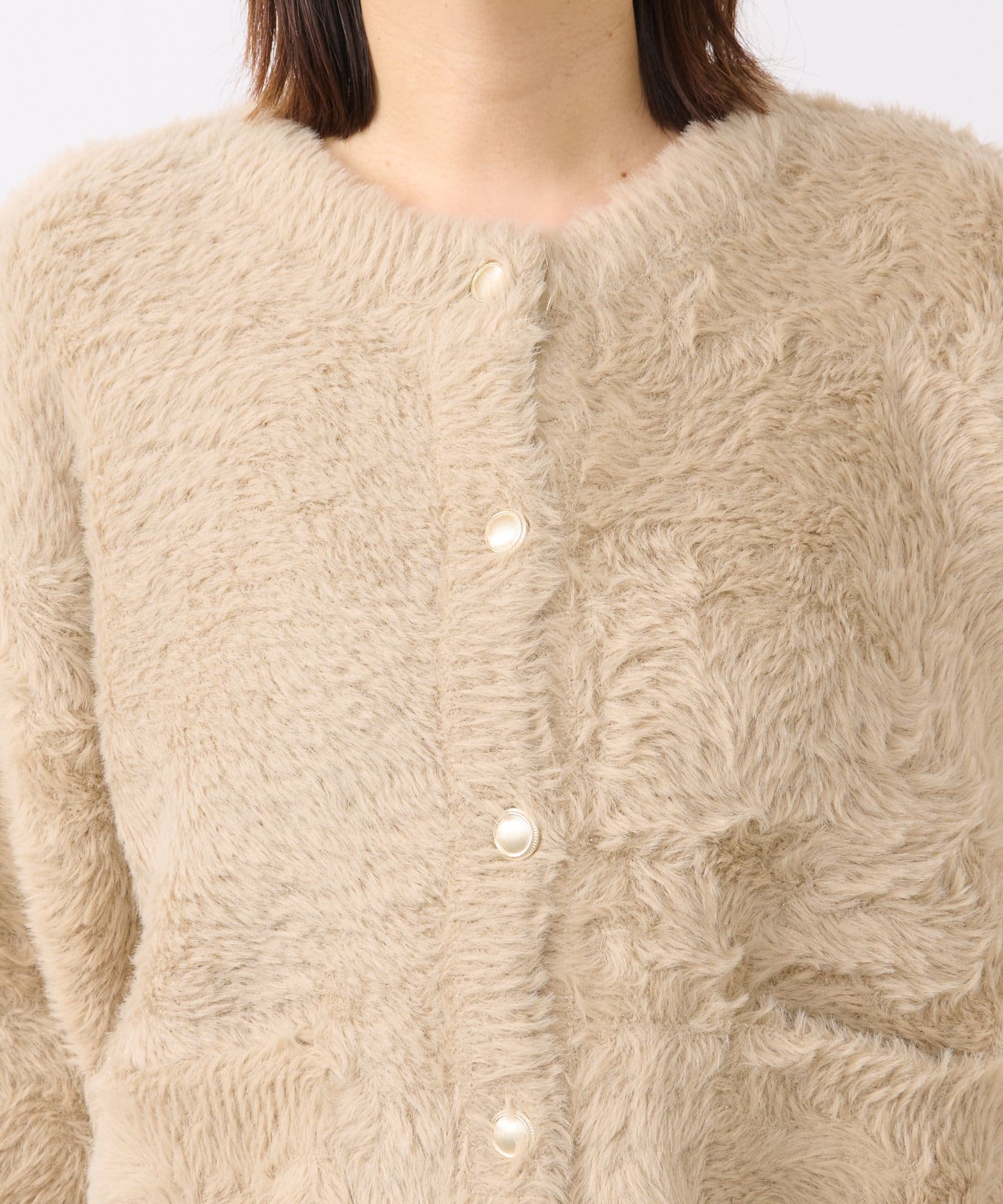 毛足のあるふわふわのフェザーヤーンにラメ糸をMIXした、トレンド感満載のカーディガン。
