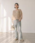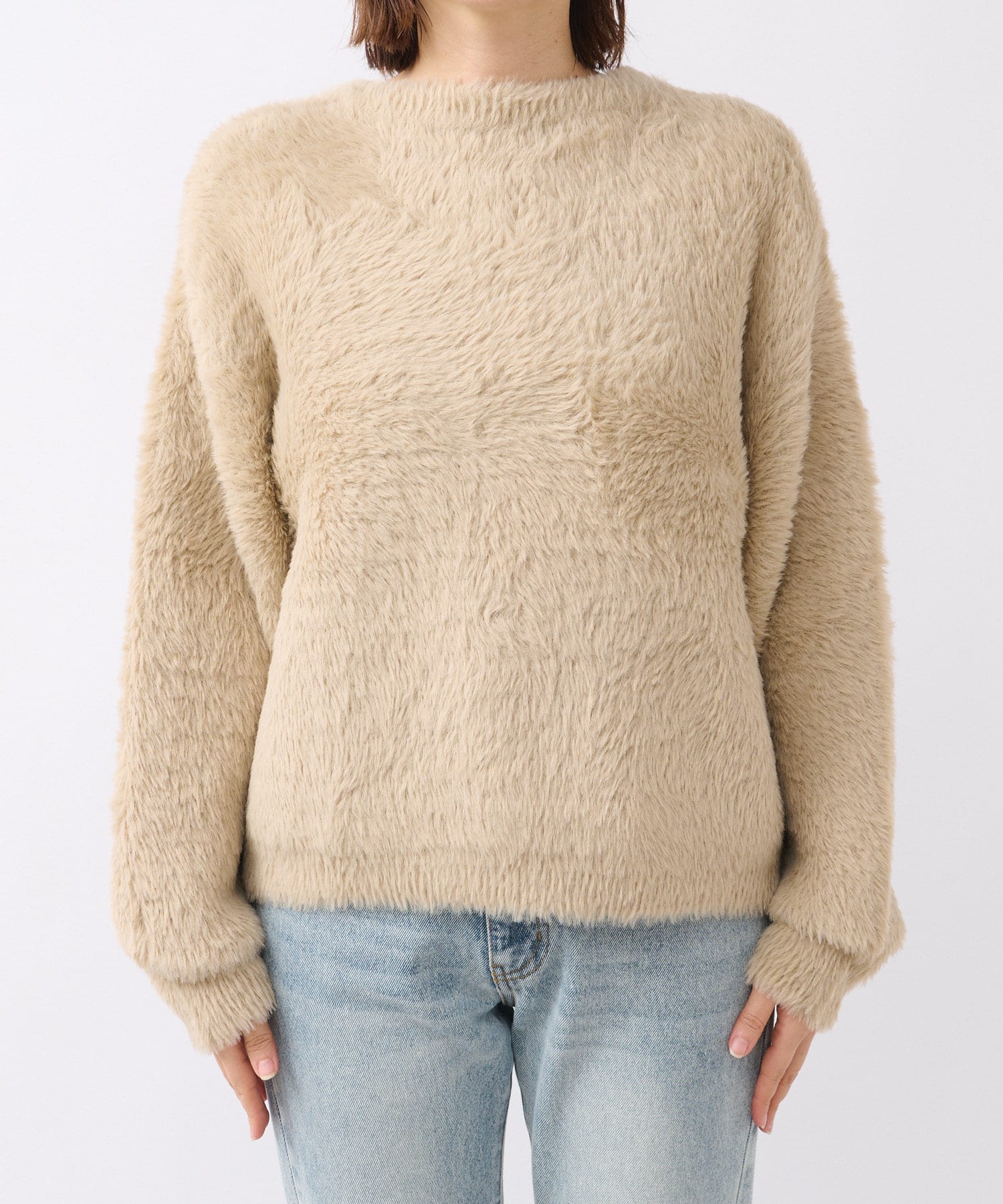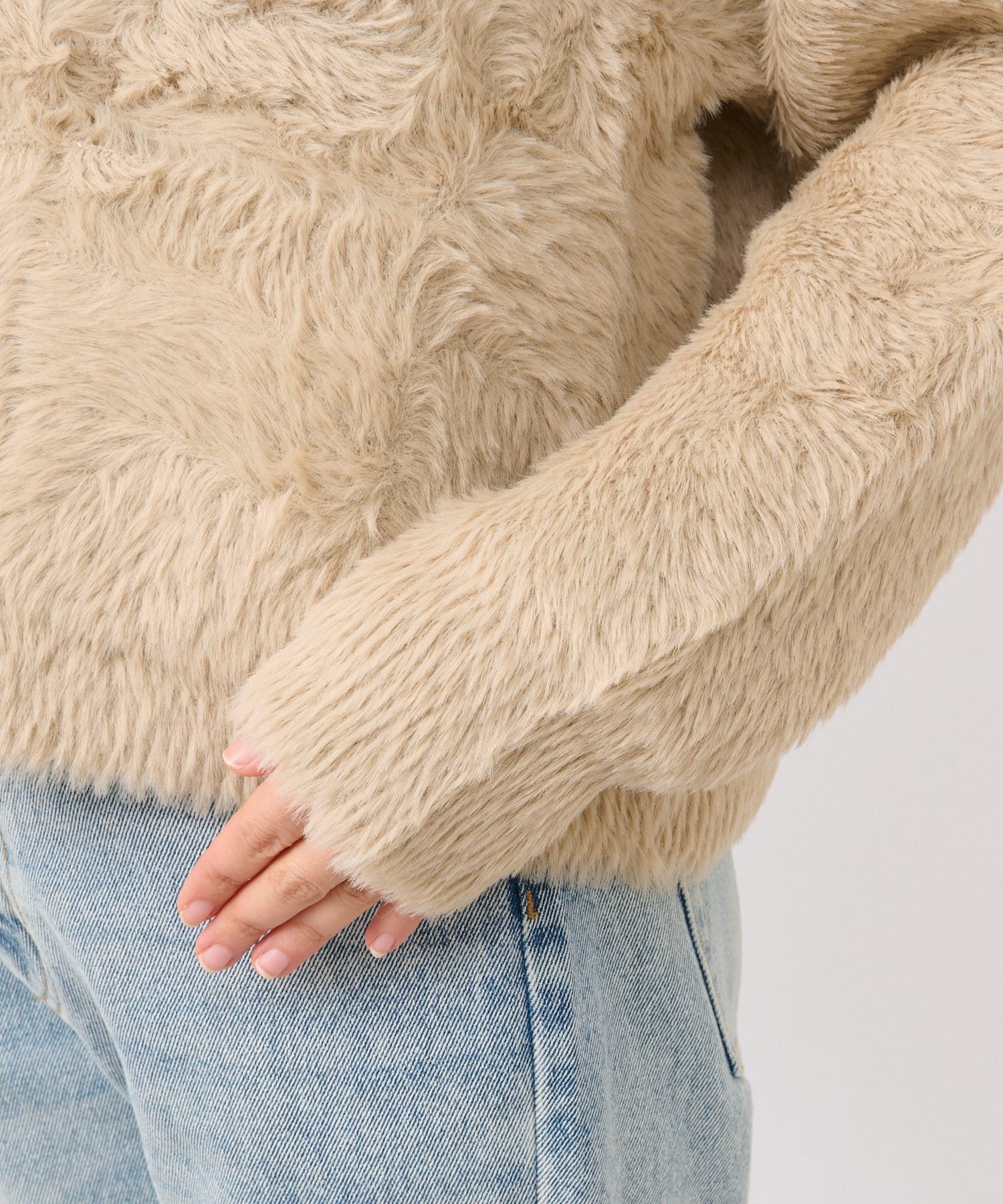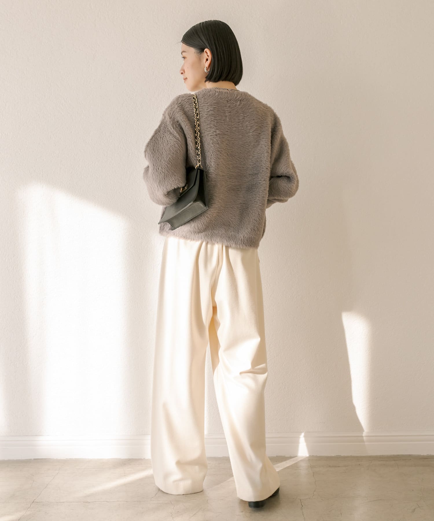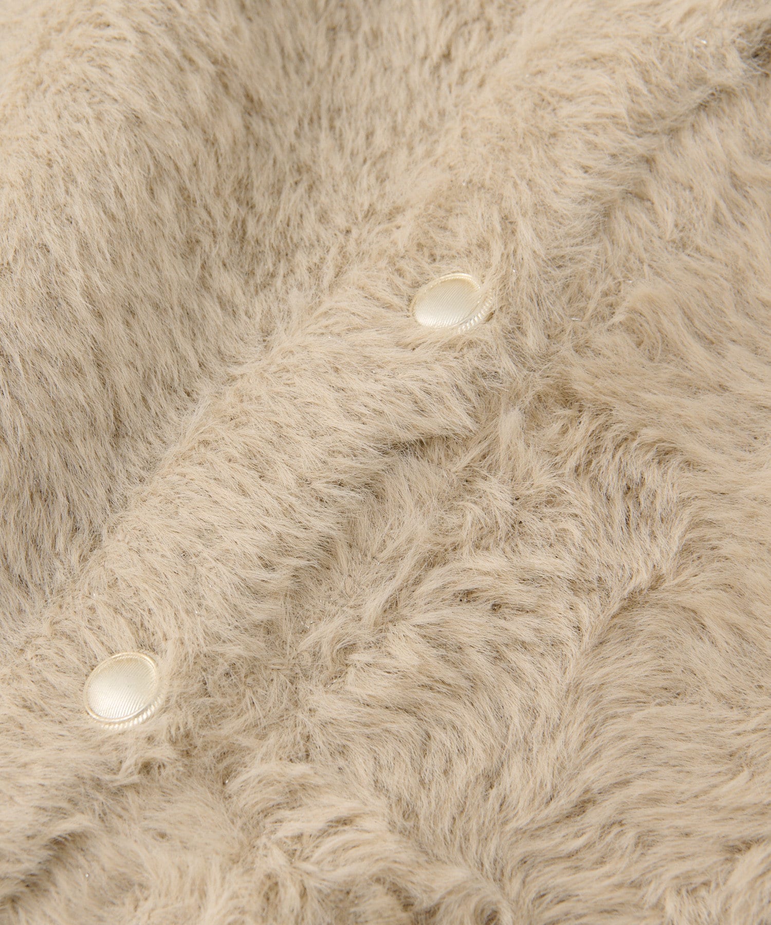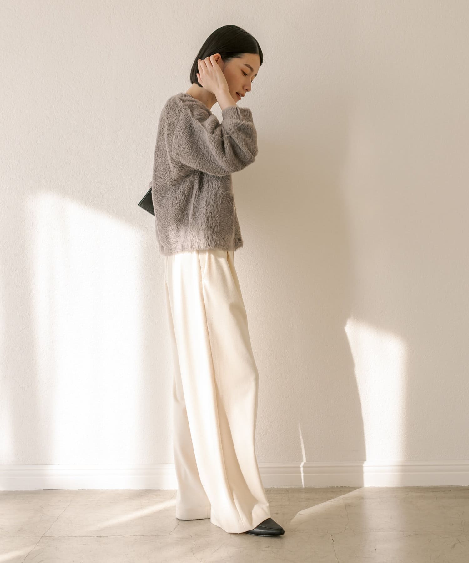 毛足のあるふわふわのフェザーヤーンにラメ糸をMIXした、トレンド感満載のカーディガン。
