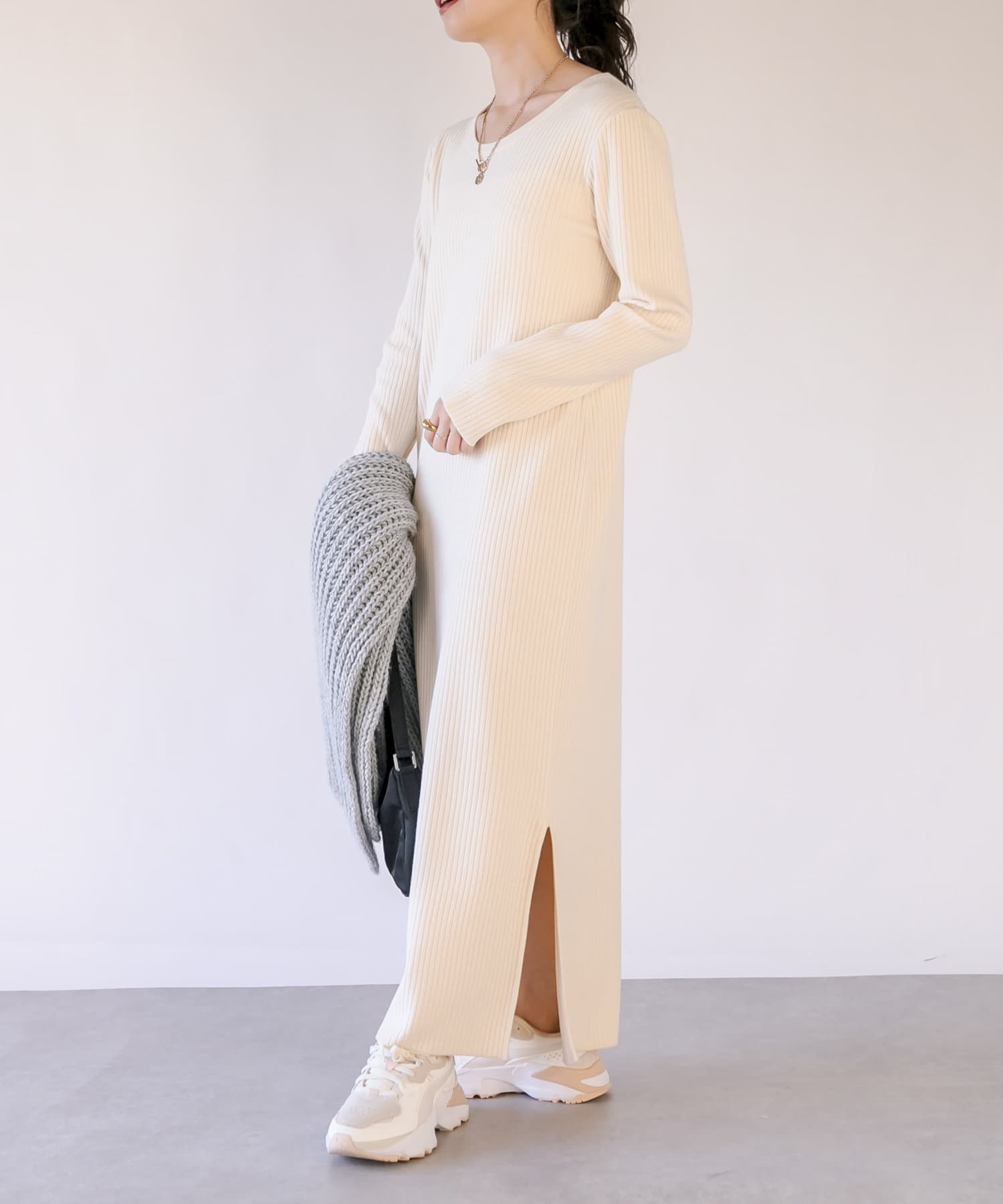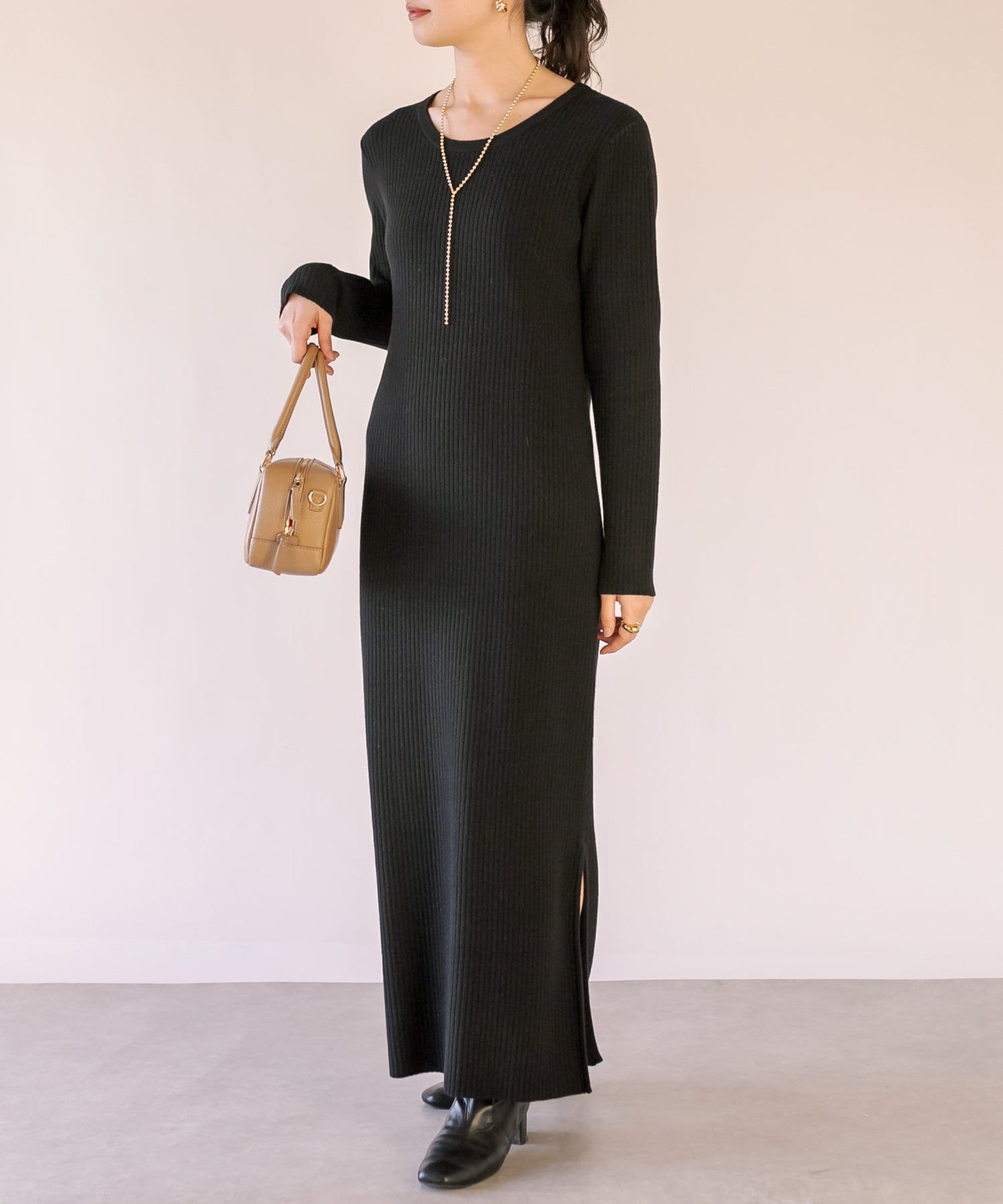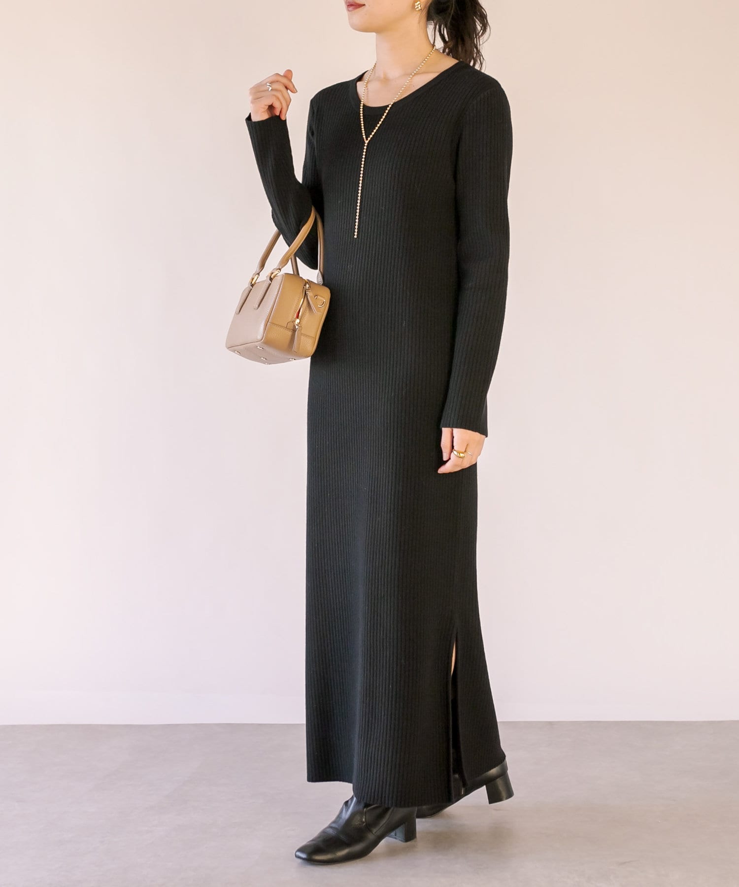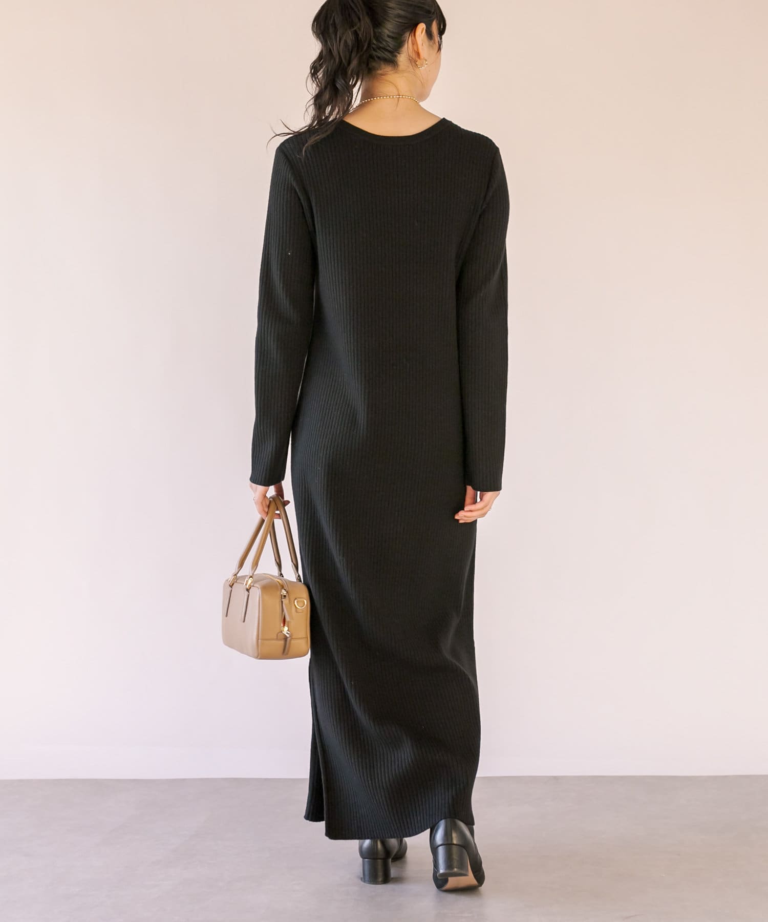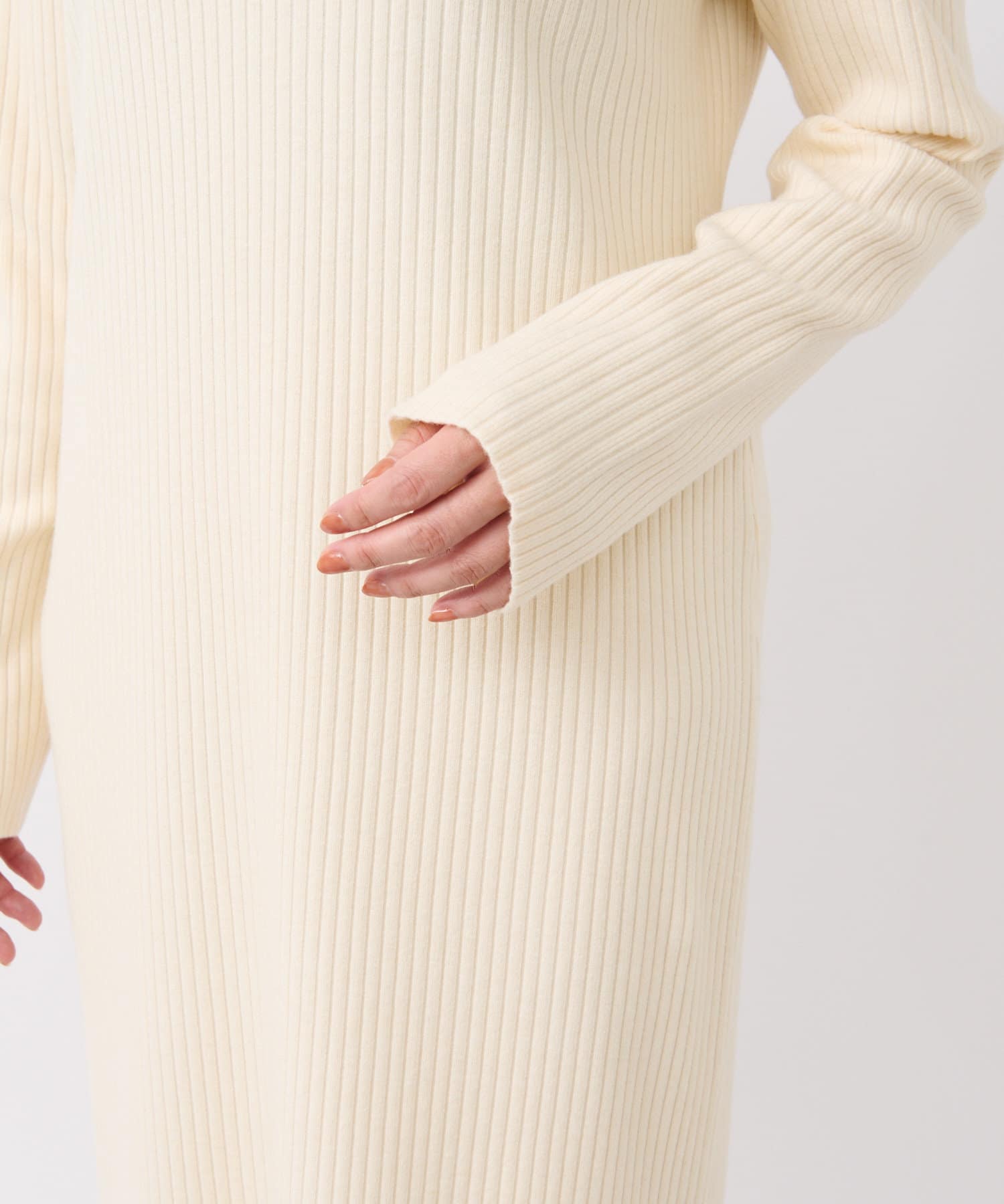 ニットワンピースながら、程よく厚みのあるリブ編みで型崩れしにくく、ボディラインも拾いにくいためスッキリと着ていただけます。