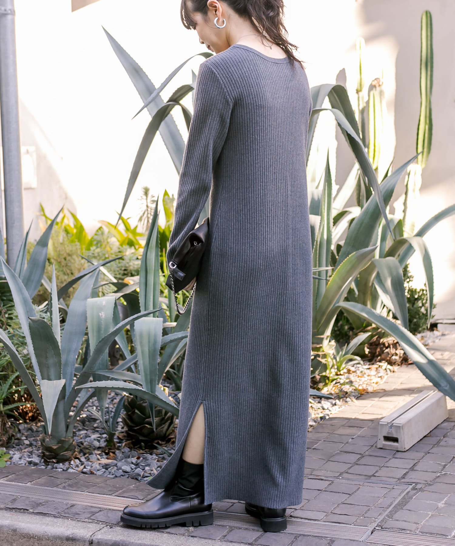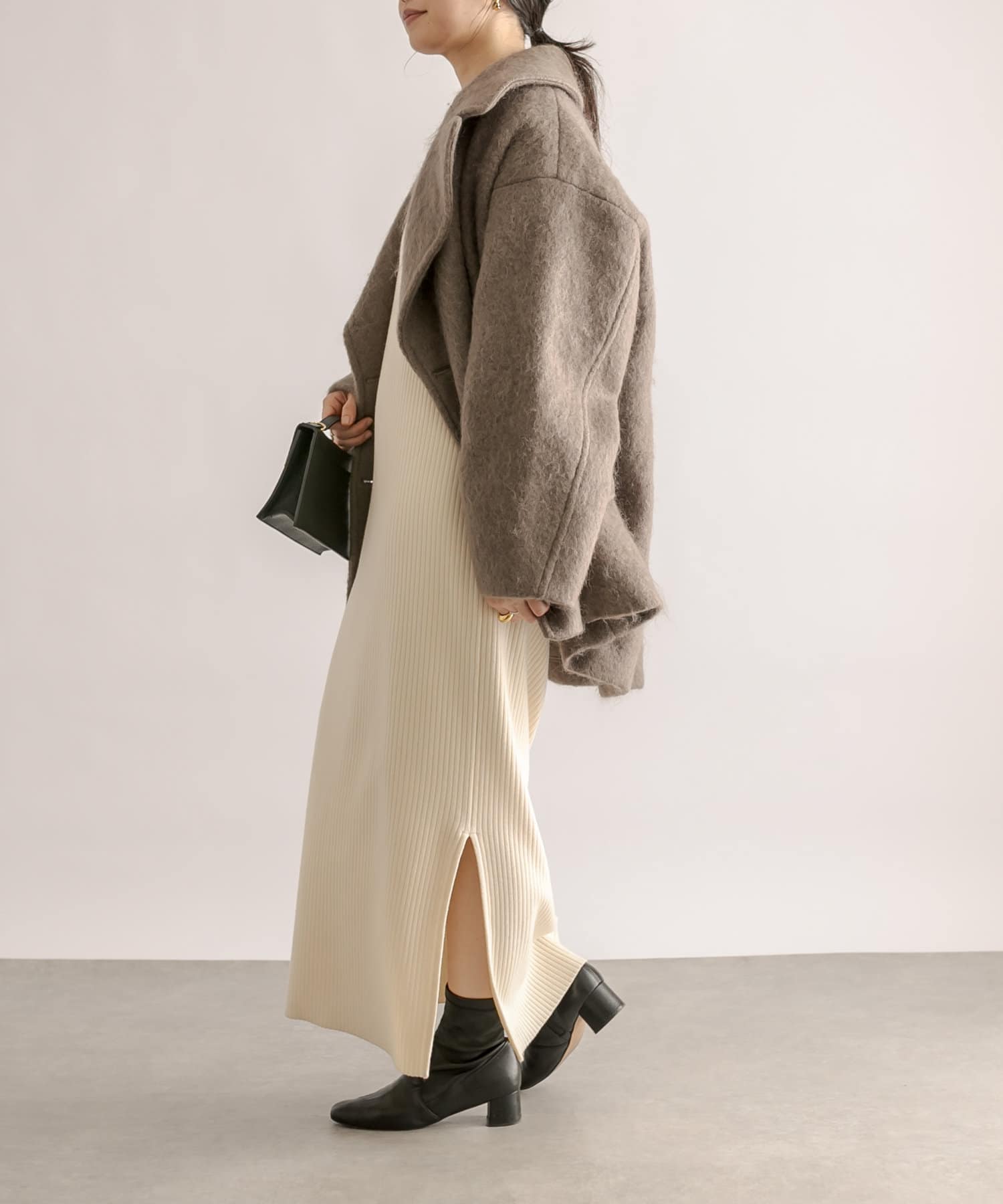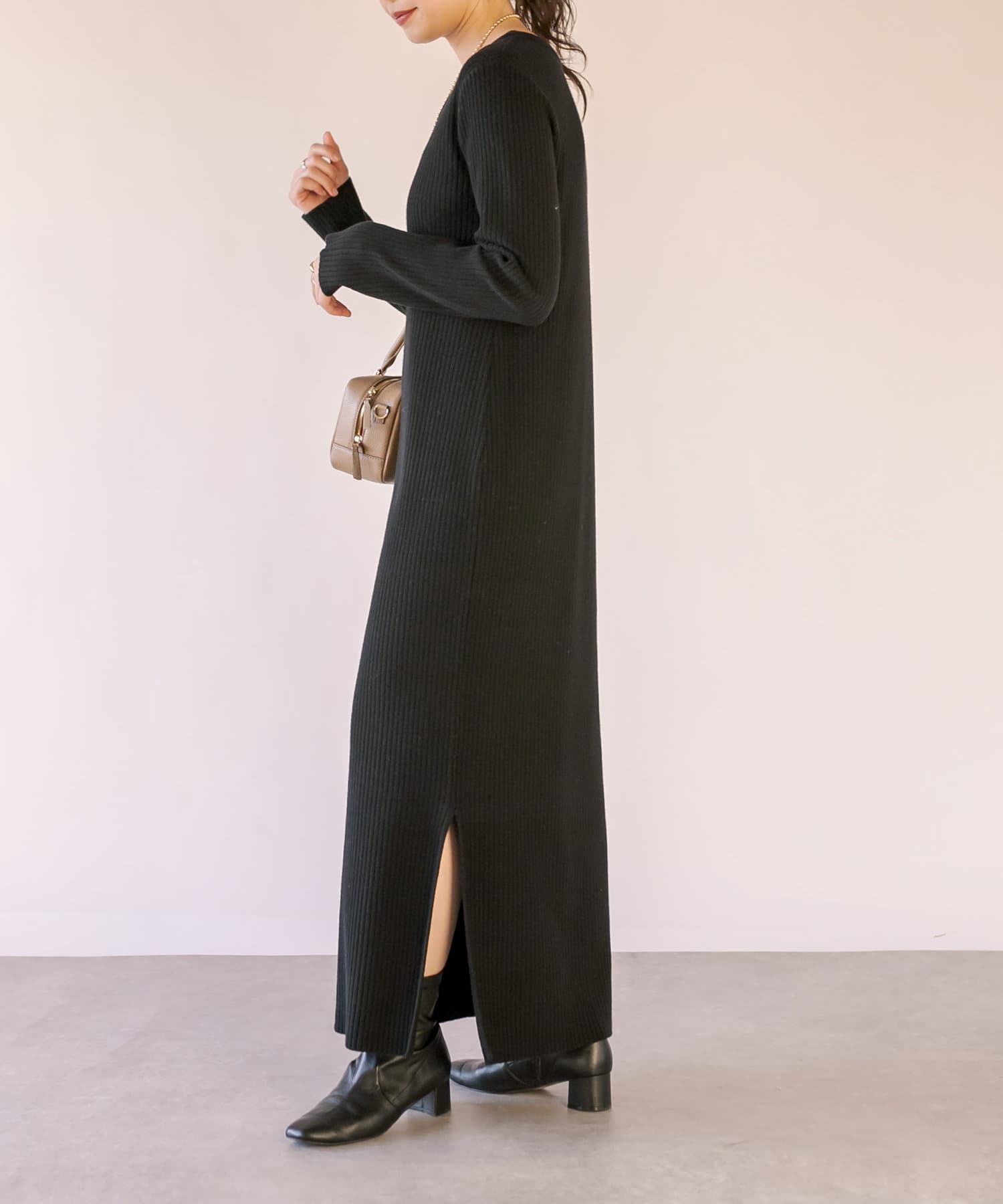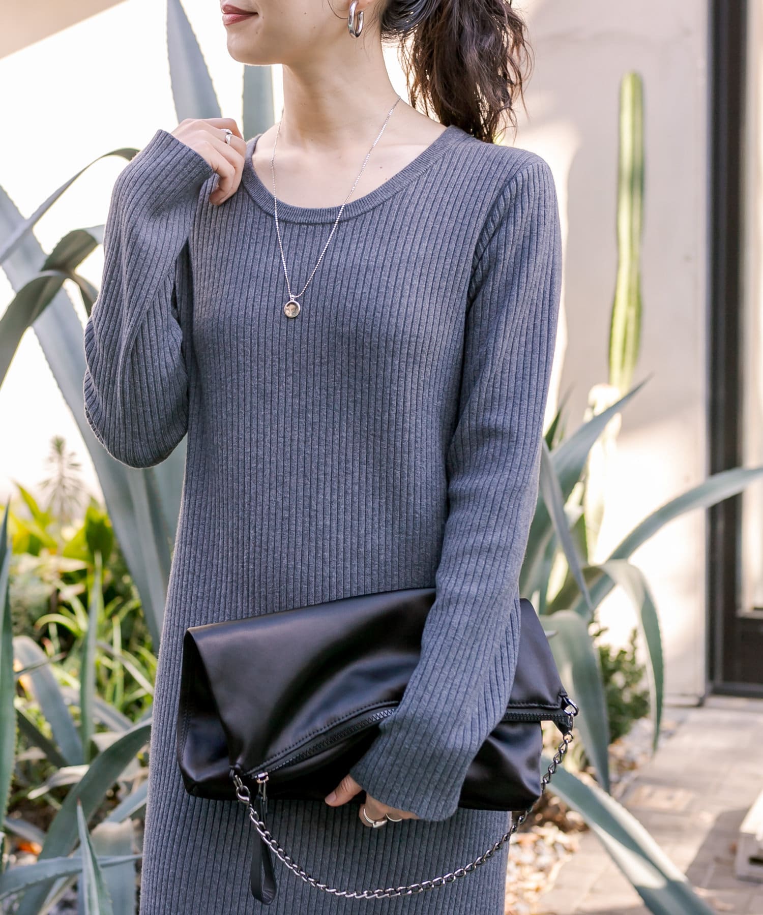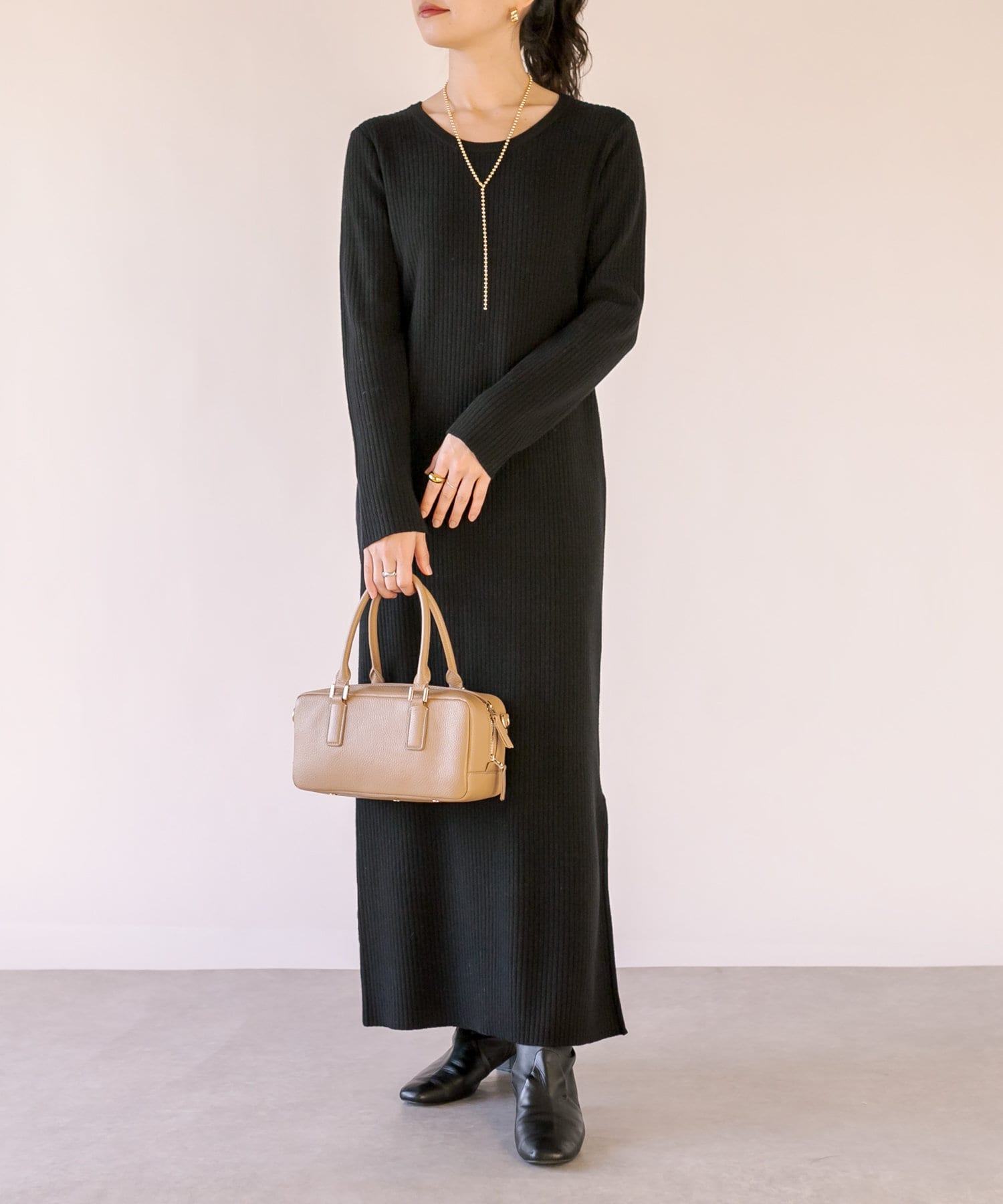 ニットワンピースながら、程よく厚みのあるリブ編みで型崩れしにくく、ボディラインも拾いにくいためスッキリと着ていただけます。