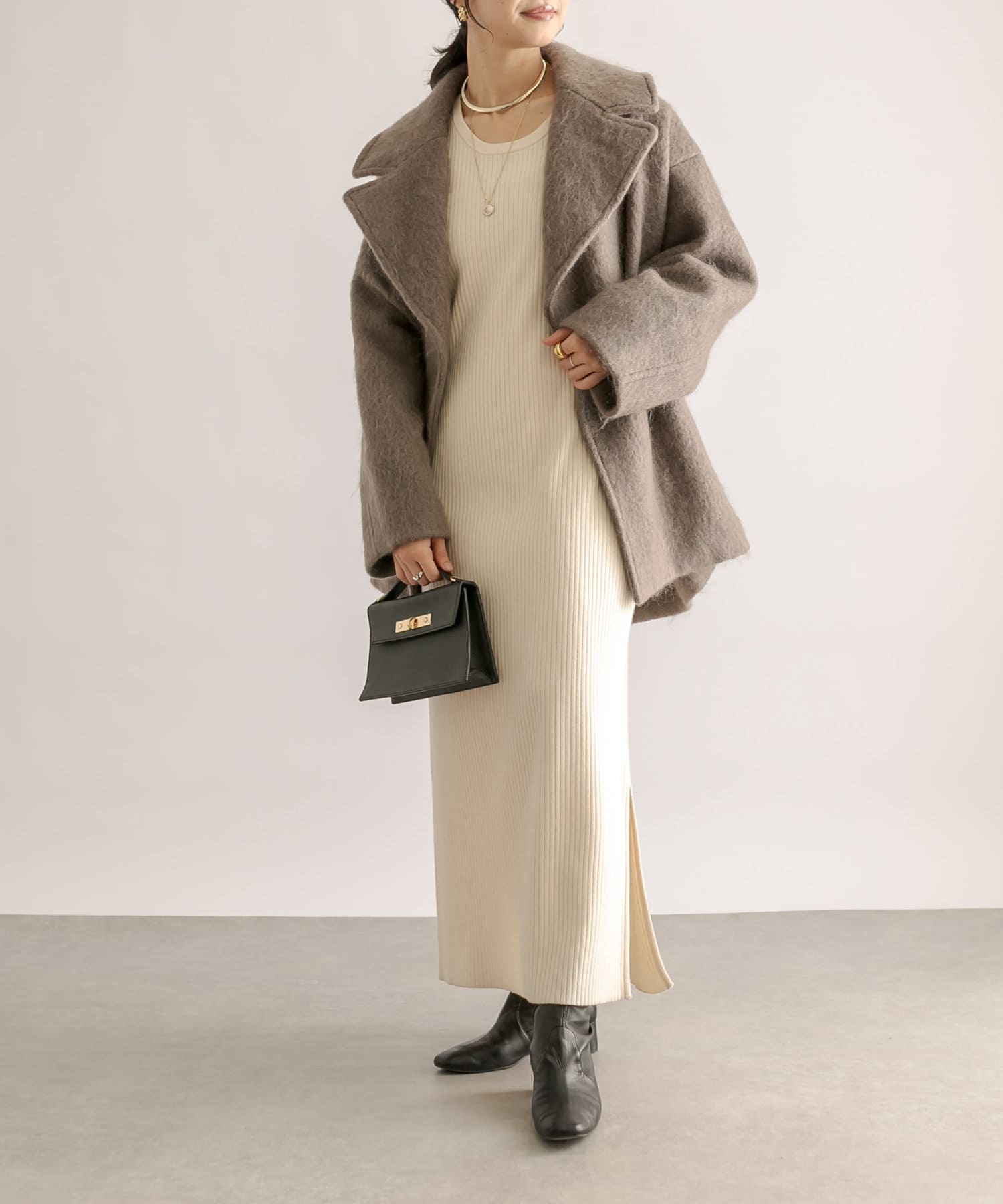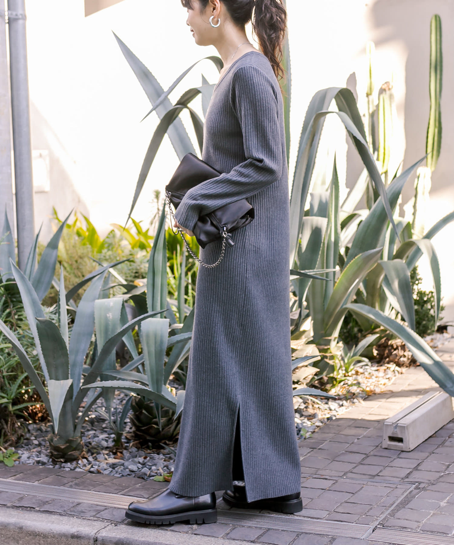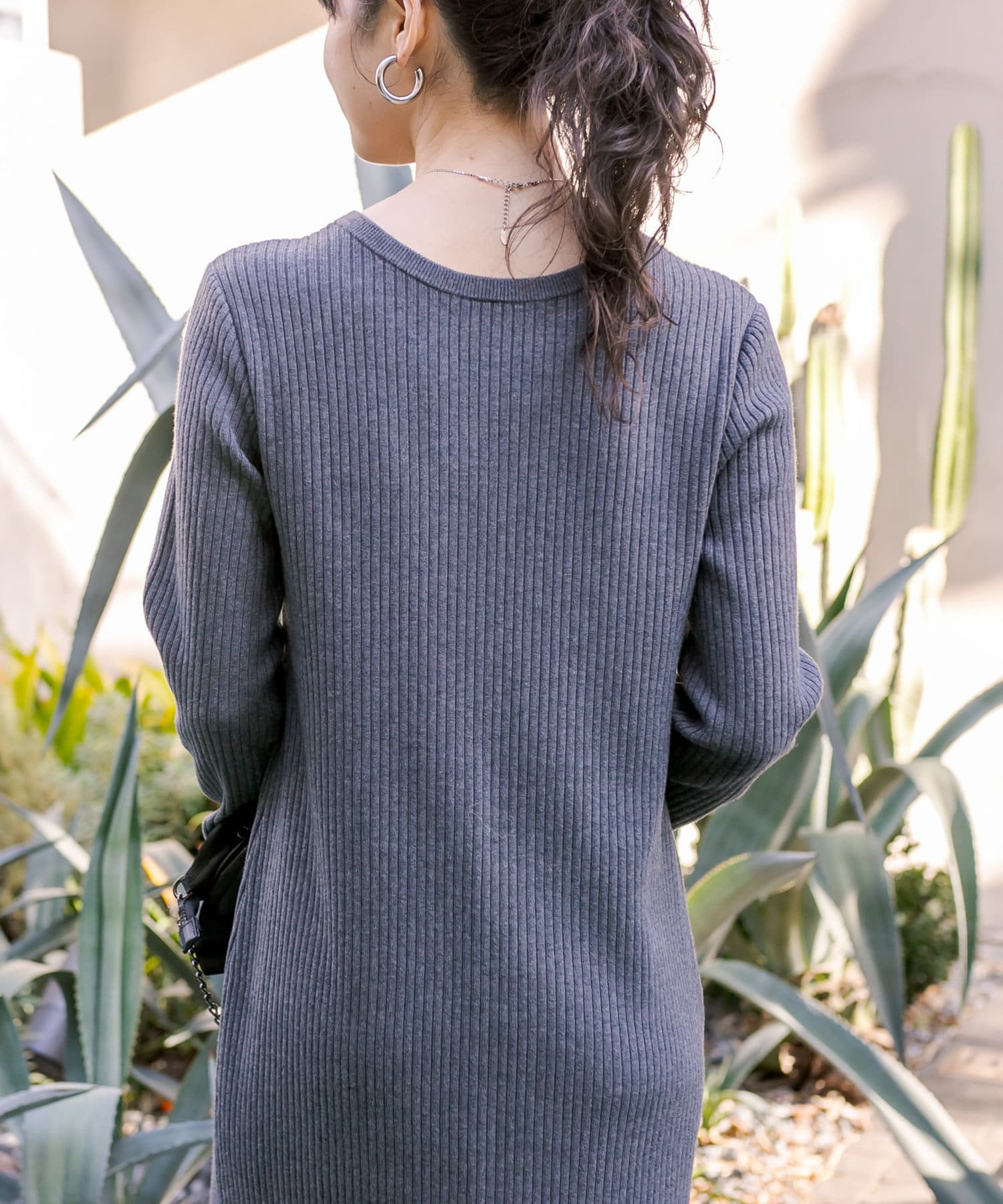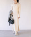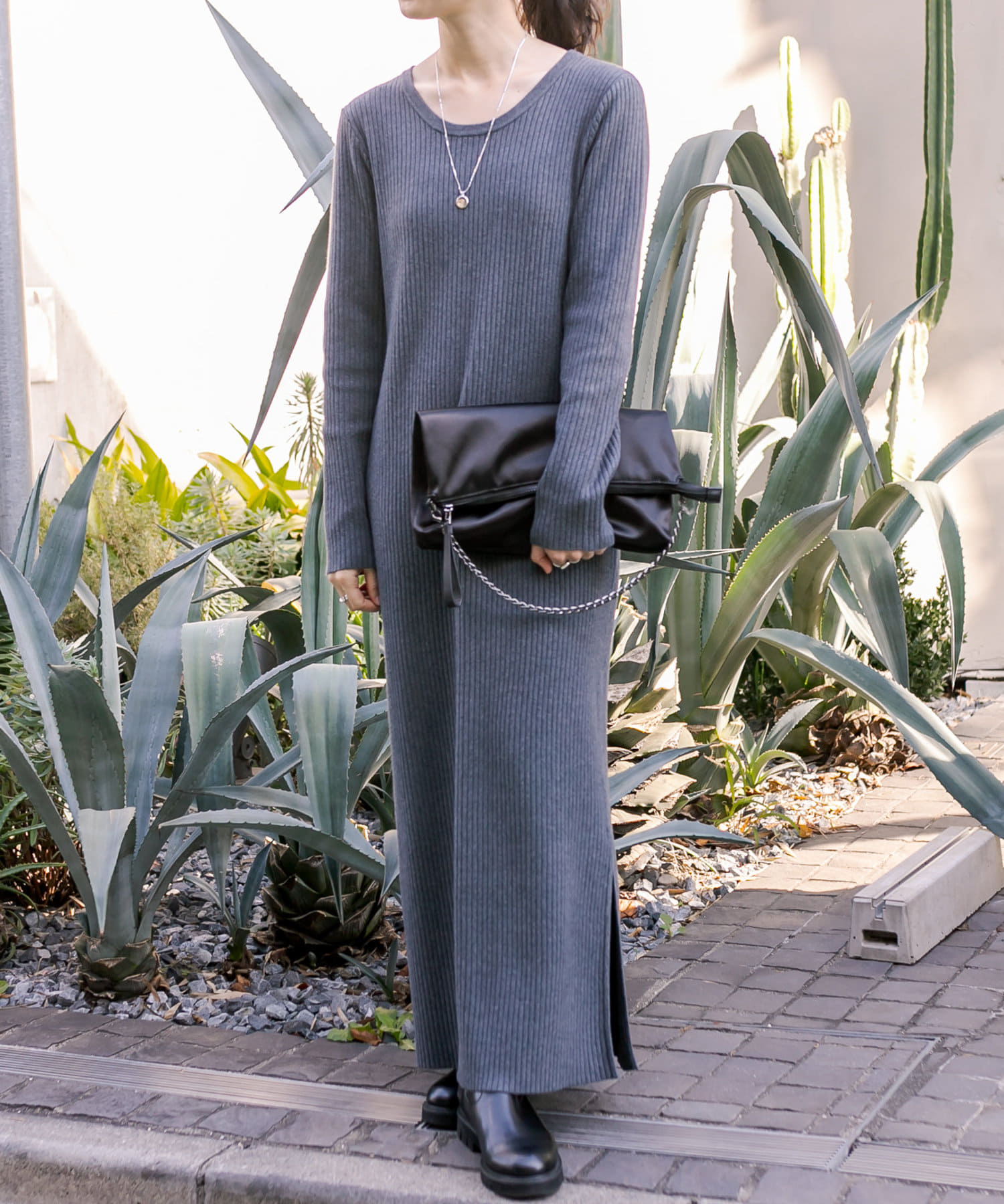 ニットワンピースながら、程よく厚みのあるリブ編みで型崩れしにくく、ボディラインも拾いにくいためスッキリと着ていただけます。
