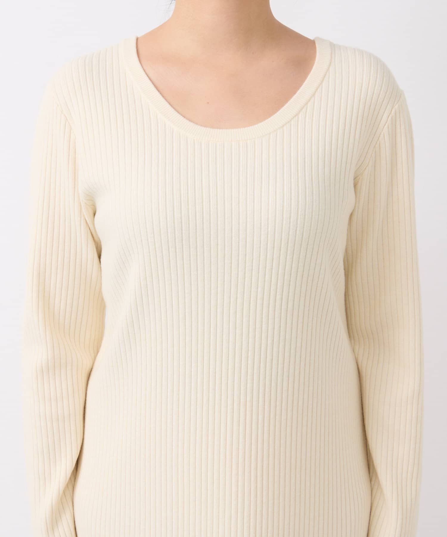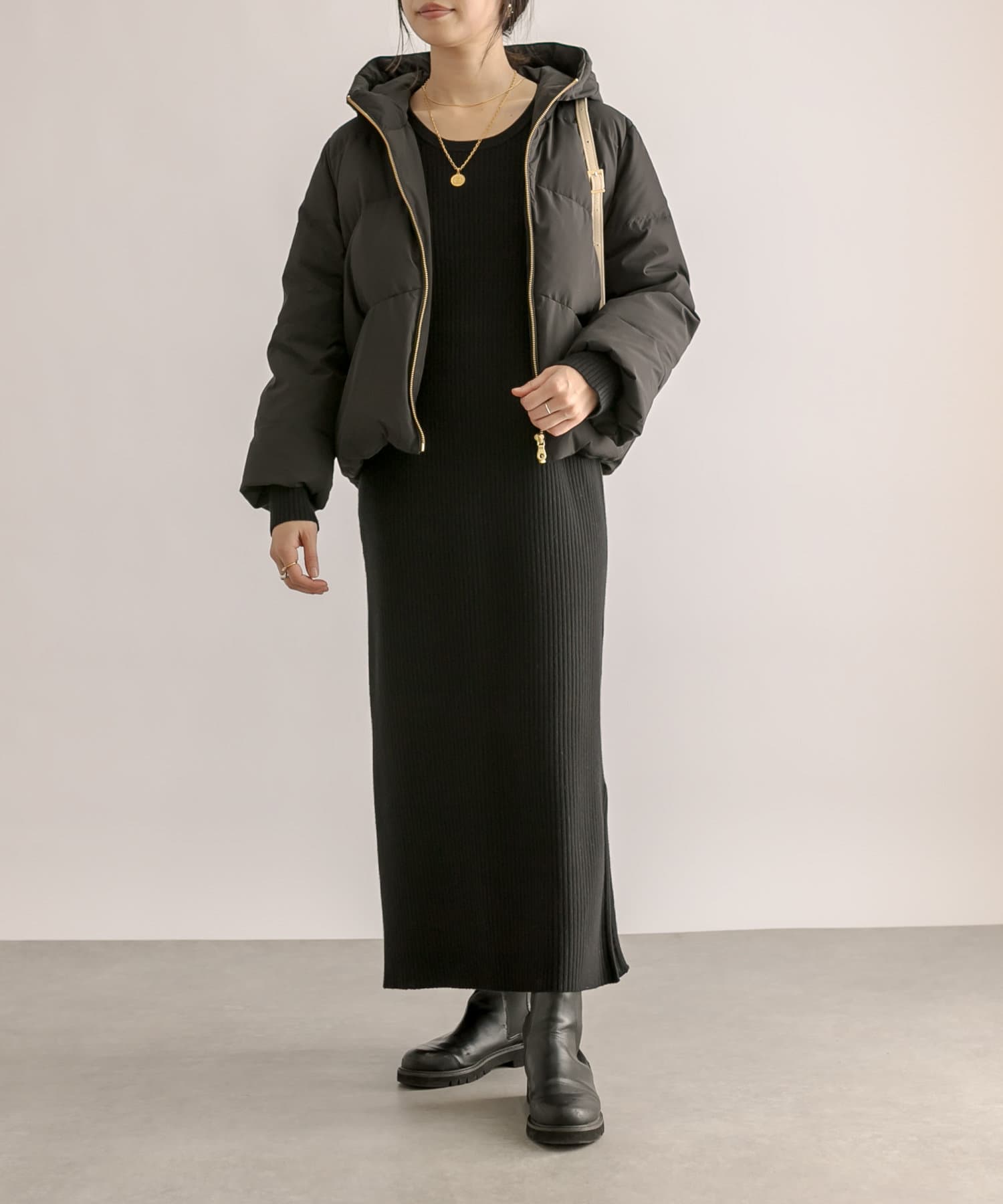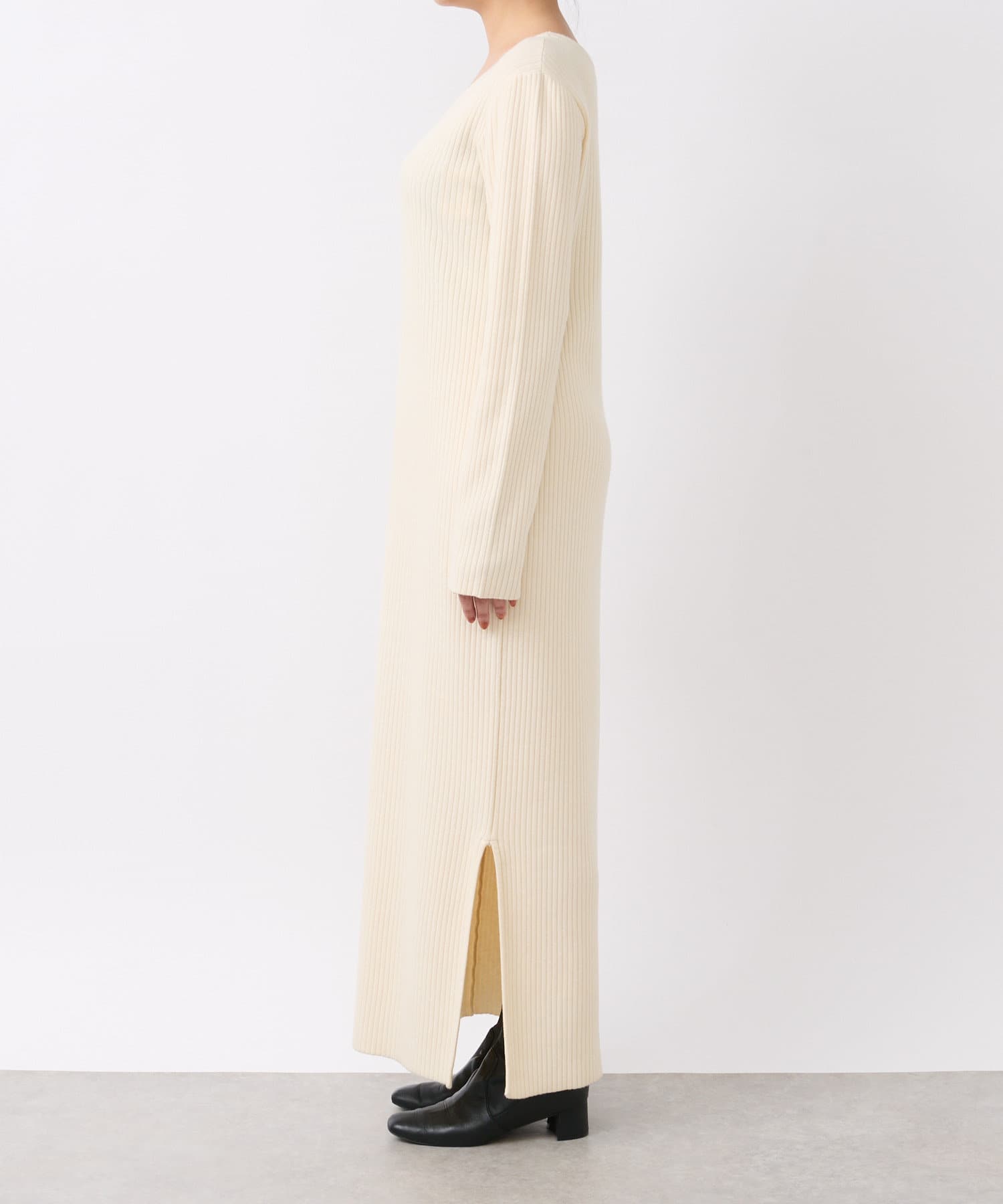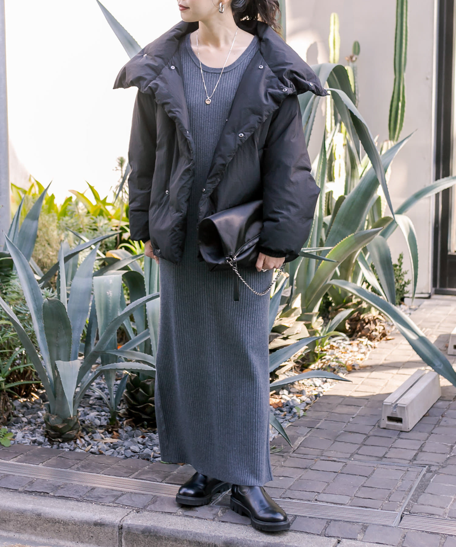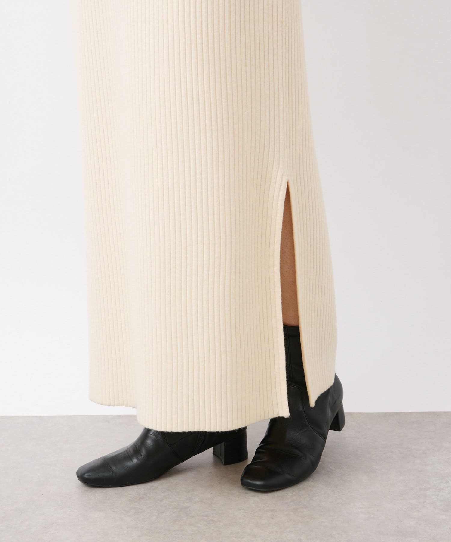 ニットワンピースながら、程よく厚みのあるリブ編みで型崩れしにくく、ボディラインも拾いにくいためスッキリと着ていただけます。