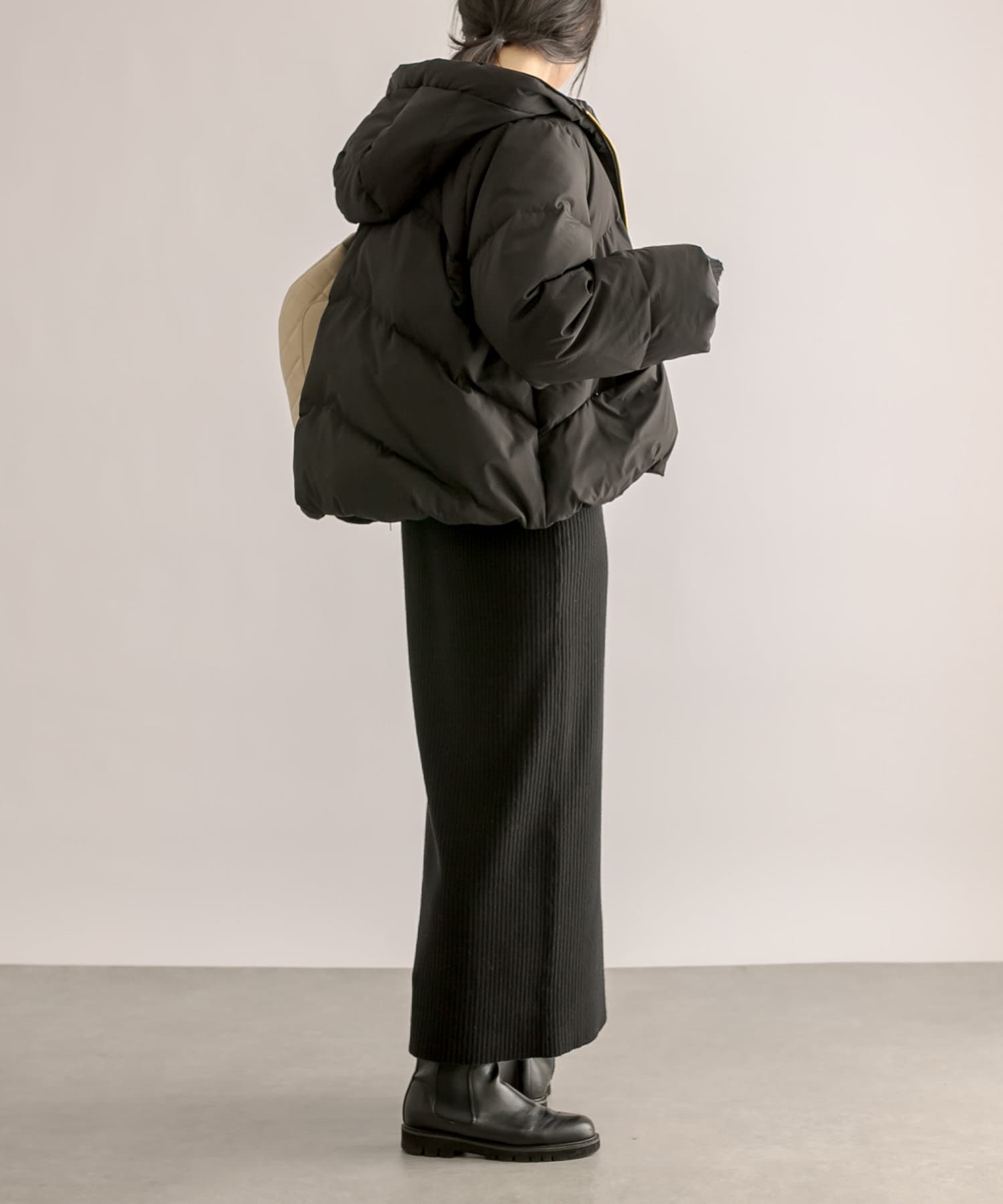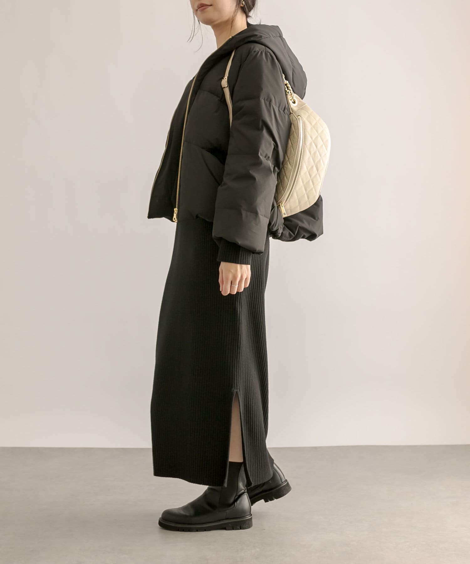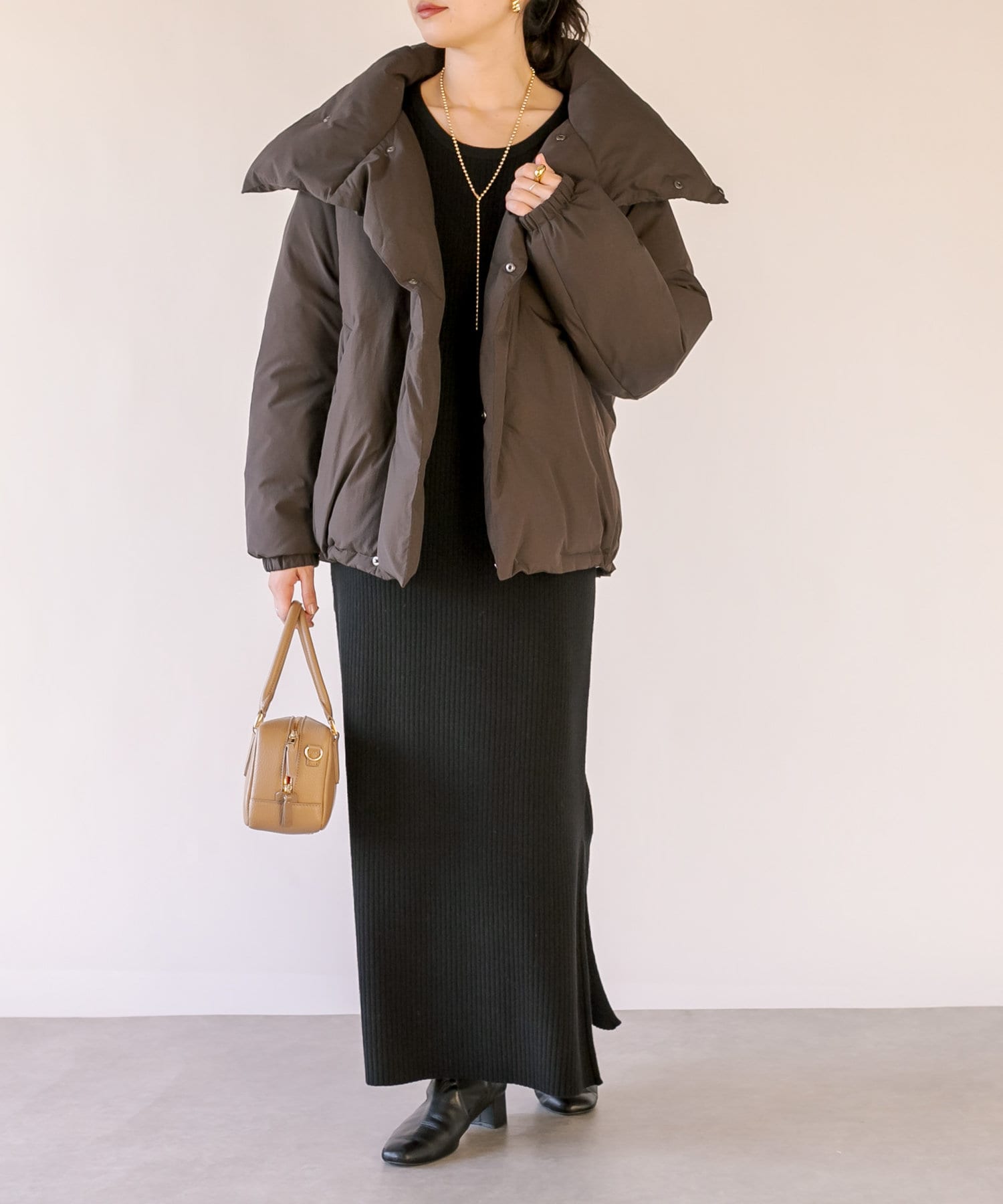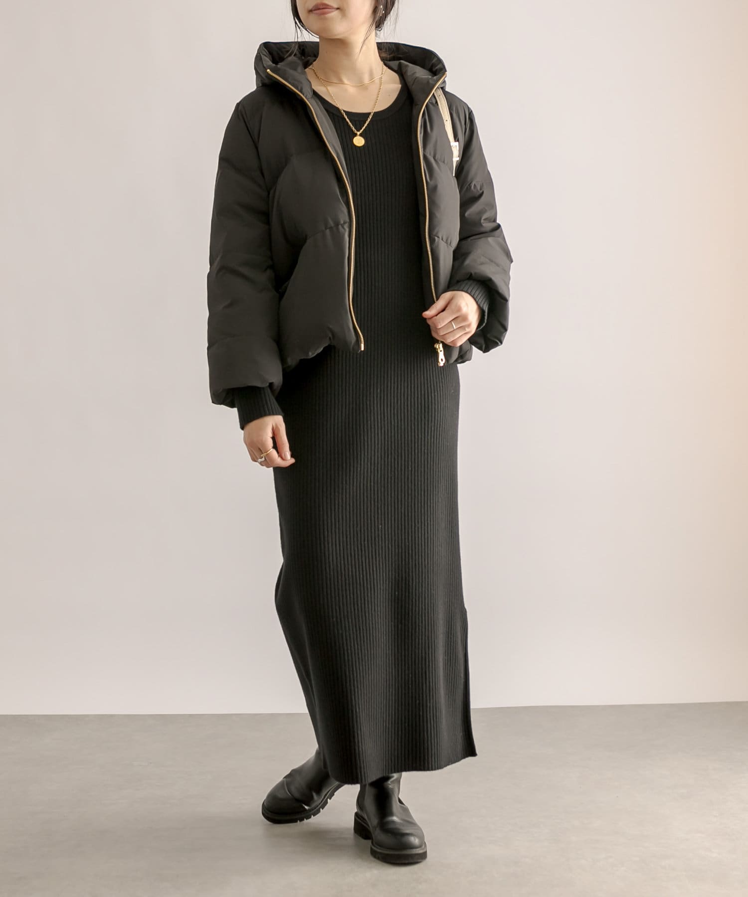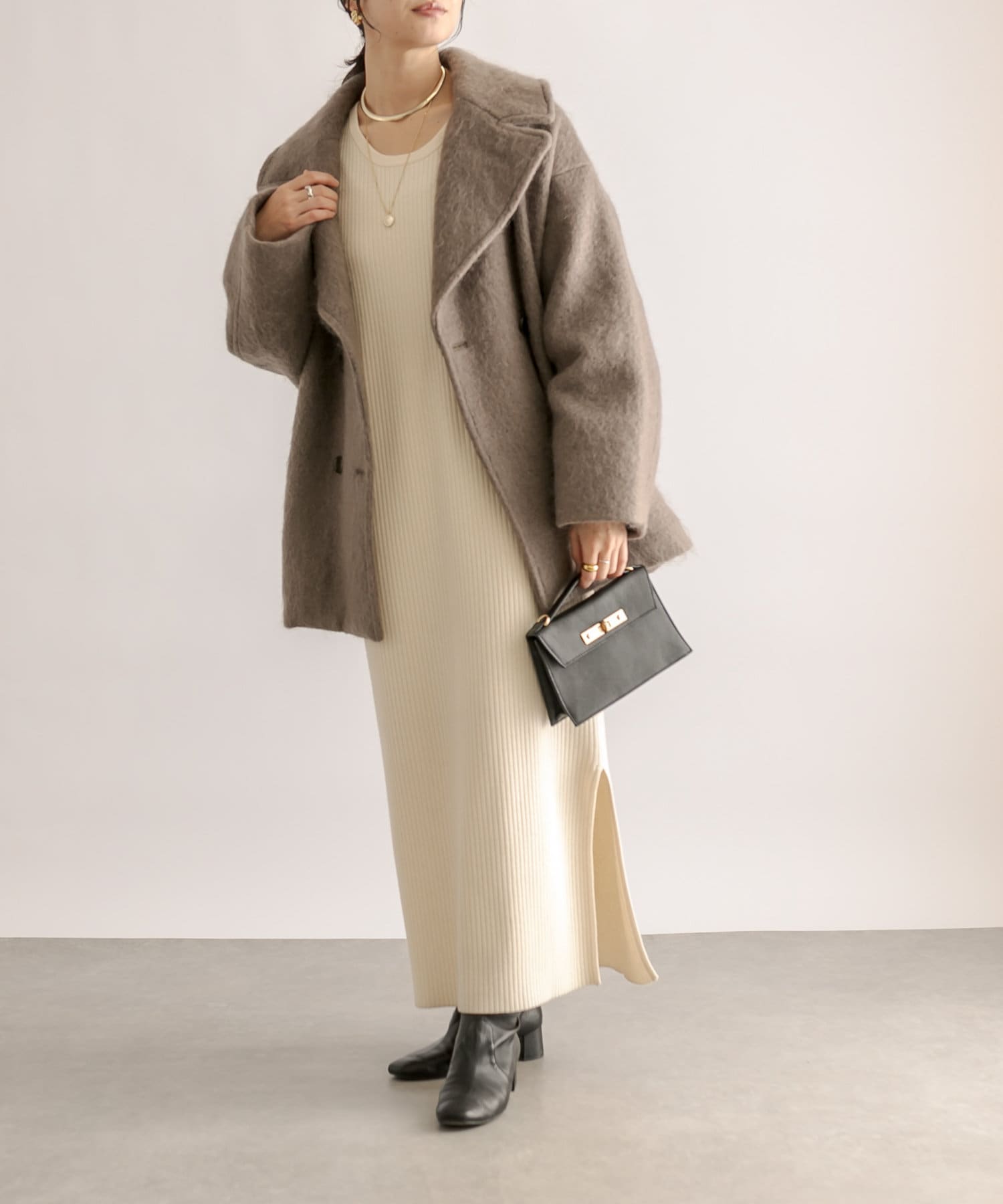 ニットワンピースながら、程よく厚みのあるリブ編みで型崩れしにくく、ボディラインも拾いにくいためスッキリと着ていただけます。