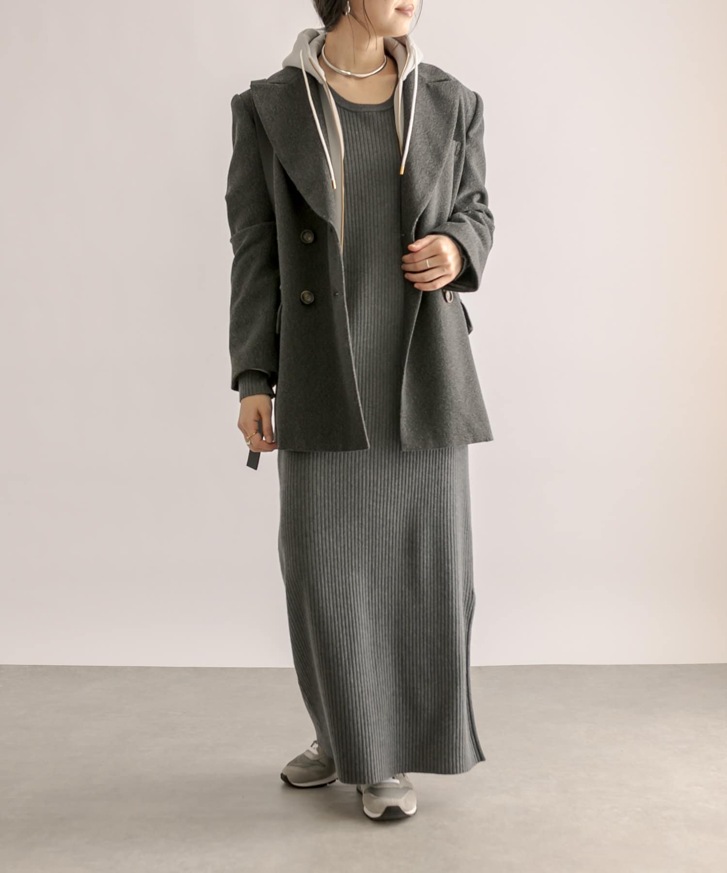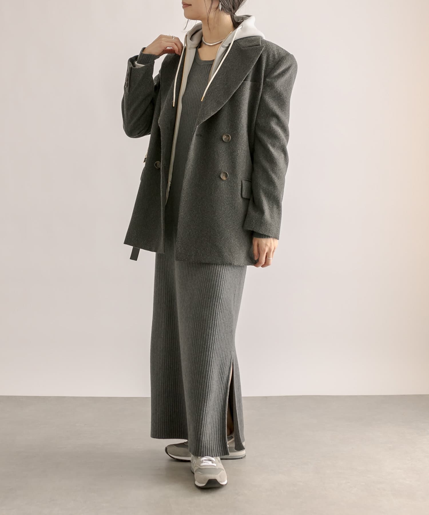 衿あき、肩幅・身幅・ヒップ・アームホール・袖のゆとりは2WAYロングリブワンピースのサイズ感と着用感を踏襲しています。