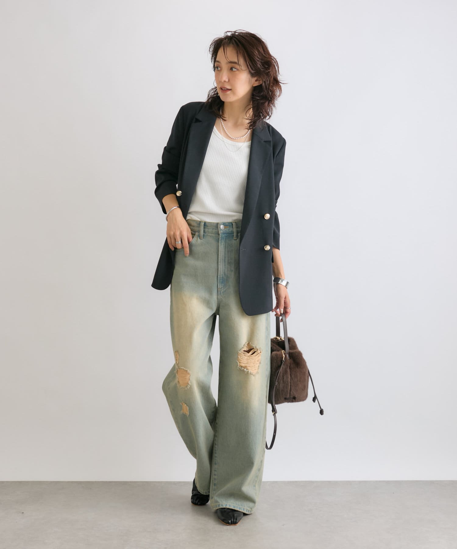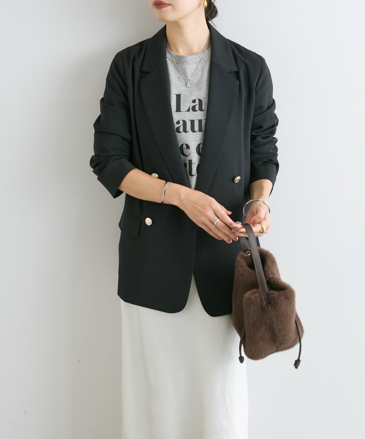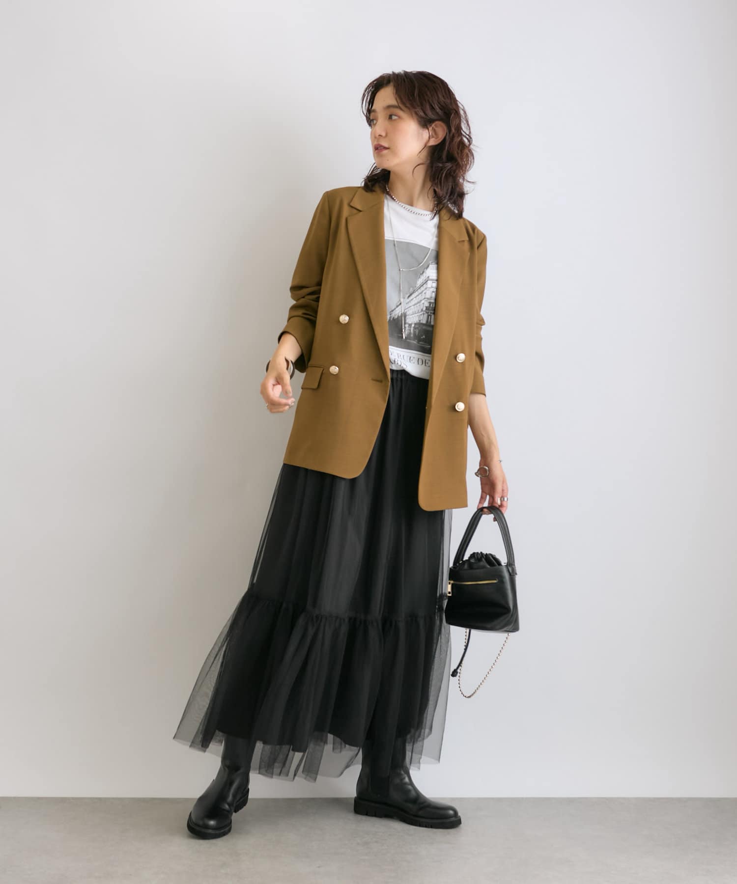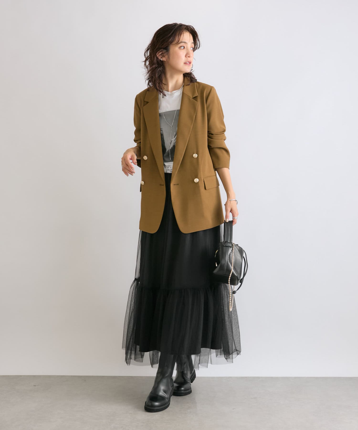 肌寒い時季には、薄手のニット等を合わせてコンパクトにまとめていただくとバランスよくまとまります。