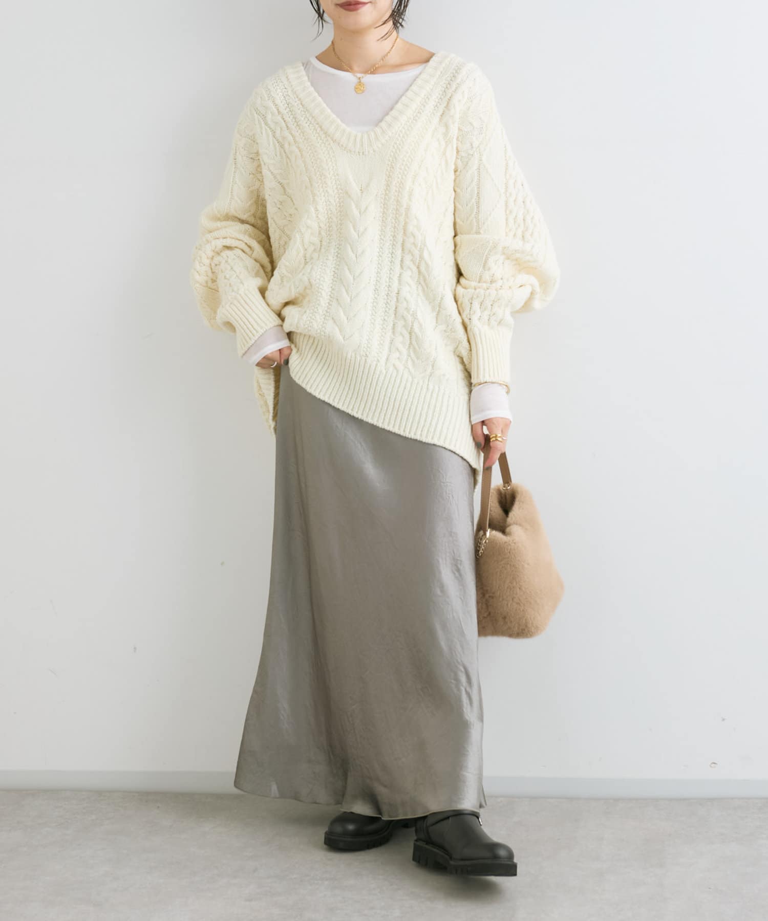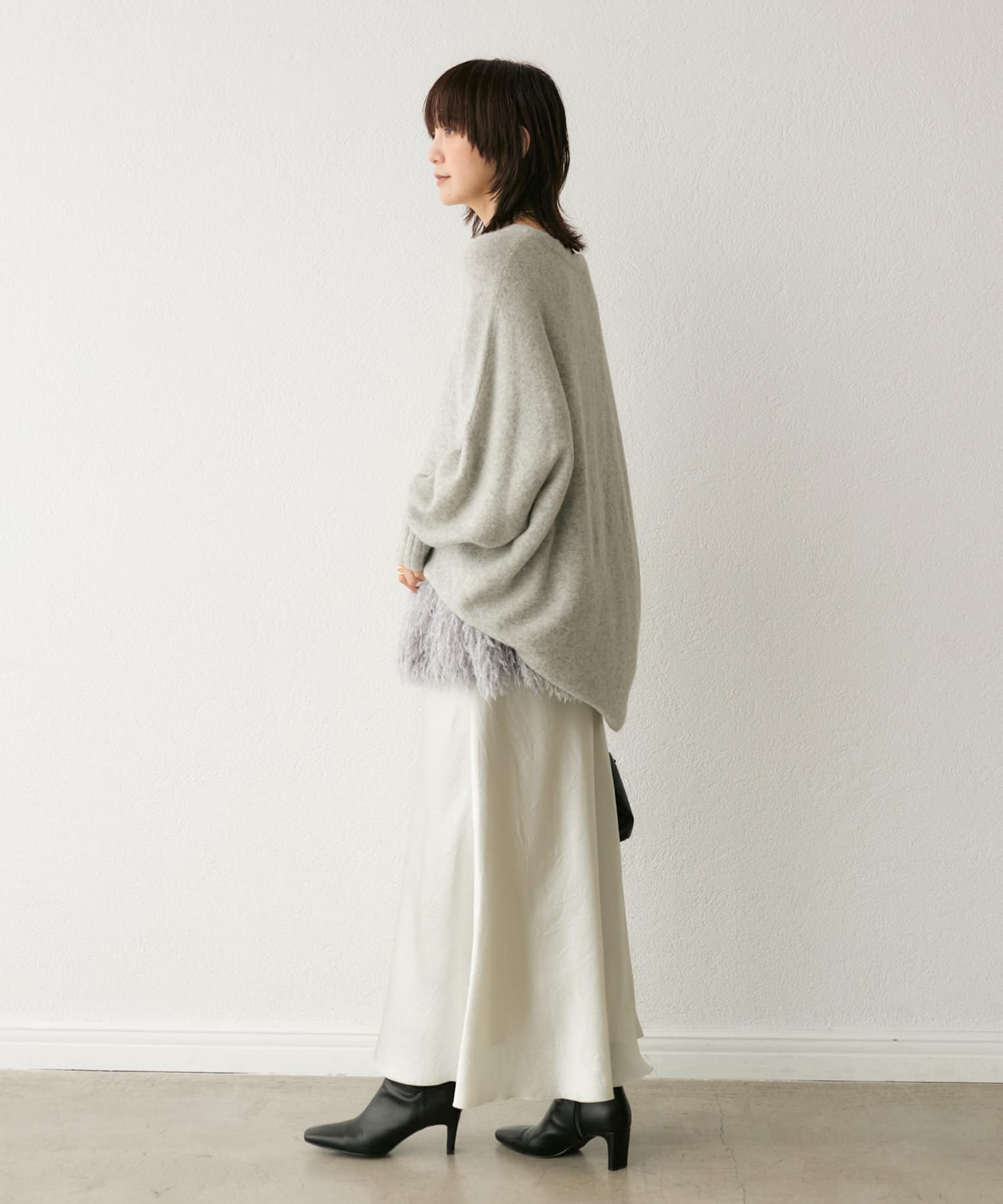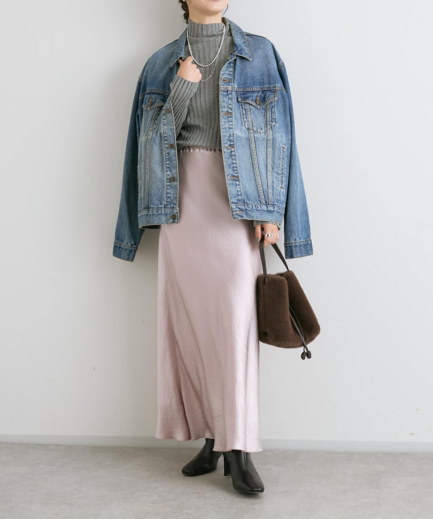 ざっくりニットやふんわりした毛足のニットとの相性がとてもよく、カジュアルなアイテムを艶っぽくスタイリングするのにもおすすめなアイテム。