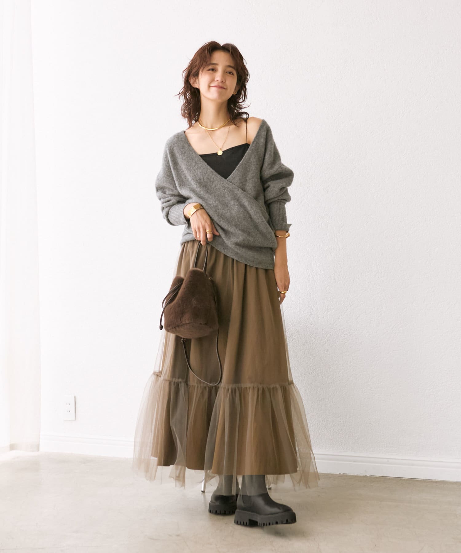 ヤクならではの軽くて柔らかなタッチとなめらかな落ち感があり、着るだけで女性らしさを演出できる1着になっております。