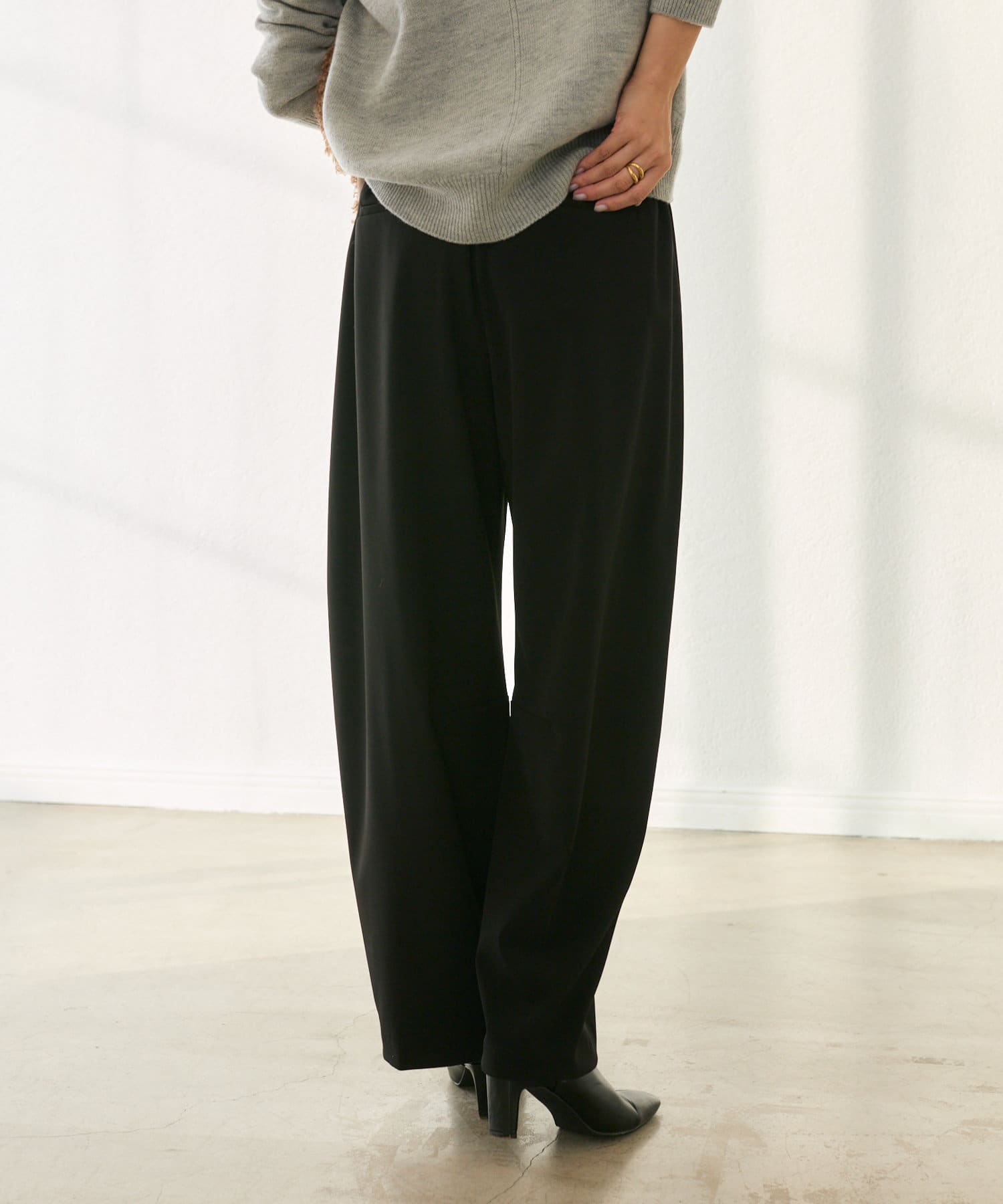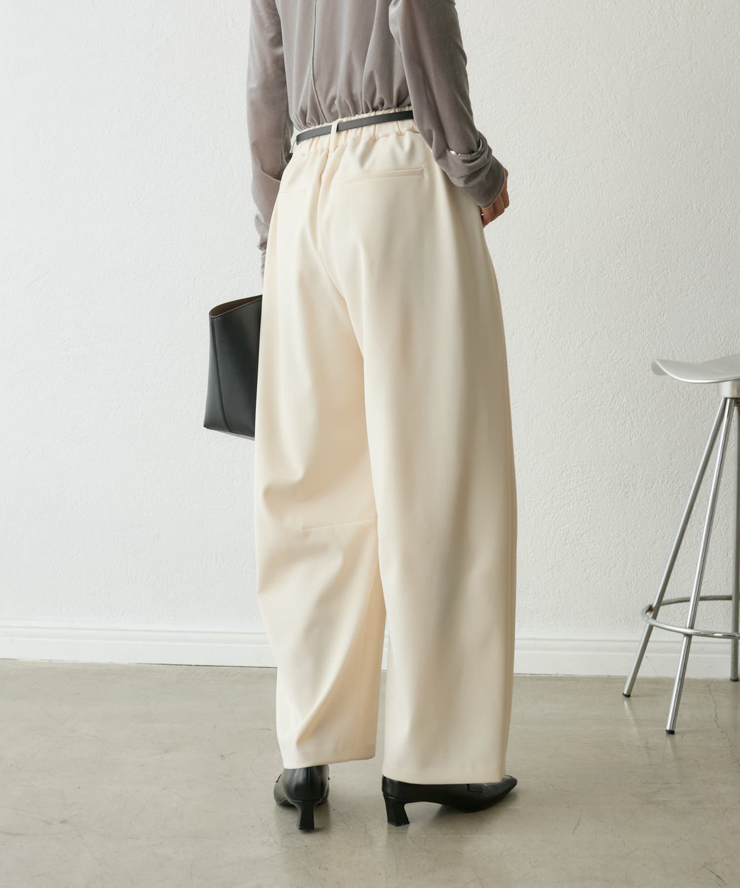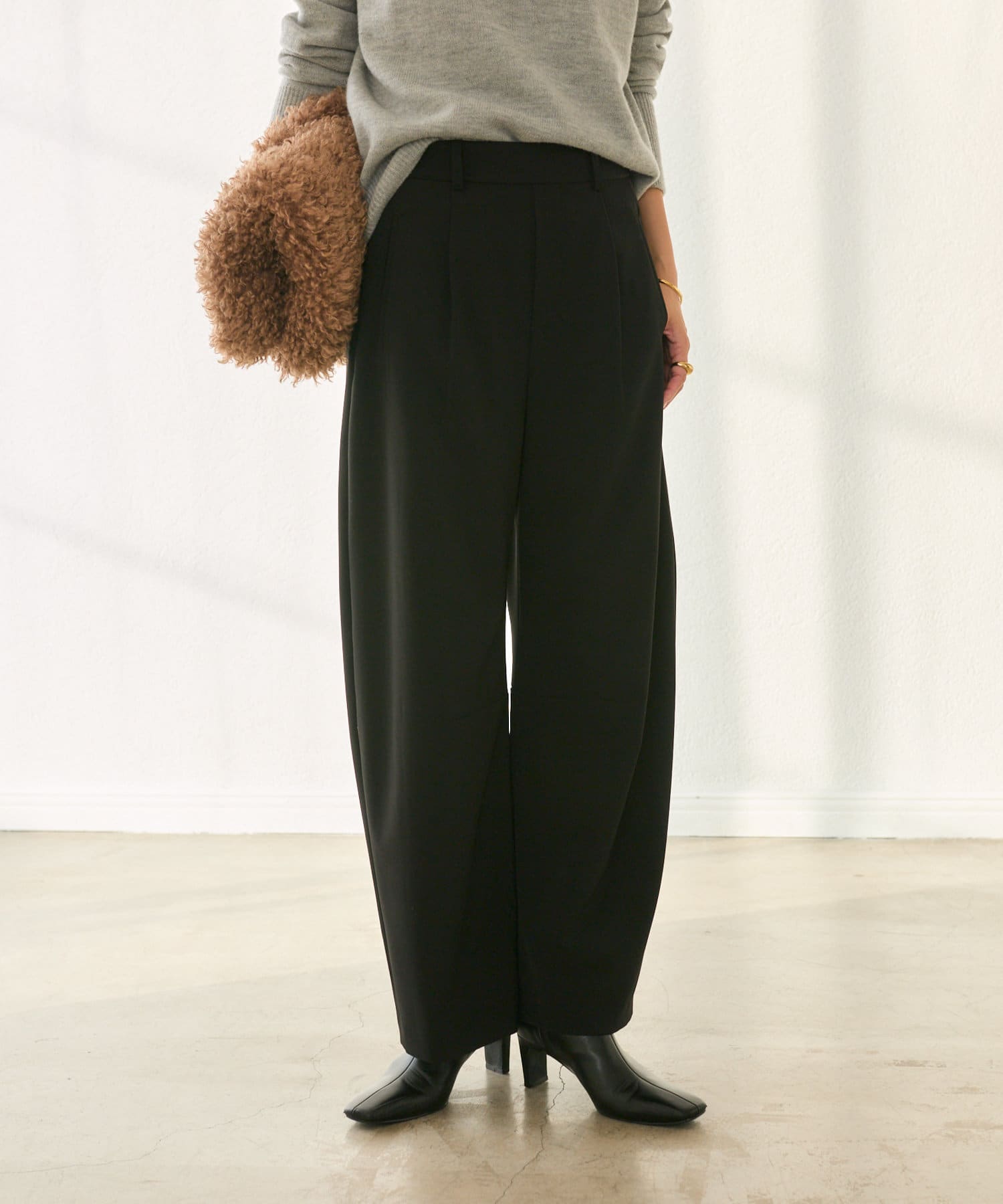 今季トレンドのカーヴィーなバレルシルエットのイージーパンツ。