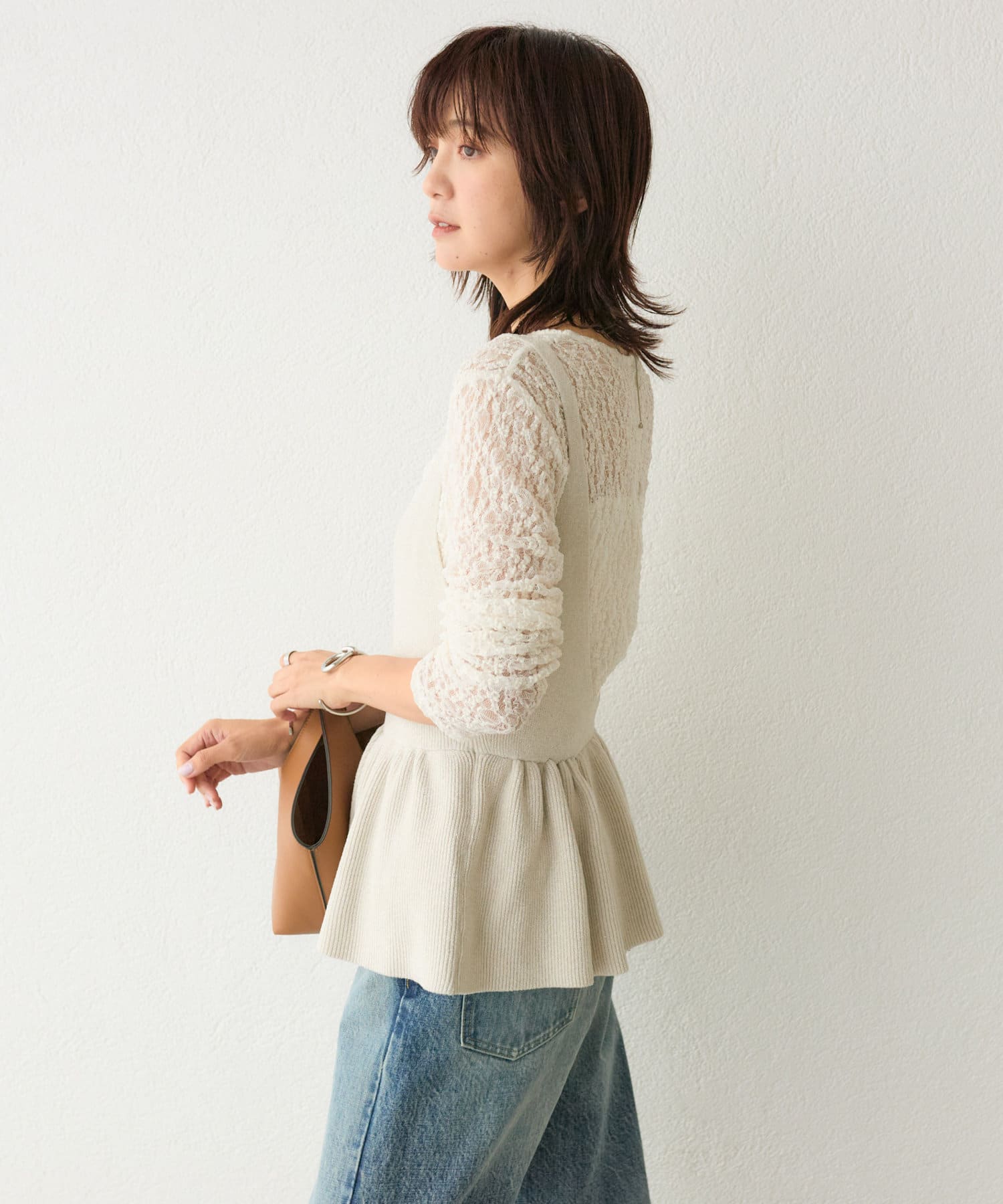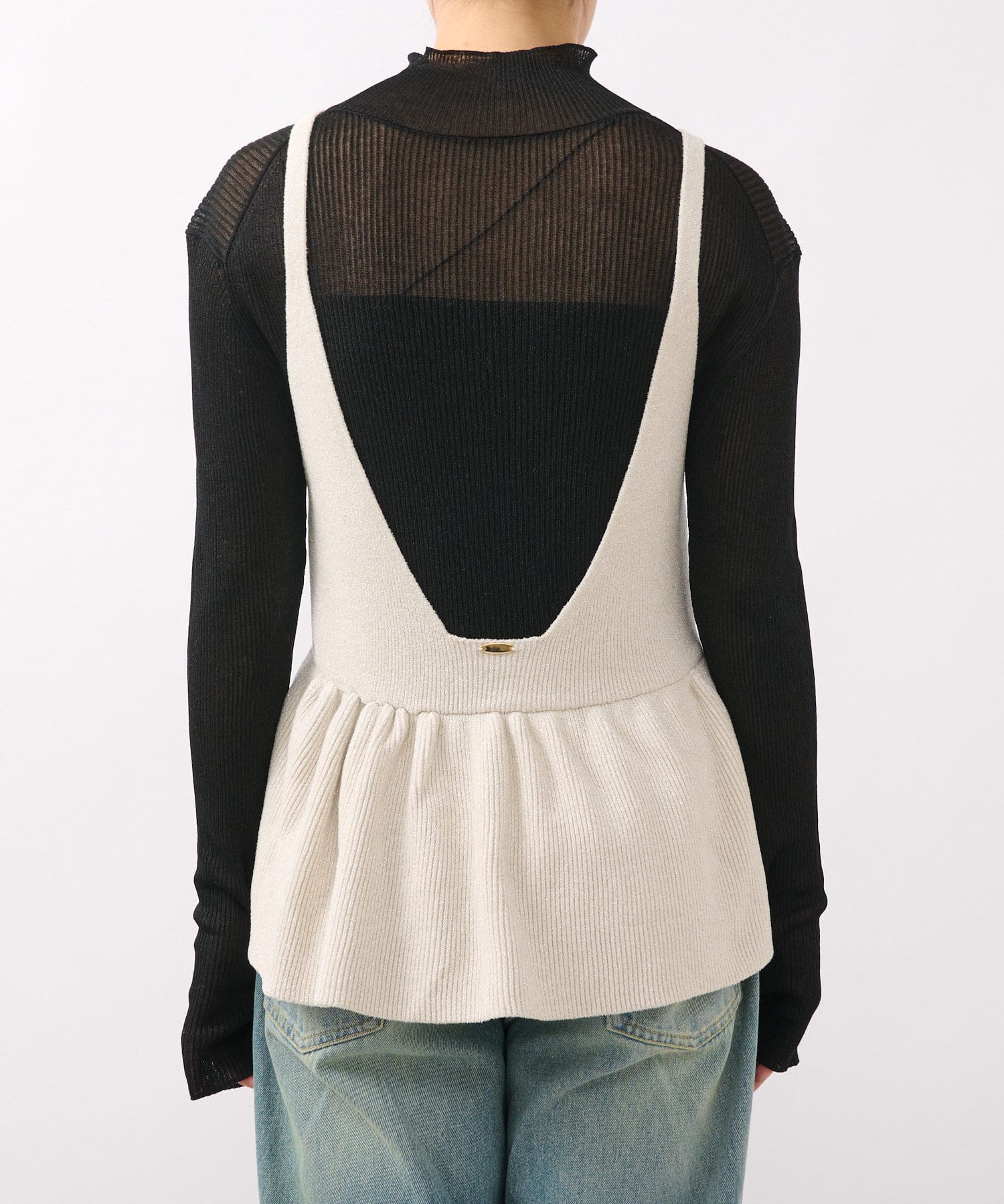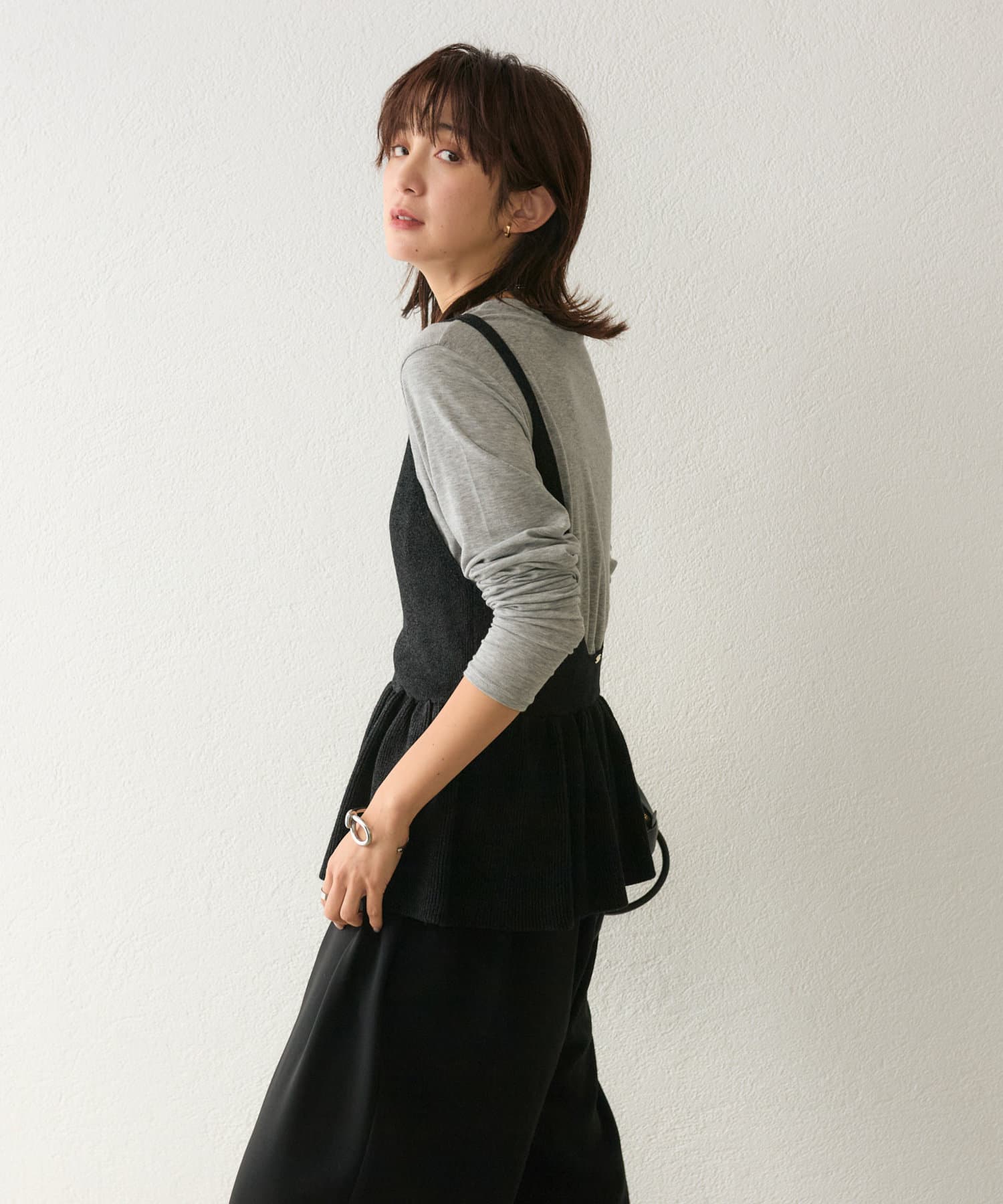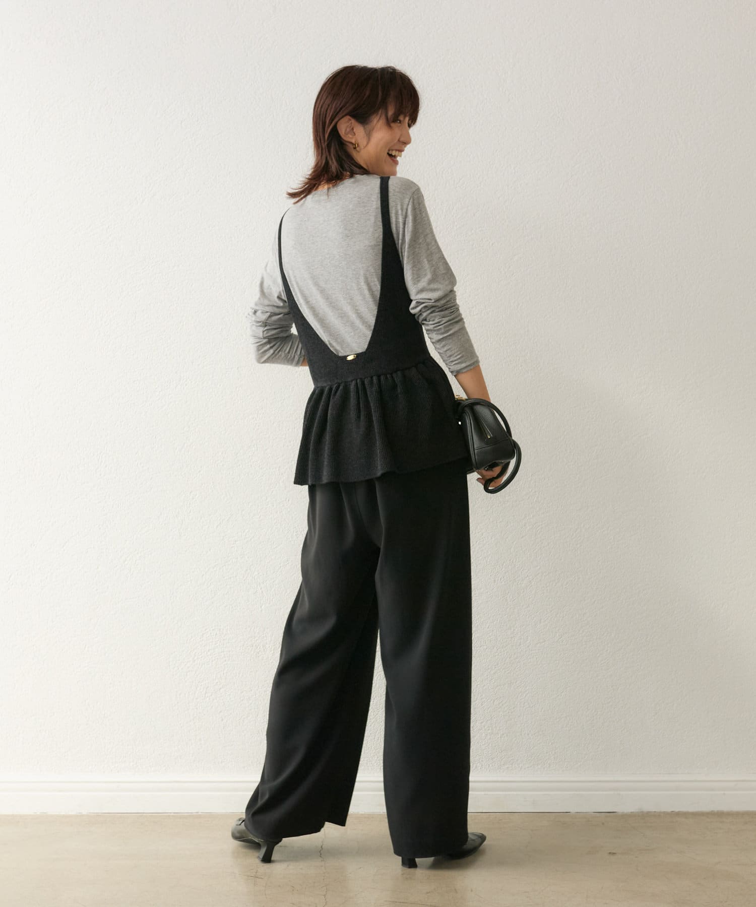 ペプラムのボリュームがホリデーシーズンにピッタリ。バックスタイルのメタルパーツも上品なポイントに。