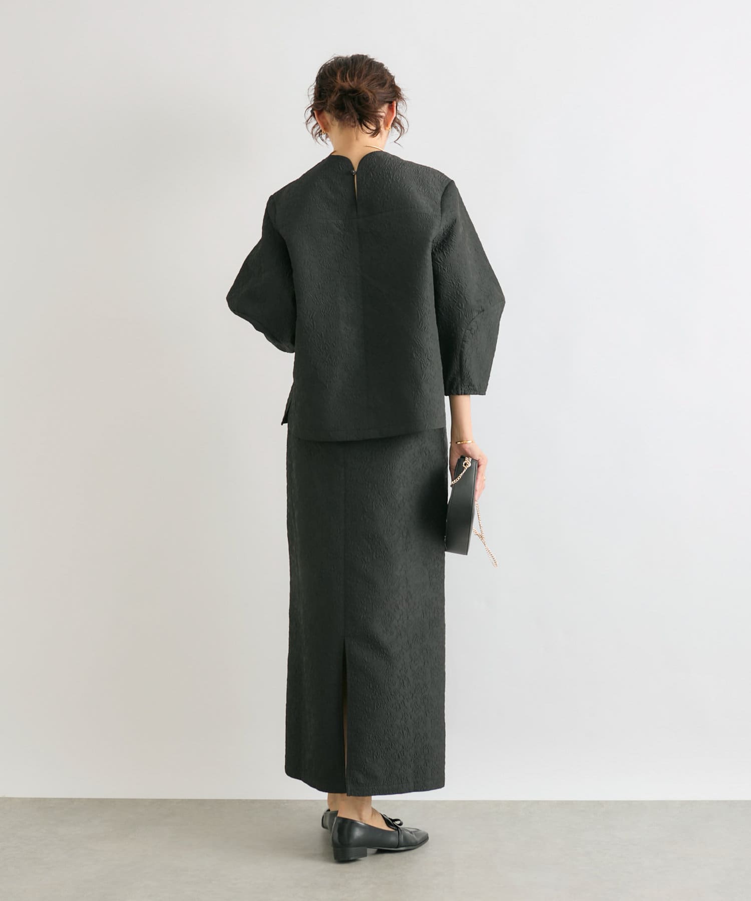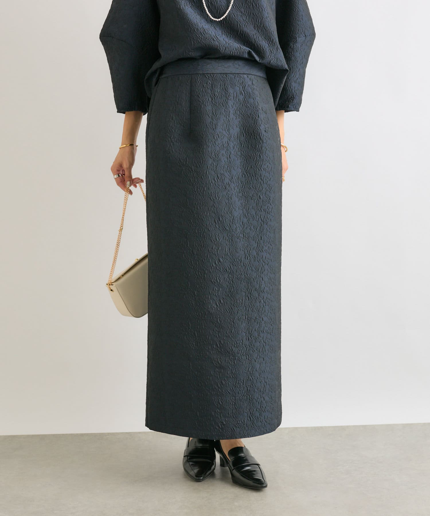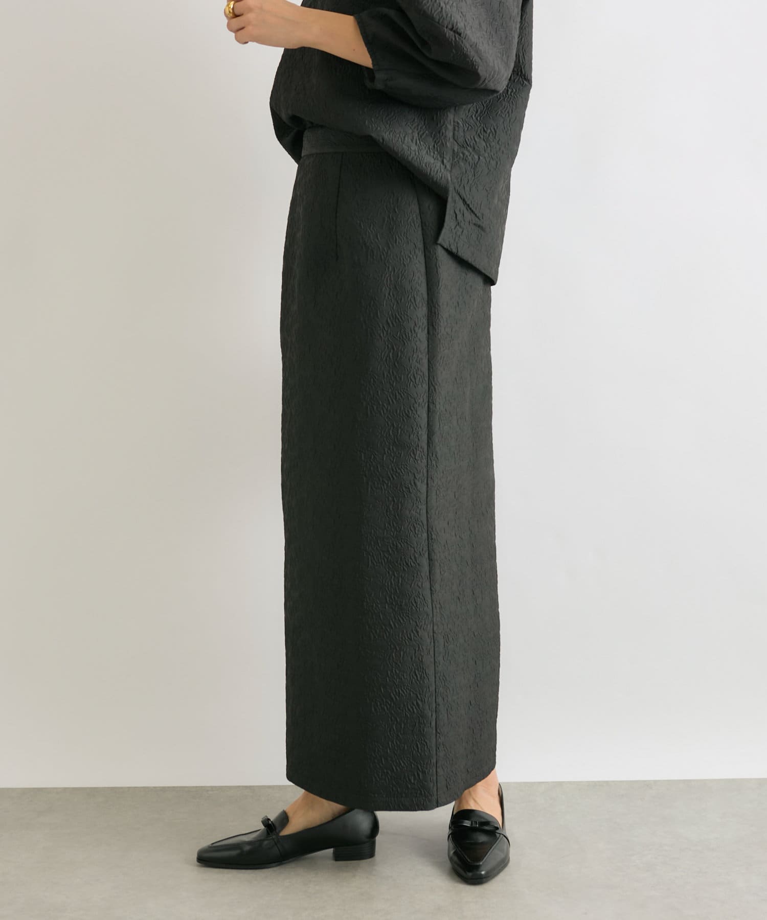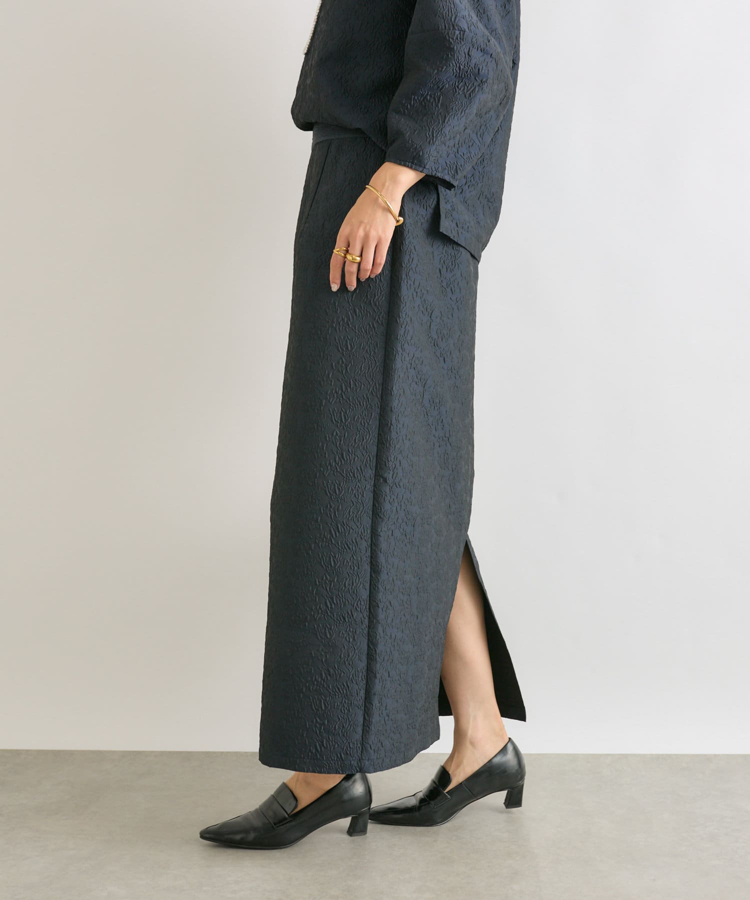 同素材のジャガードブラウス(RDZ1051104A0004)とセットアップで着ていただいても、別のアイテムと合わせても着ていただきやすいベーシックな一枚です。
