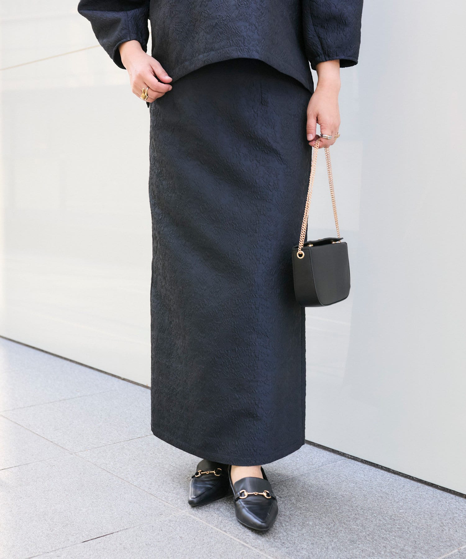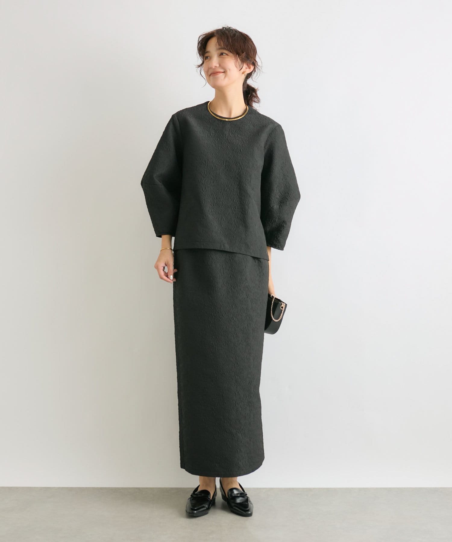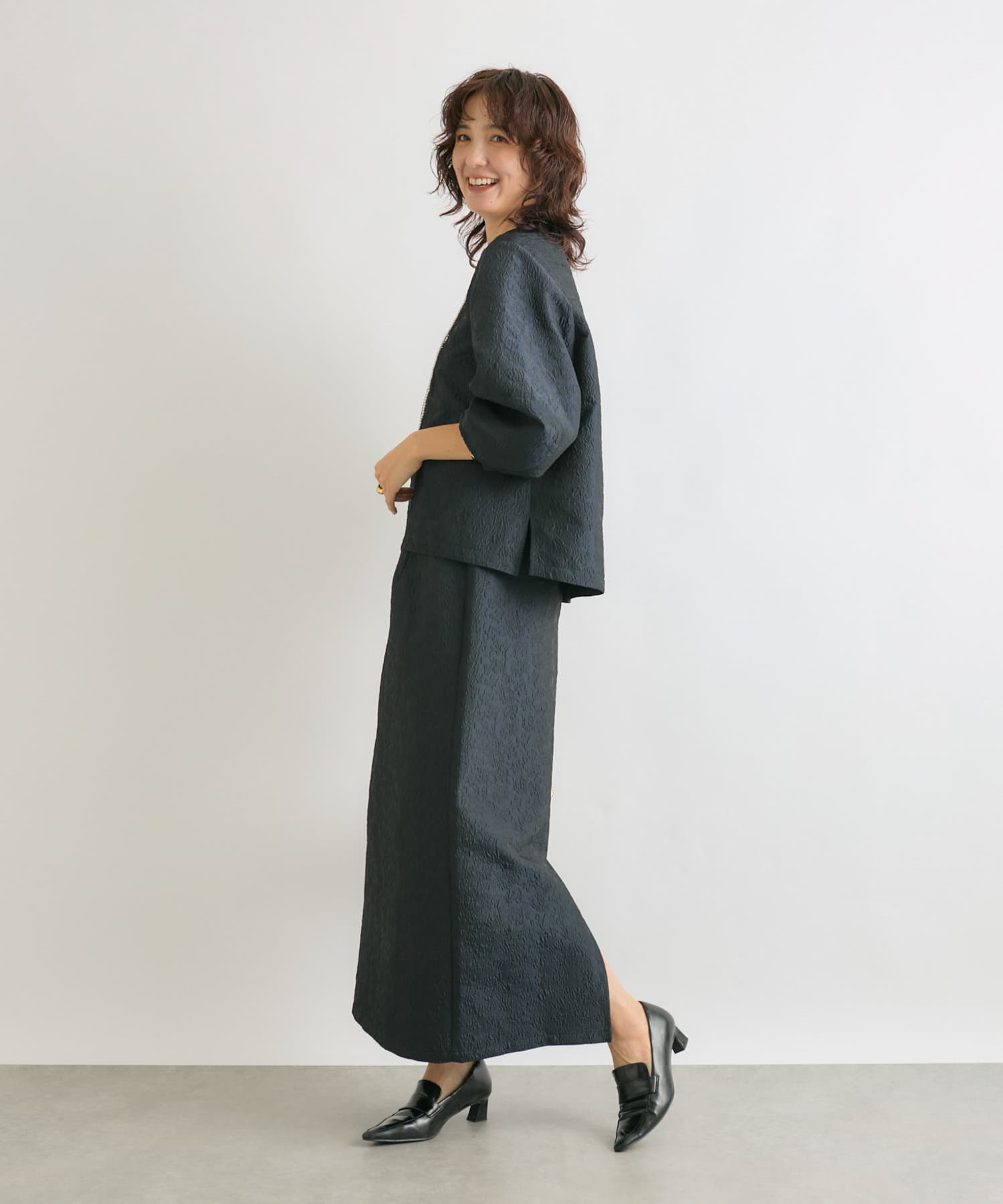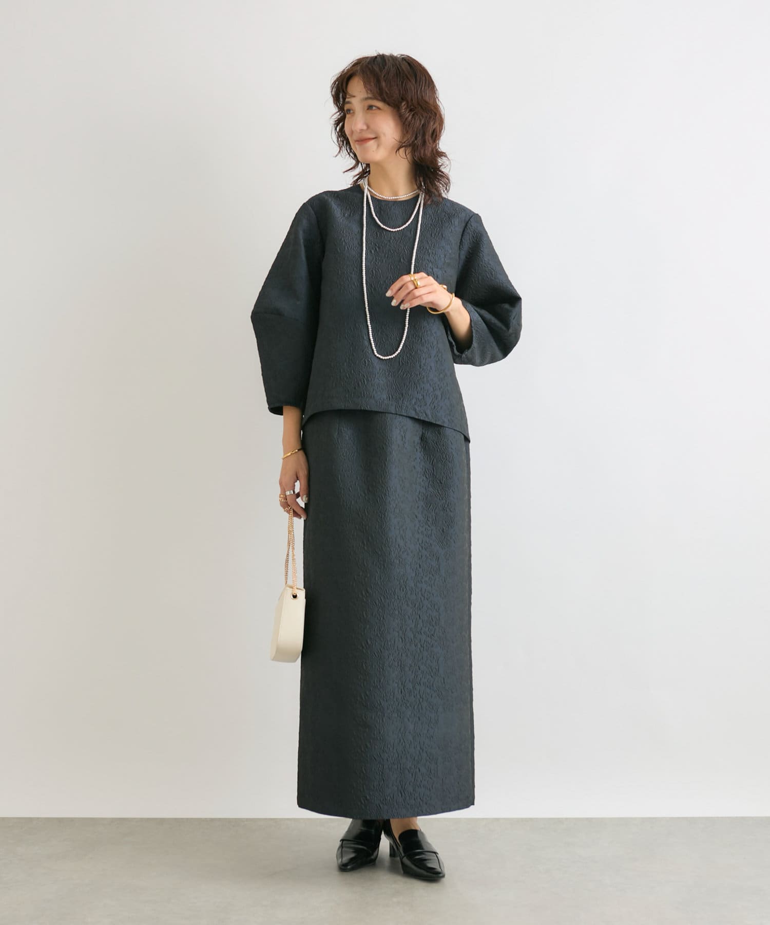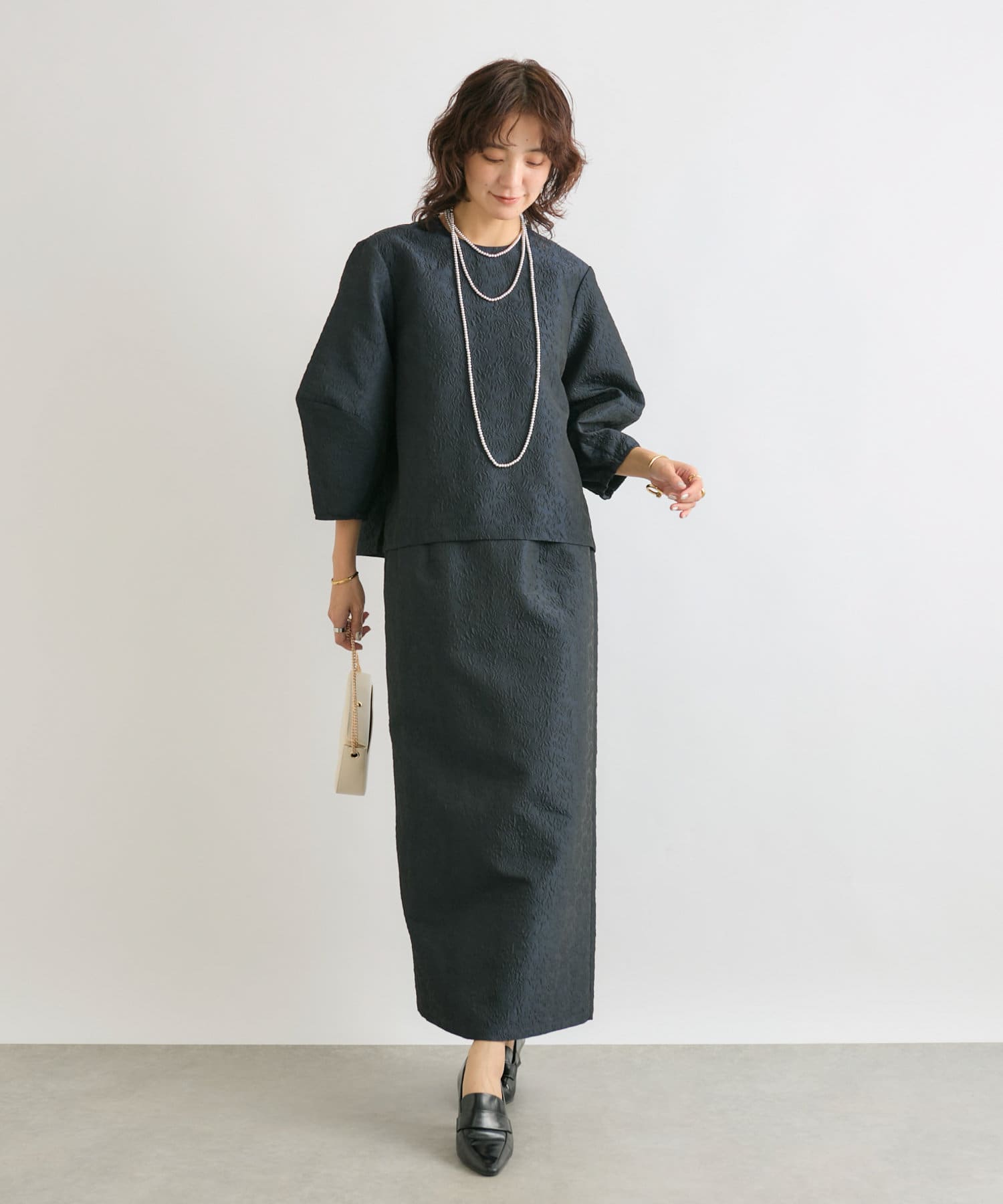 同素材のジャガードブラウス(RDZ1051104A0004)とセットアップで着ていただいても、別のアイテムと合わせても着ていただきやすいベーシックな一枚です。