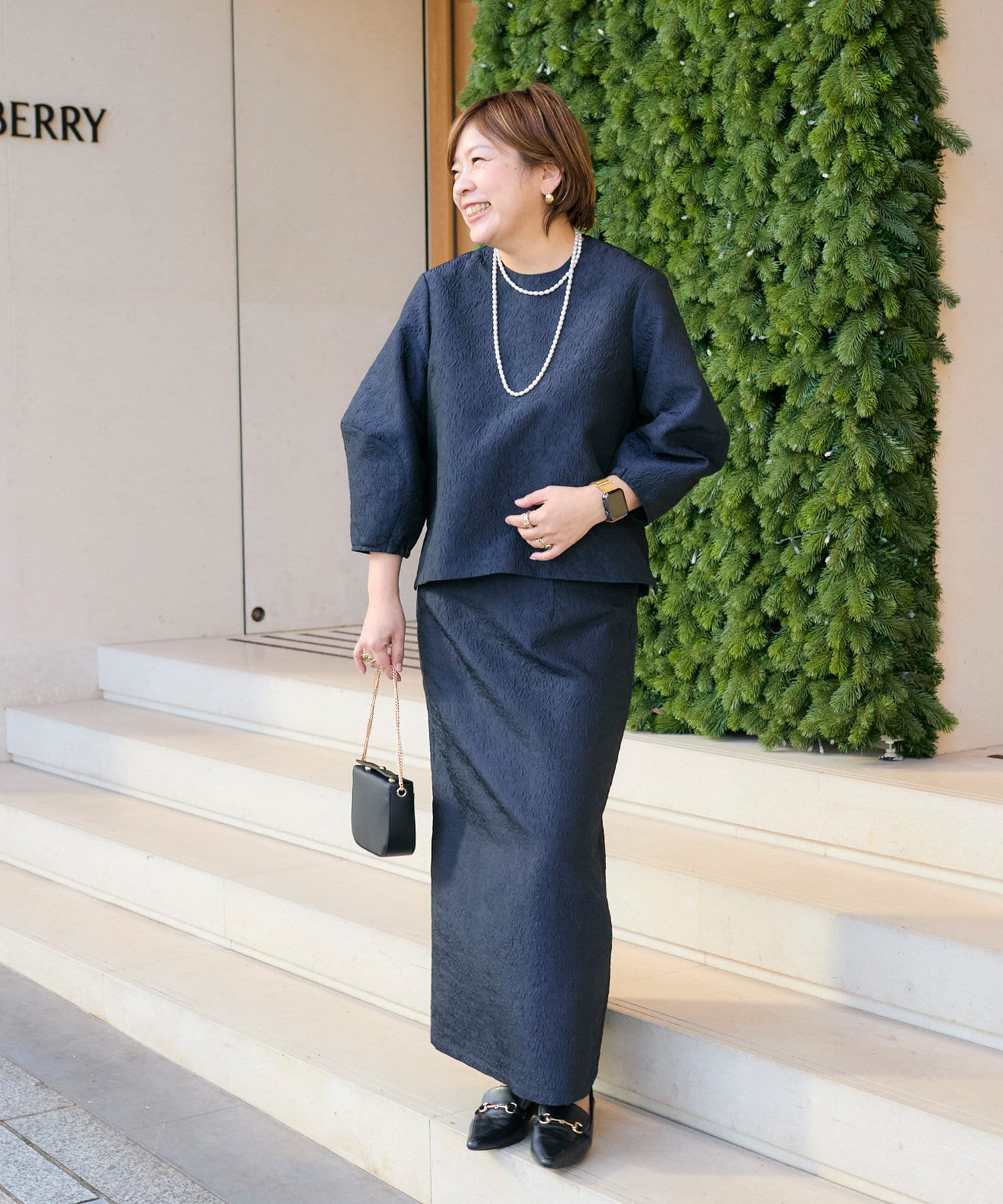 トップスは、立体感出すことで二の腕がカバー、お腹もインしなくてもバランスよく着られることを意識しました!