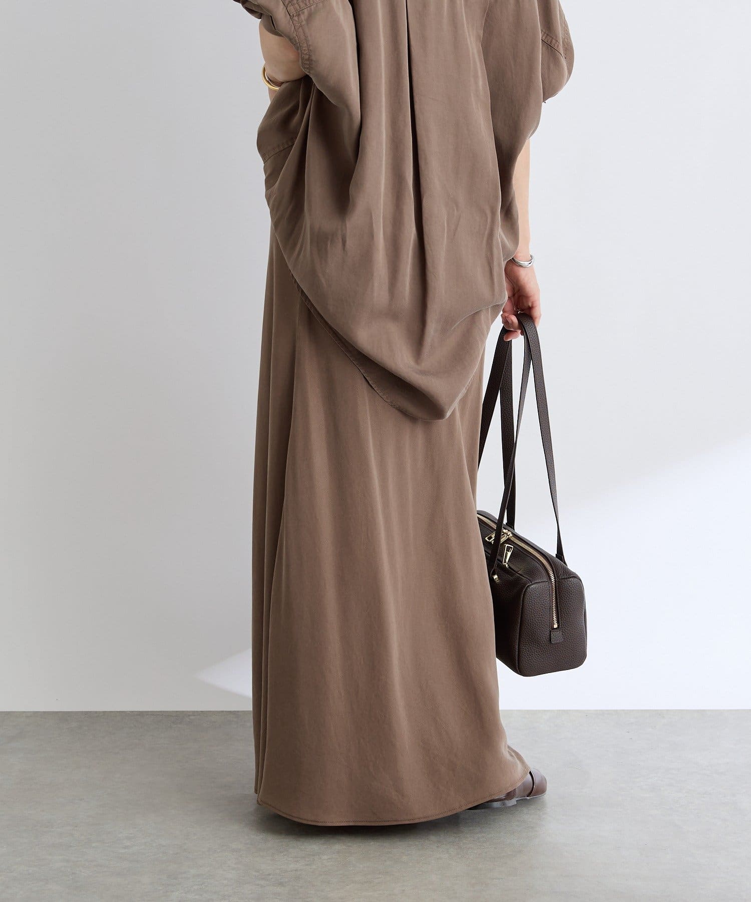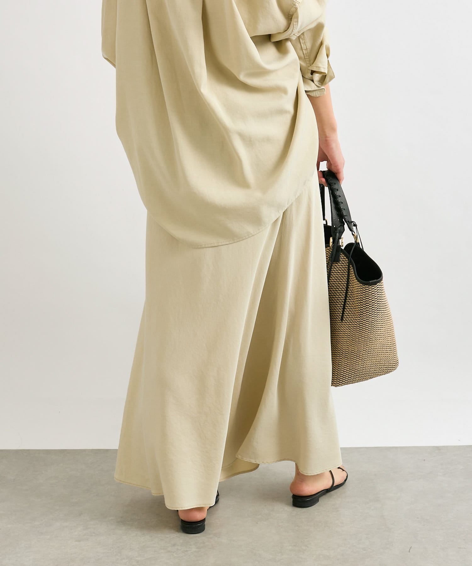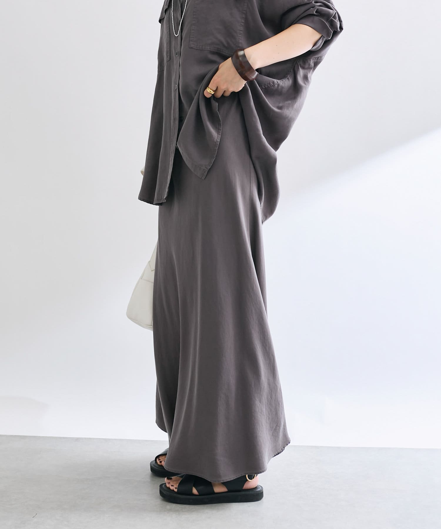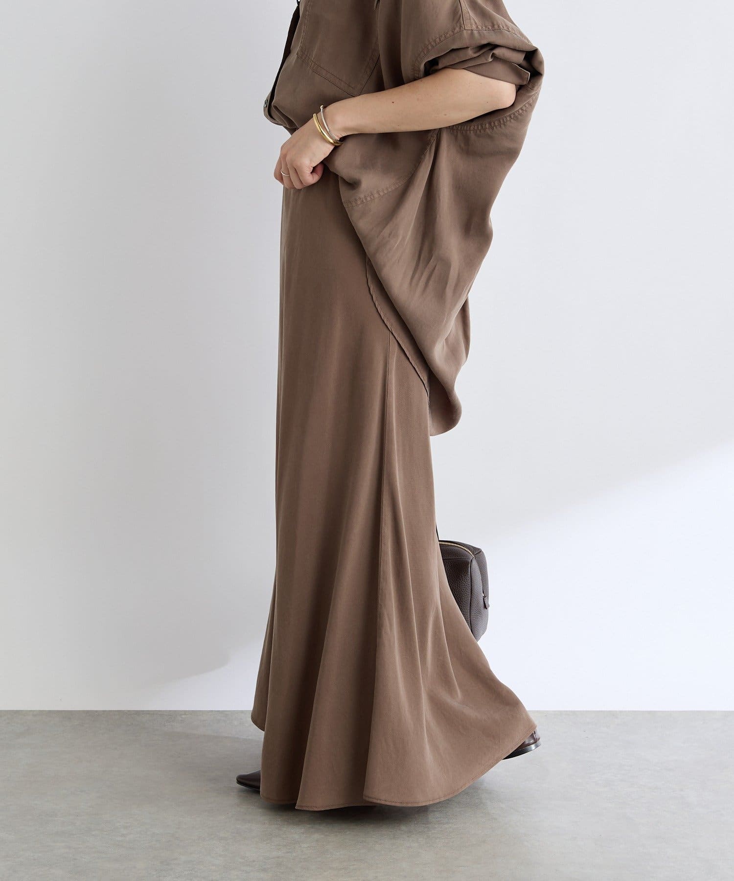 落ち感のあるテンセルツイルを使用し、製品染を施したバイヤススカート。