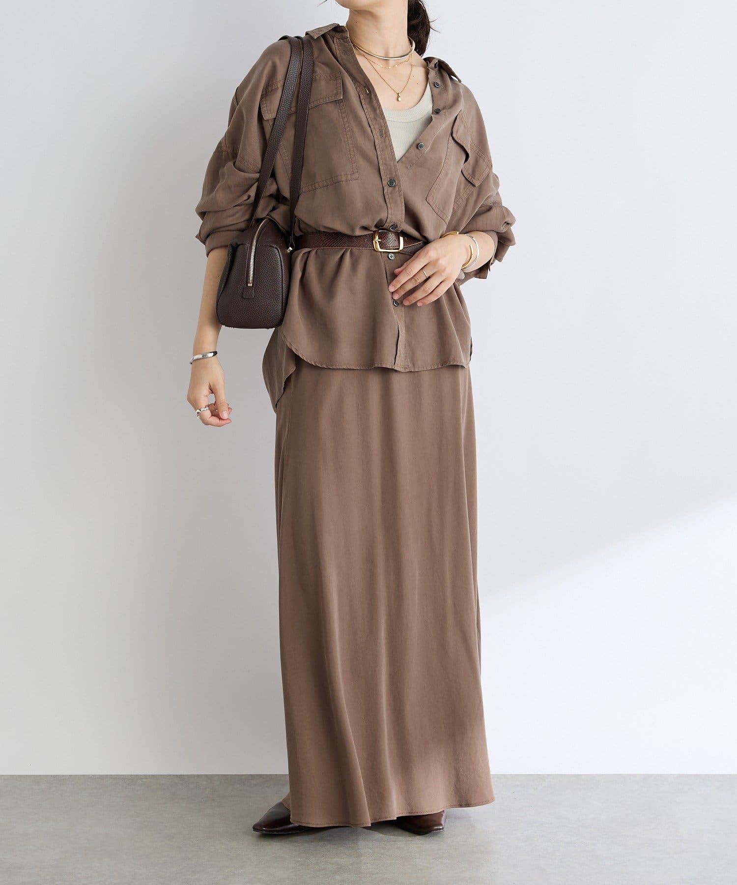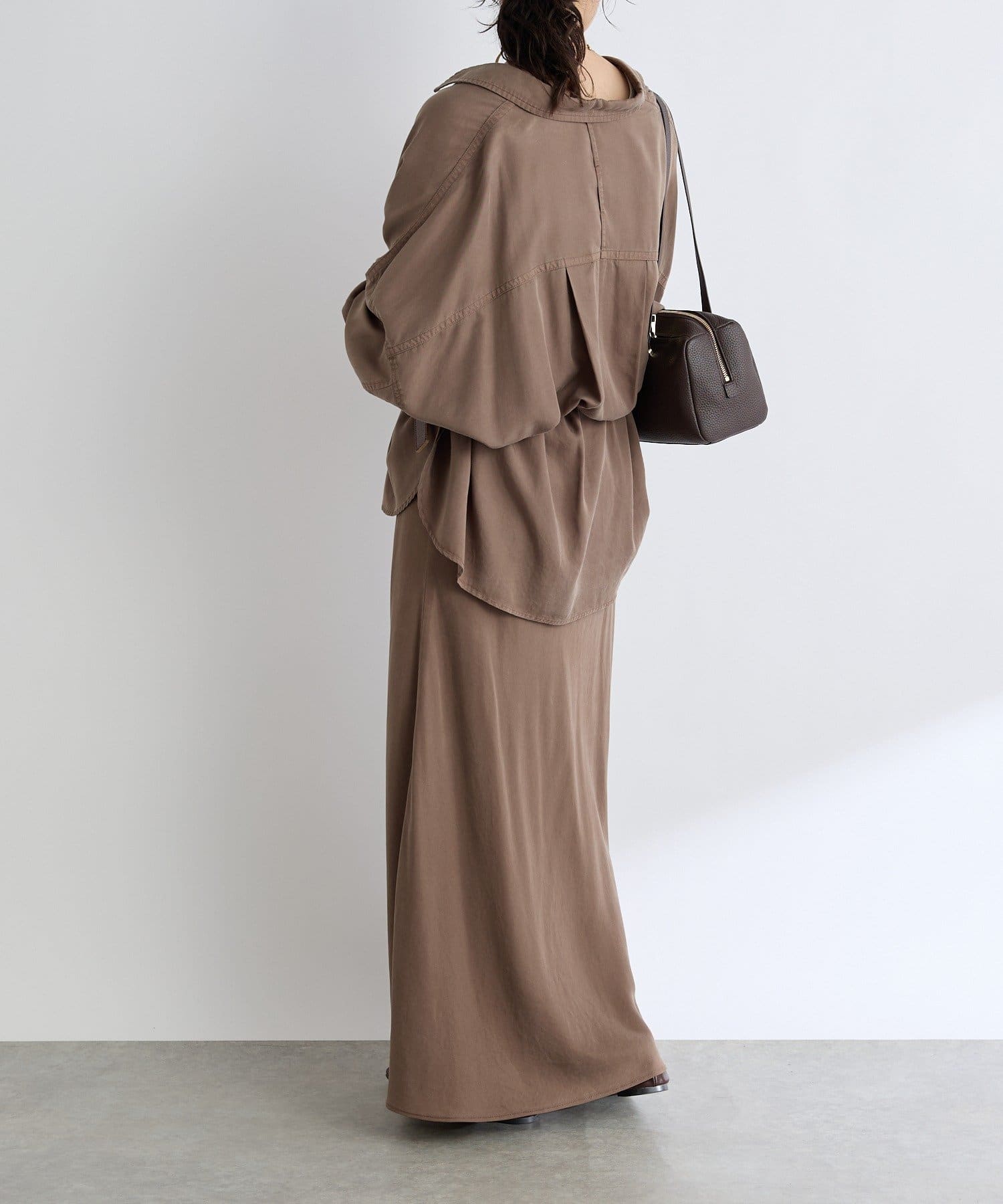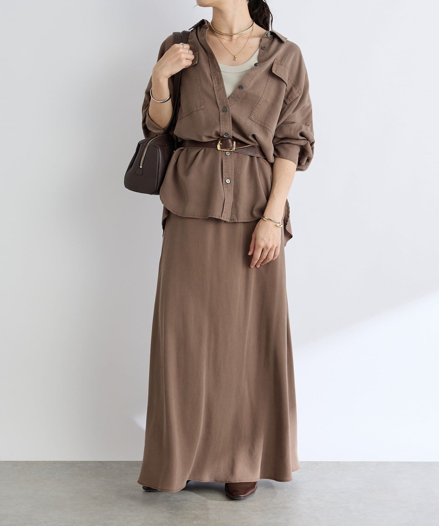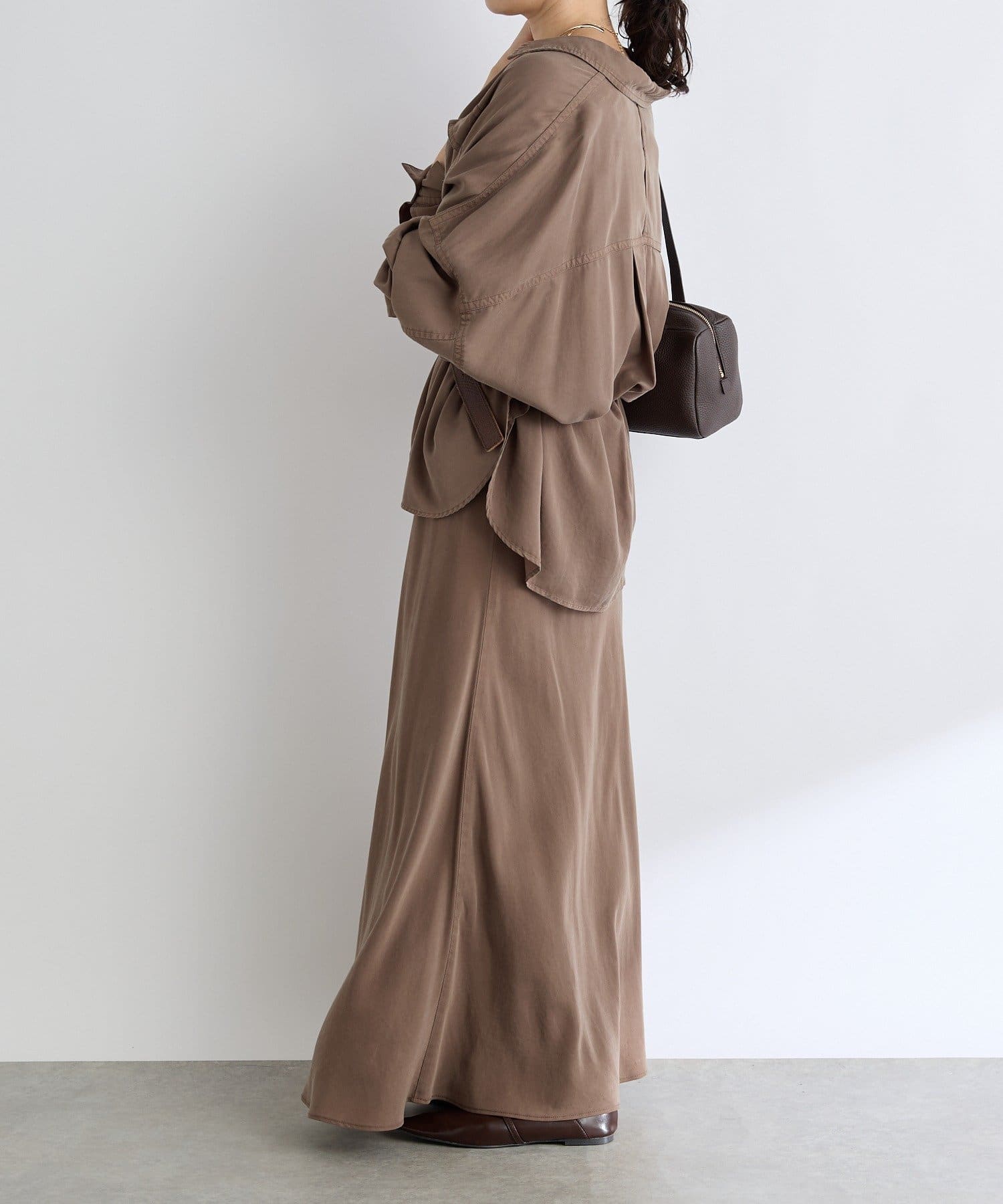 落ち感のあるテンセルツイルを使用し、製品染を施したバイヤススカート。