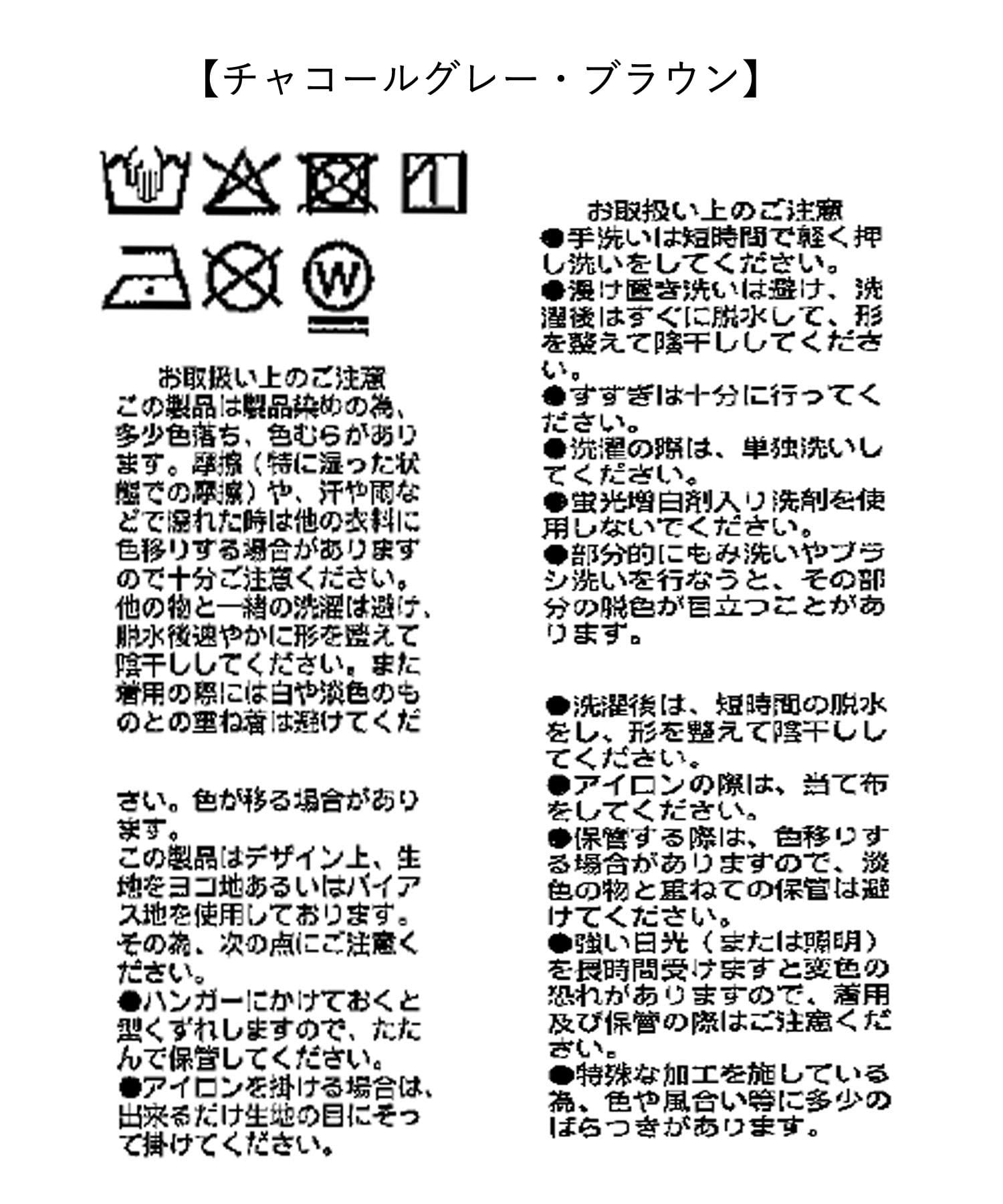 ●摩擦(特に汗や雨などで湿った状態の摩擦)により他の衣料やバッグ等に色移りすることがありますのでご注意ください。
