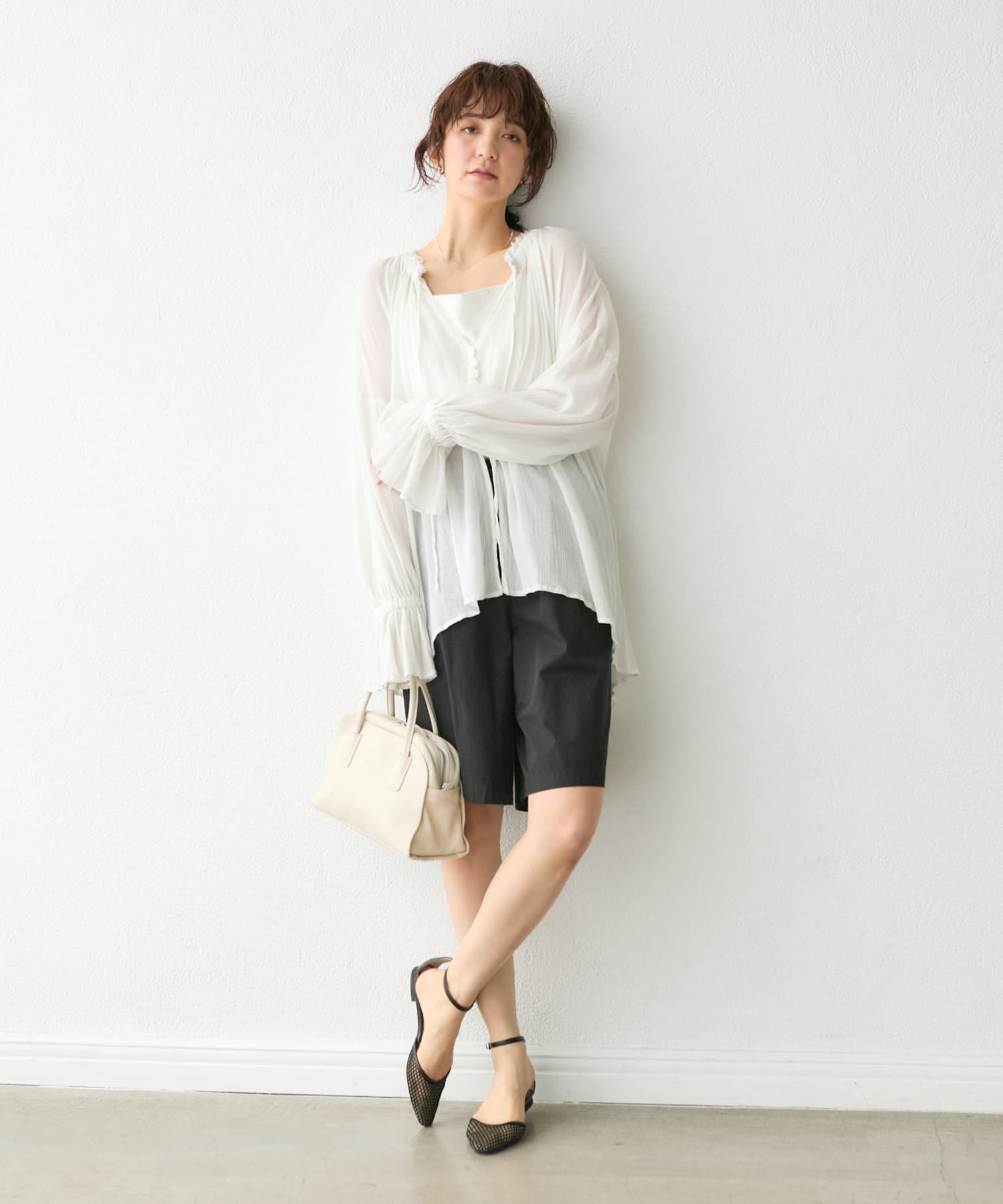 メッシュ素材から透ける肌が大人っぽく、コーデに抜け感を演出。