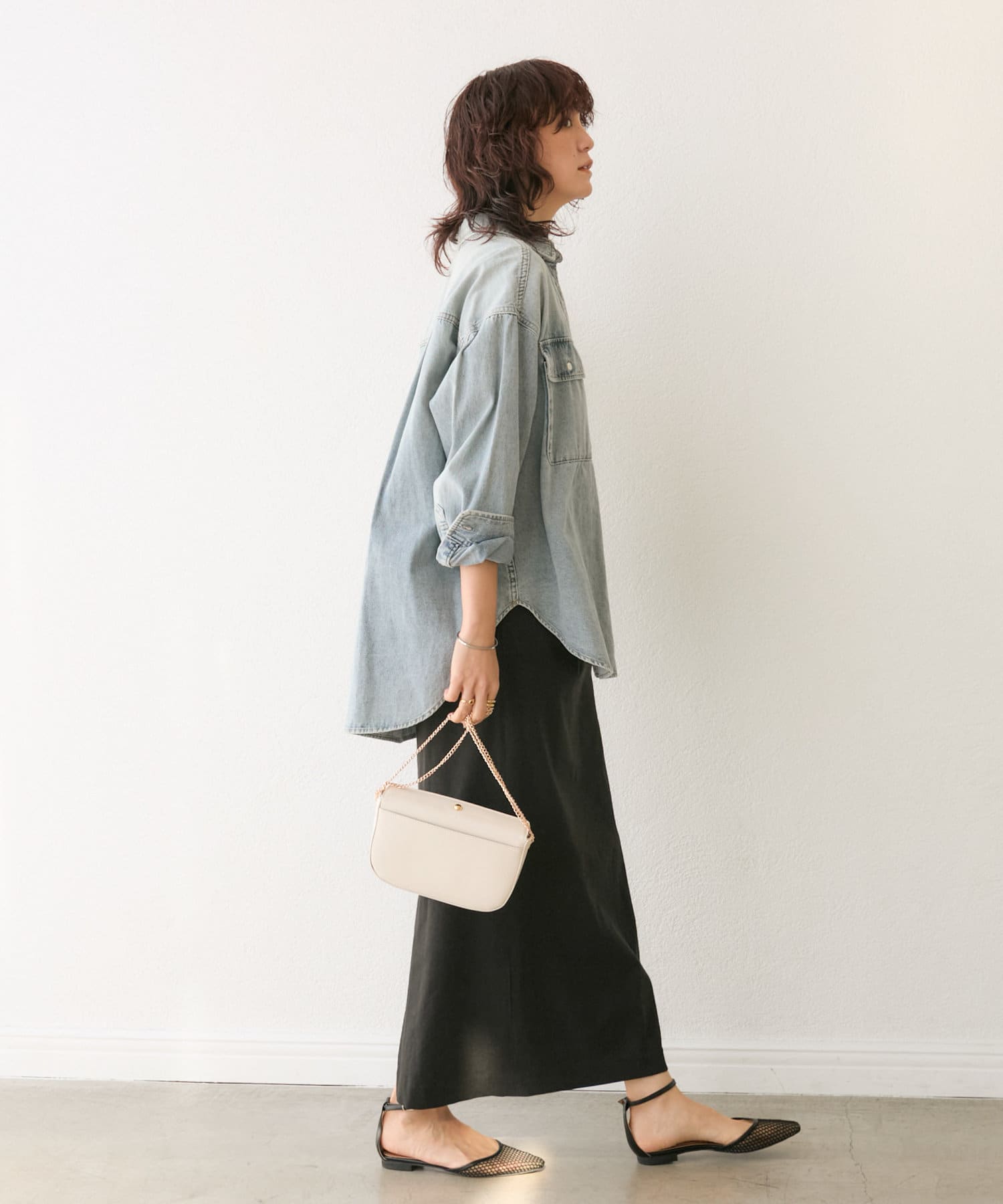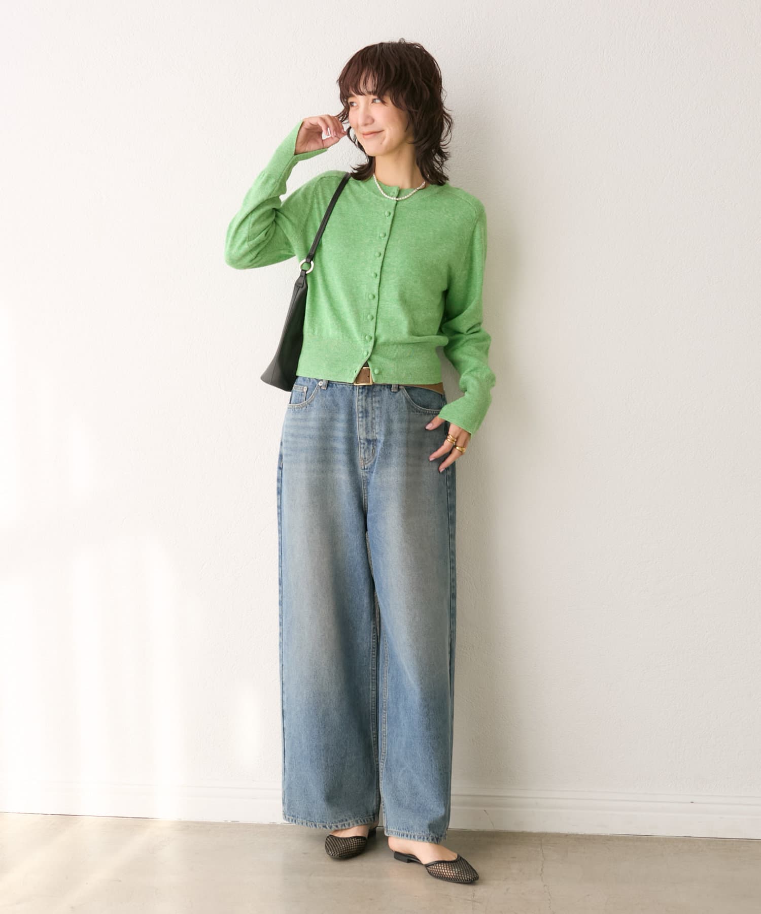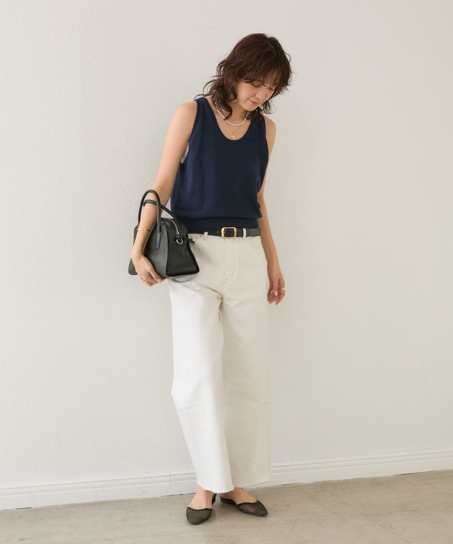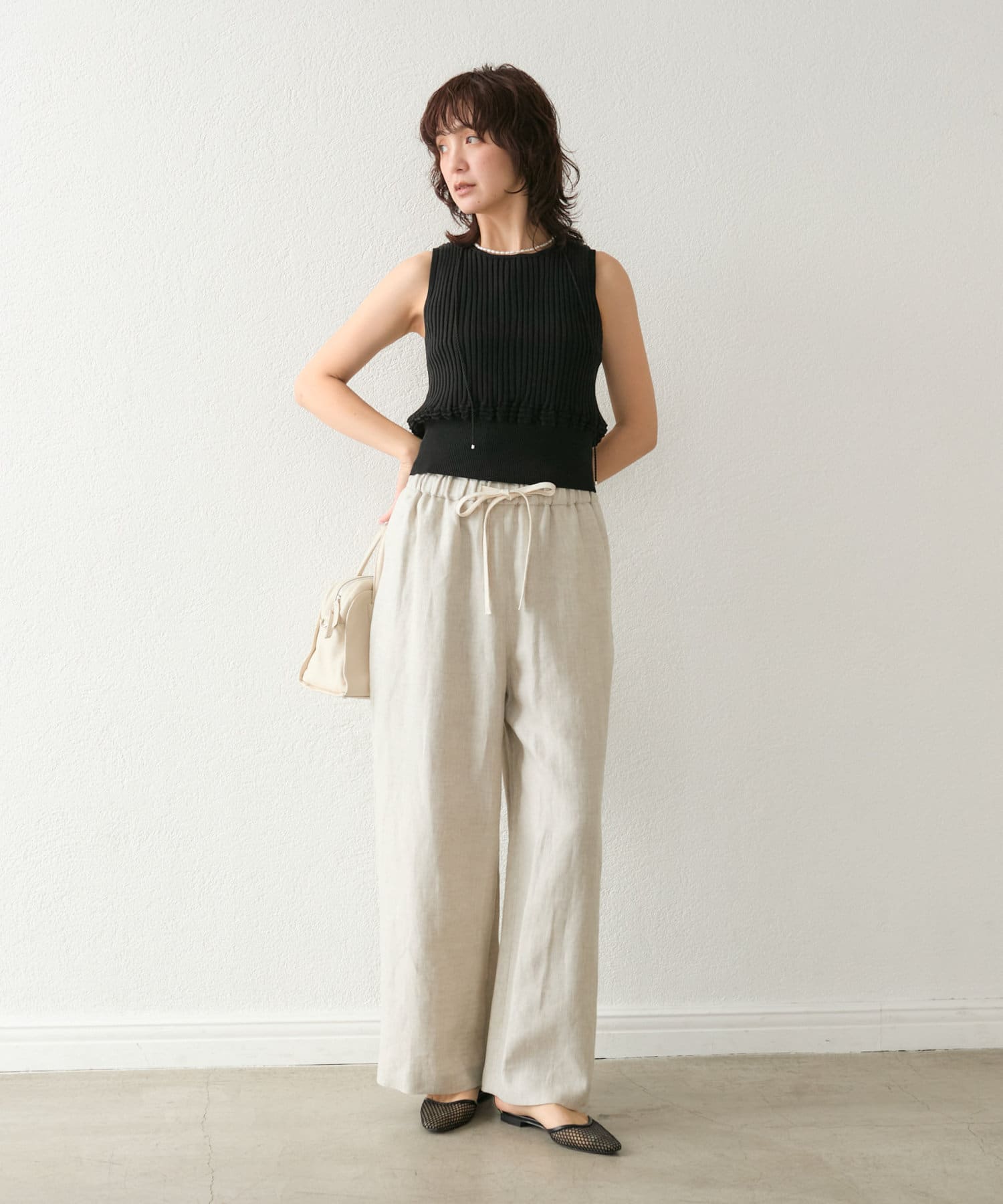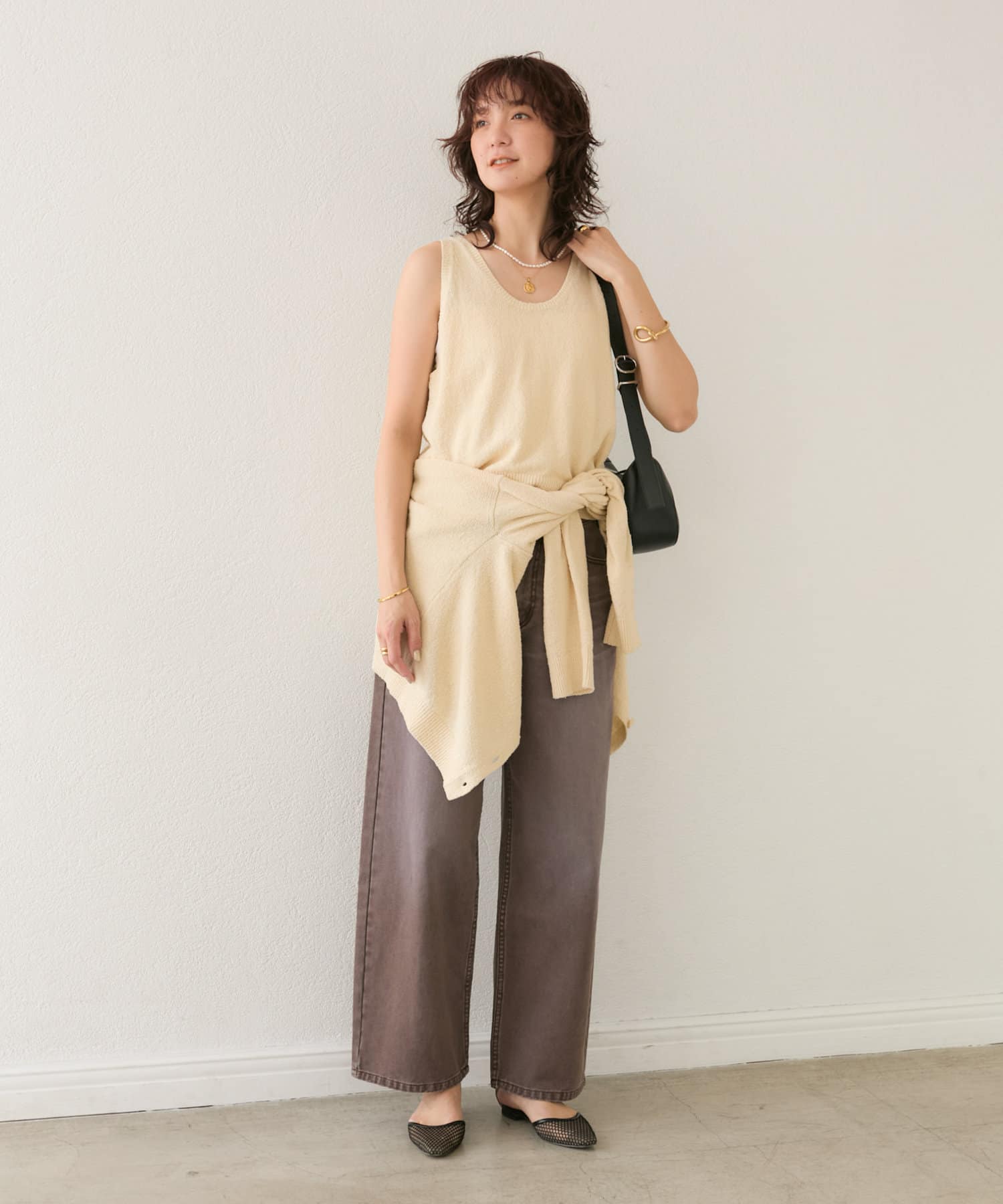 抜け感のあるシルエットなので、足元をスッキリキレイに見せ、軽めの素材感で夏まで着用可能。