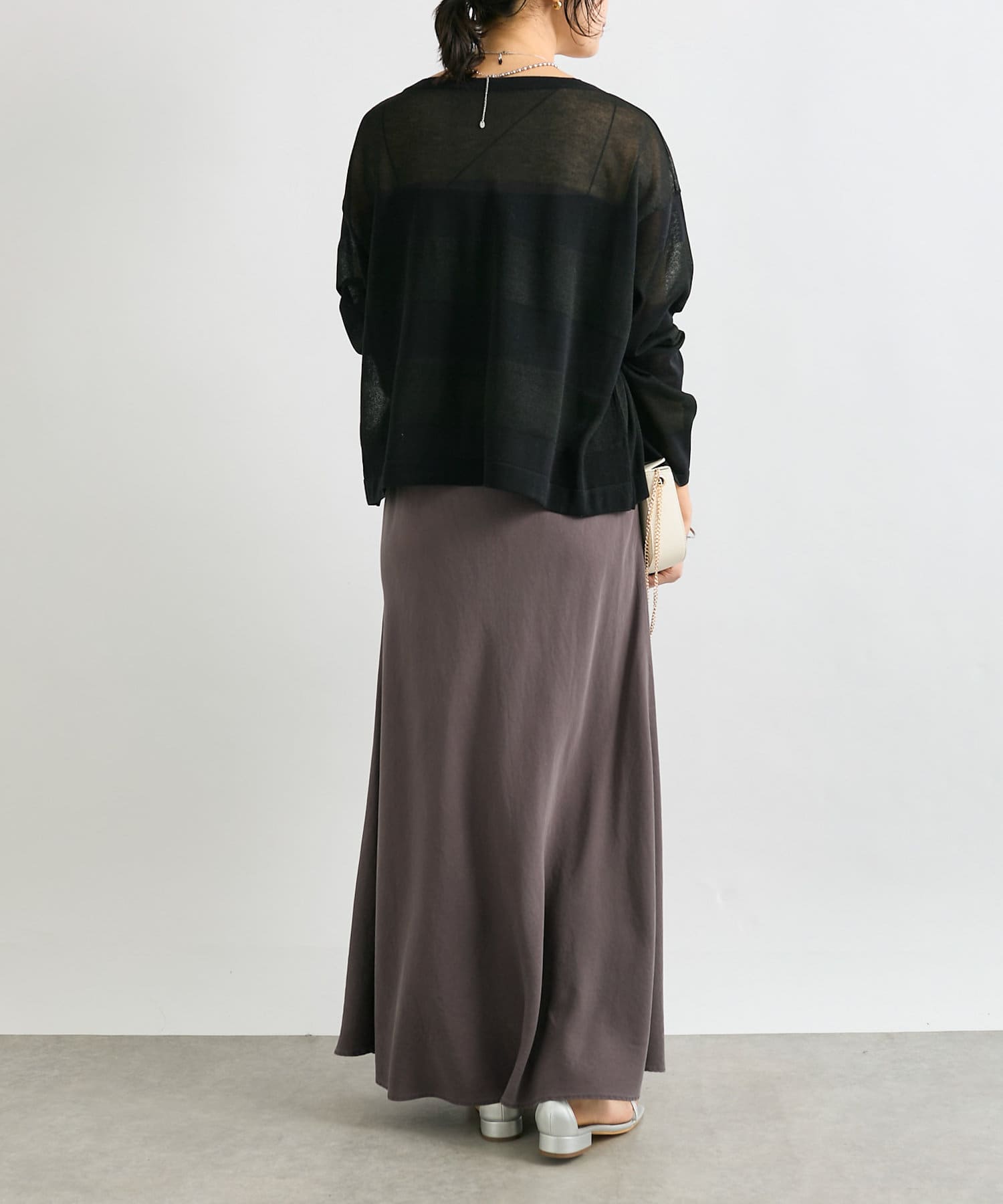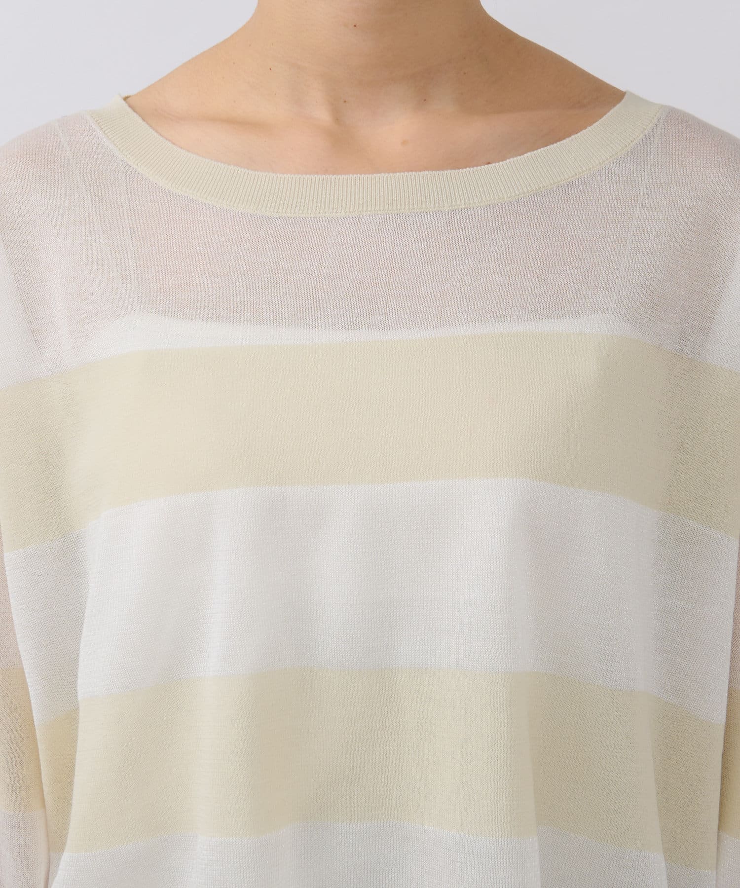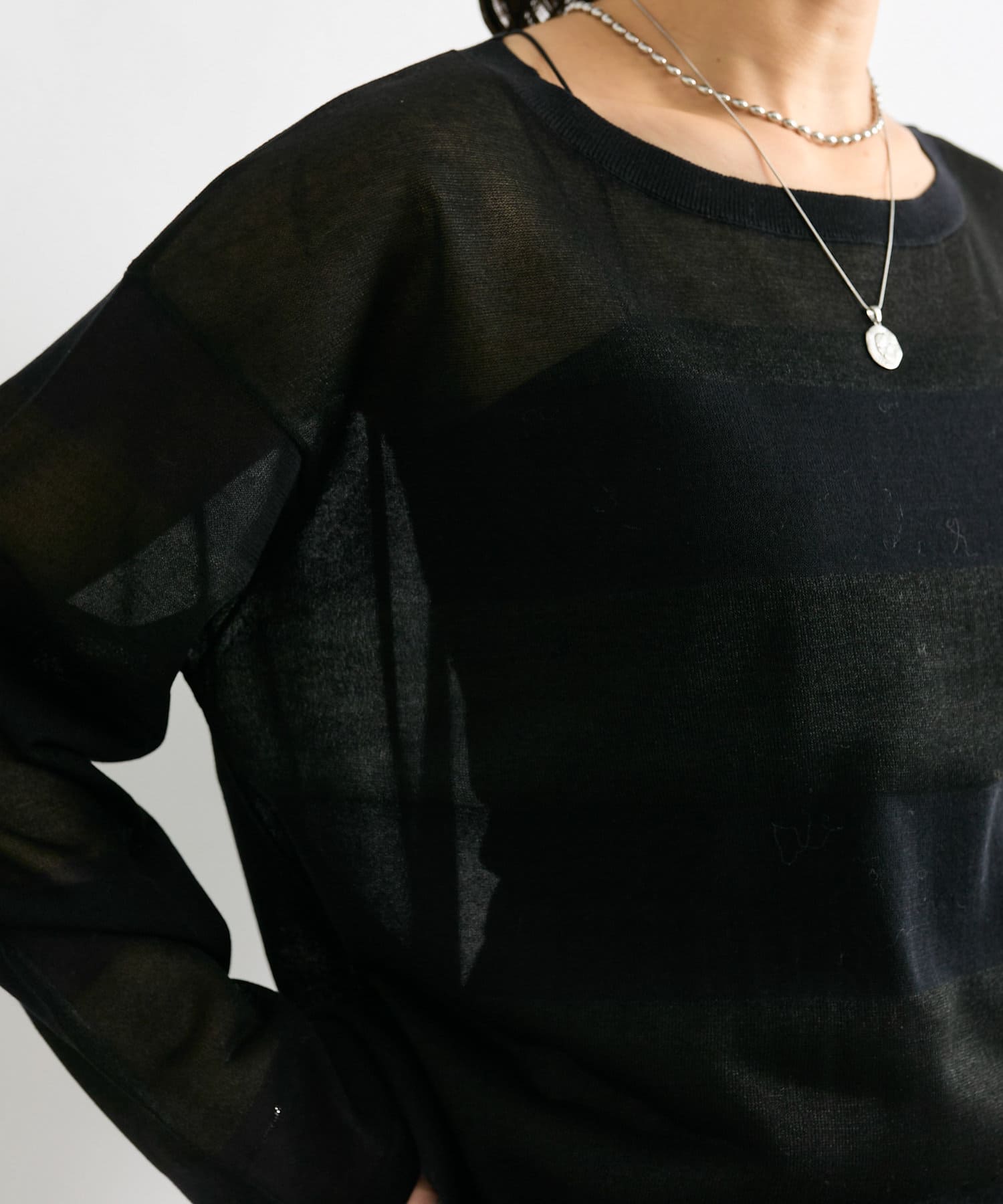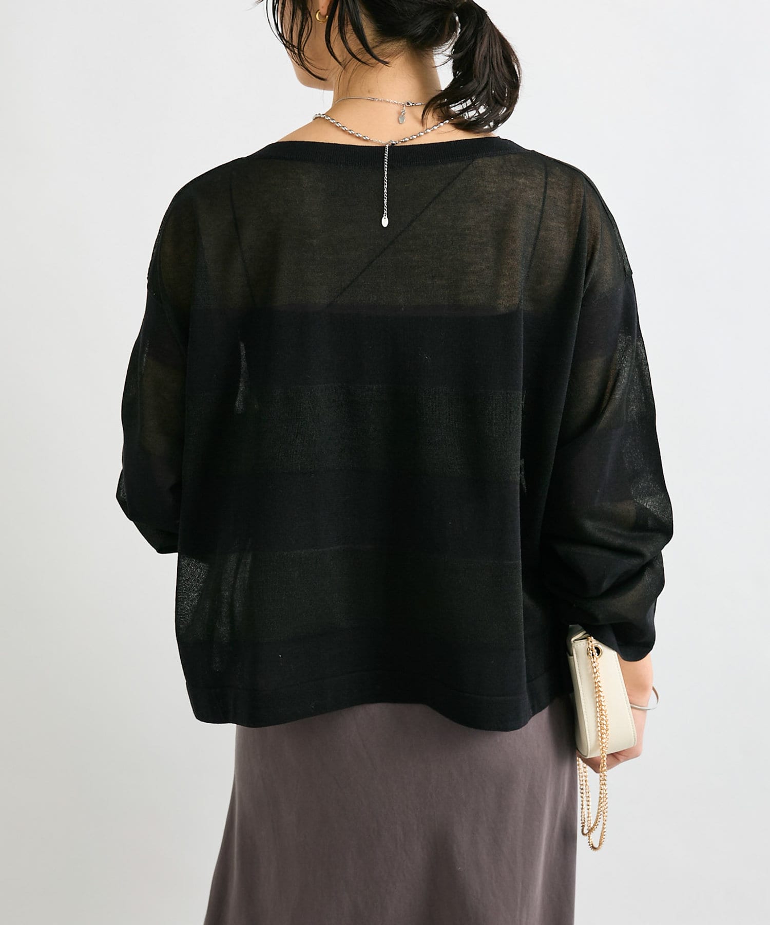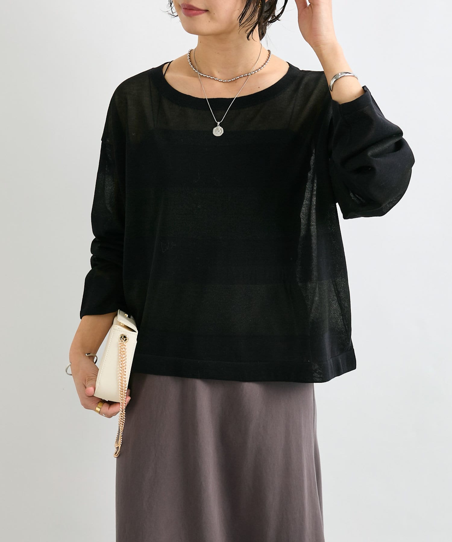 ボートネックでゆったりしたサイズ感のシンプルな形と、透けすぎない編地を選んでいるので程よい抜け感を演出。