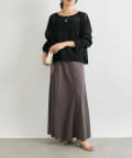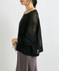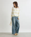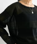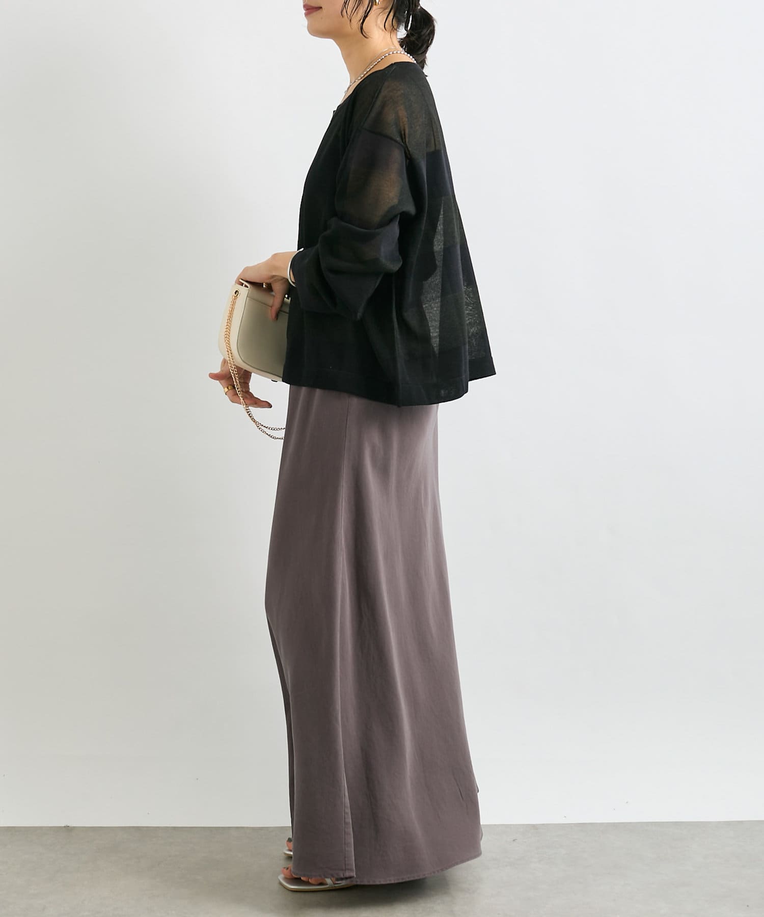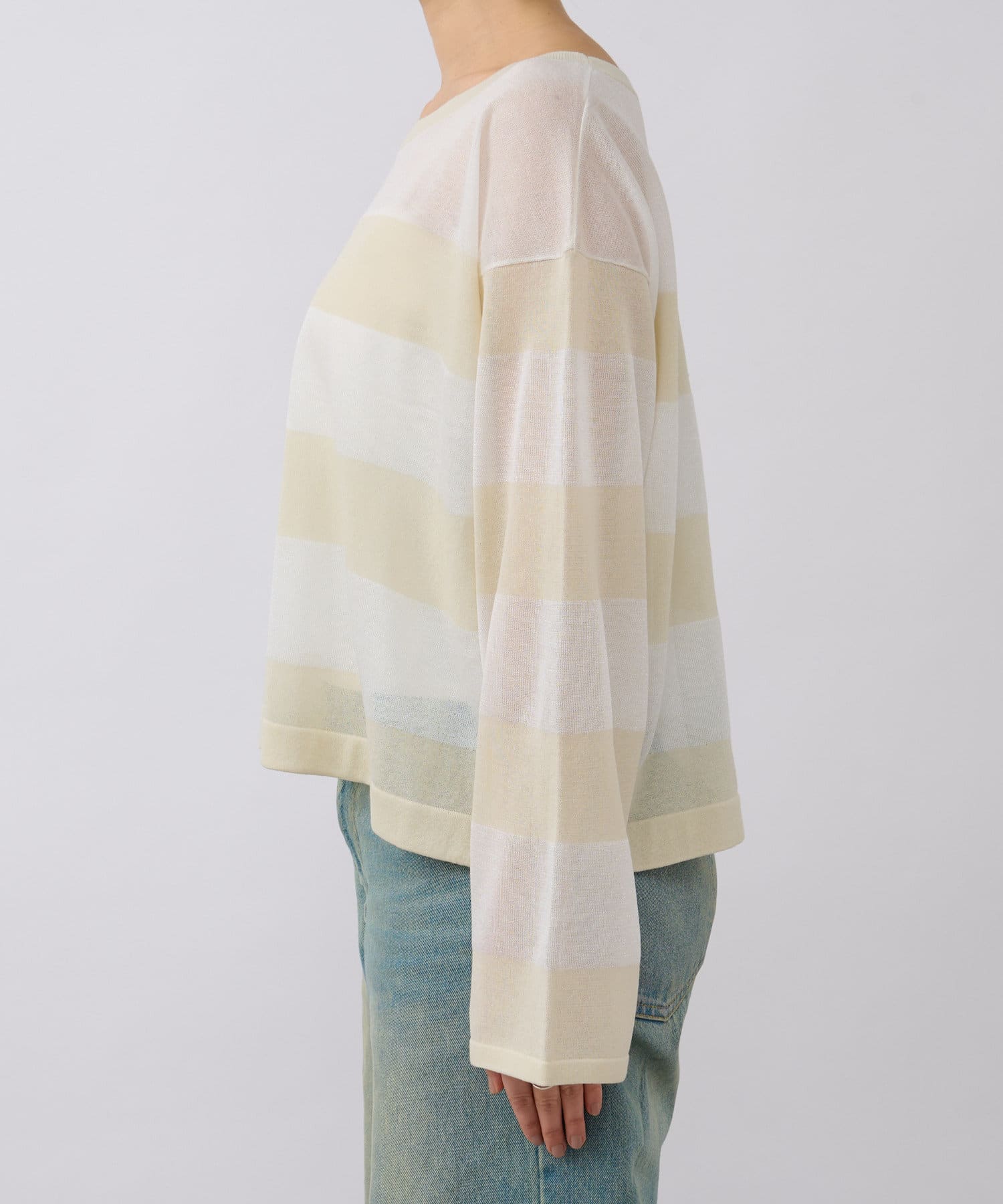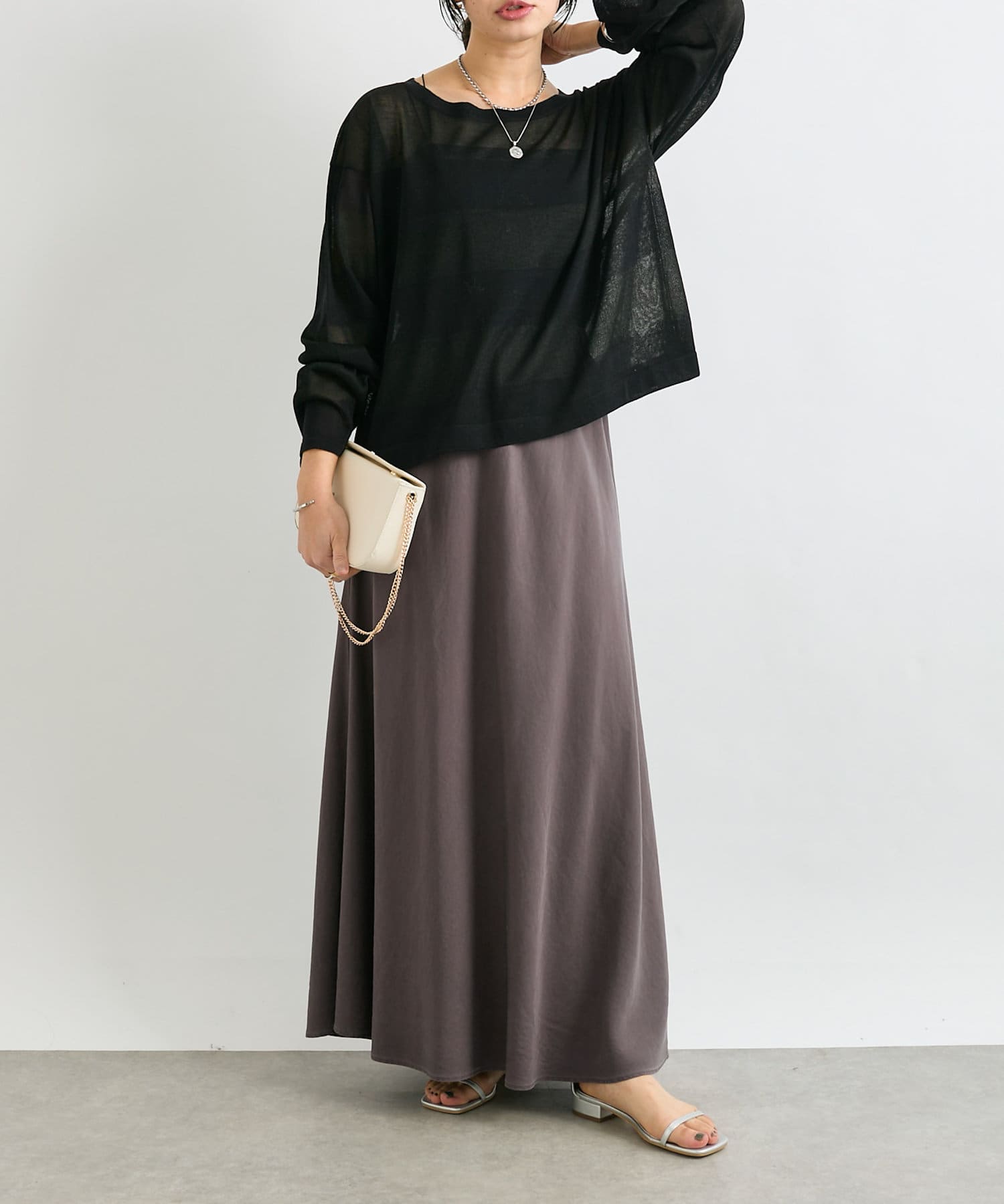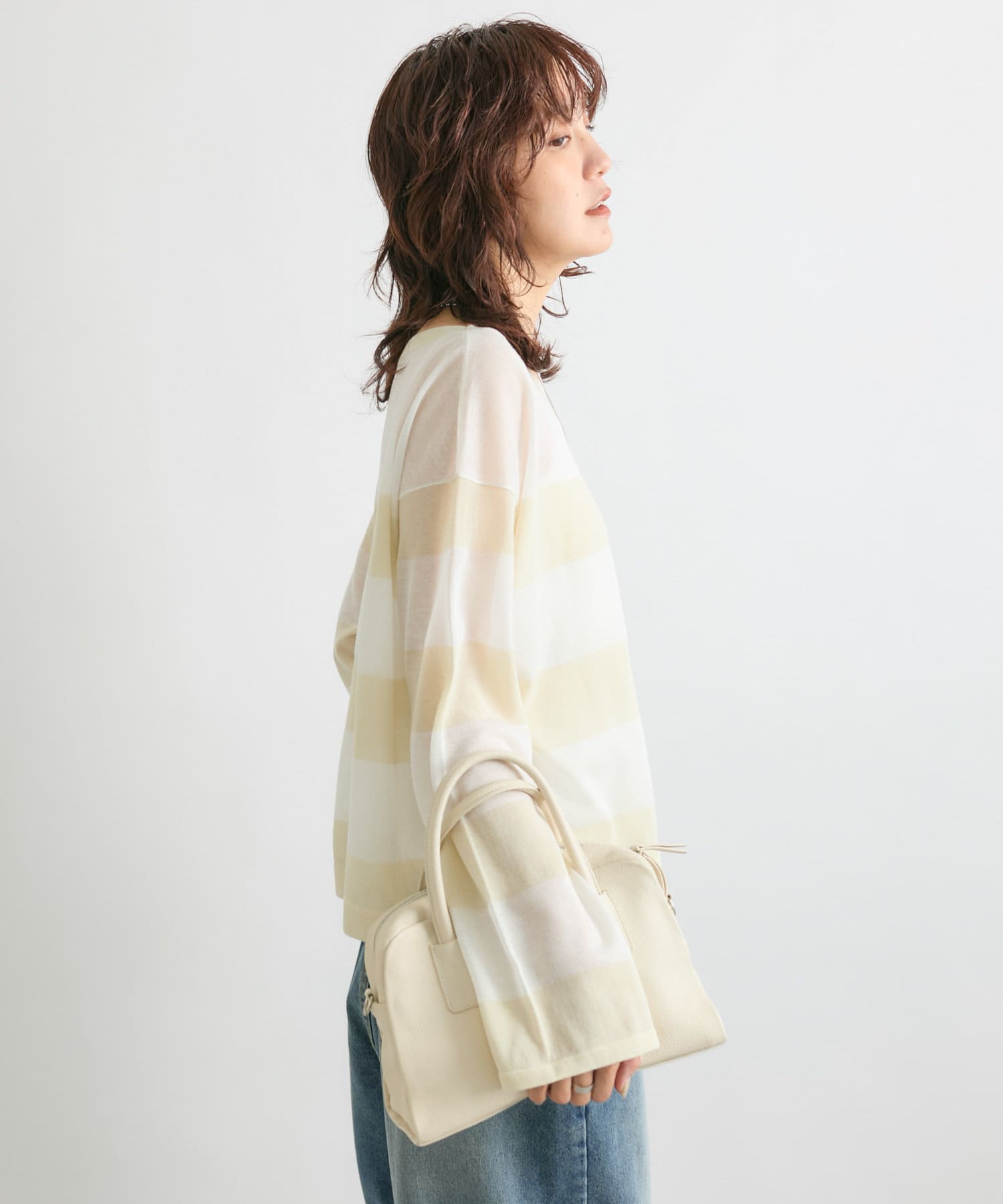 ボートネックでゆったりしたサイズ感のシンプルな形と、透けすぎない編地を選んでいるので程よい抜け感を演出。