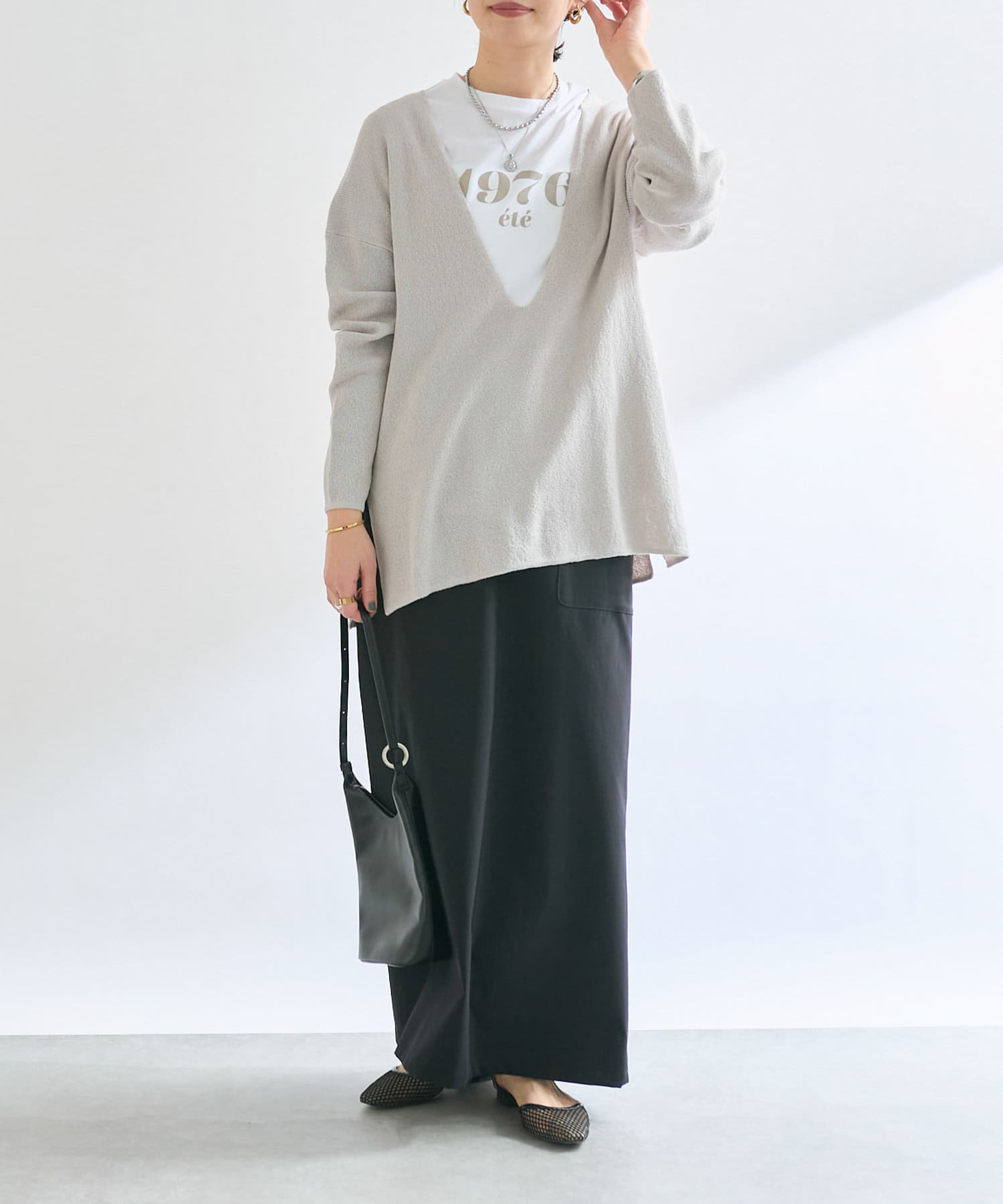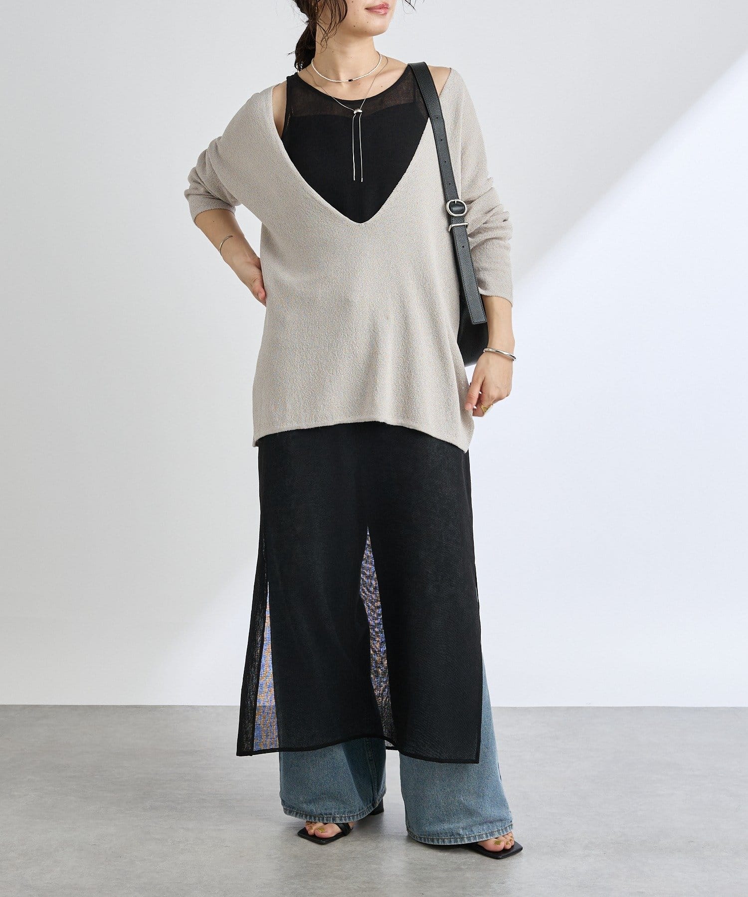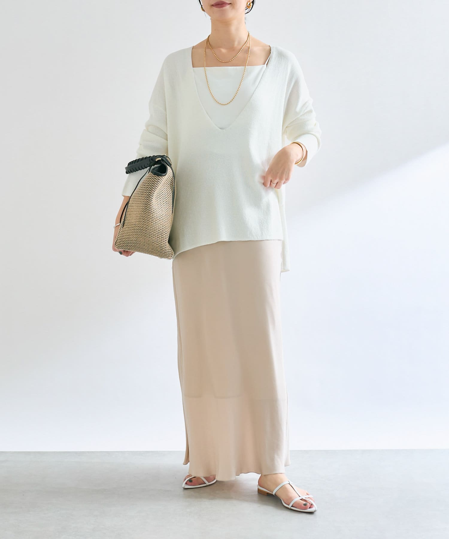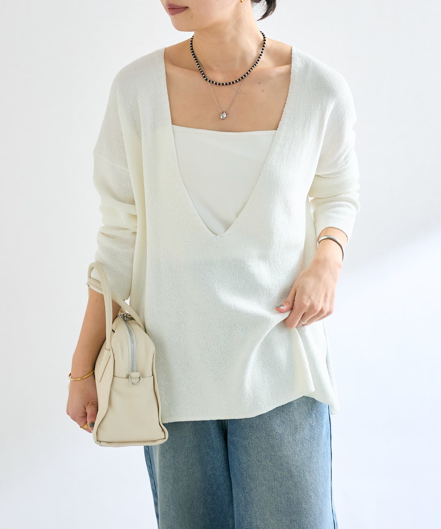 キャミソールやロゴT、リブタンクワンピースにあわせるだけでさまにプランジネックタイプのニットです。