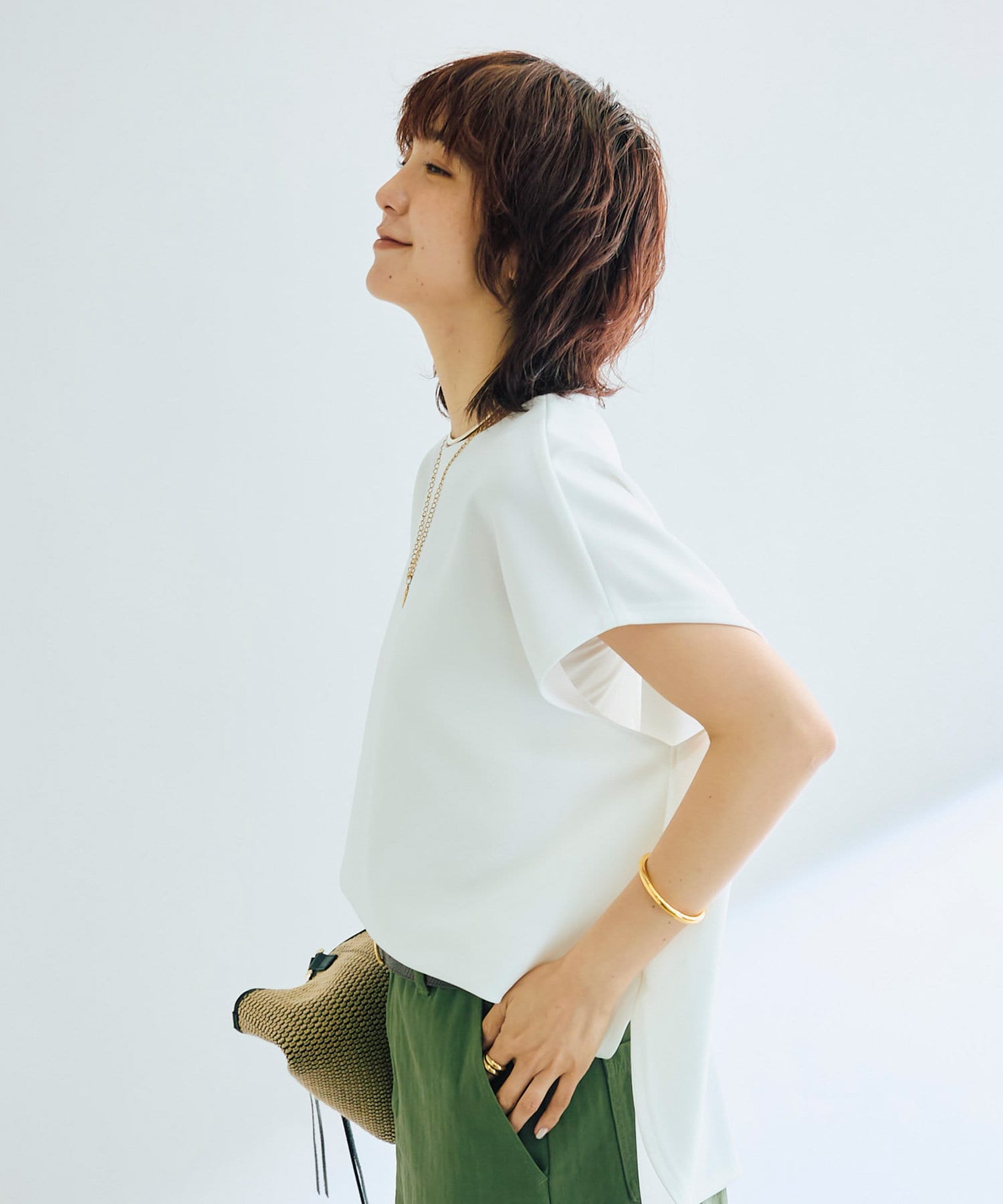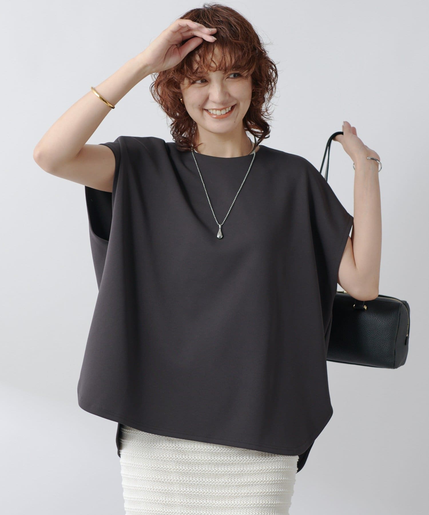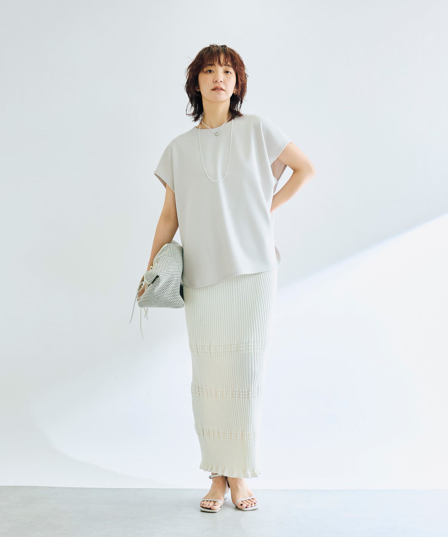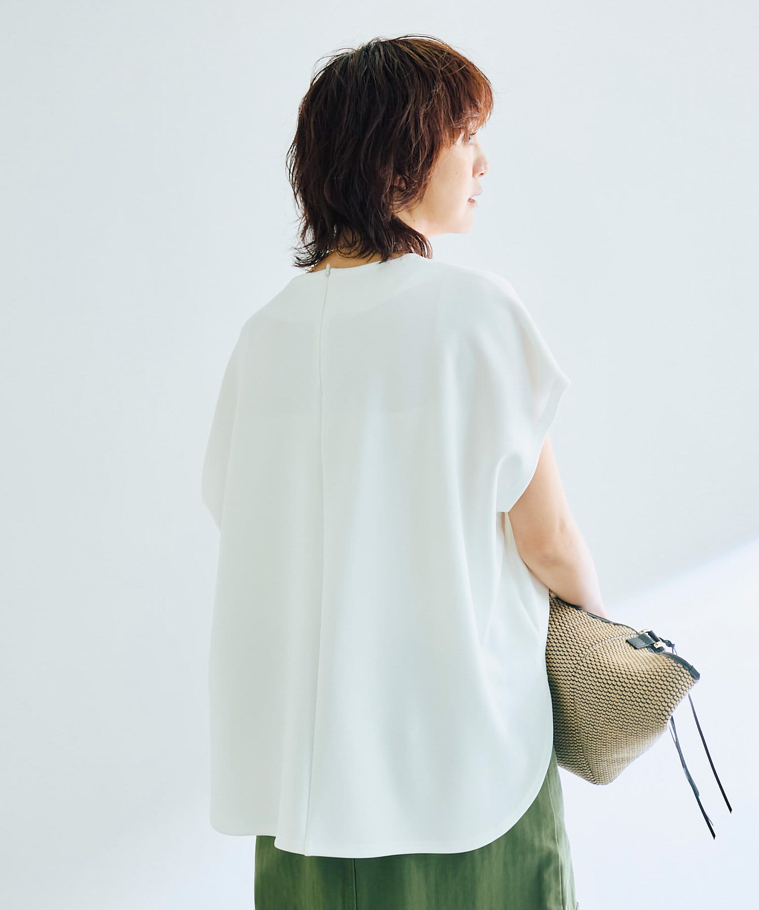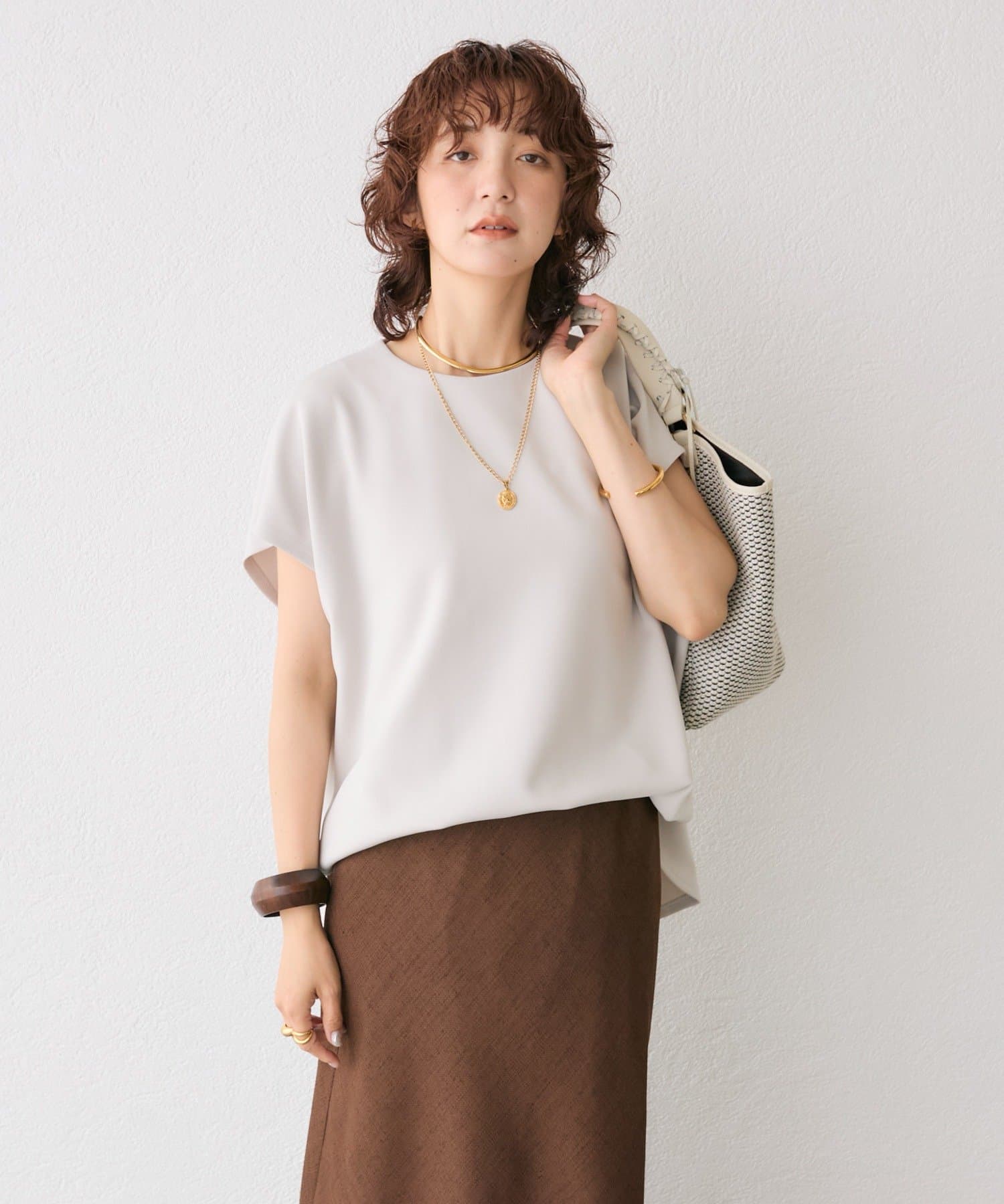 やわらかな着心地の素材でキレイ目なシルエットながら体型カバーが叶う一枚に。