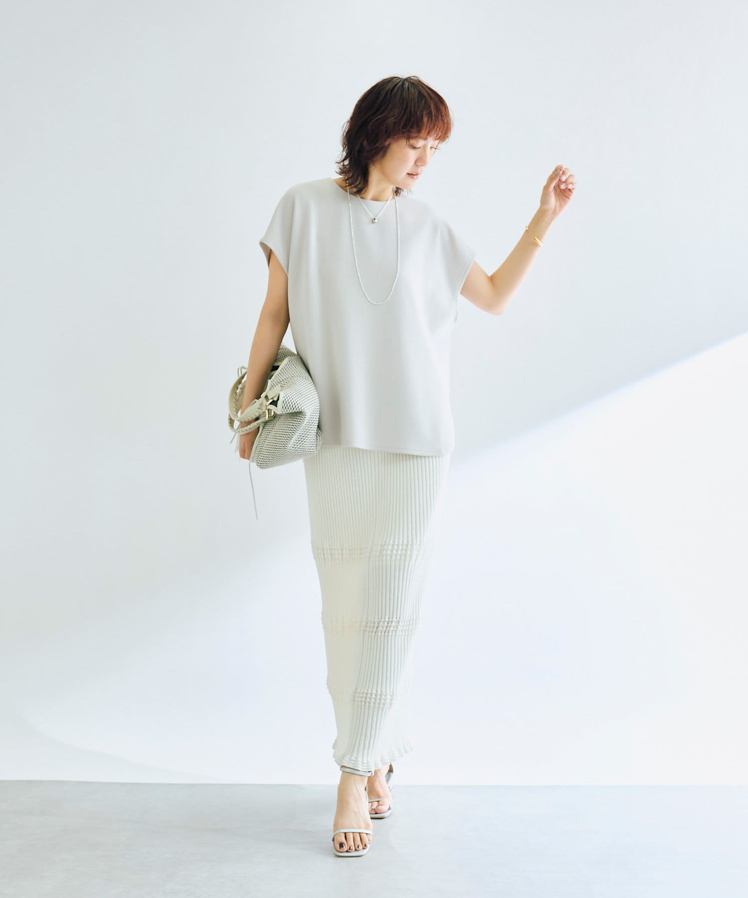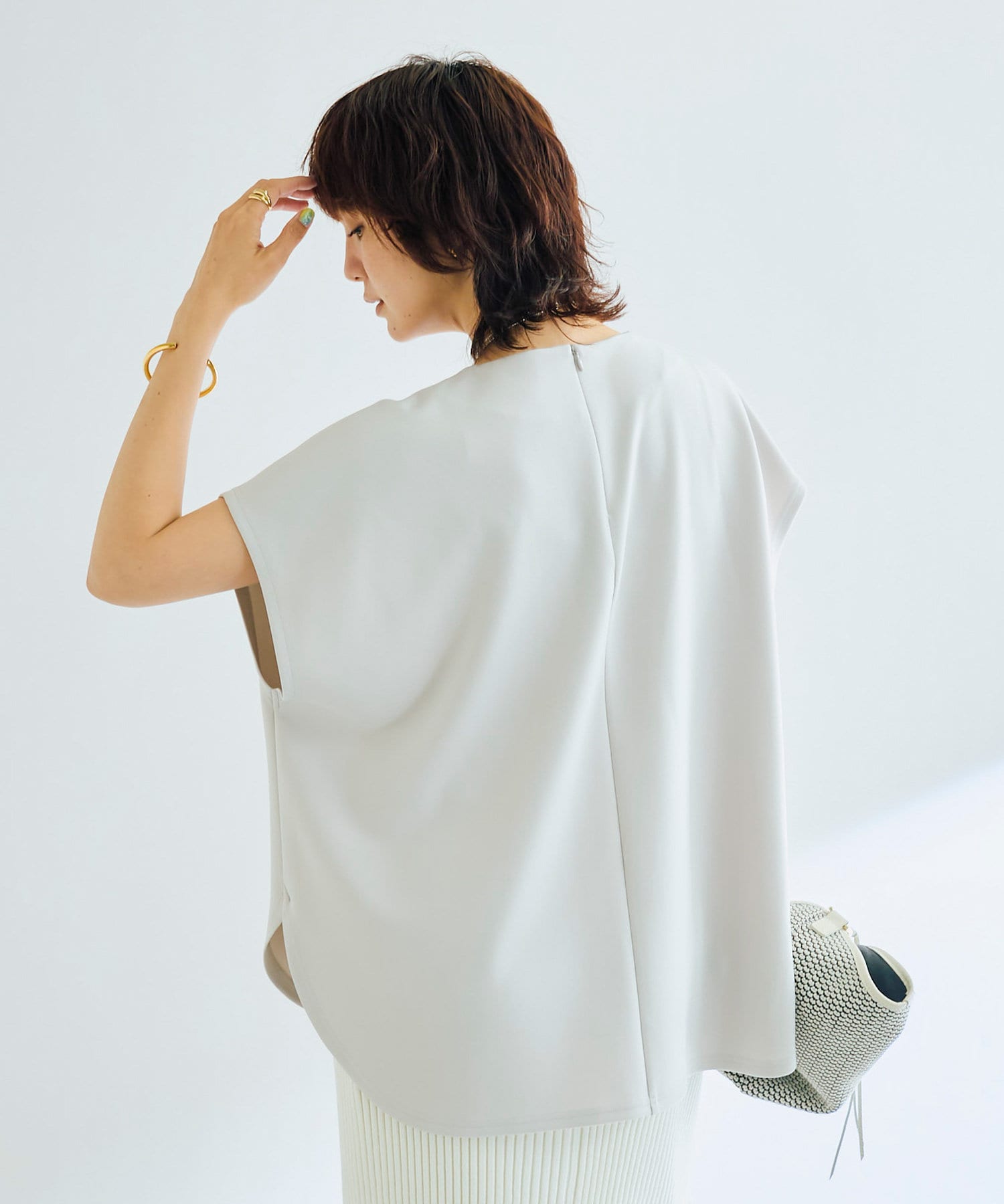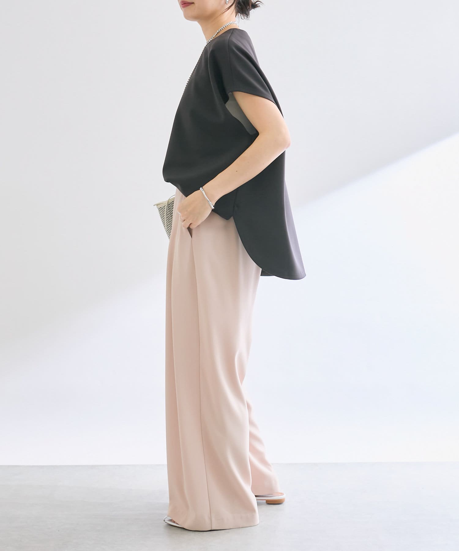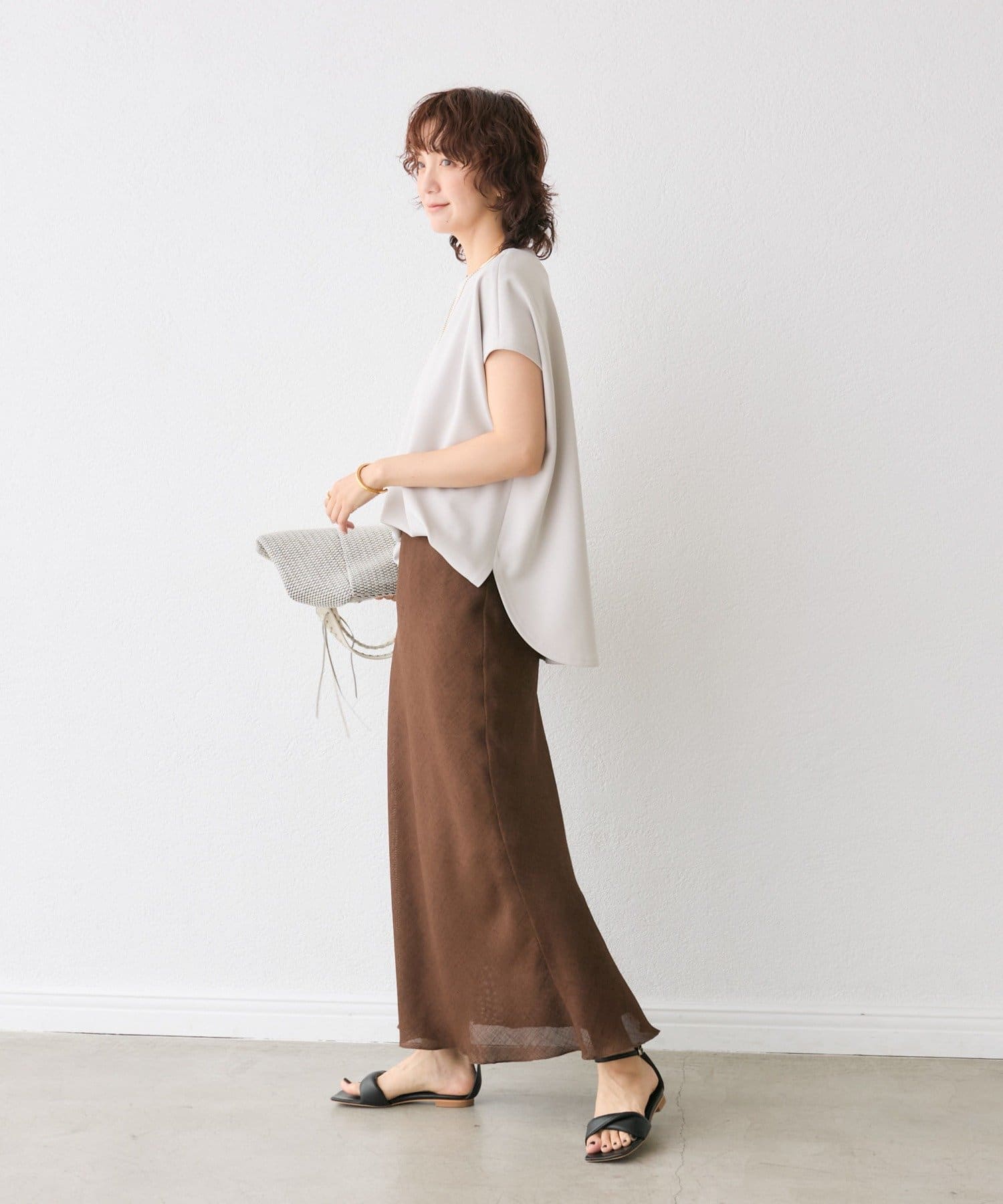 やわらかな着心地の素材でキレイ目なシルエットながら体型カバーが叶う一枚に。