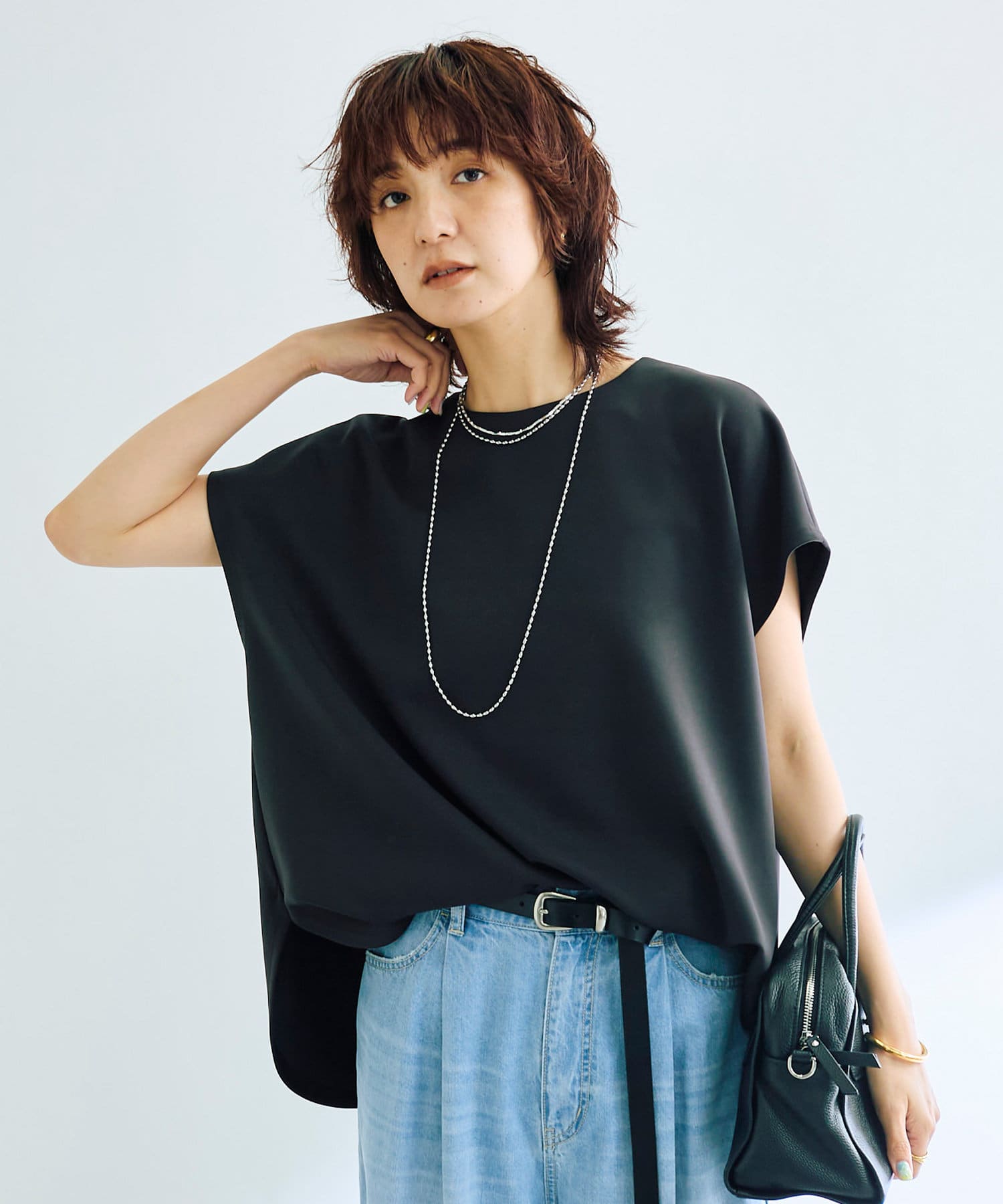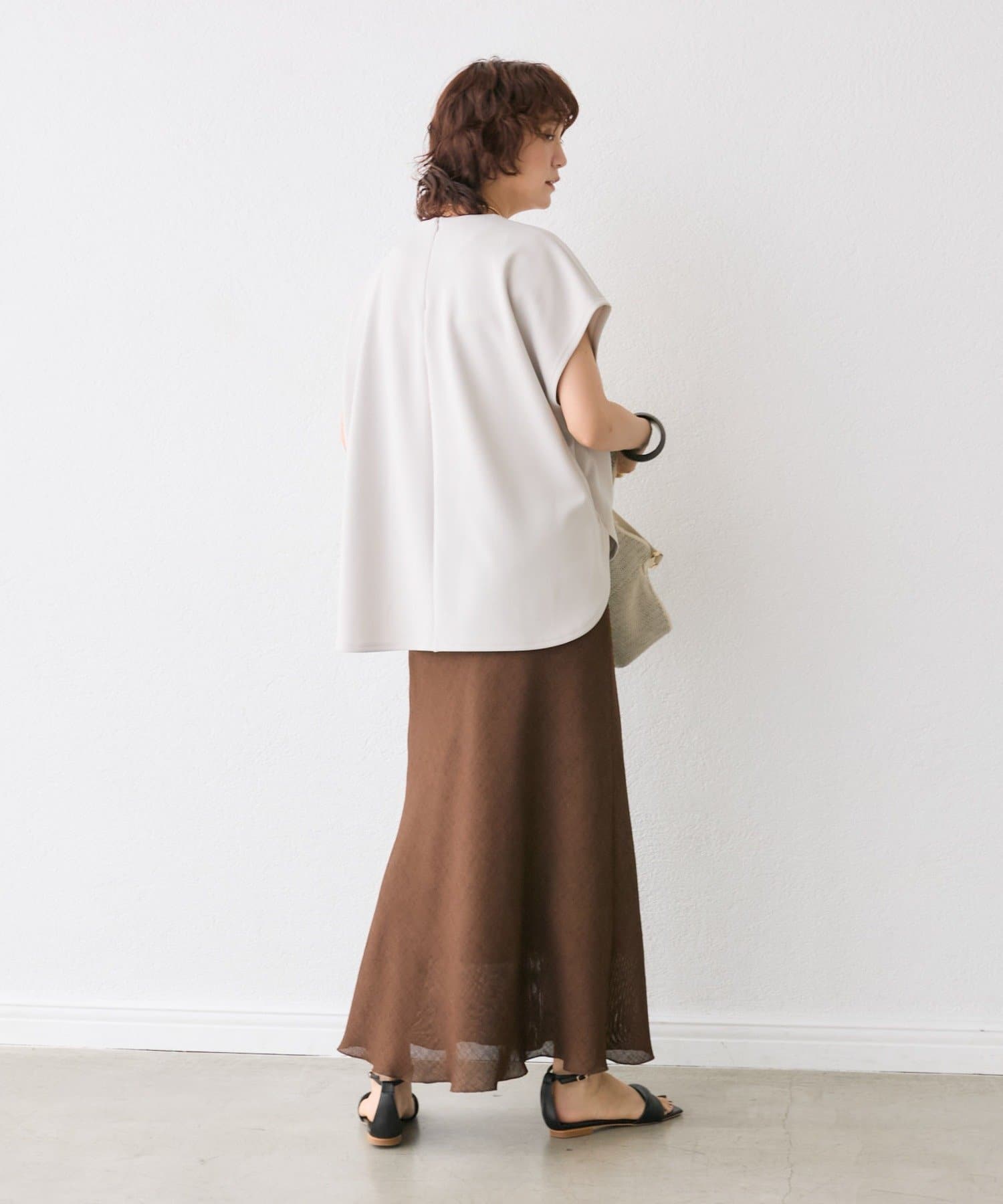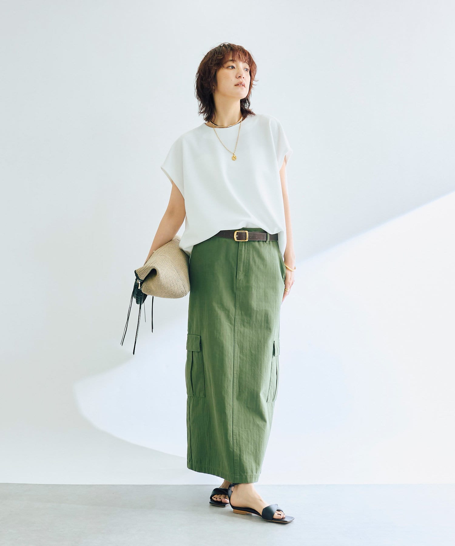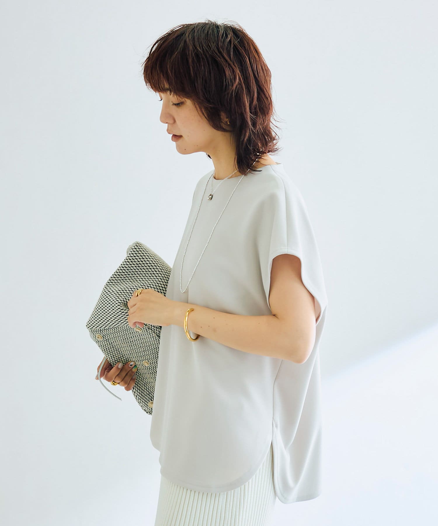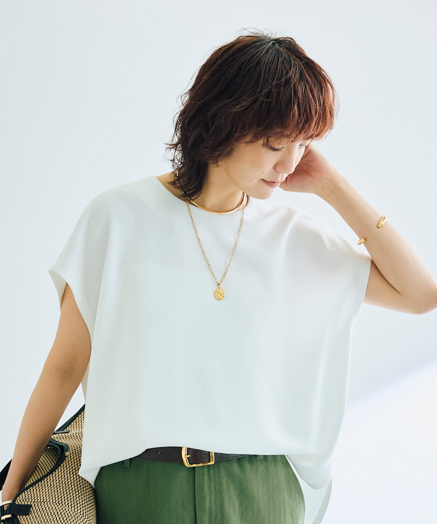 やわらかな着心地の素材でキレイ目なシルエットながら体型カバーが叶う一枚に。