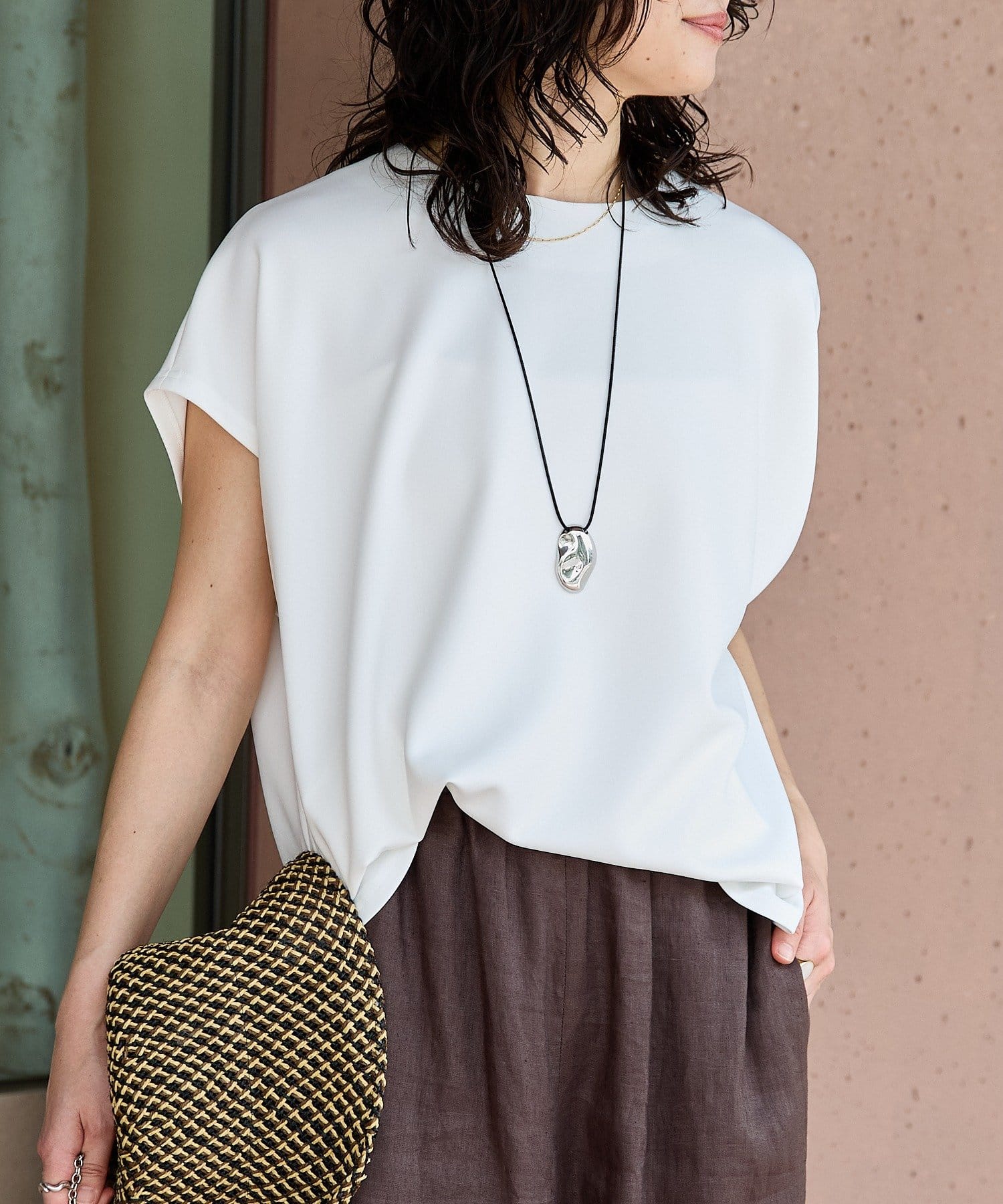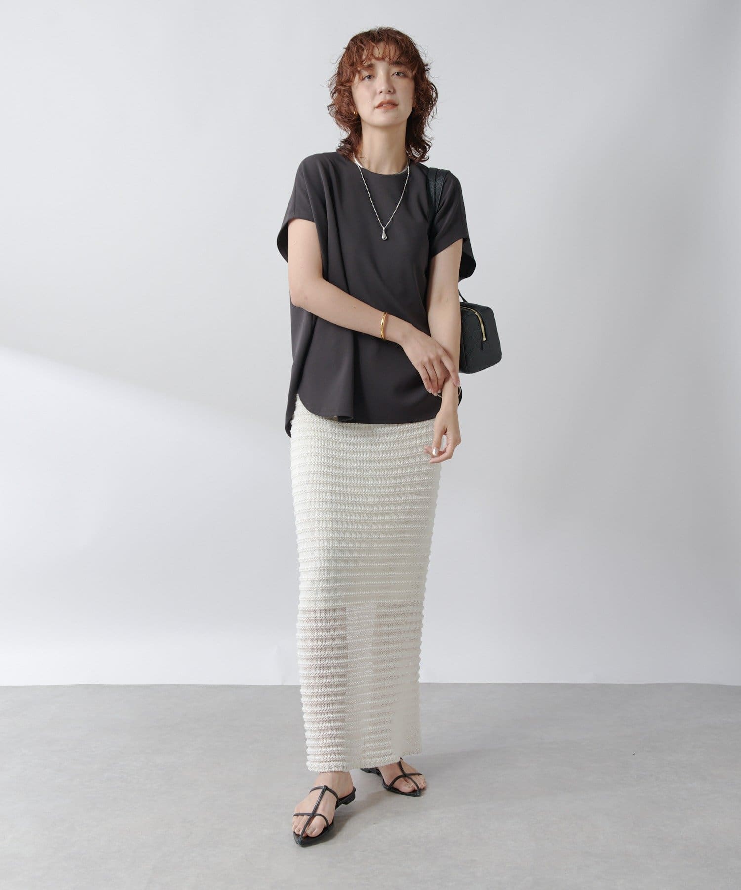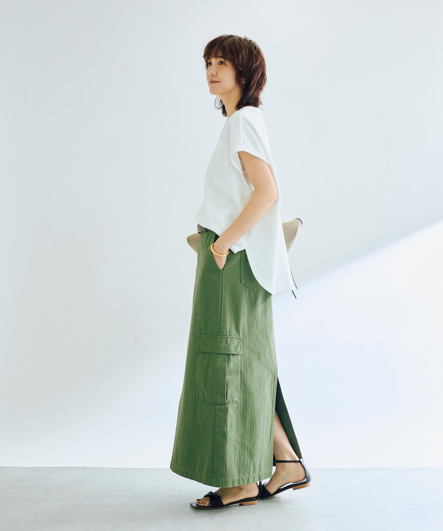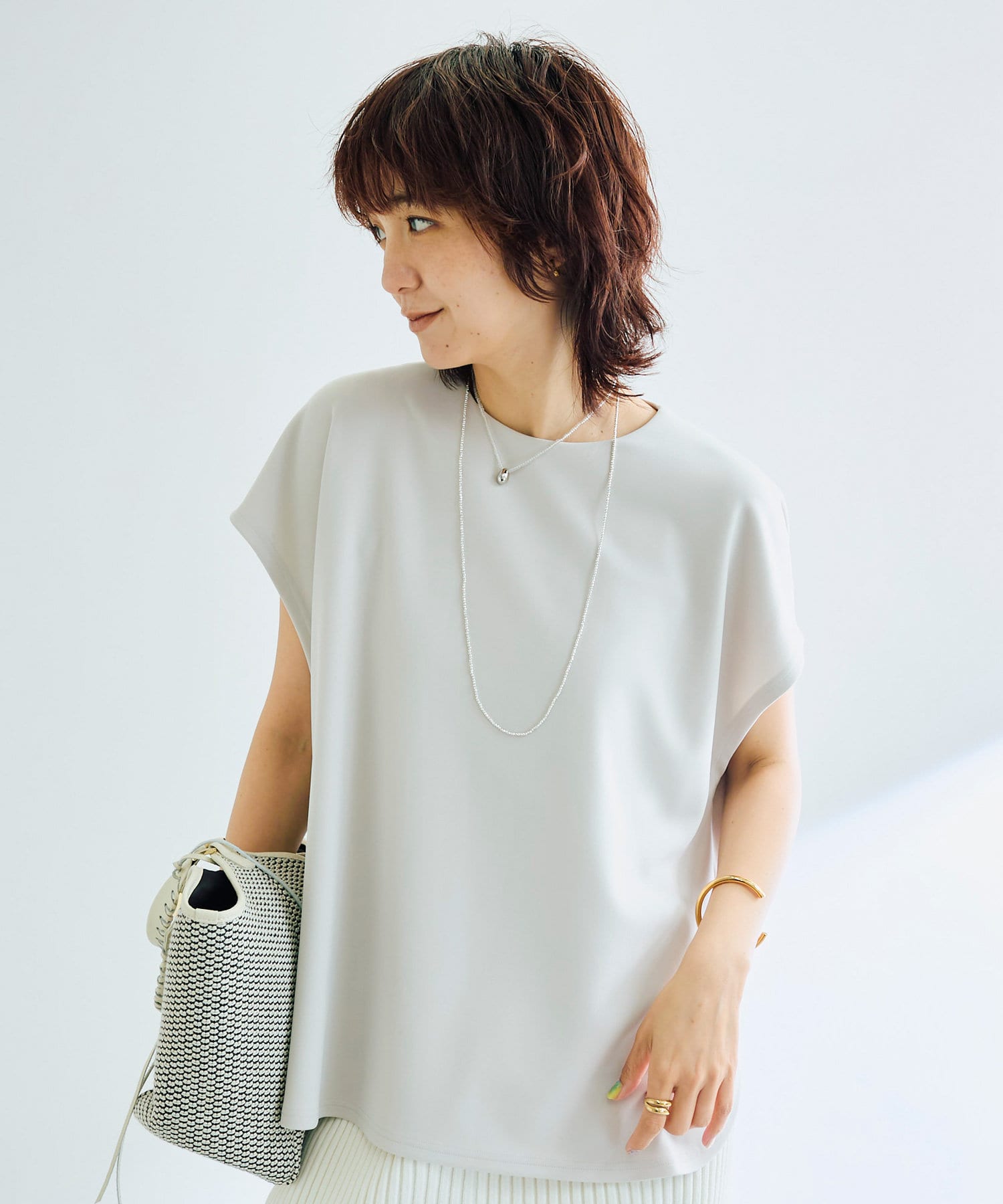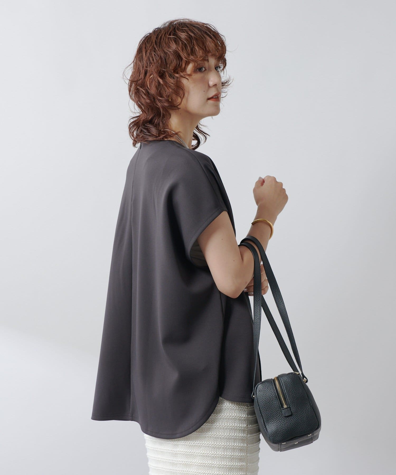 やわらかな着心地の素材でキレイ目なシルエットながら体型カバーが叶う一枚に。