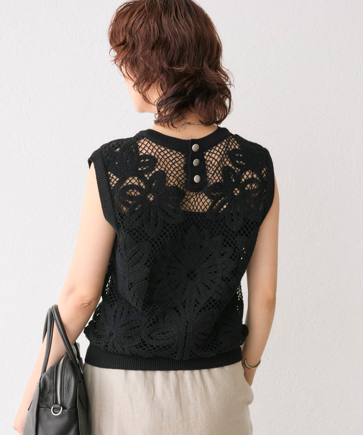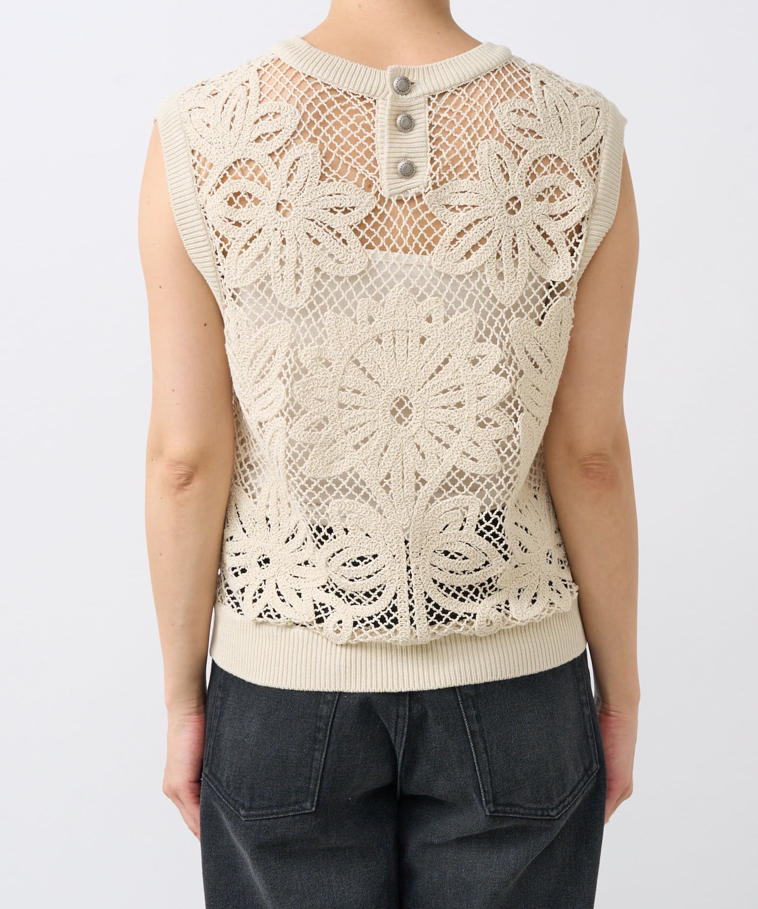 後ろ首元には金属製のボタンをアクセントに、ウエスタンテイストなデザインに。