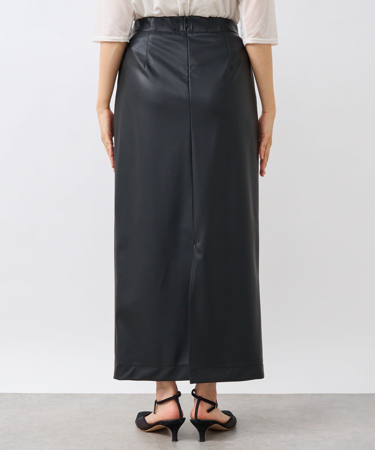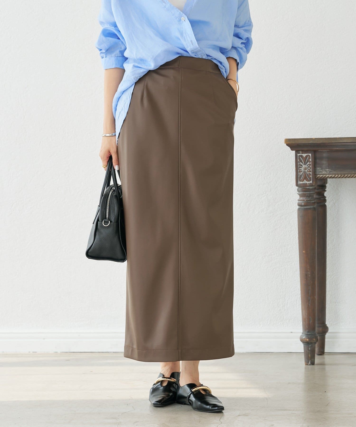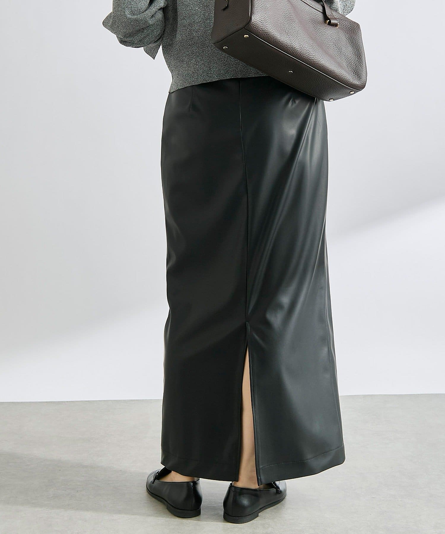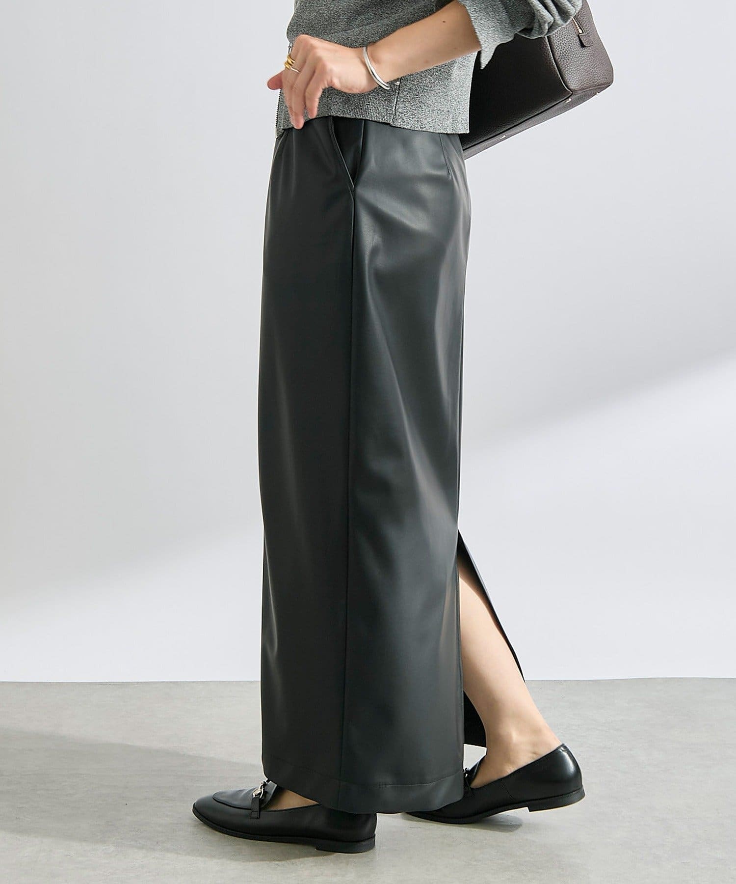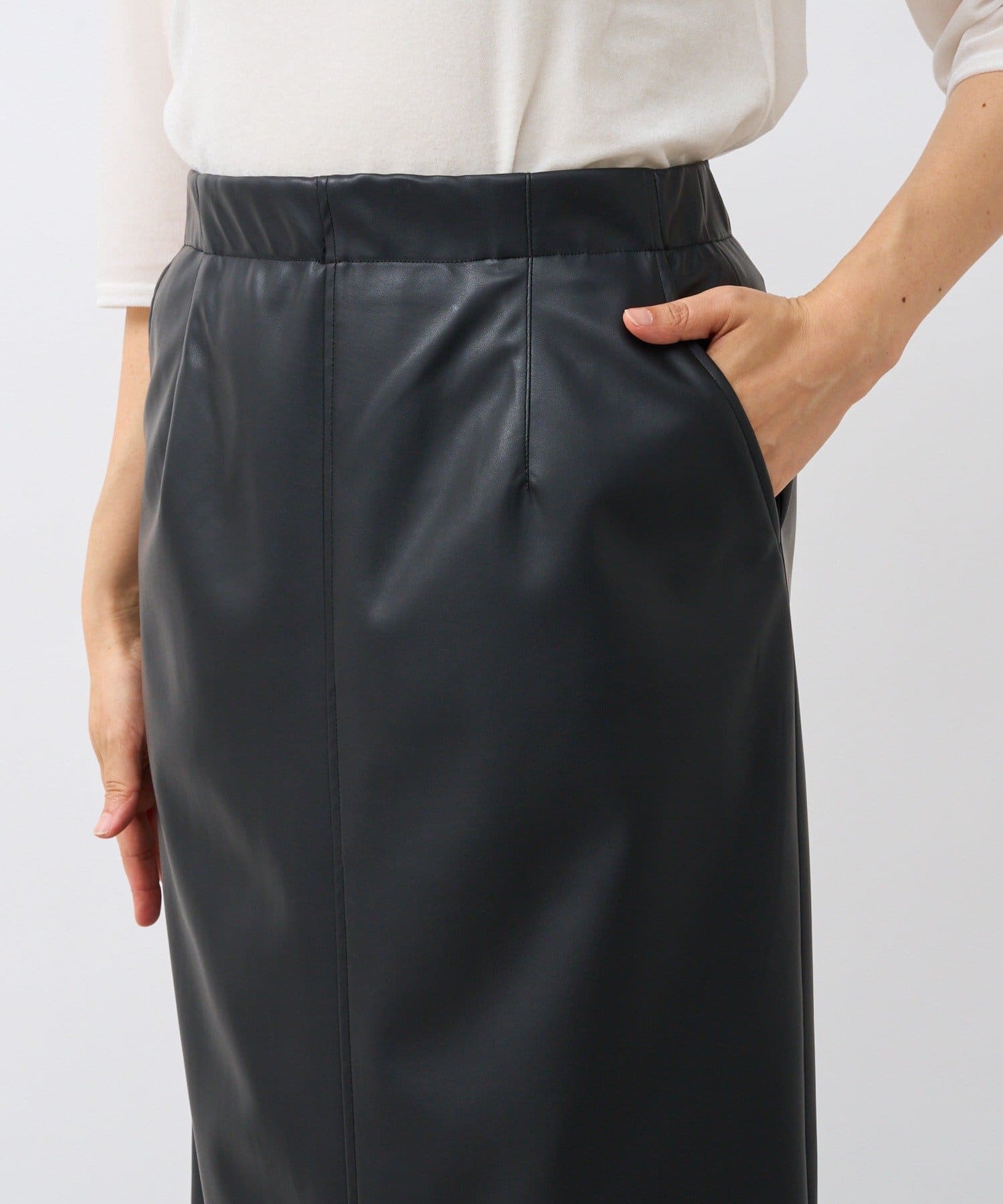 トレンドのレザーライクな素材を使用した、シンプルなタイトスカート。