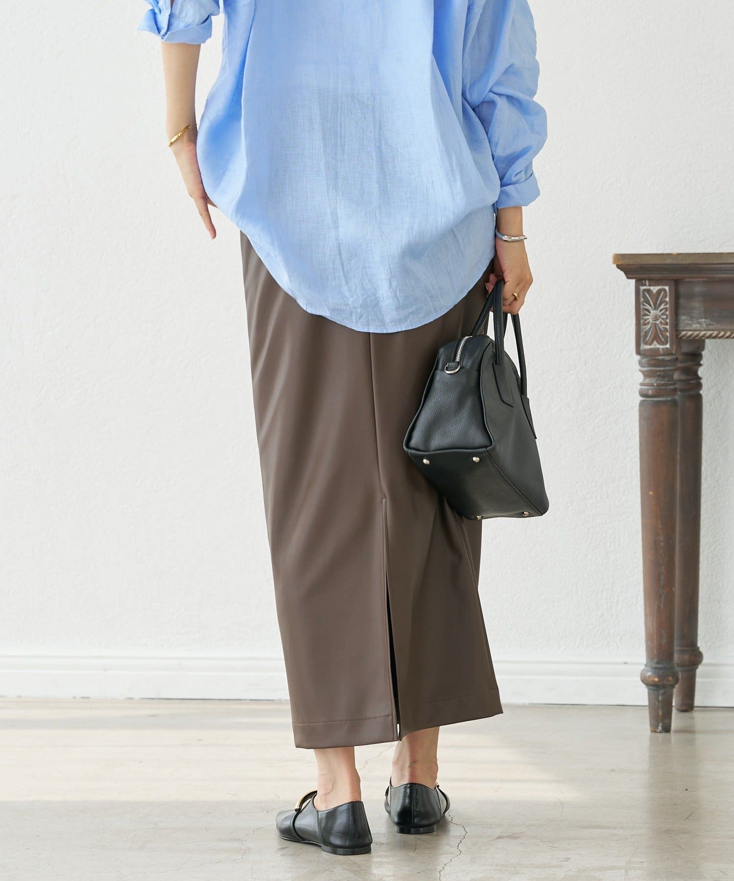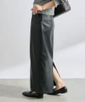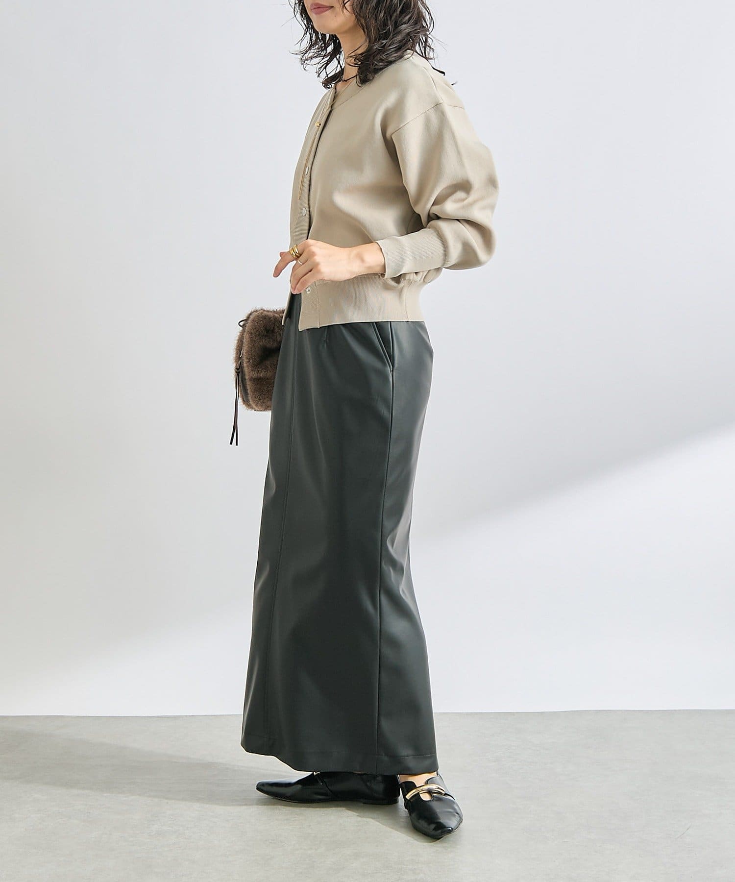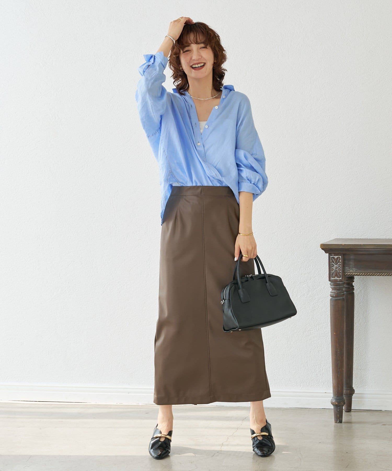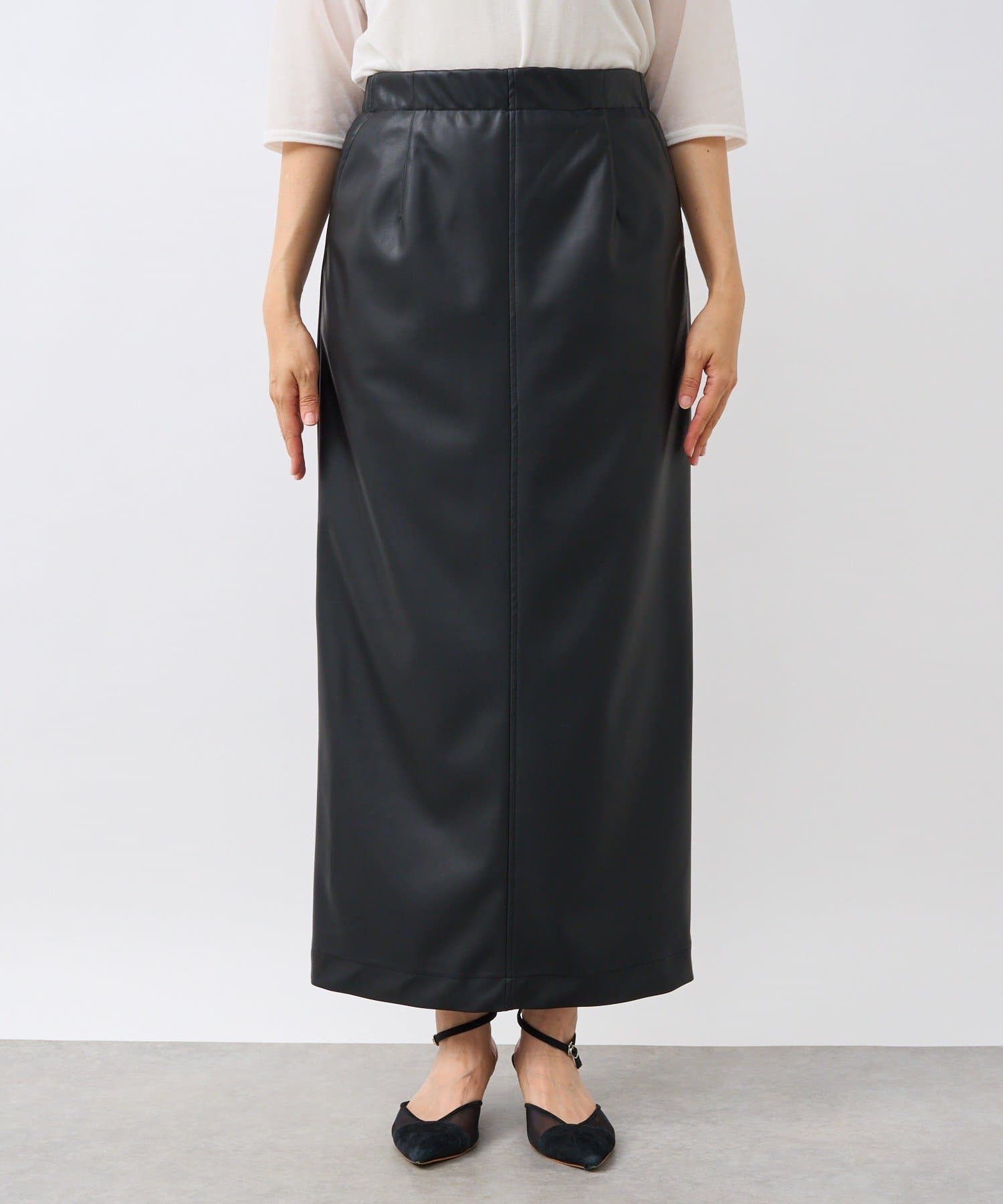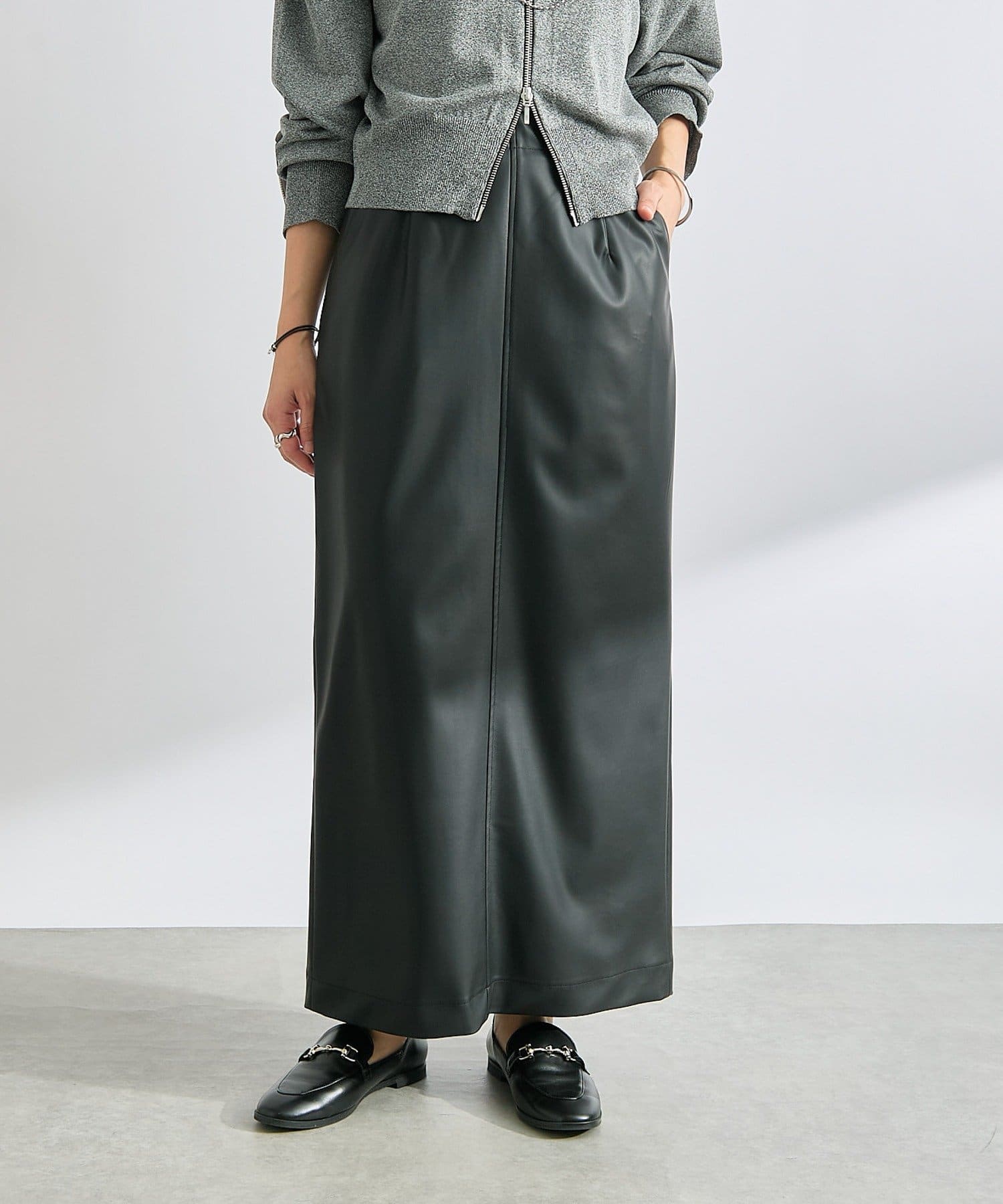 トレンドのレザーライクな素材を使用した、シンプルなタイトスカート。