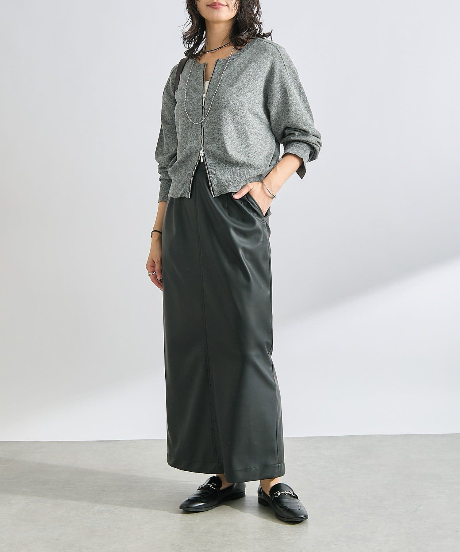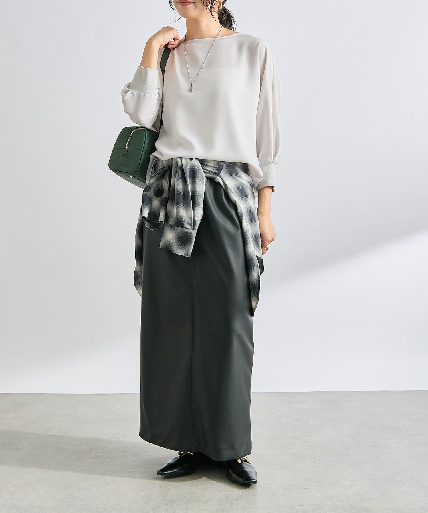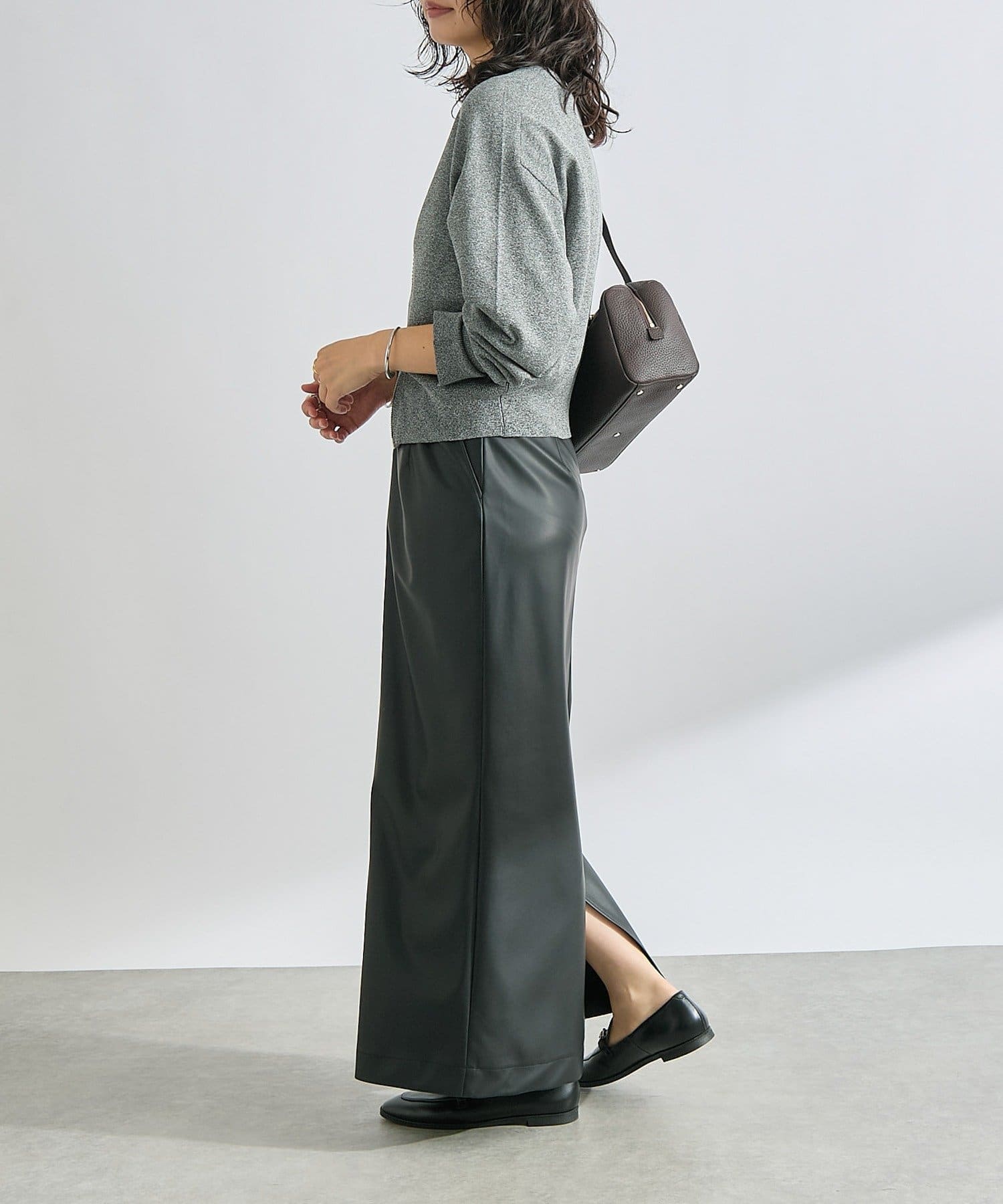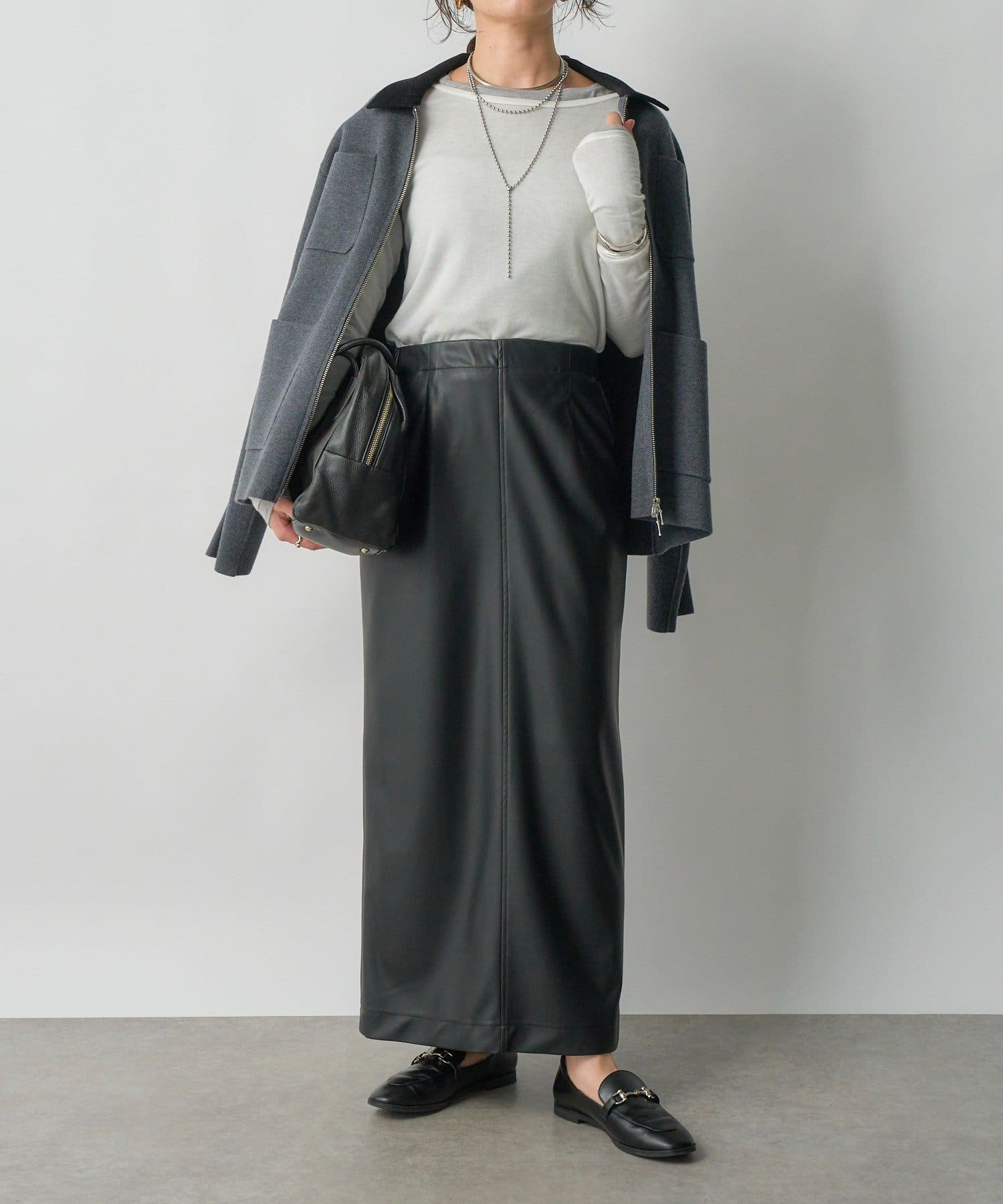 トレンドのレザーライクな素材を使用した、シンプルなタイトスカート。
