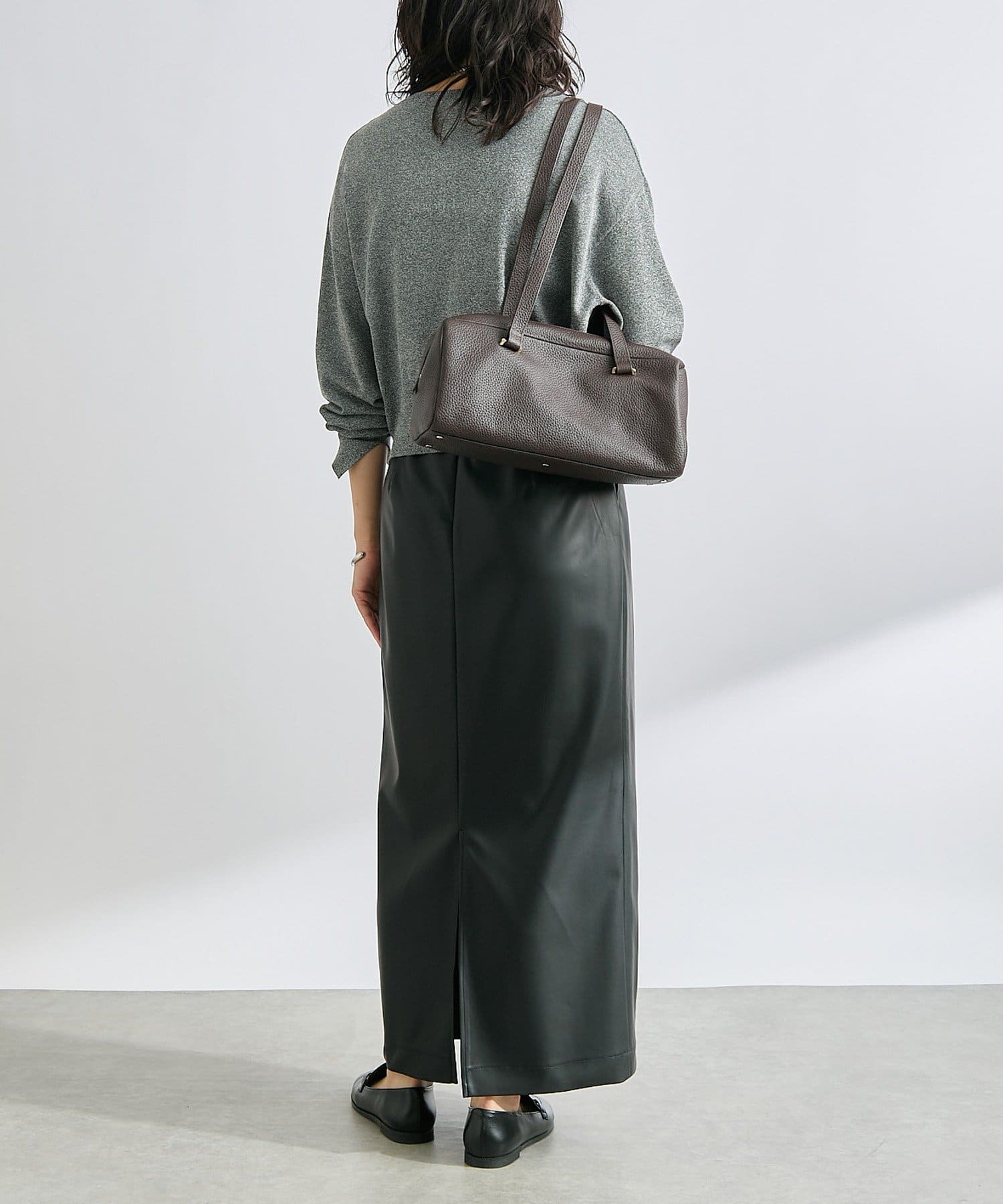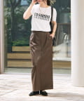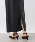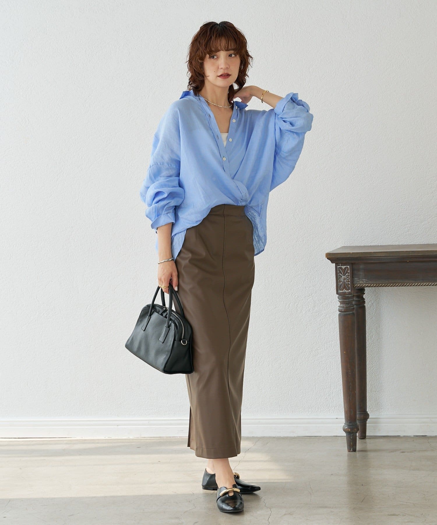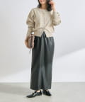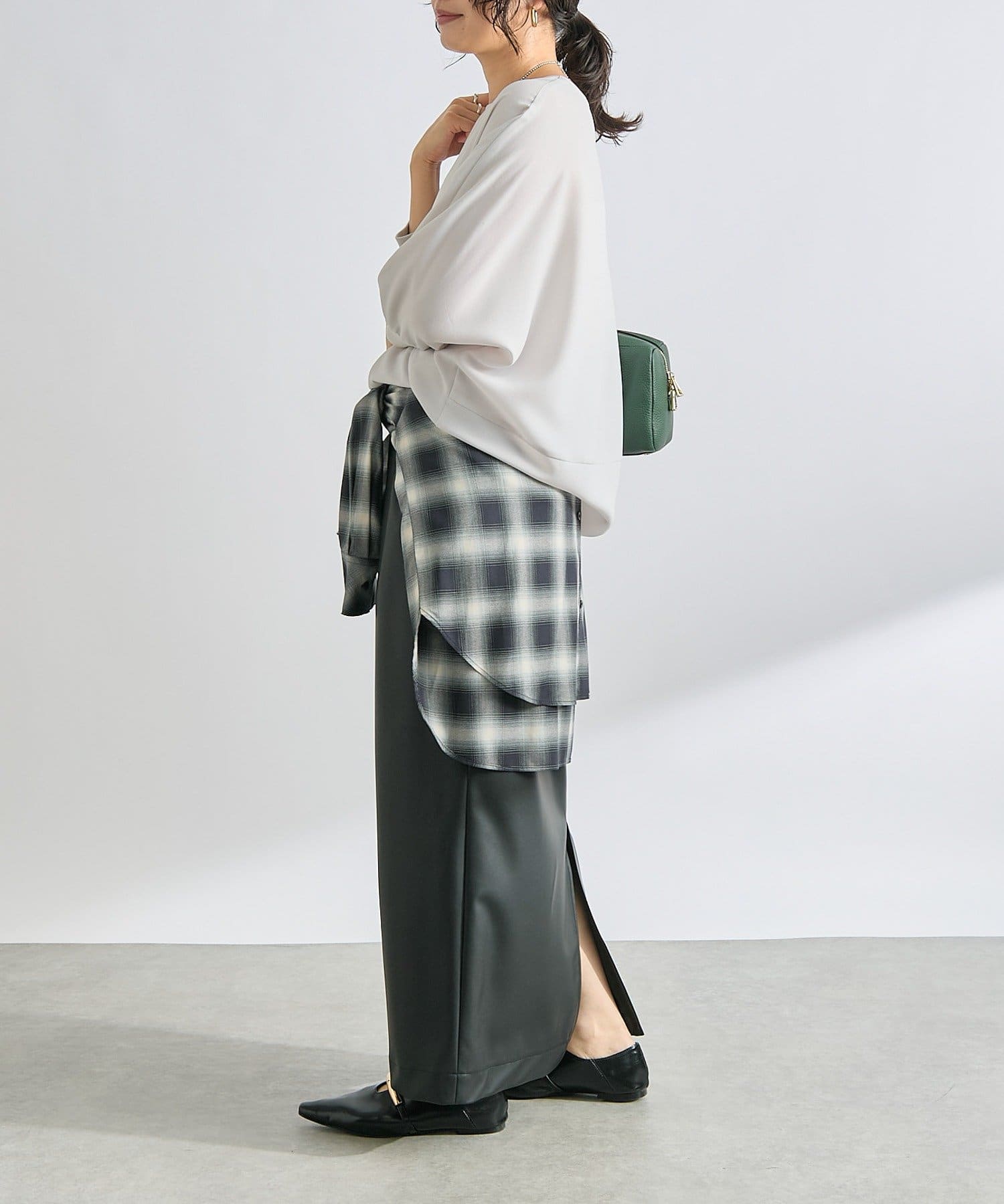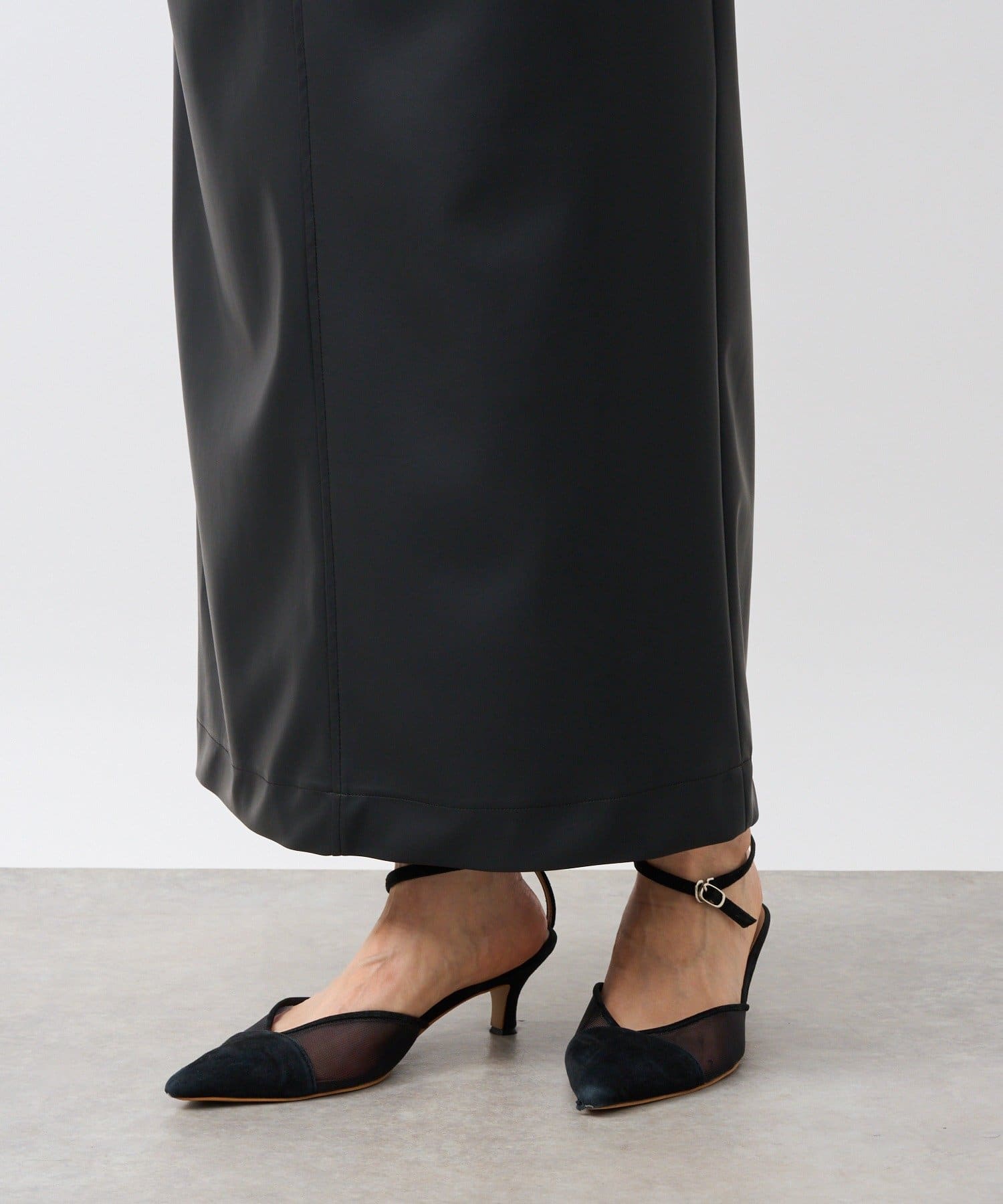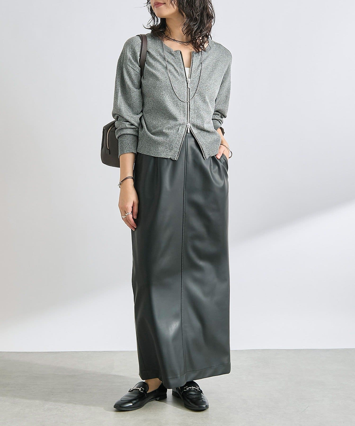 トレンドのレザーライクな素材を使用した、シンプルなタイトスカート。