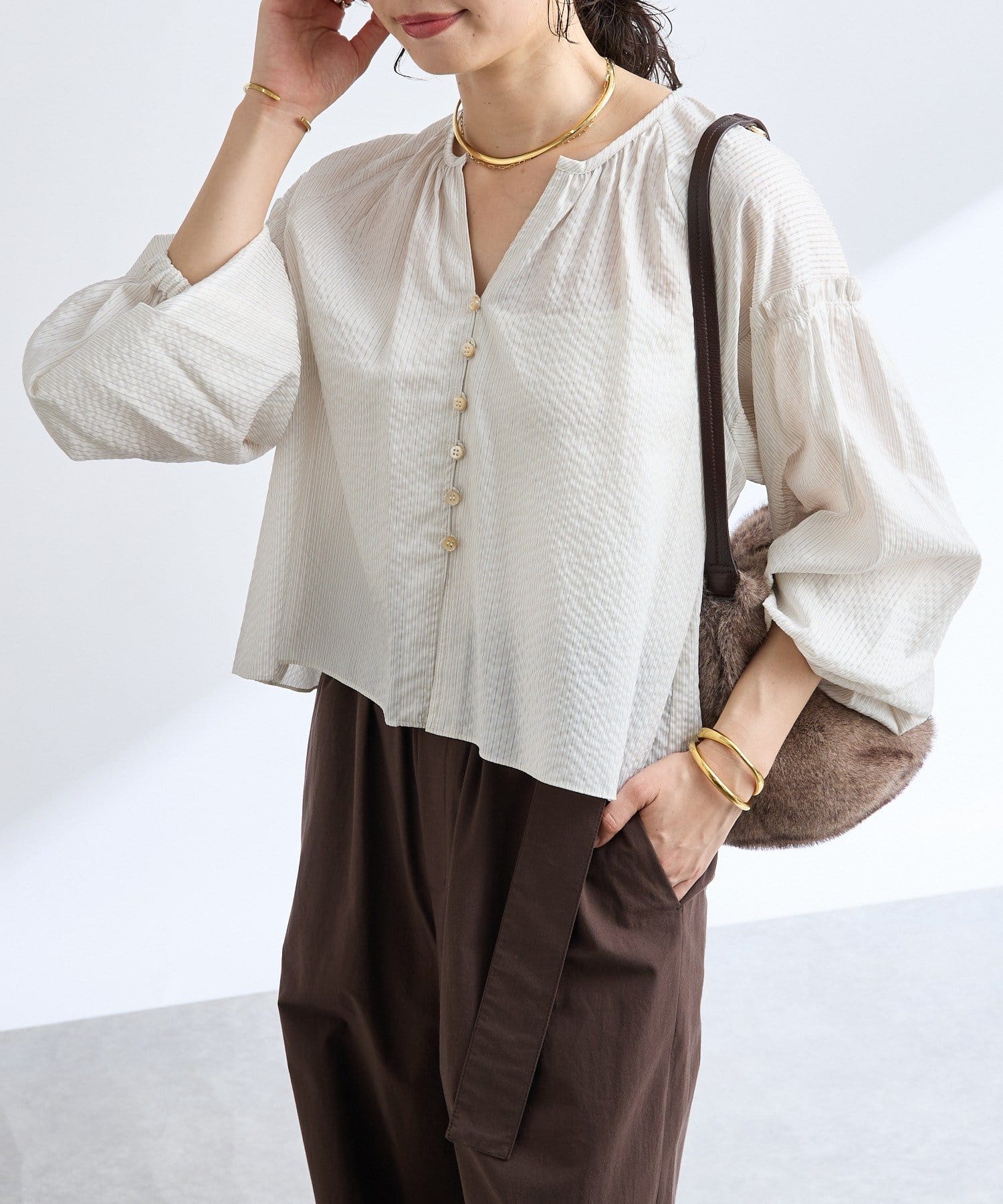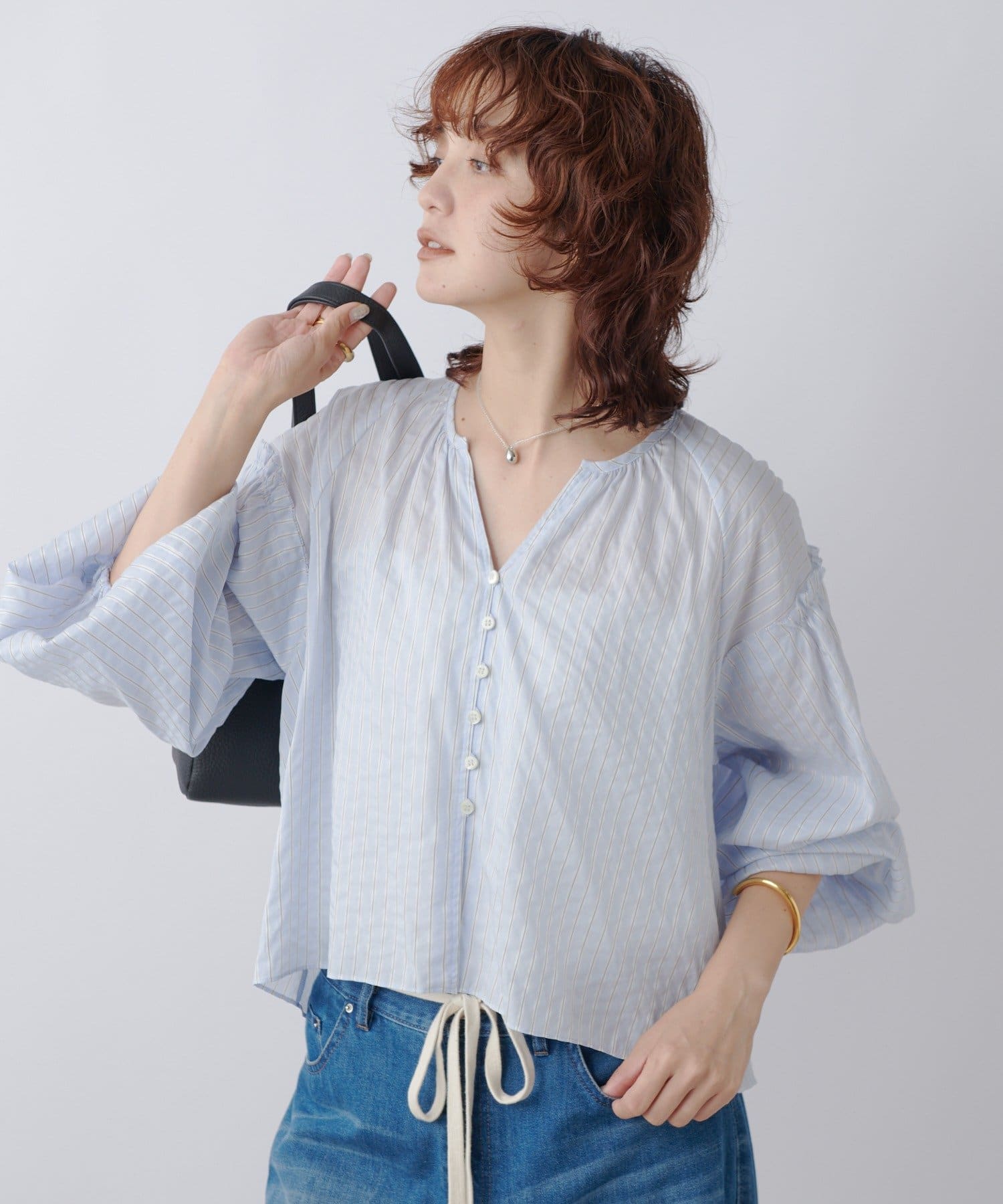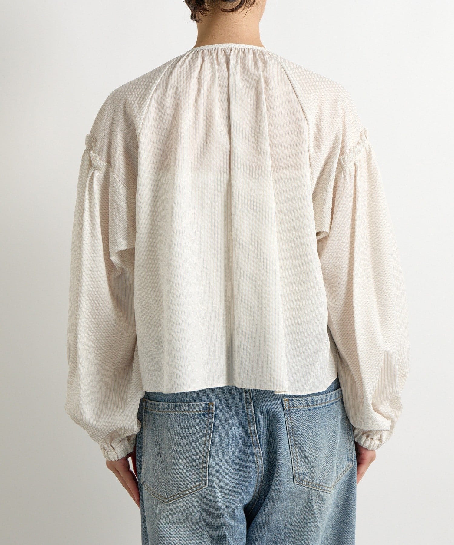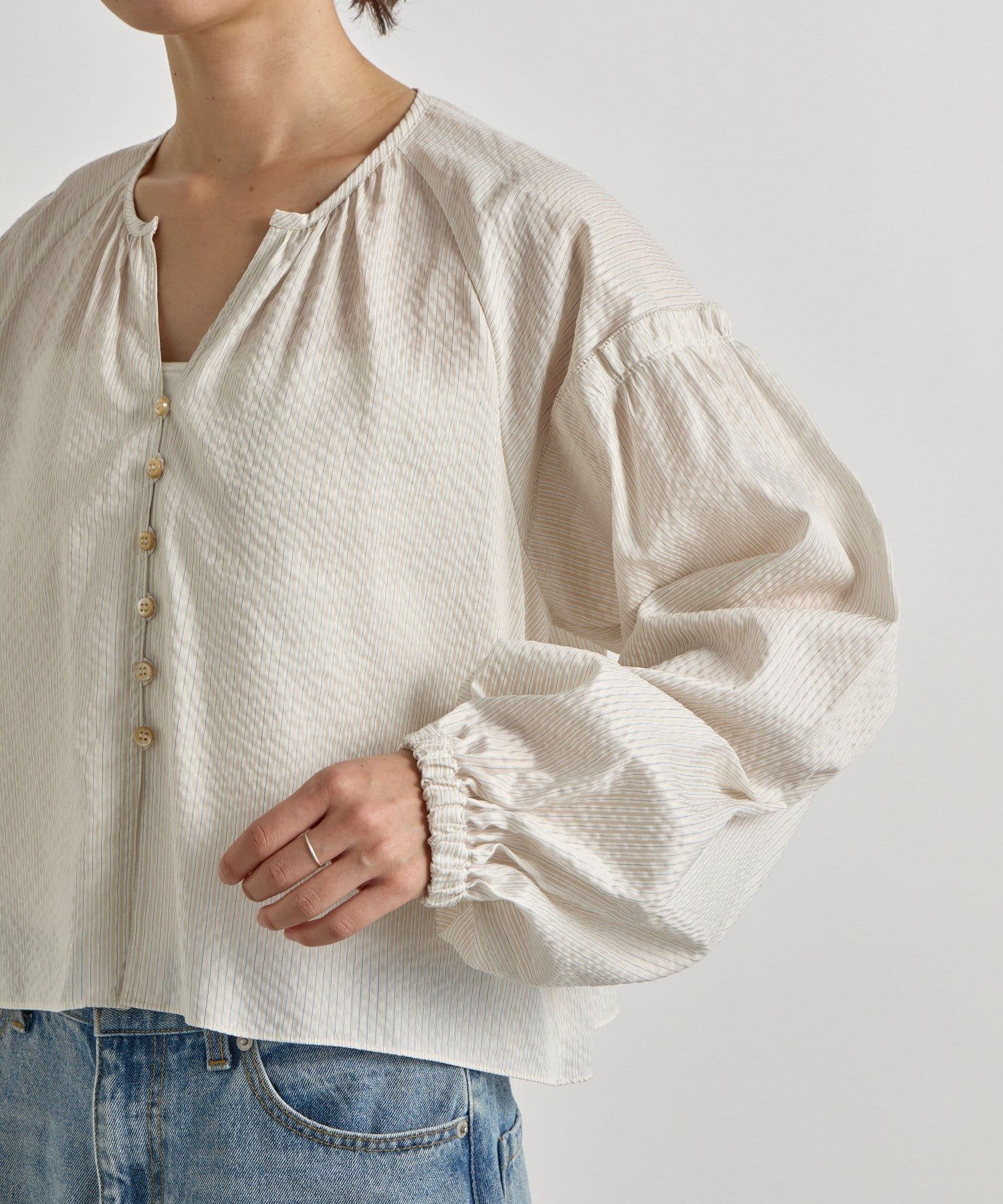 キュプラコットンの透明感のあるストライプ地をペザント風のデザインに仕上げた短丈ブラウス。
