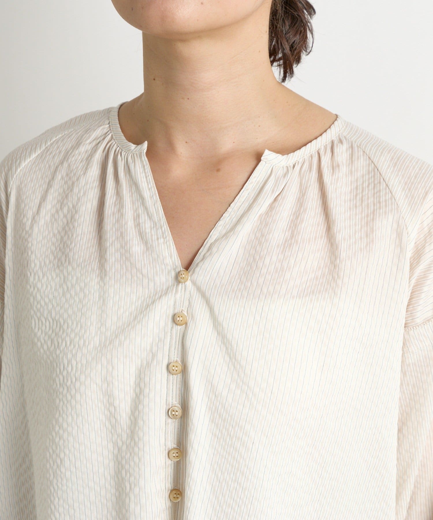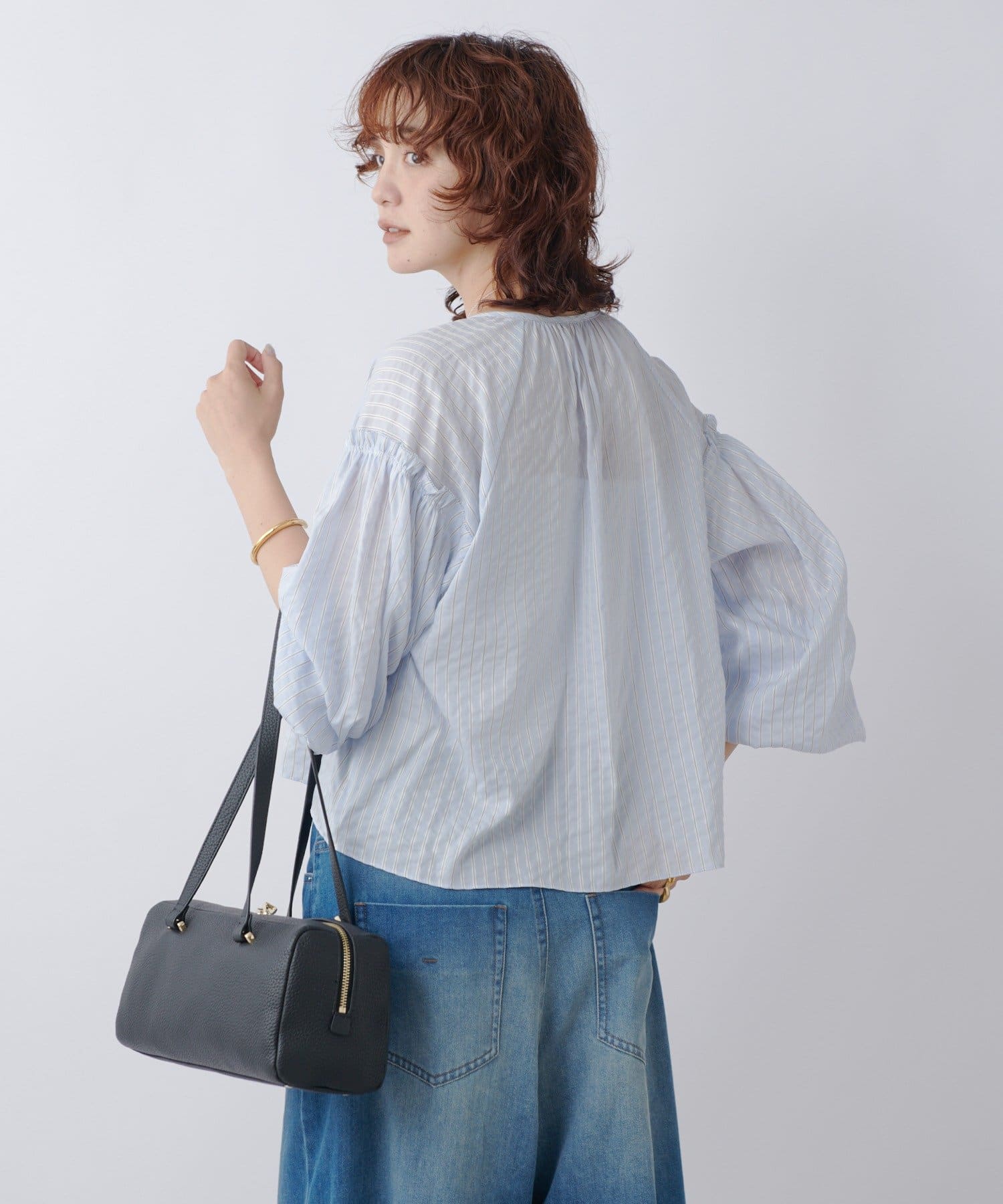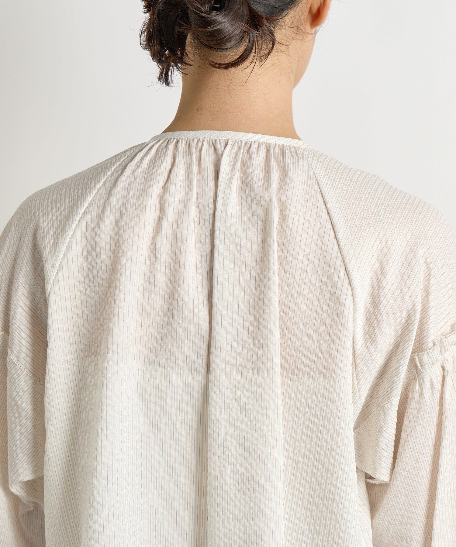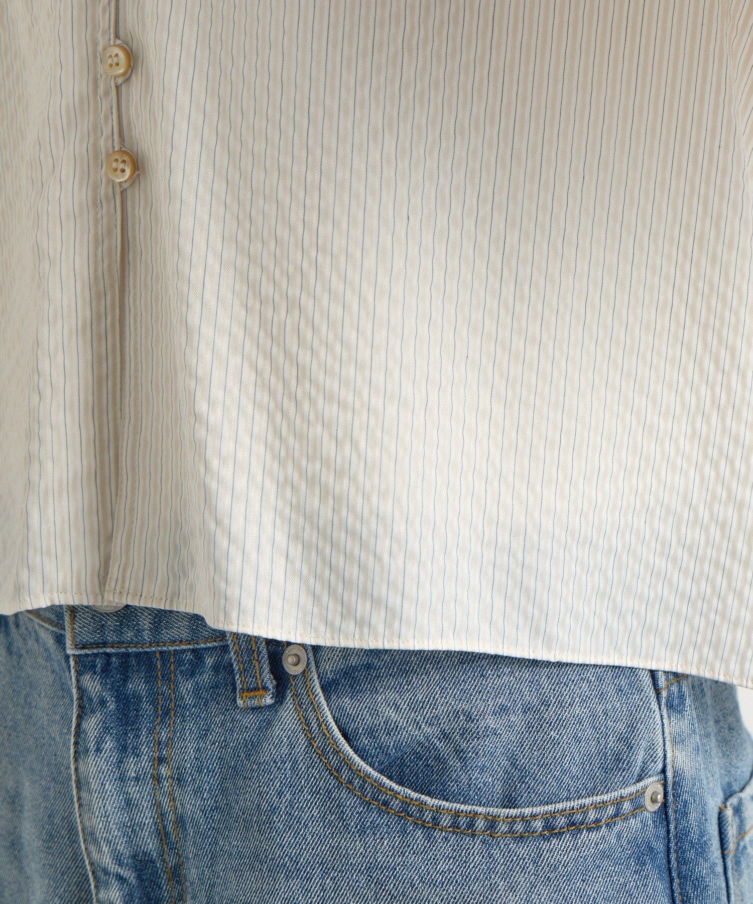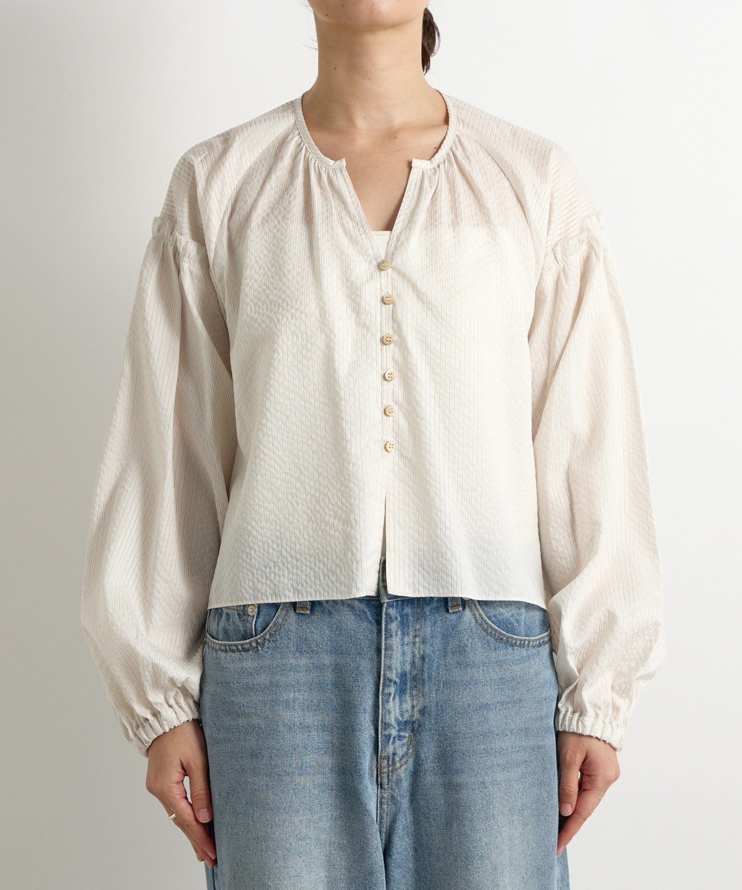 キュプラコットンの透明感のあるストライプ地をペザント風のデザインに仕上げた短丈ブラウス。