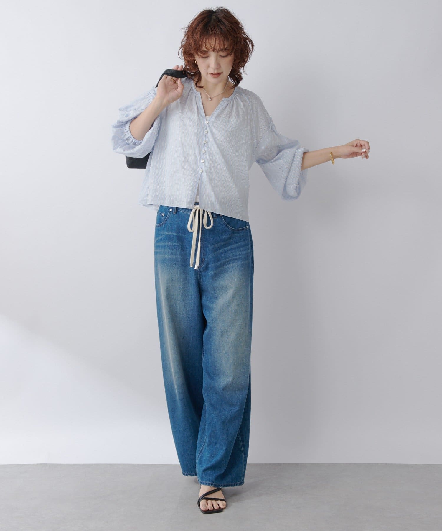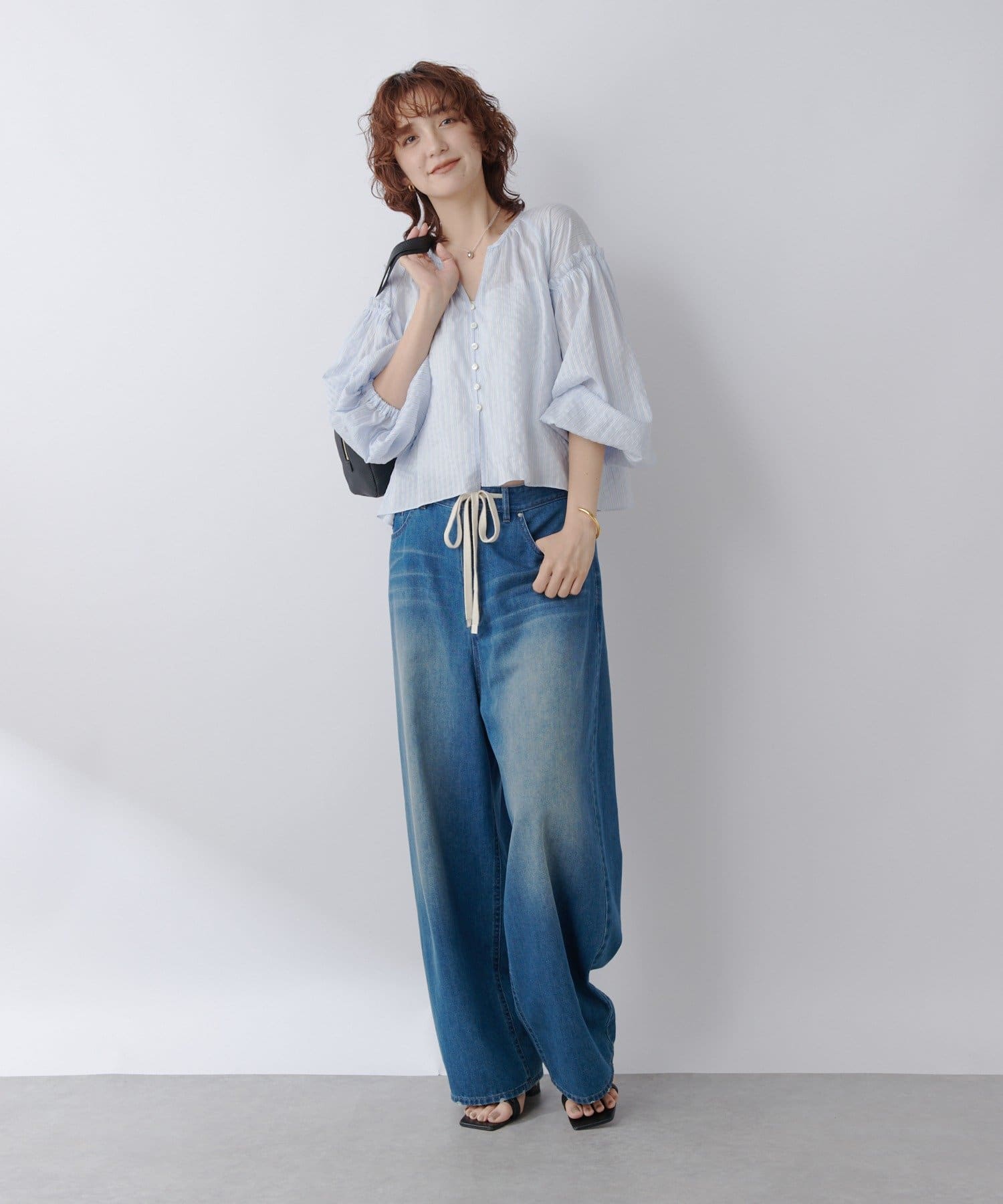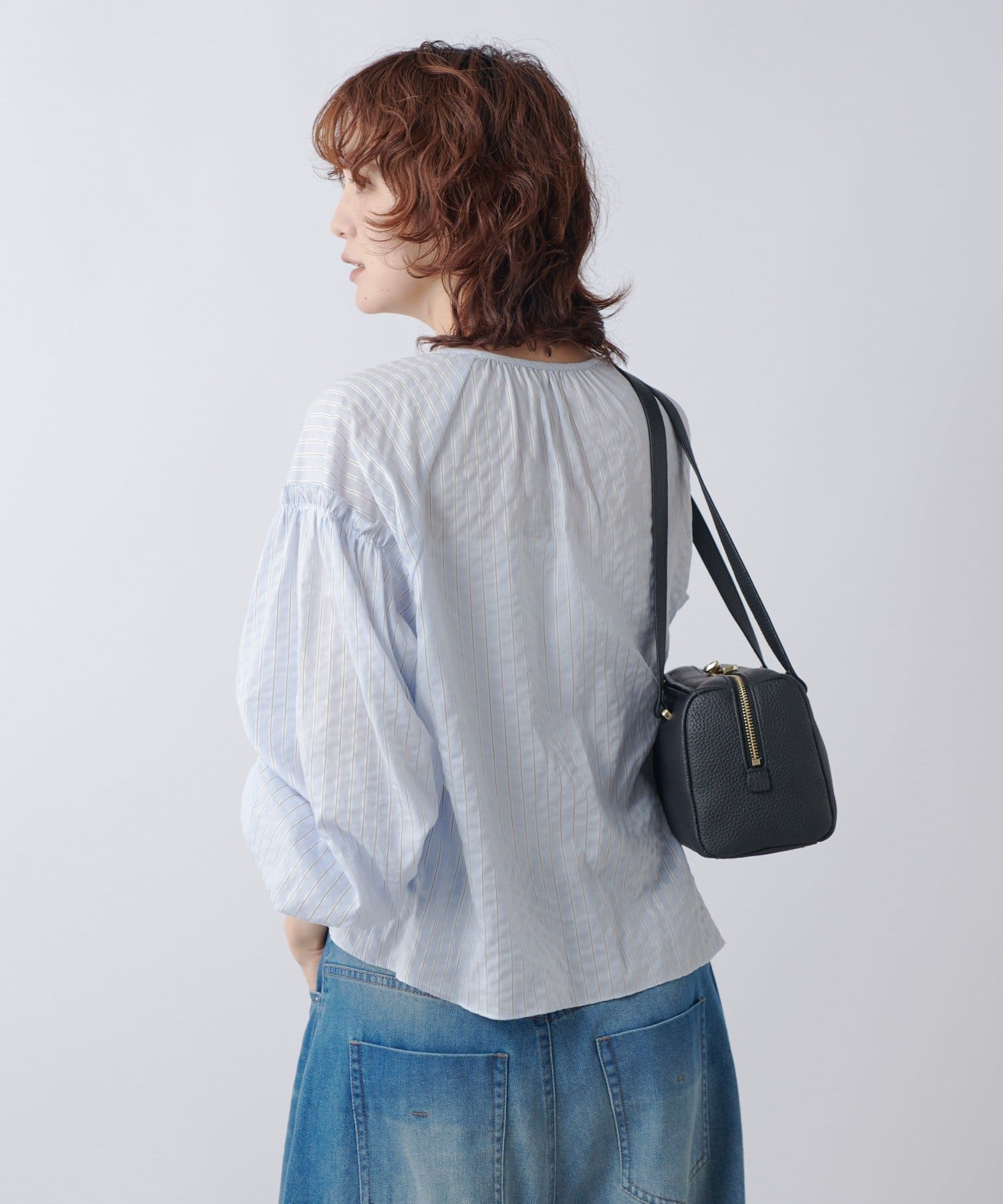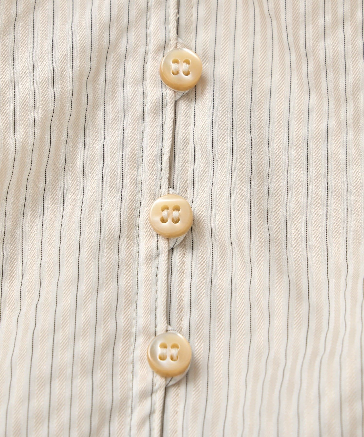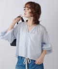 キュプラコットンの透明感のあるストライプ地をペザント風のデザインに仕上げた短丈ブラウス。