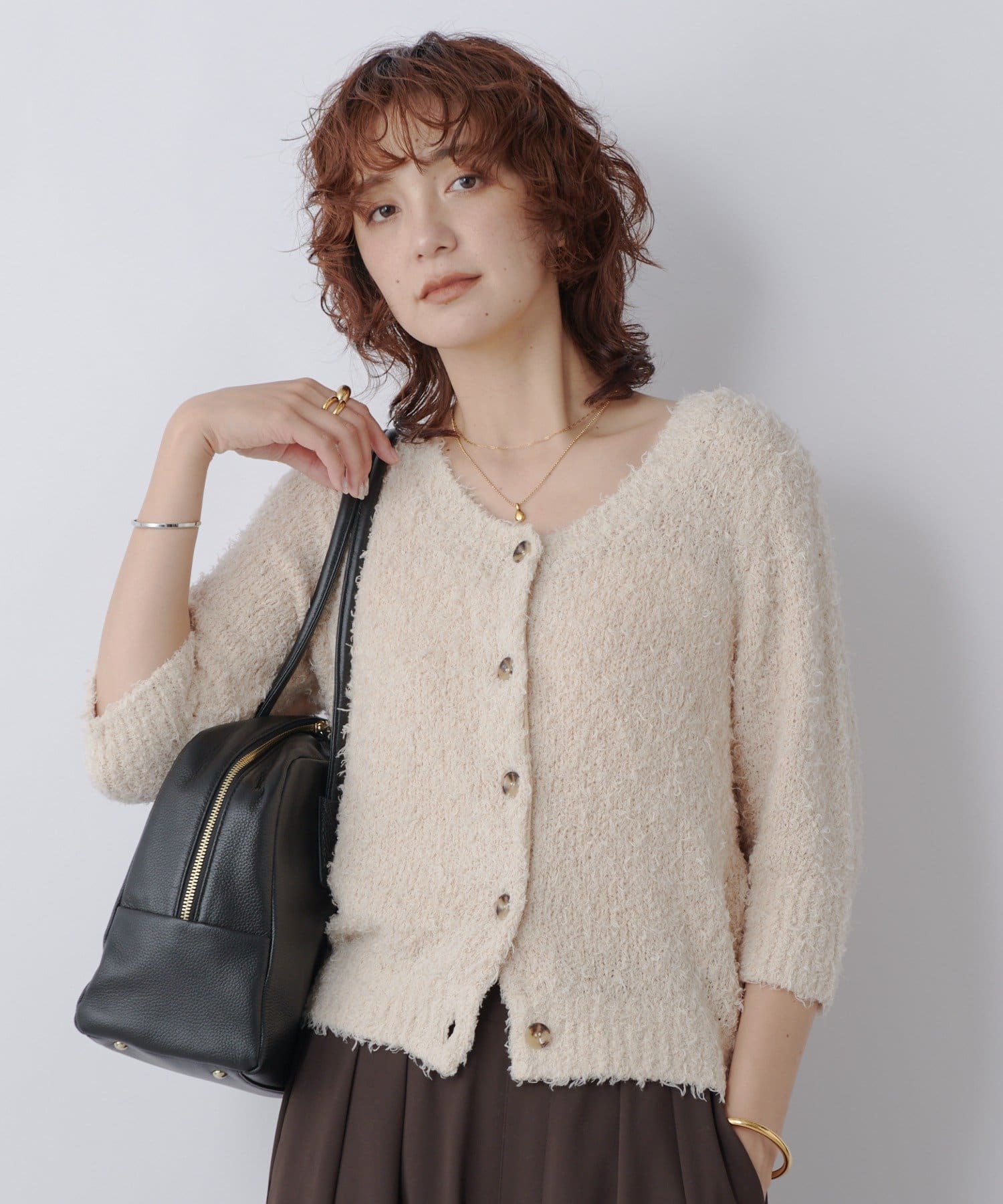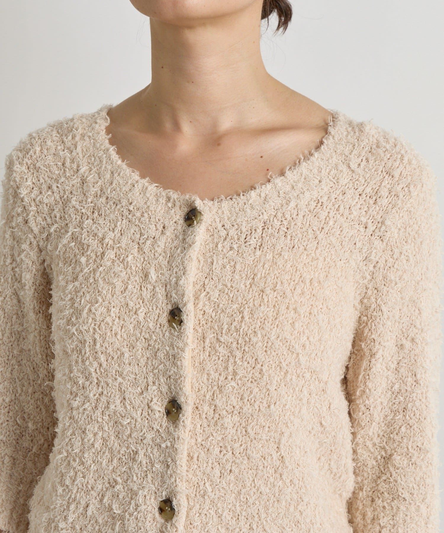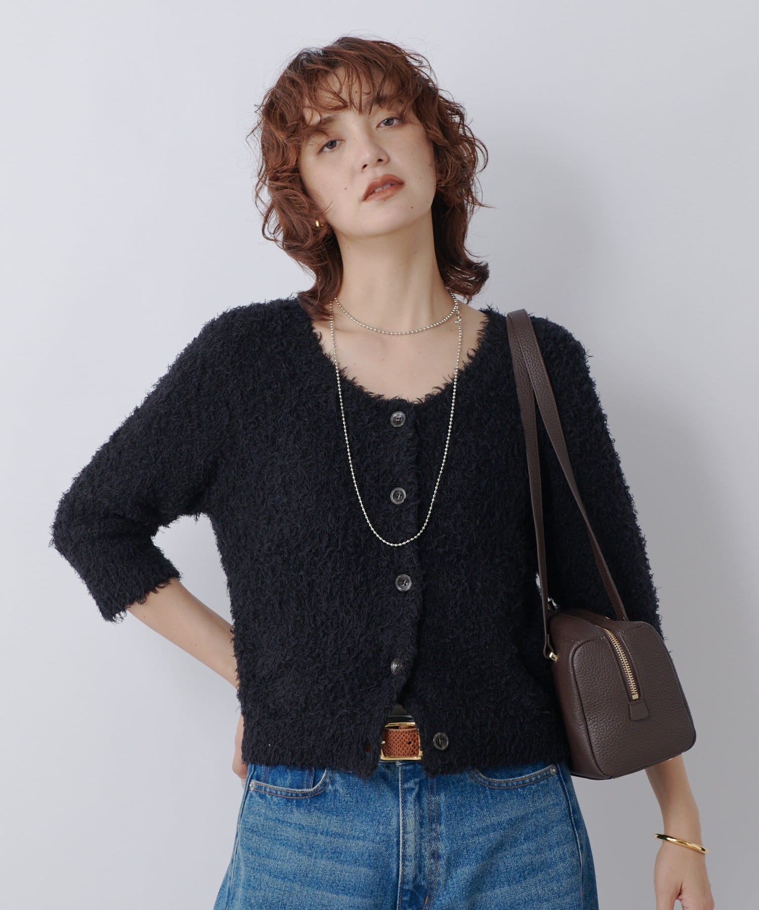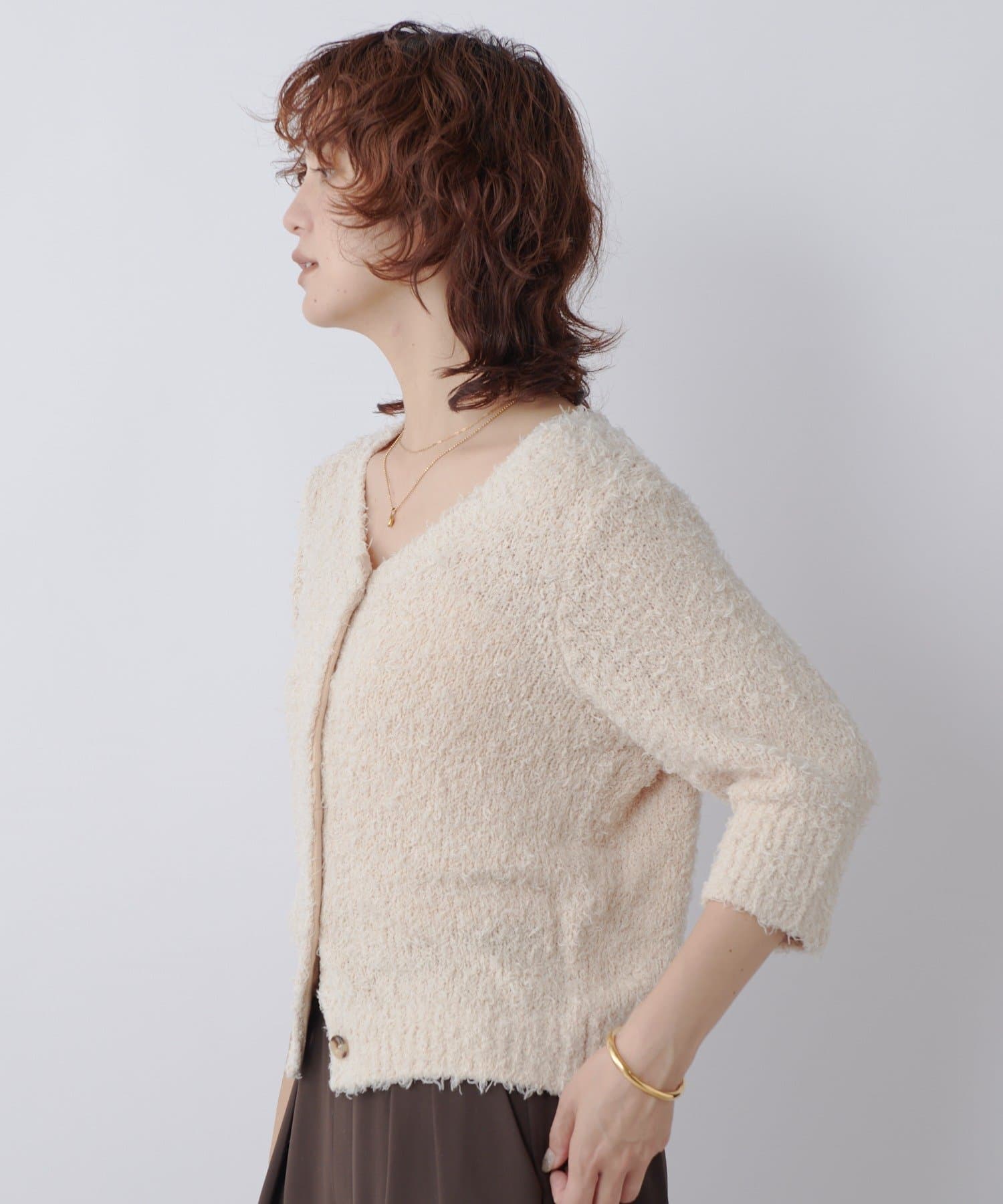 季節の変わり目におすすめのコットン素材のシャギーニットカーディガン。