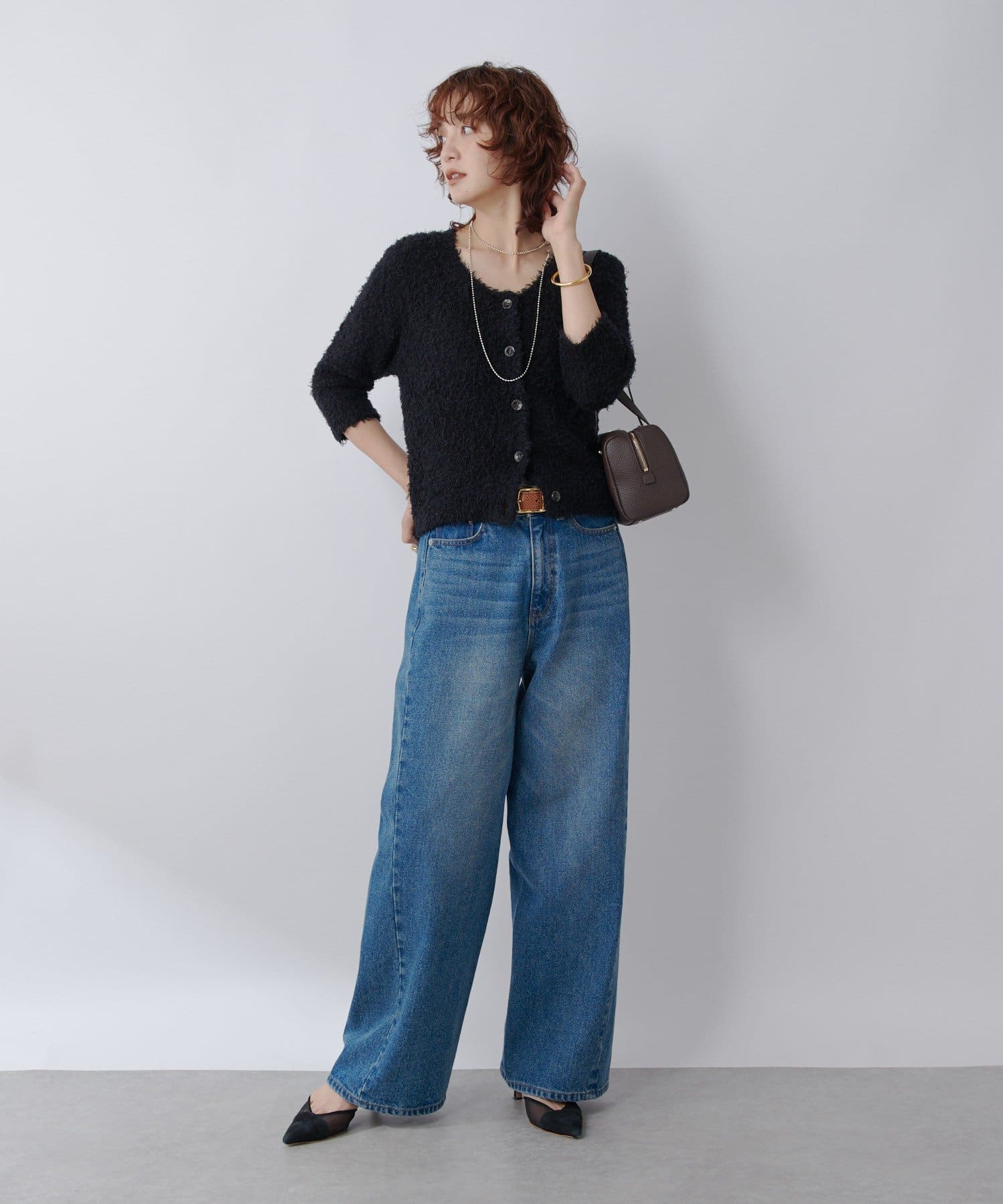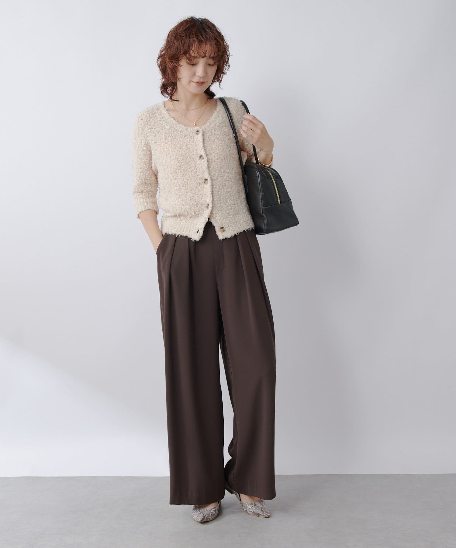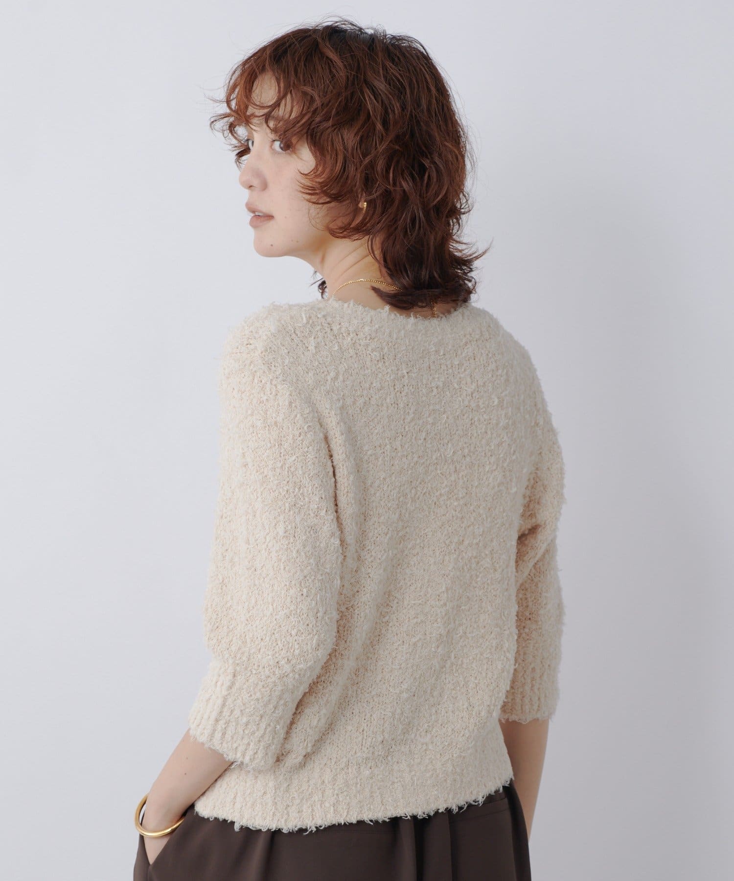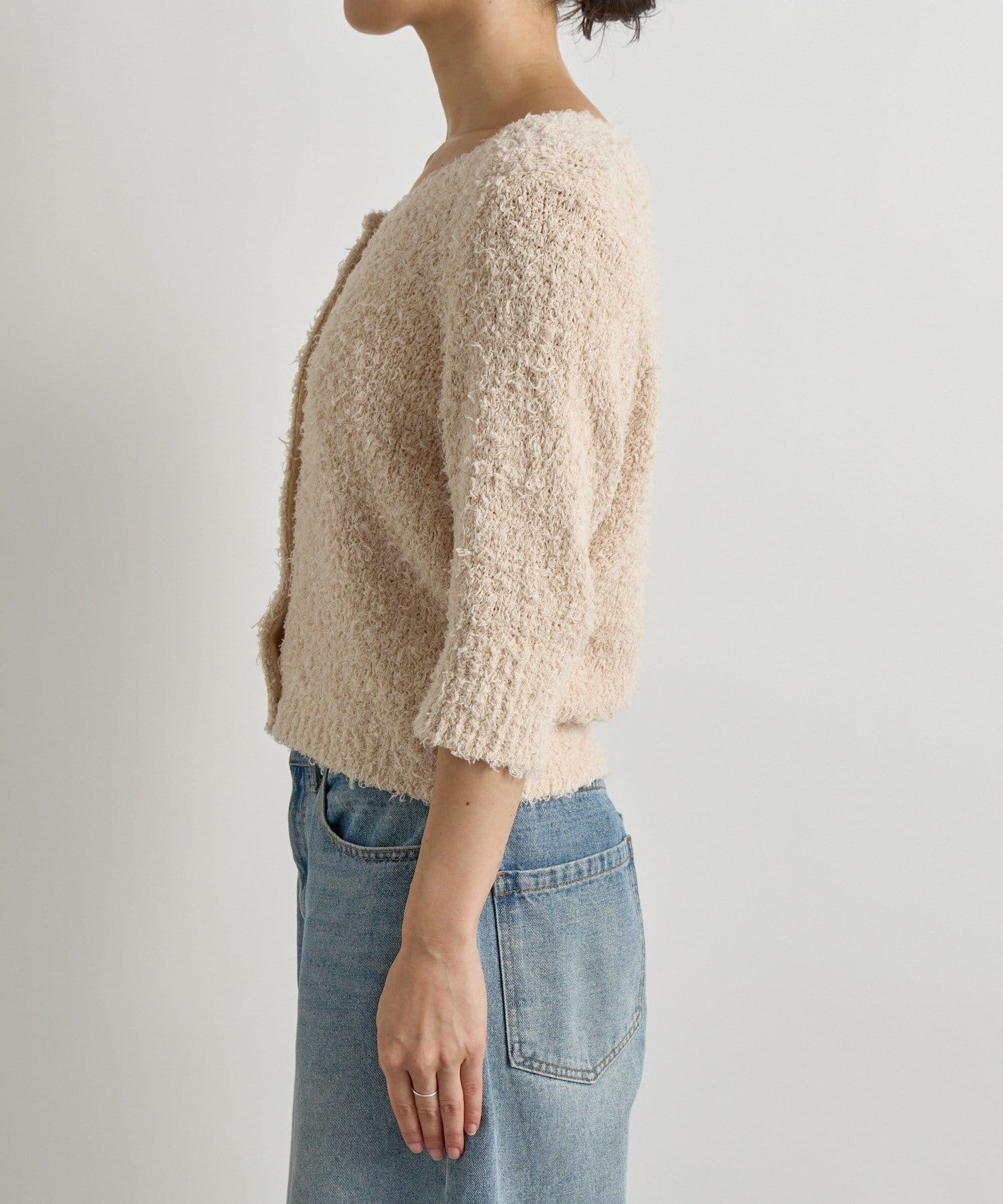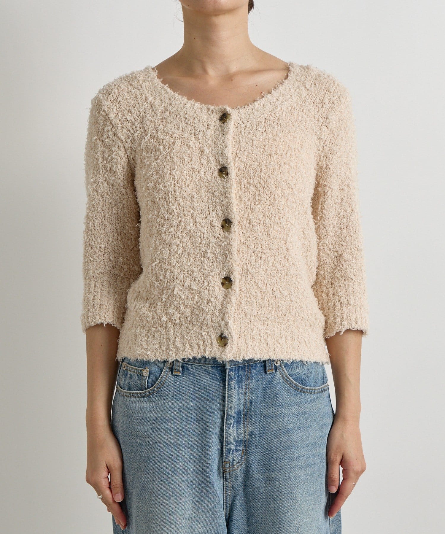 季節の変わり目におすすめのコットン素材のシャギーニットカーディガン。