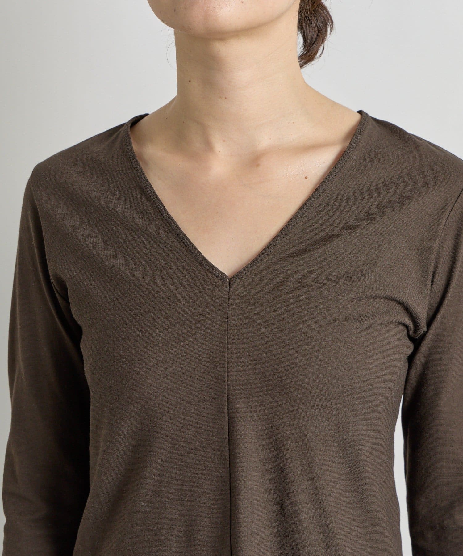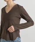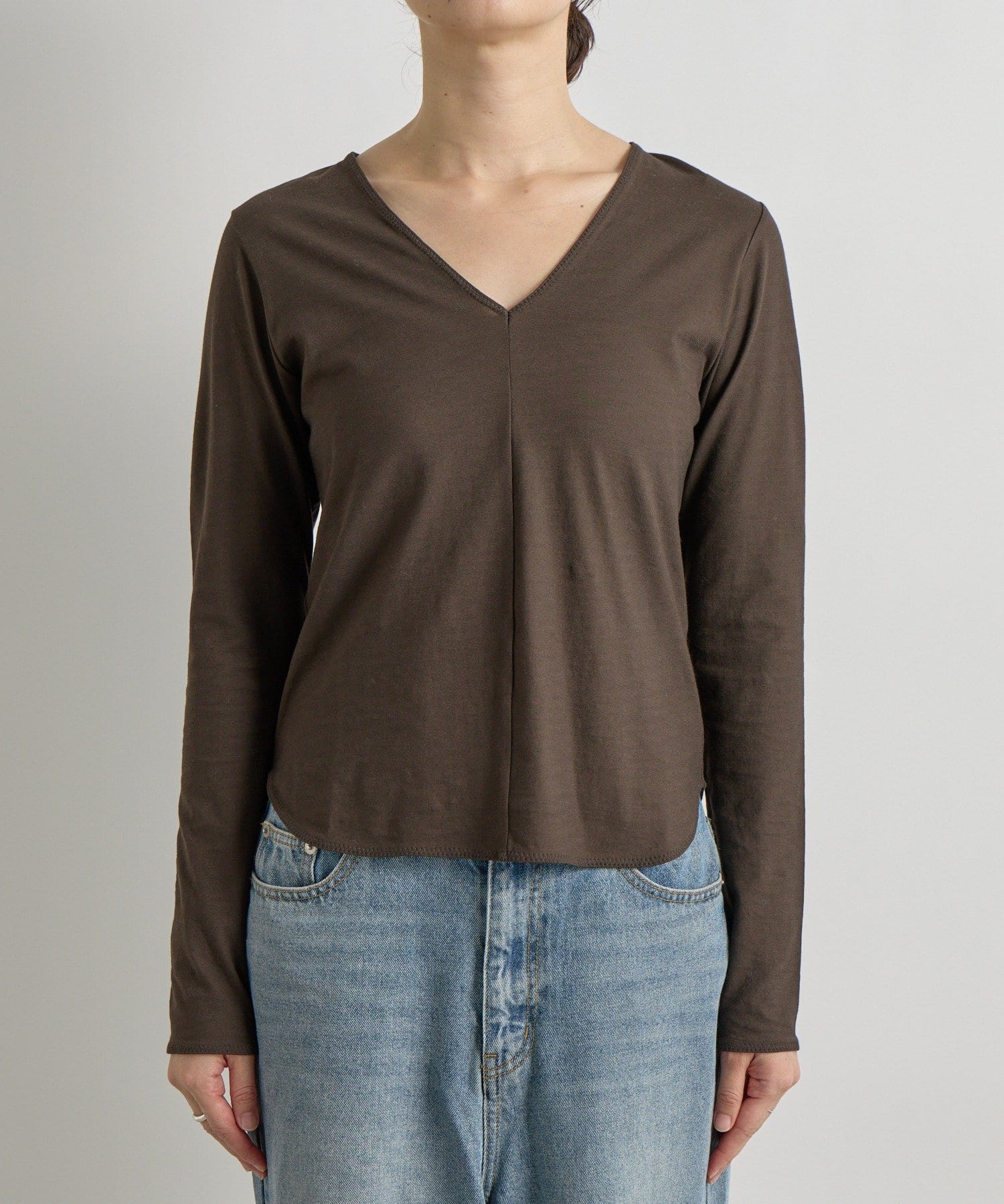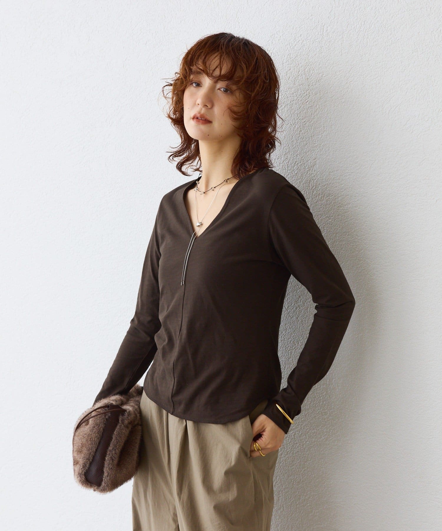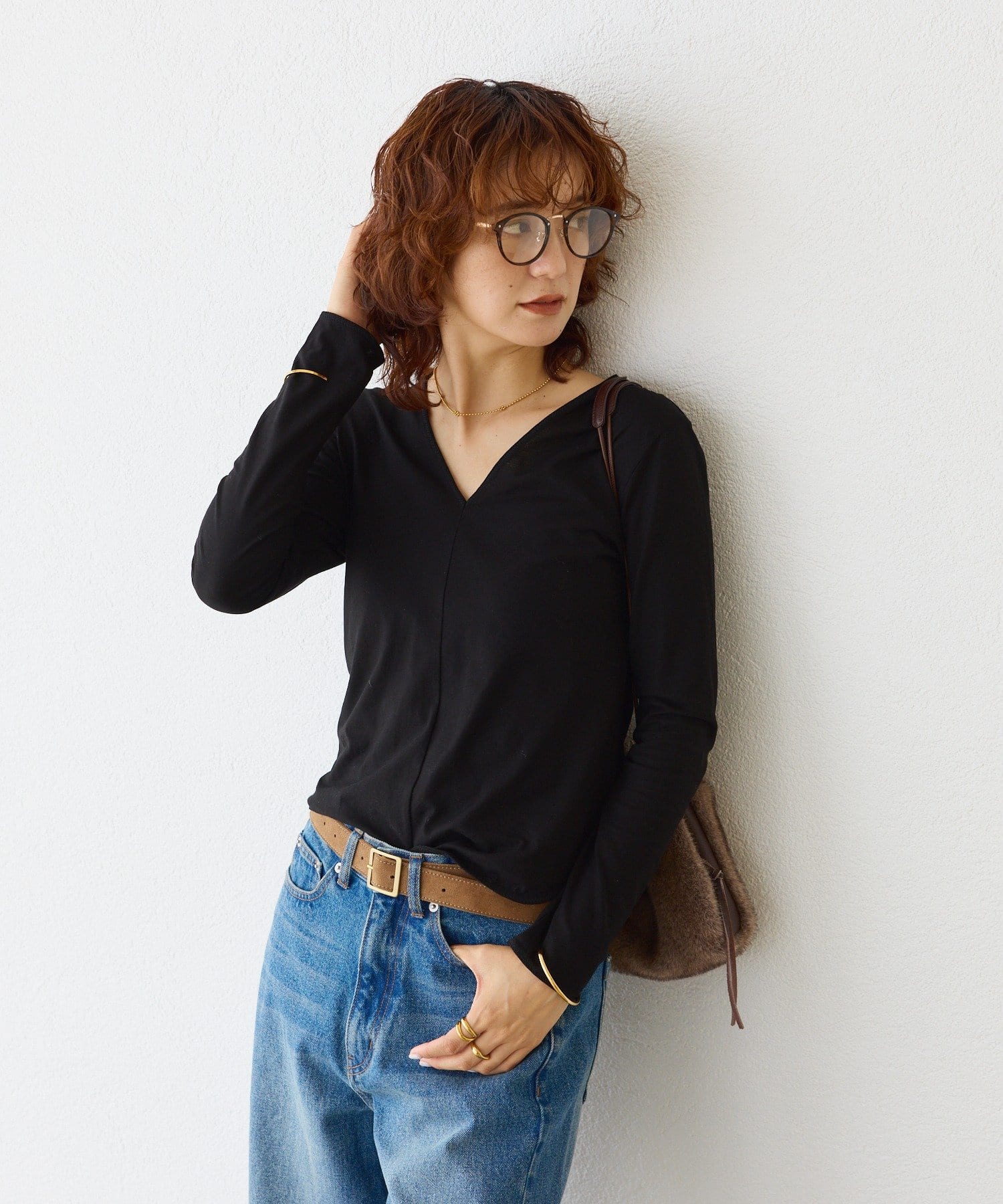深めに開けたVネックが女性らしくすっきりとした印象に見せてくれます。