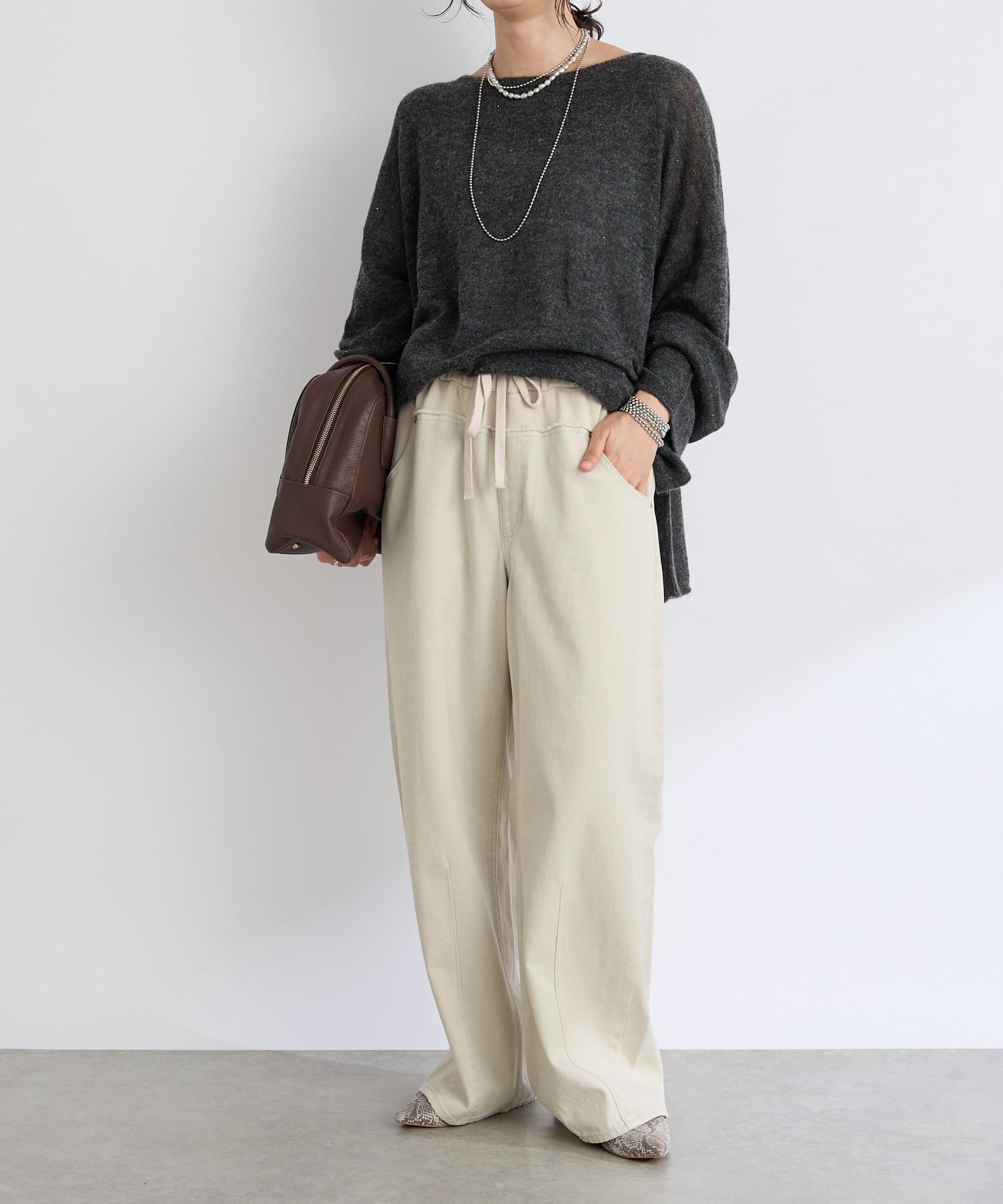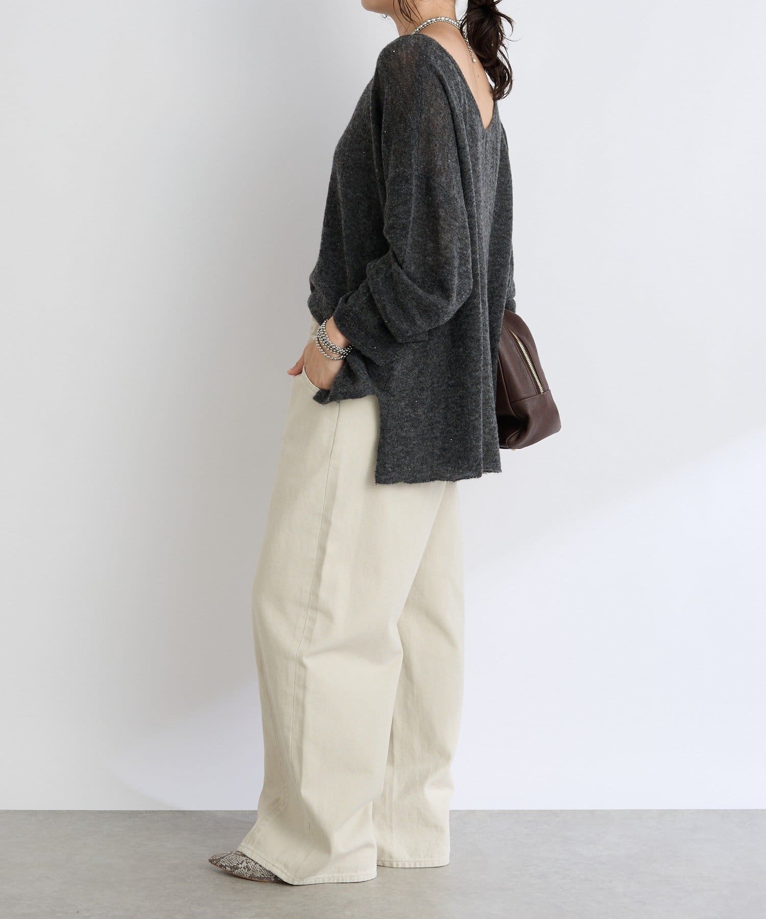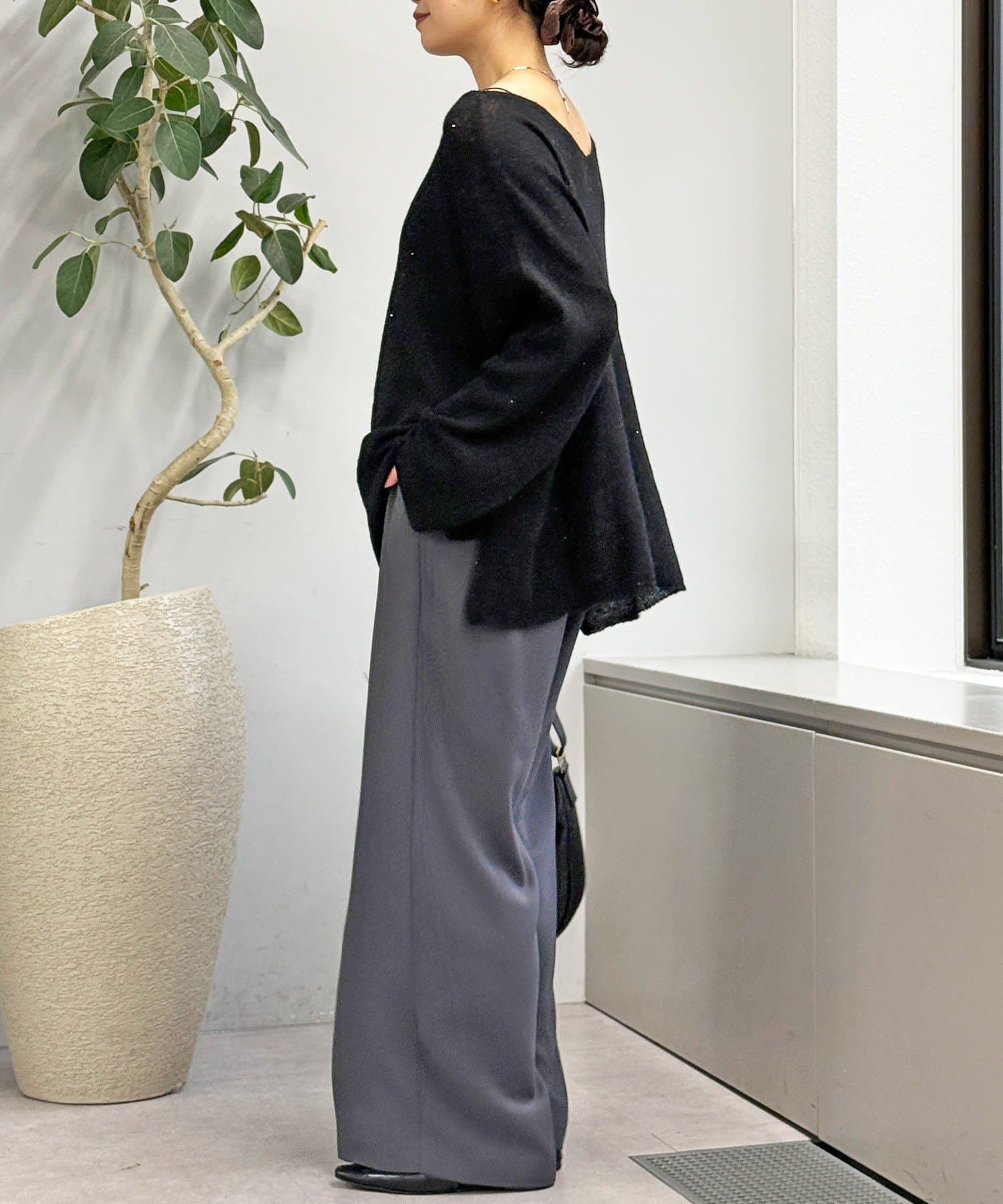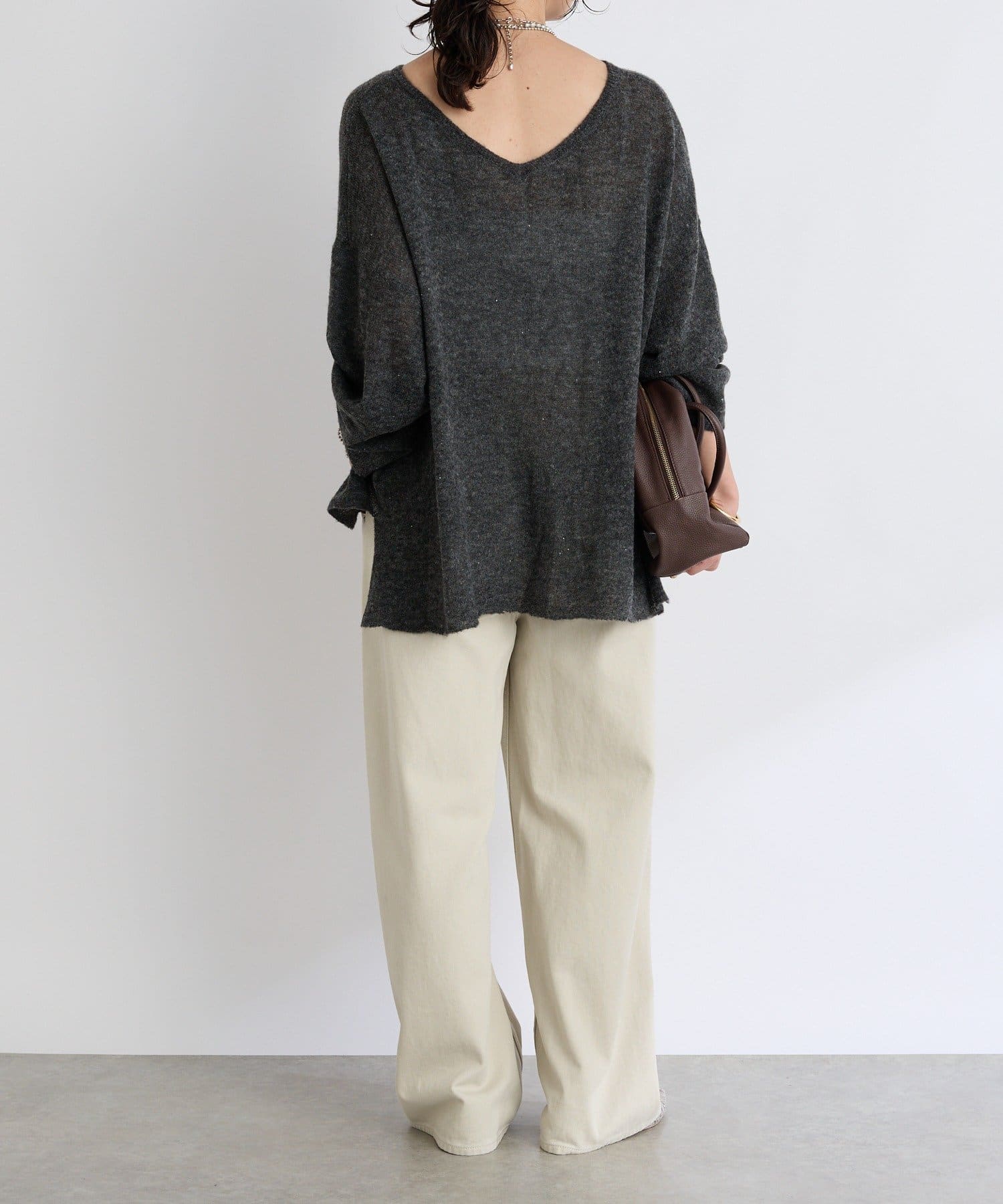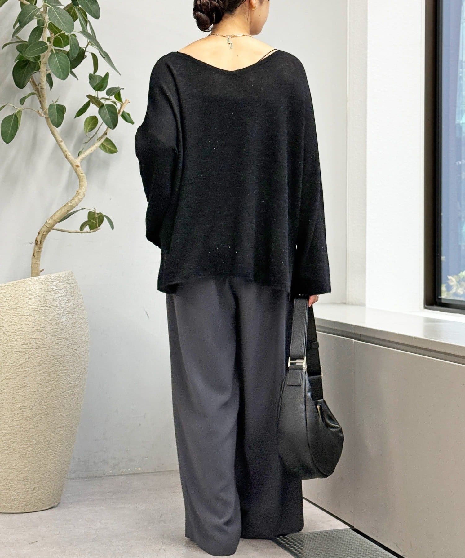 ・ヌケのある衿元やワイドなシルエットな ど、女性らしい見え感にこだわったニュアンシーなニット