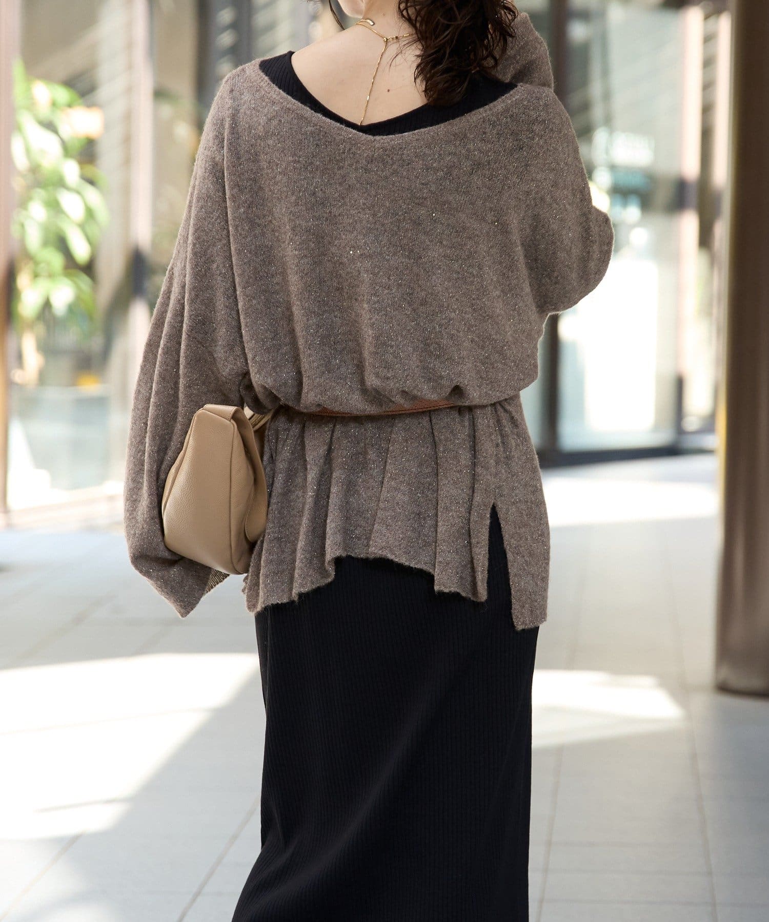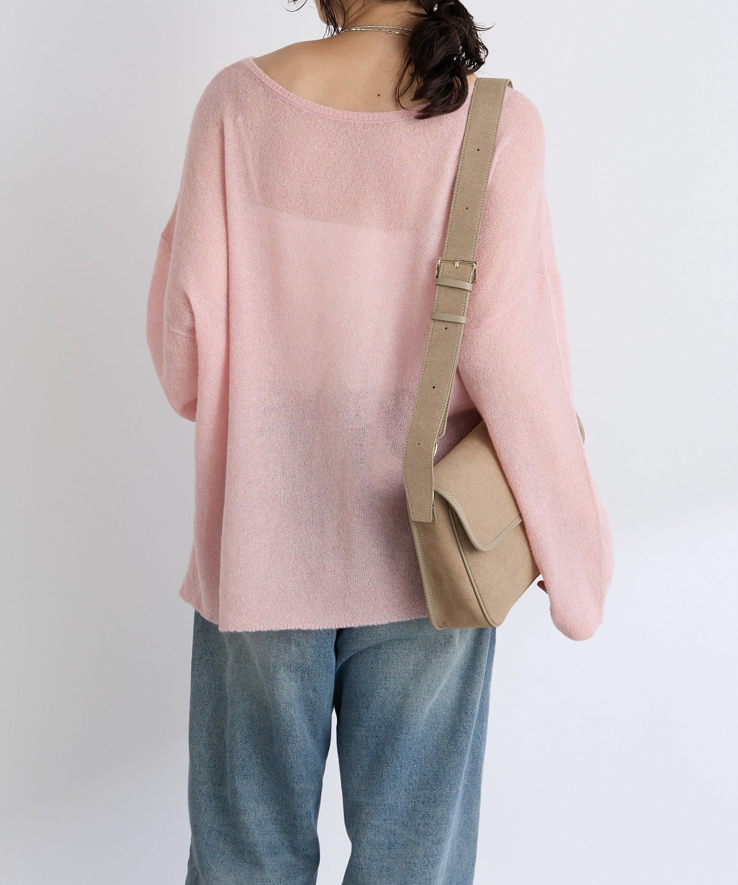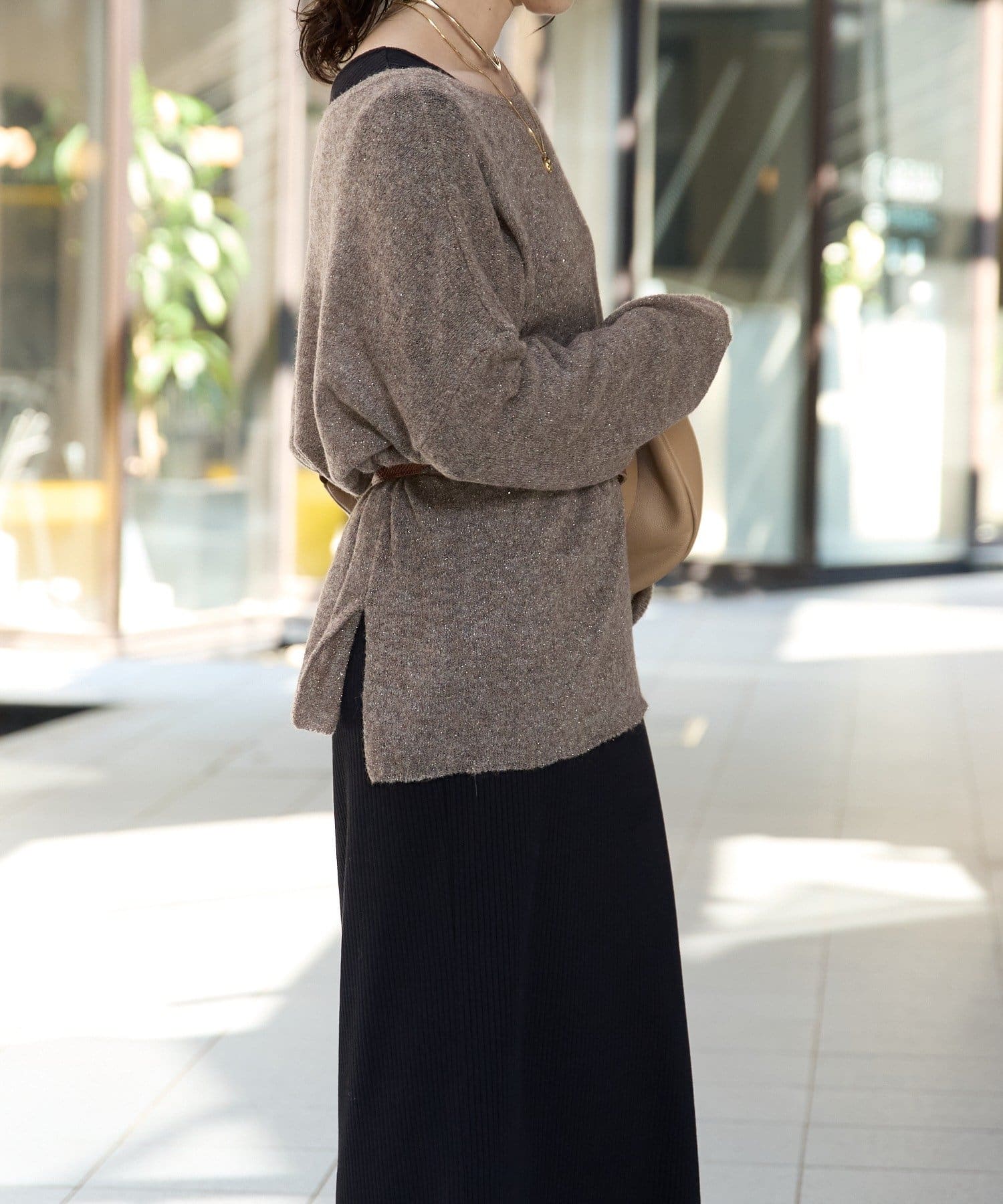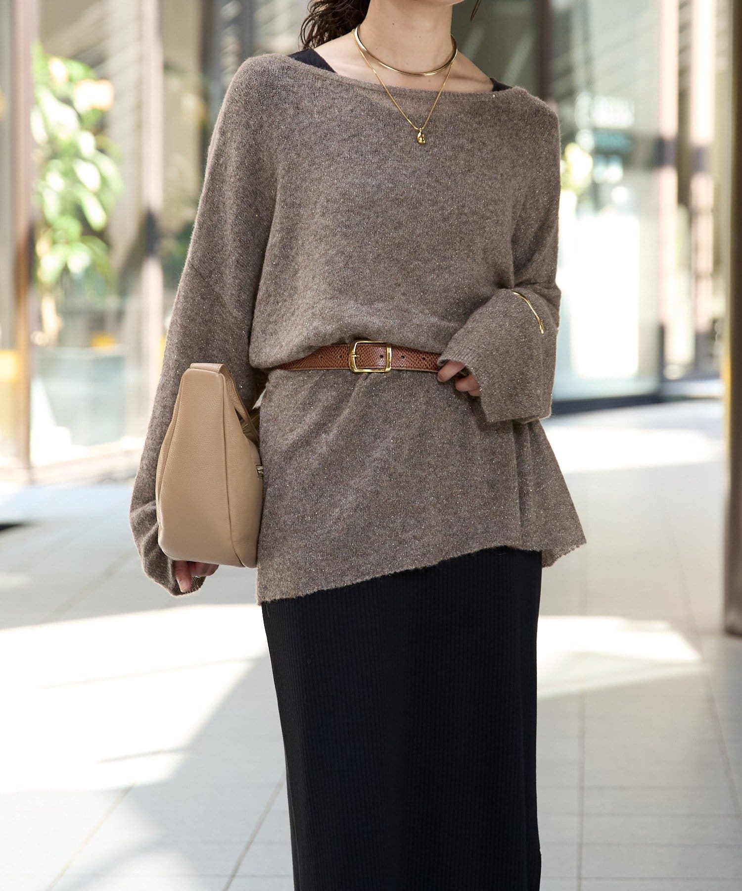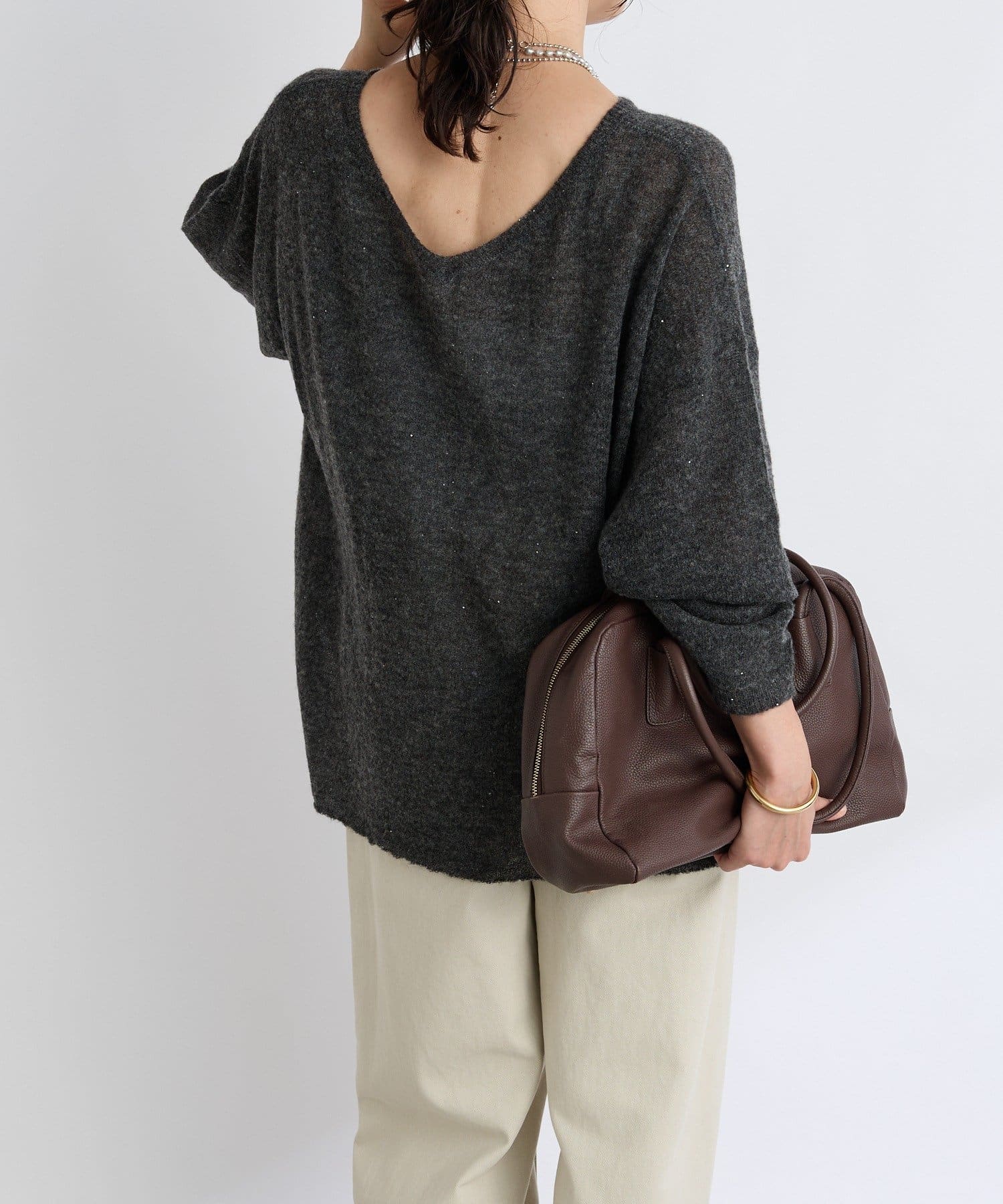 ・ヌケのある衿元やワイドなシルエットな ど、女性らしい見え感にこだわったニュアンシーなニット
