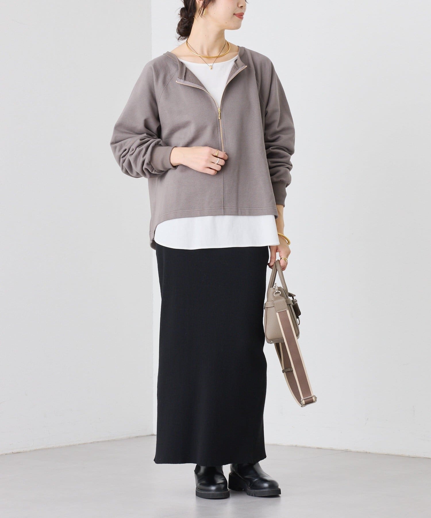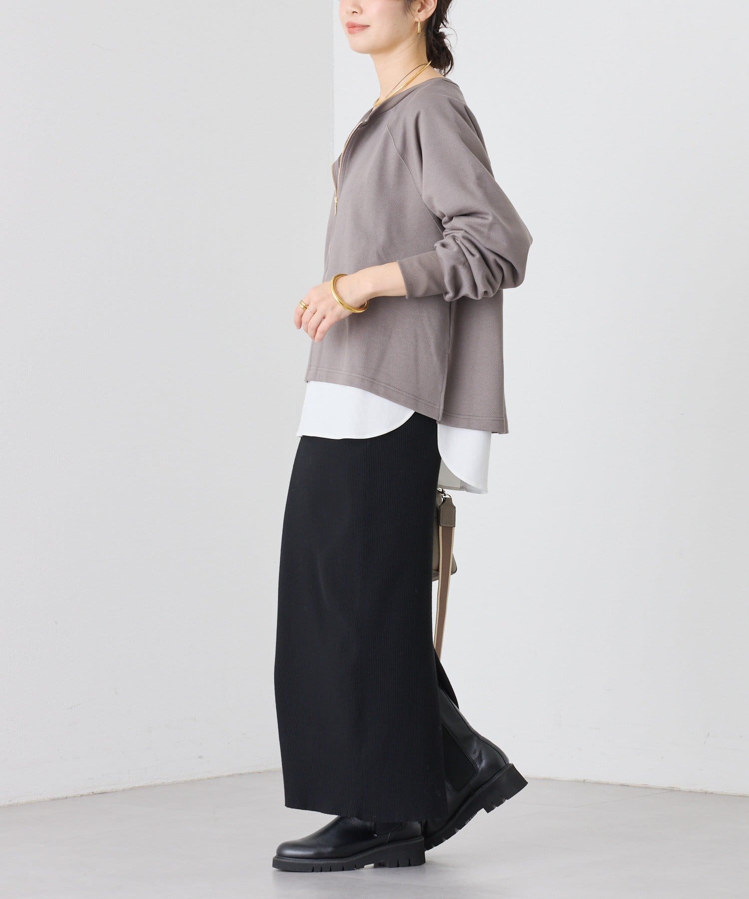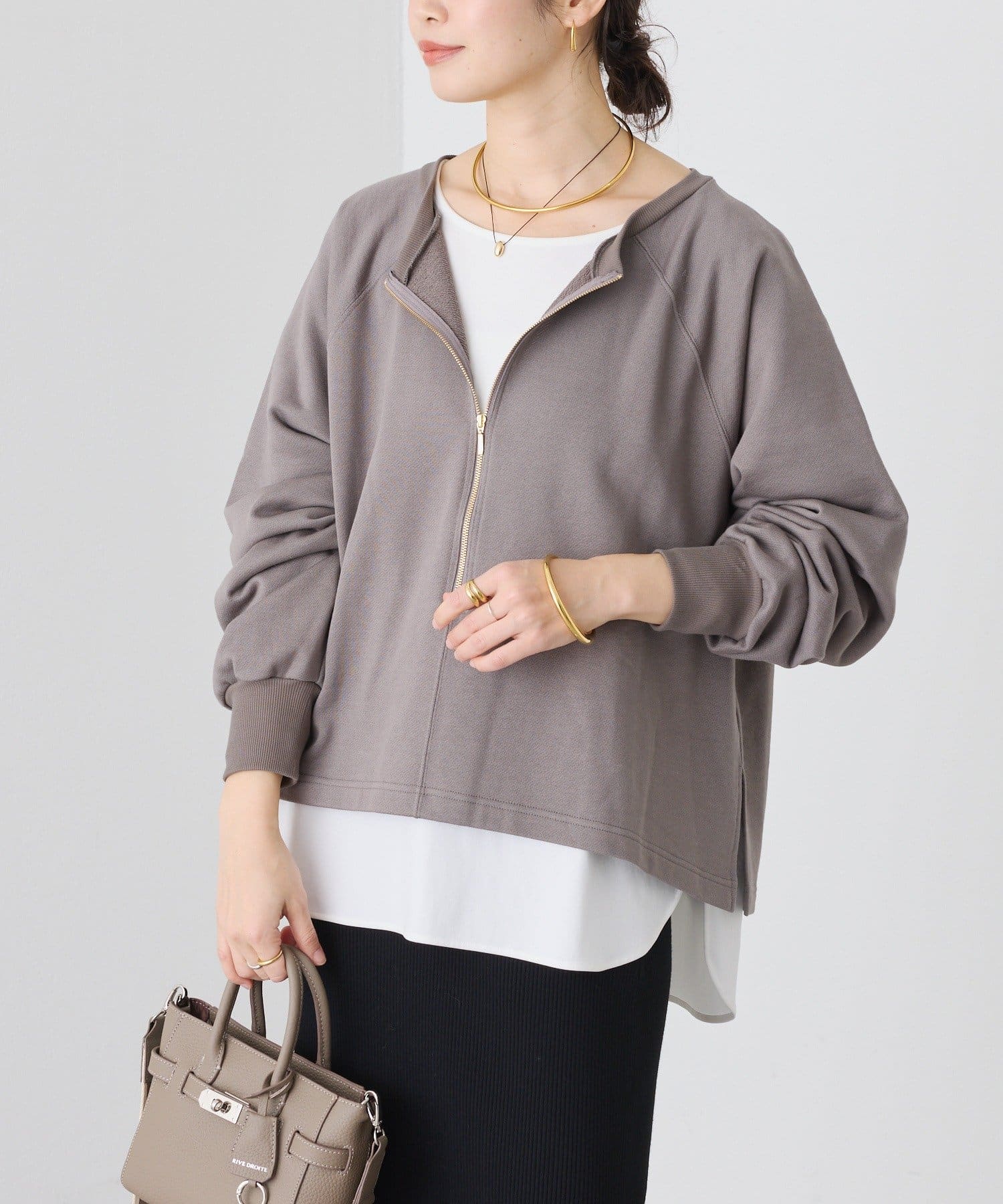 ・ゴールドのジップが華やかさをプラスして、キレイ目にも使える1着