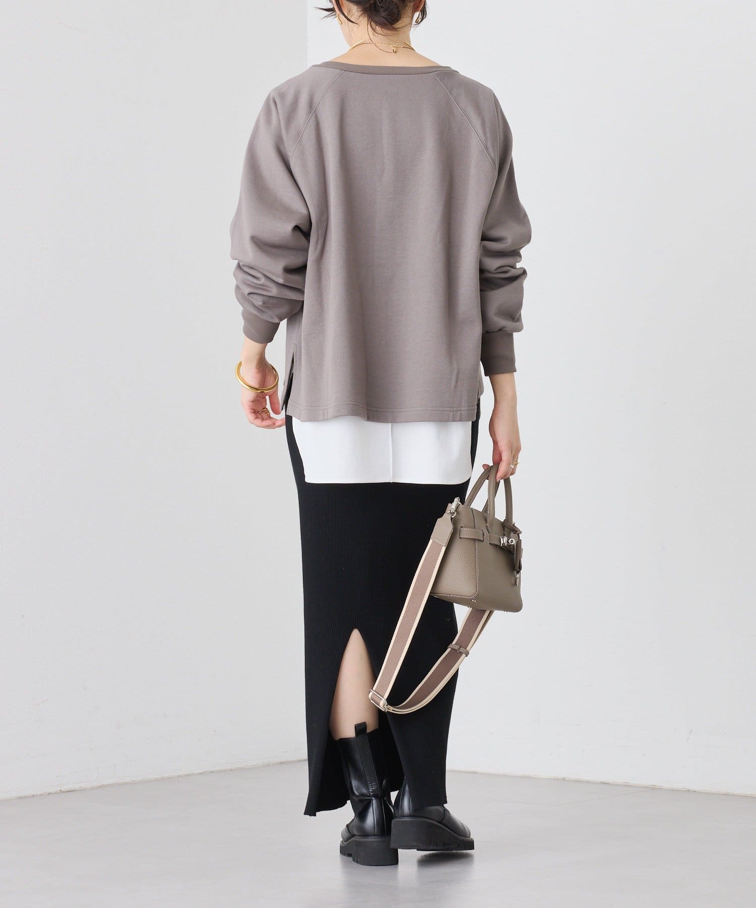 ・スカートでもパンツでもバランスの取りやすい後ろ下がりのシルエット