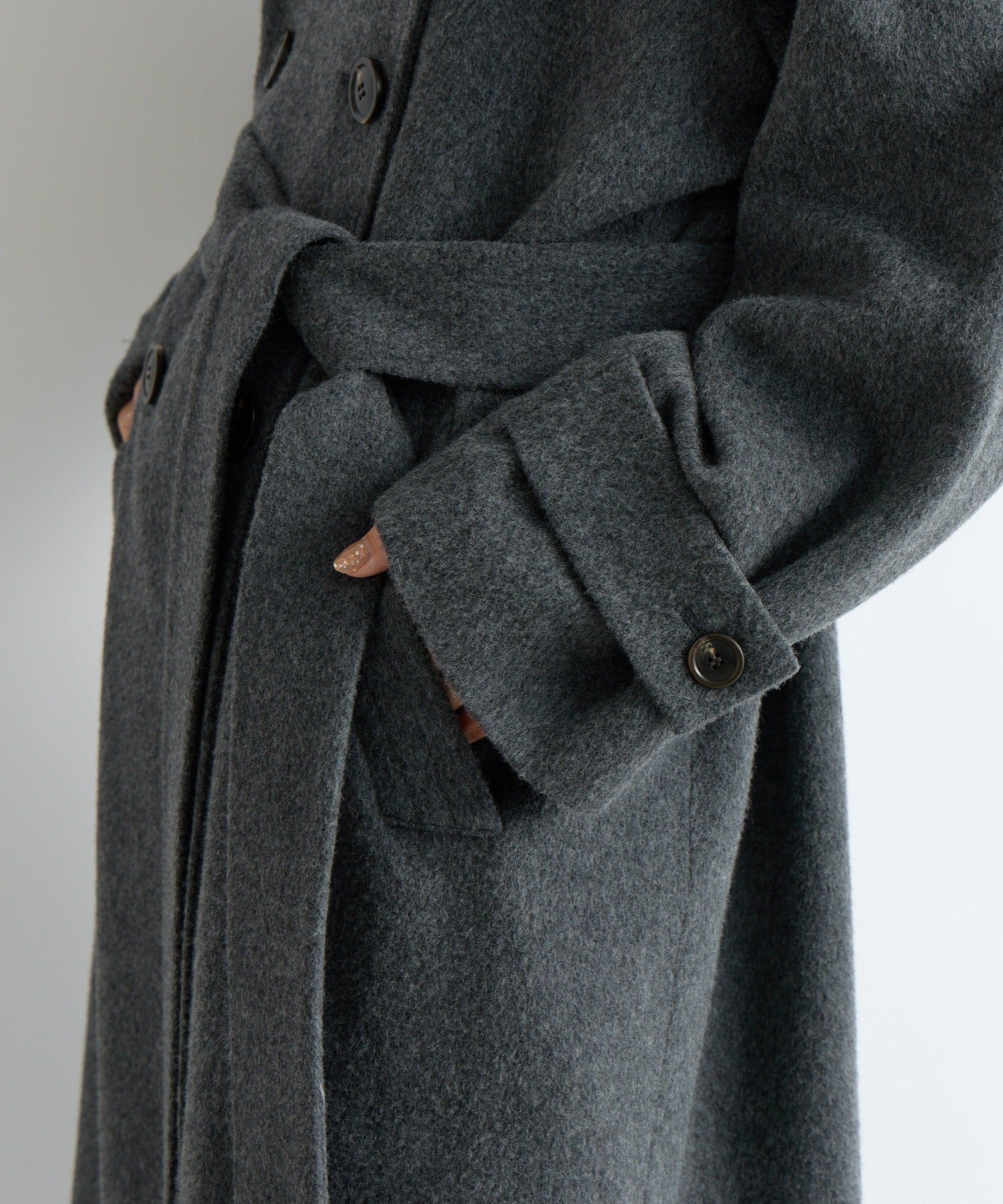 ウエスト紐もついておりますので、ラフに垂らして使うもよし、メリハリをつけてウエストマークするもよし、な、すっきり見えコートです。