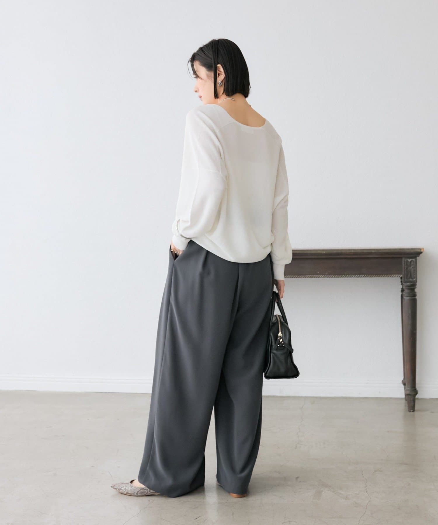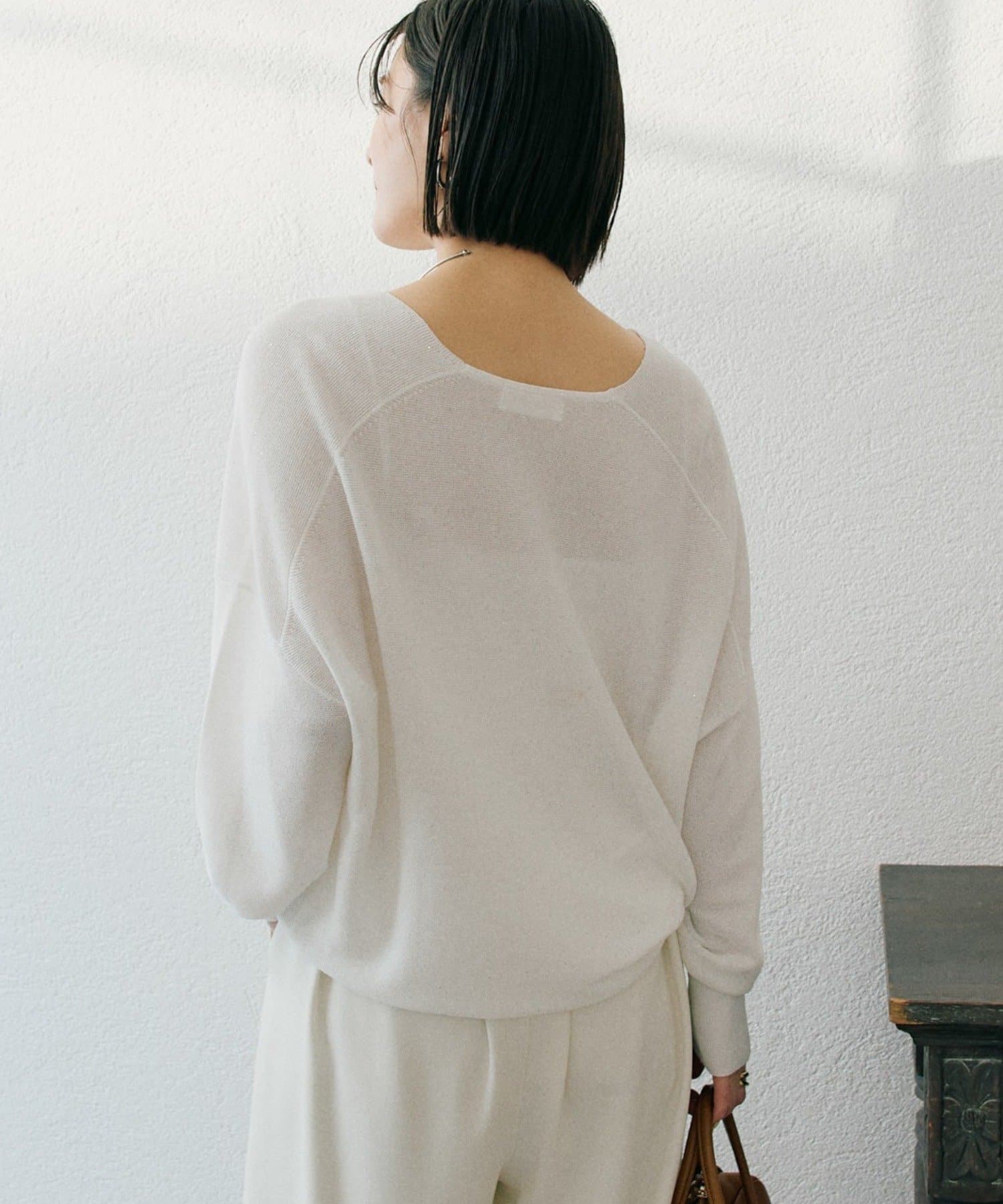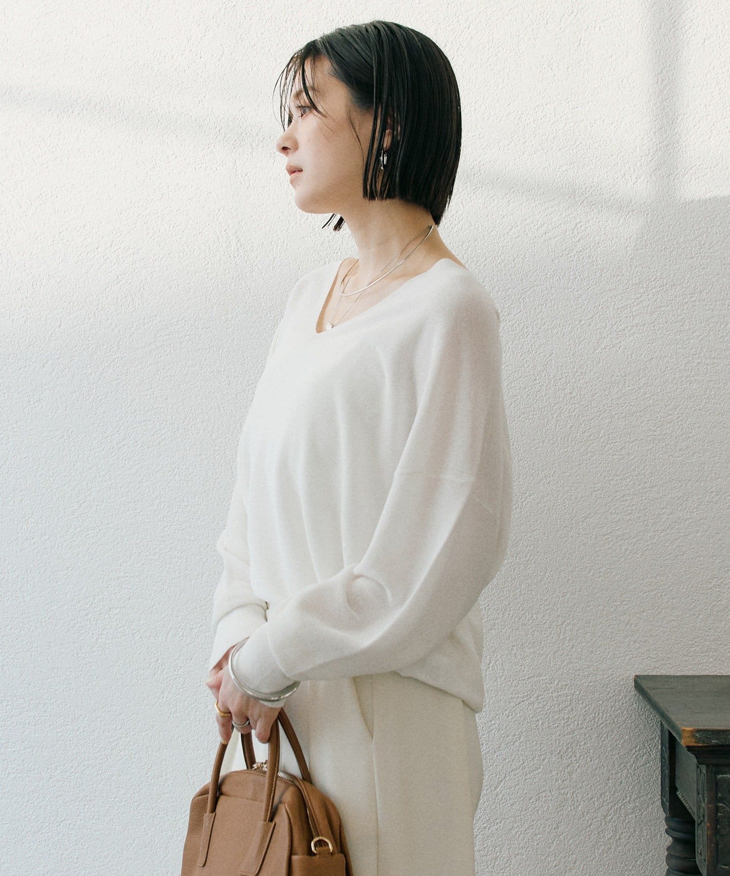 ・落ち感を活かしたバックコクーンシルエットと、デコルテを美しく見せるVネックがポイント。
