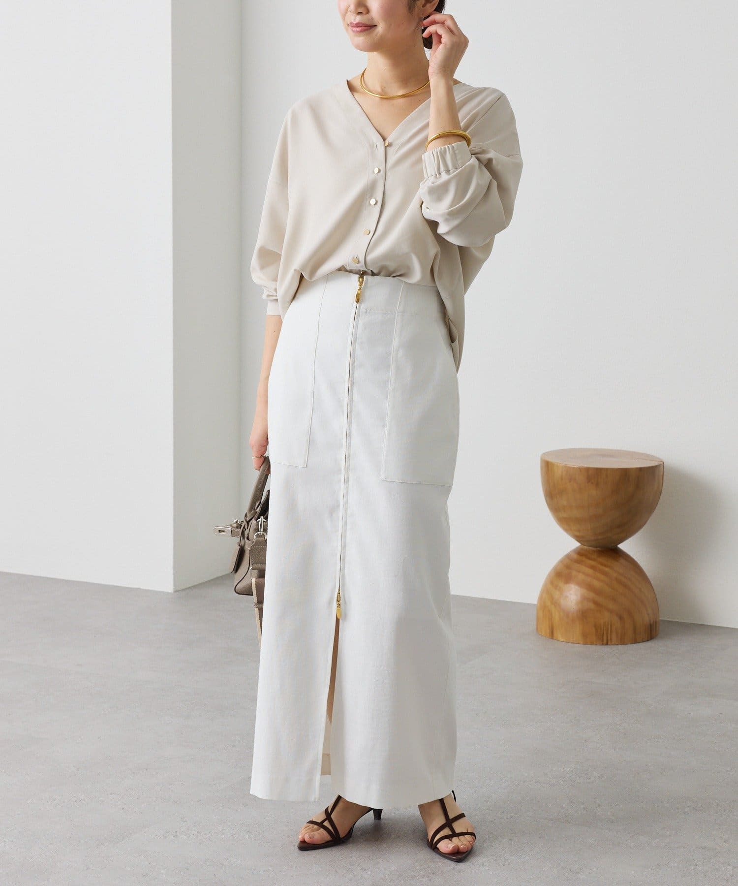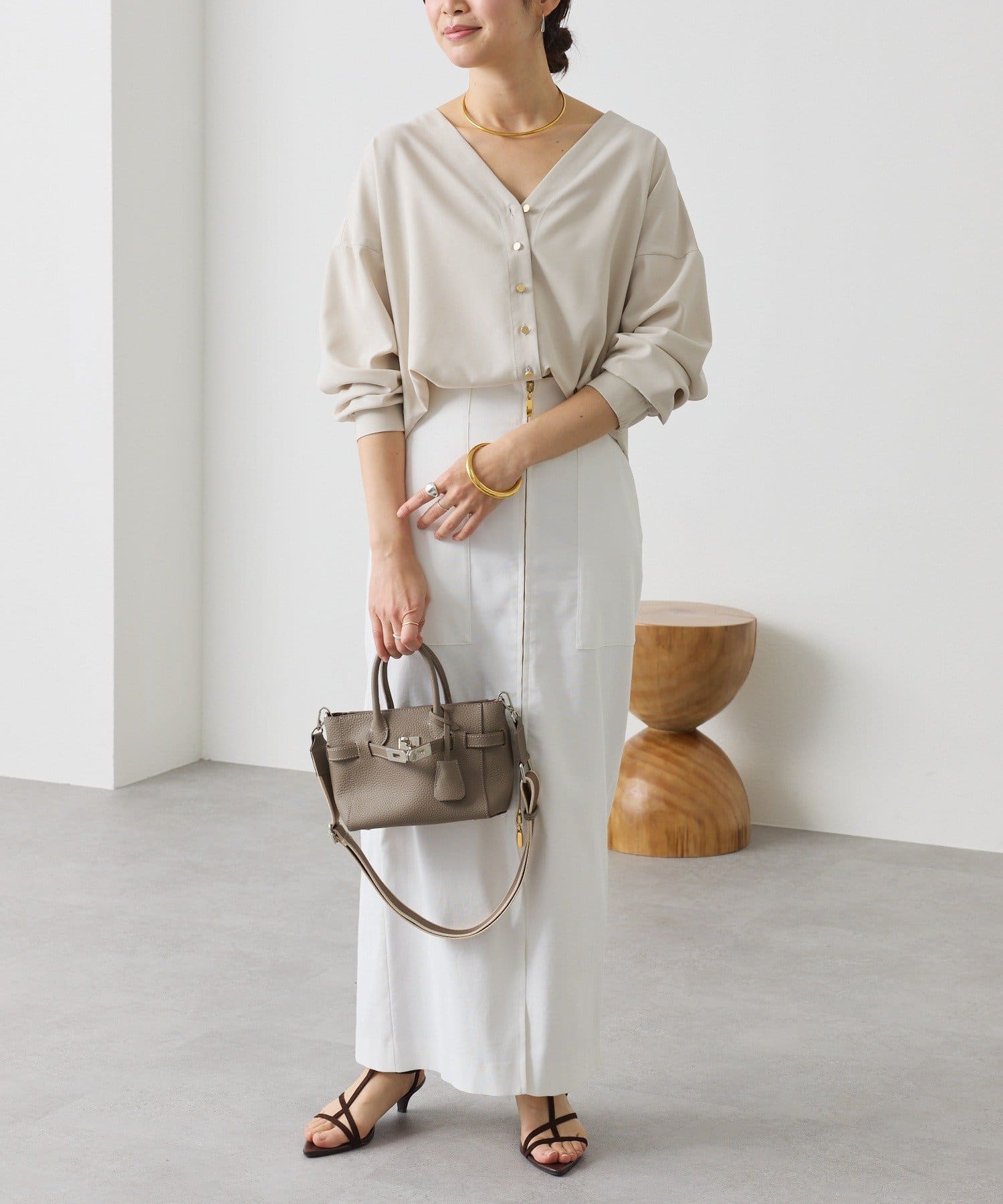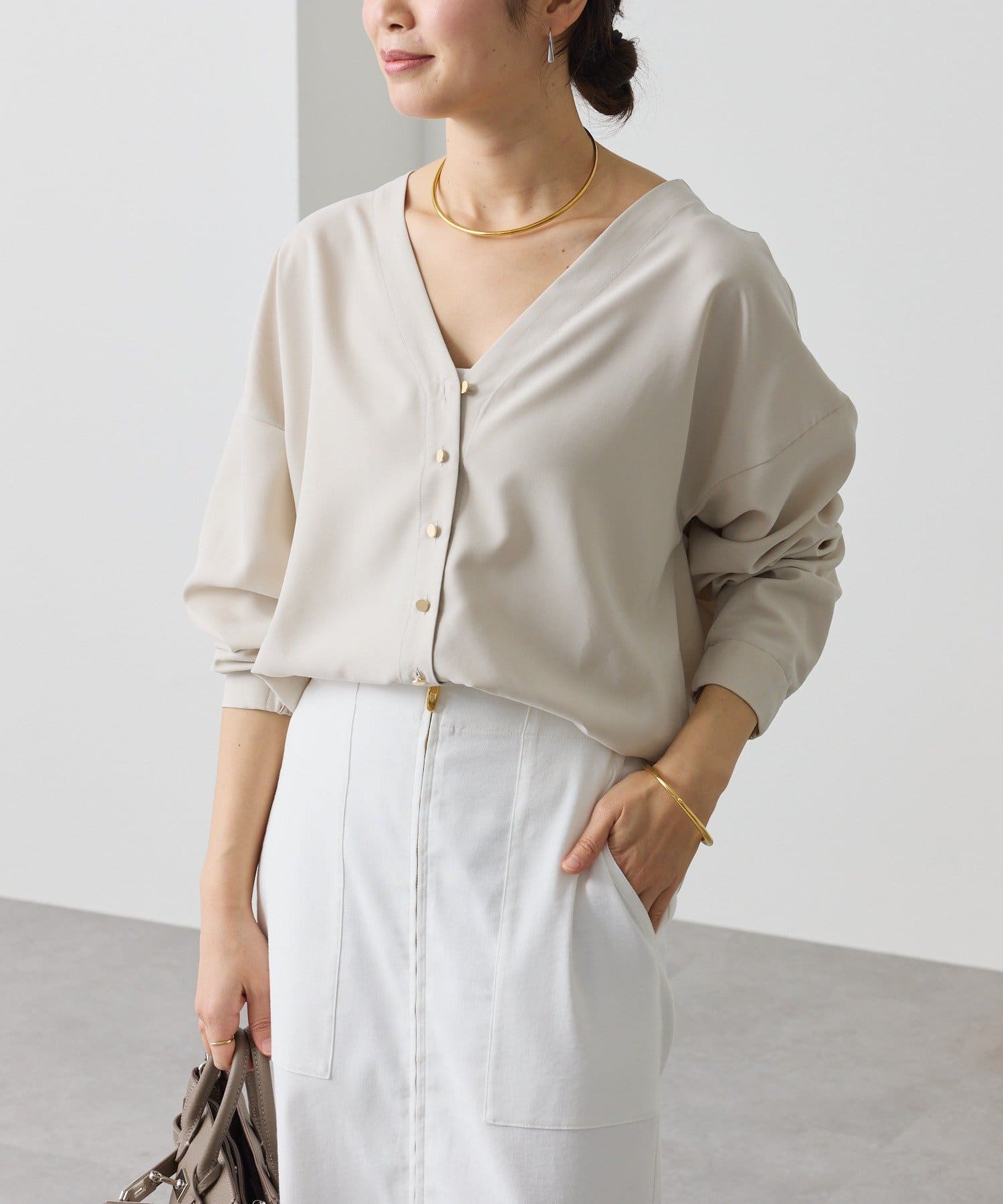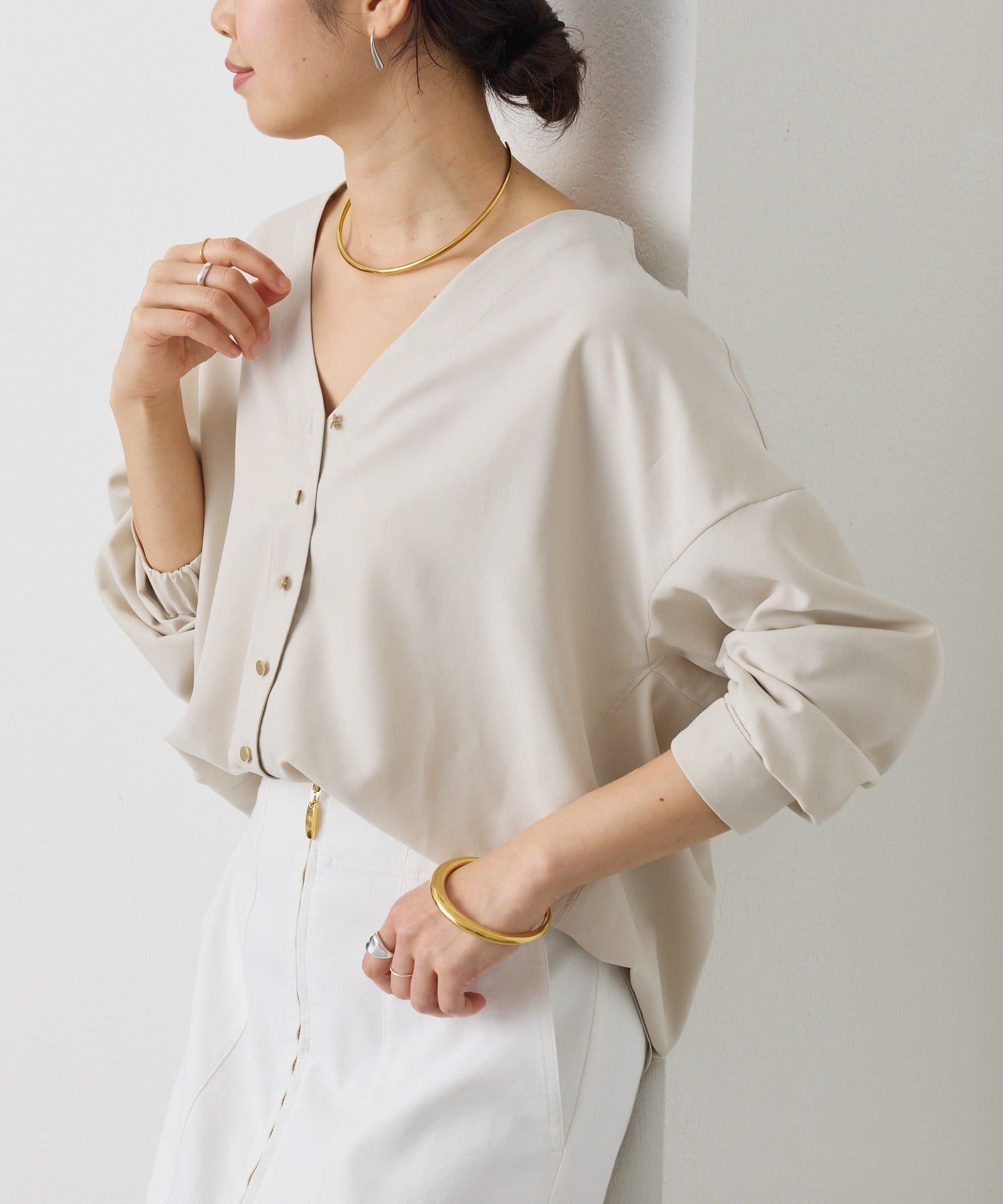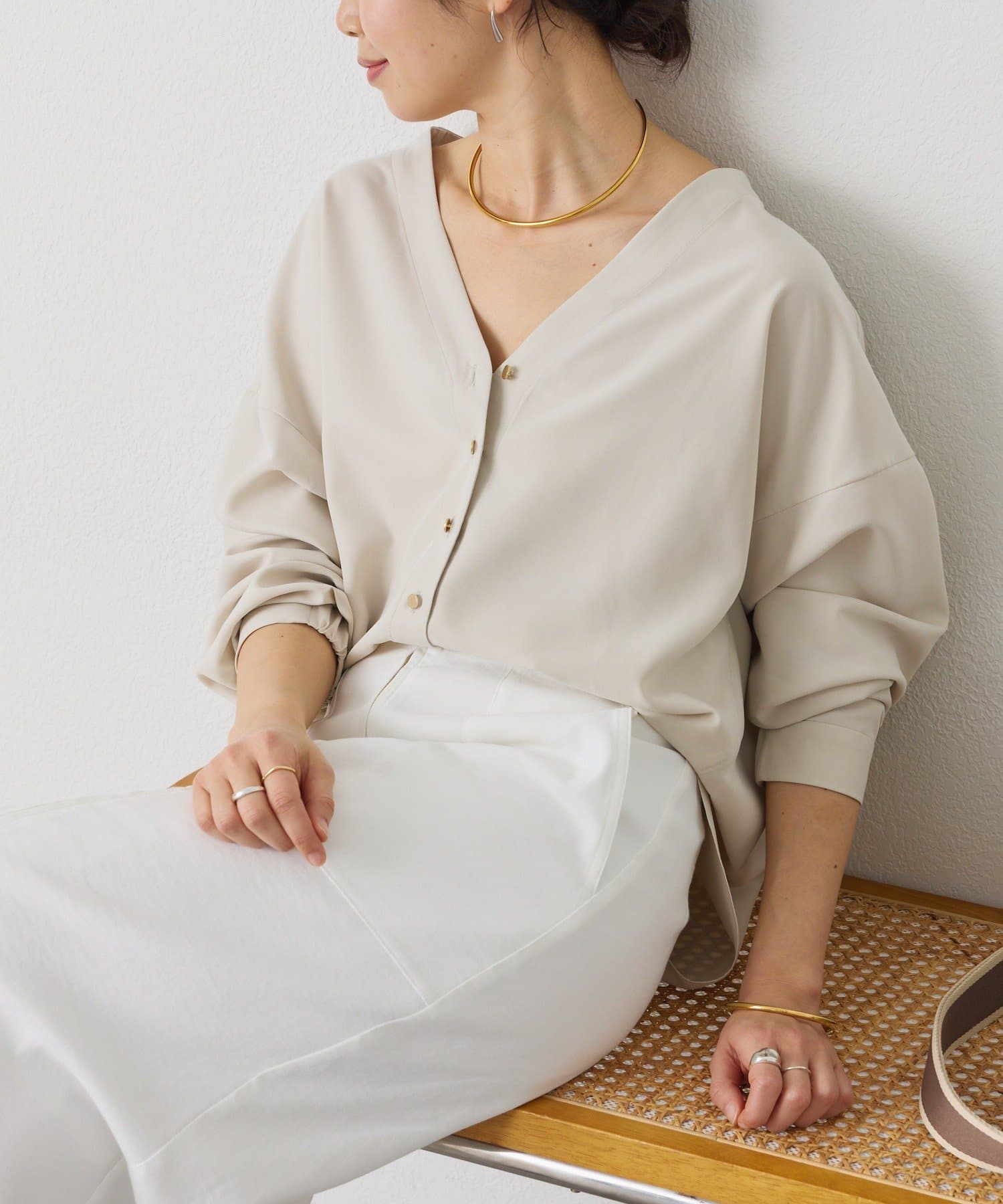 ・着るだけでこなれたムードを演出できる、エフォートレスなVネックブラウス。
