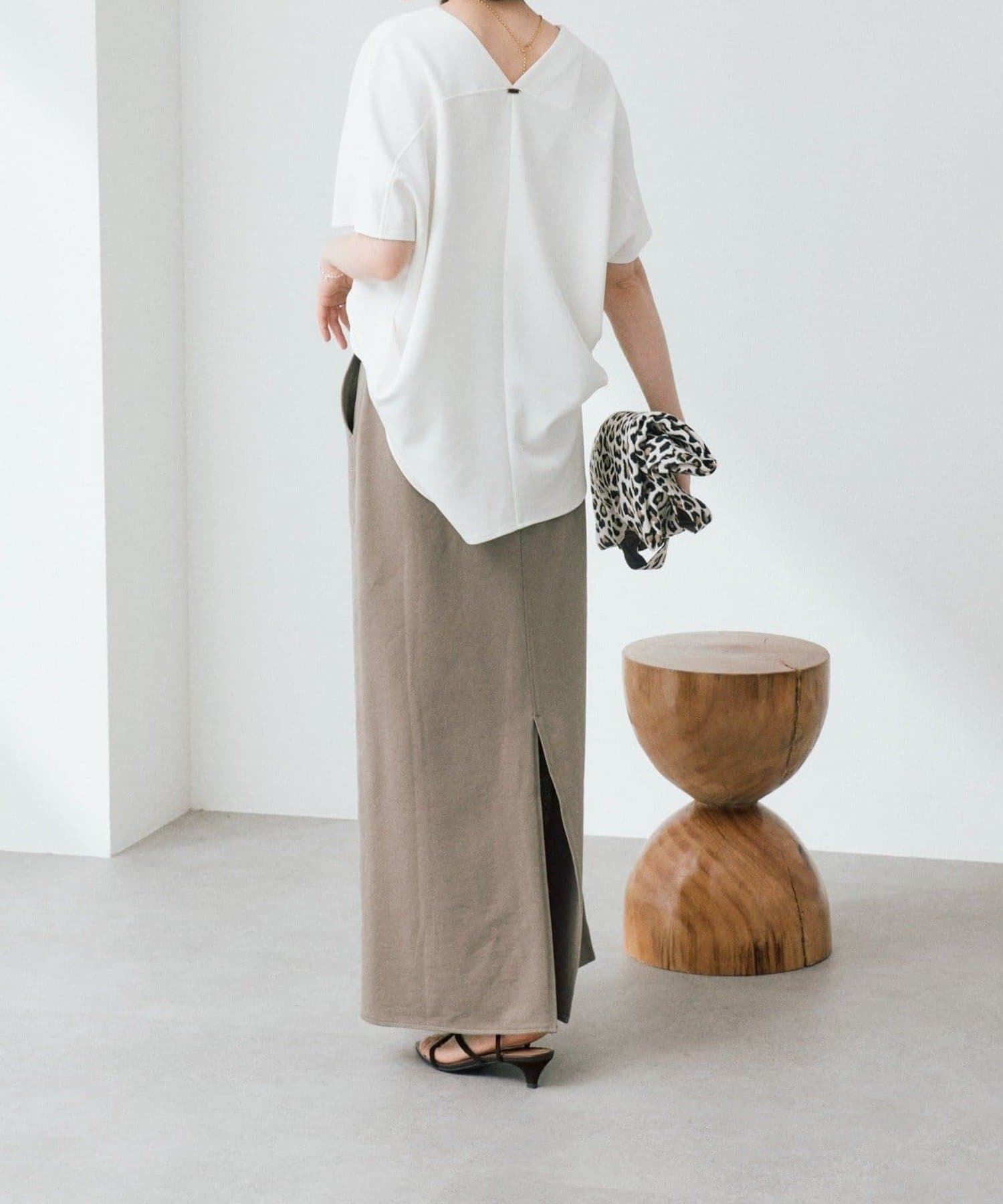 ・着丈を長めに設定することで、シンプルな中にも女性らしいムードを漂わせたデザインに仕上げました。潔いロング丈をルーズに着こなすのがポイントです。