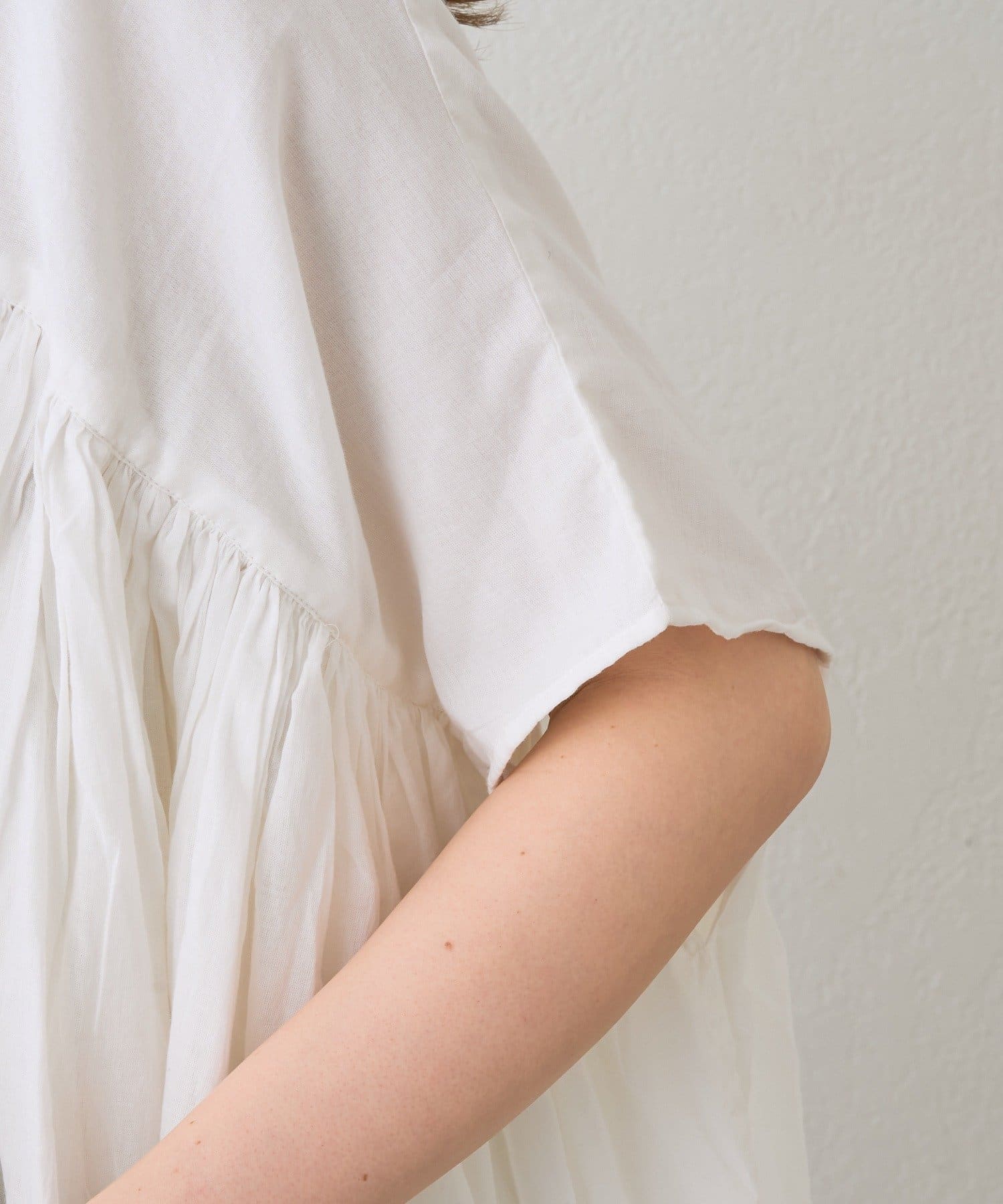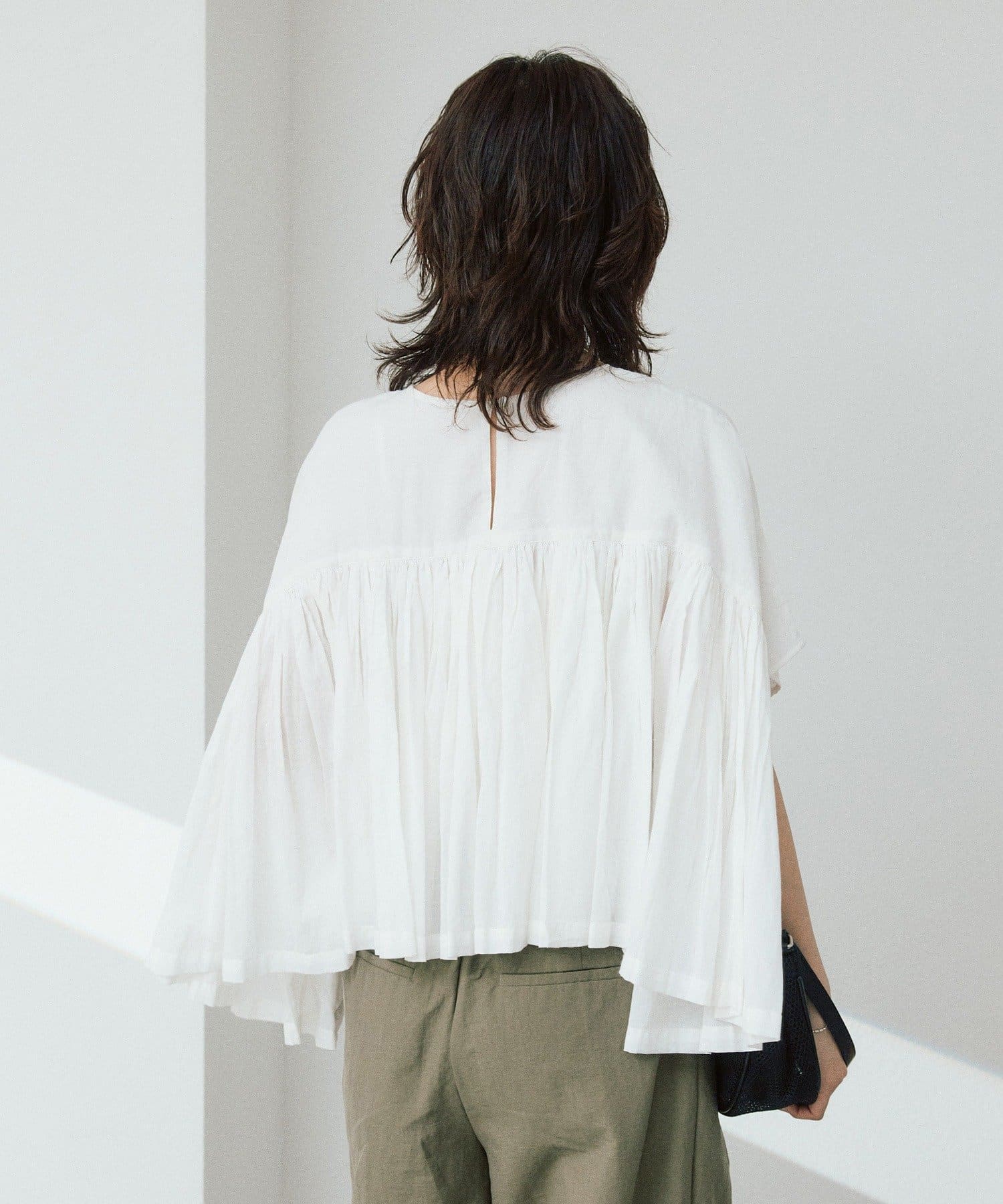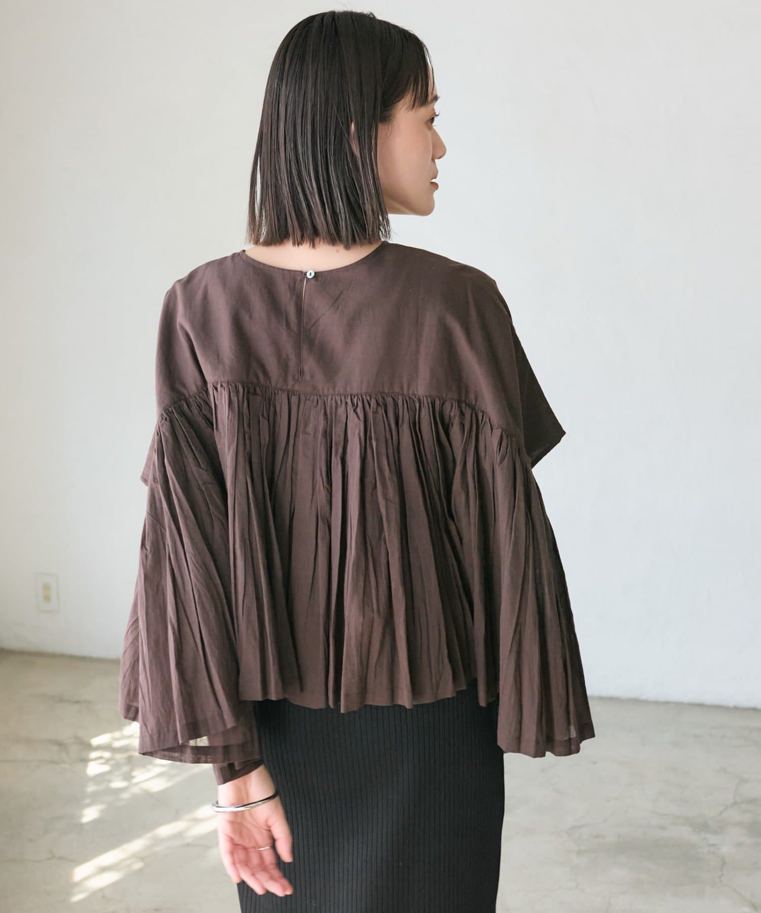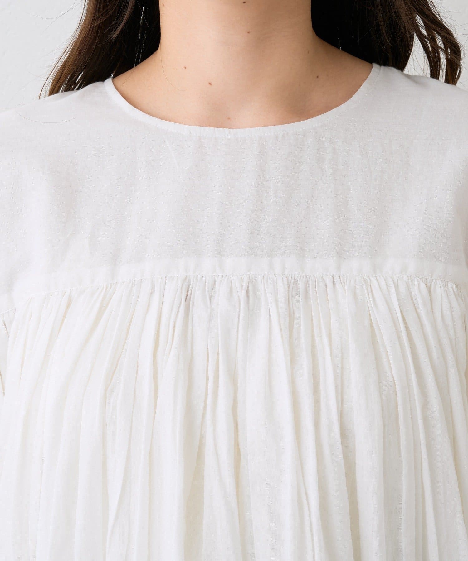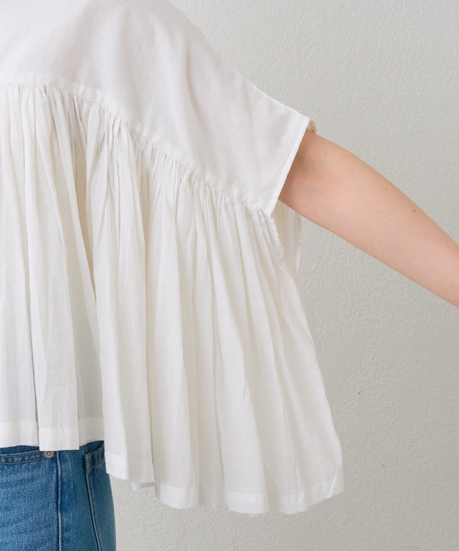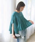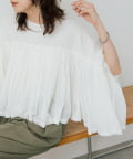 ・胸元の切り替え部分から袖下までギャザーをいれたことで、動きのある軽やかなデザインがポイント。