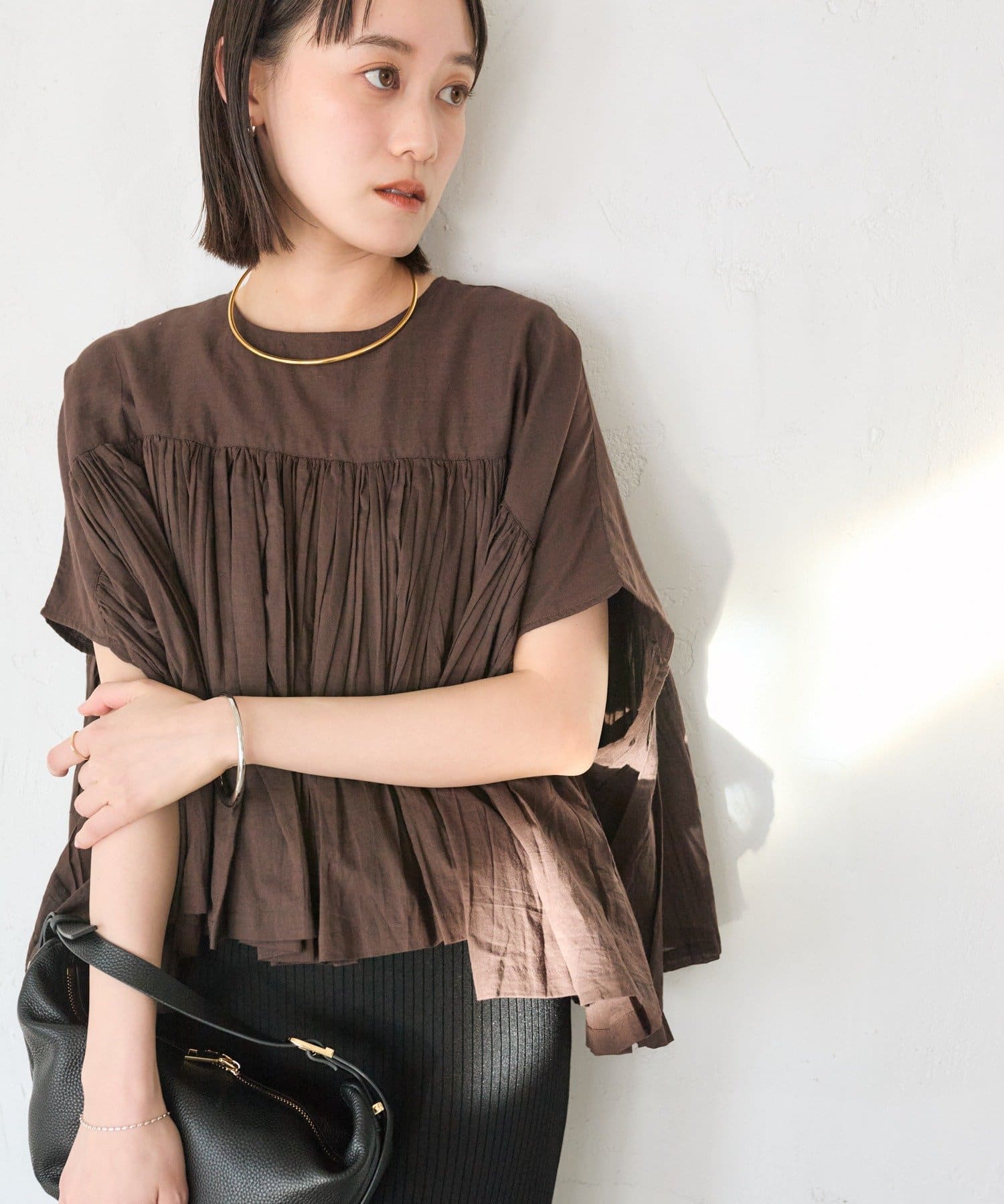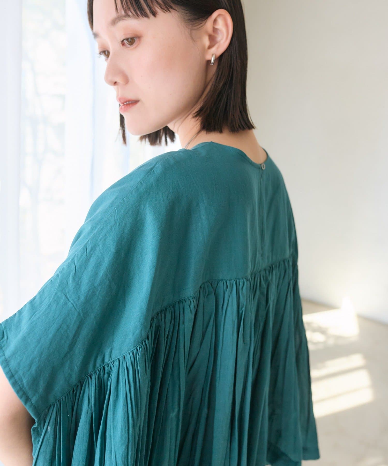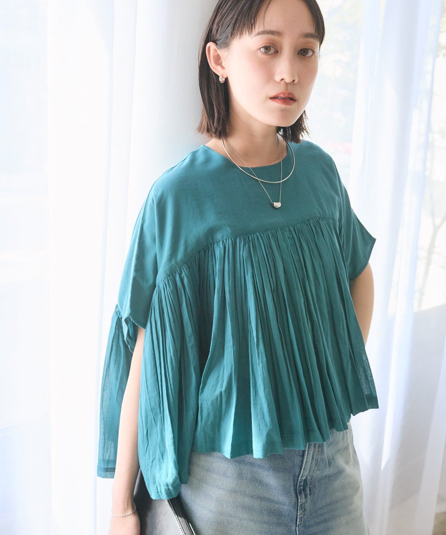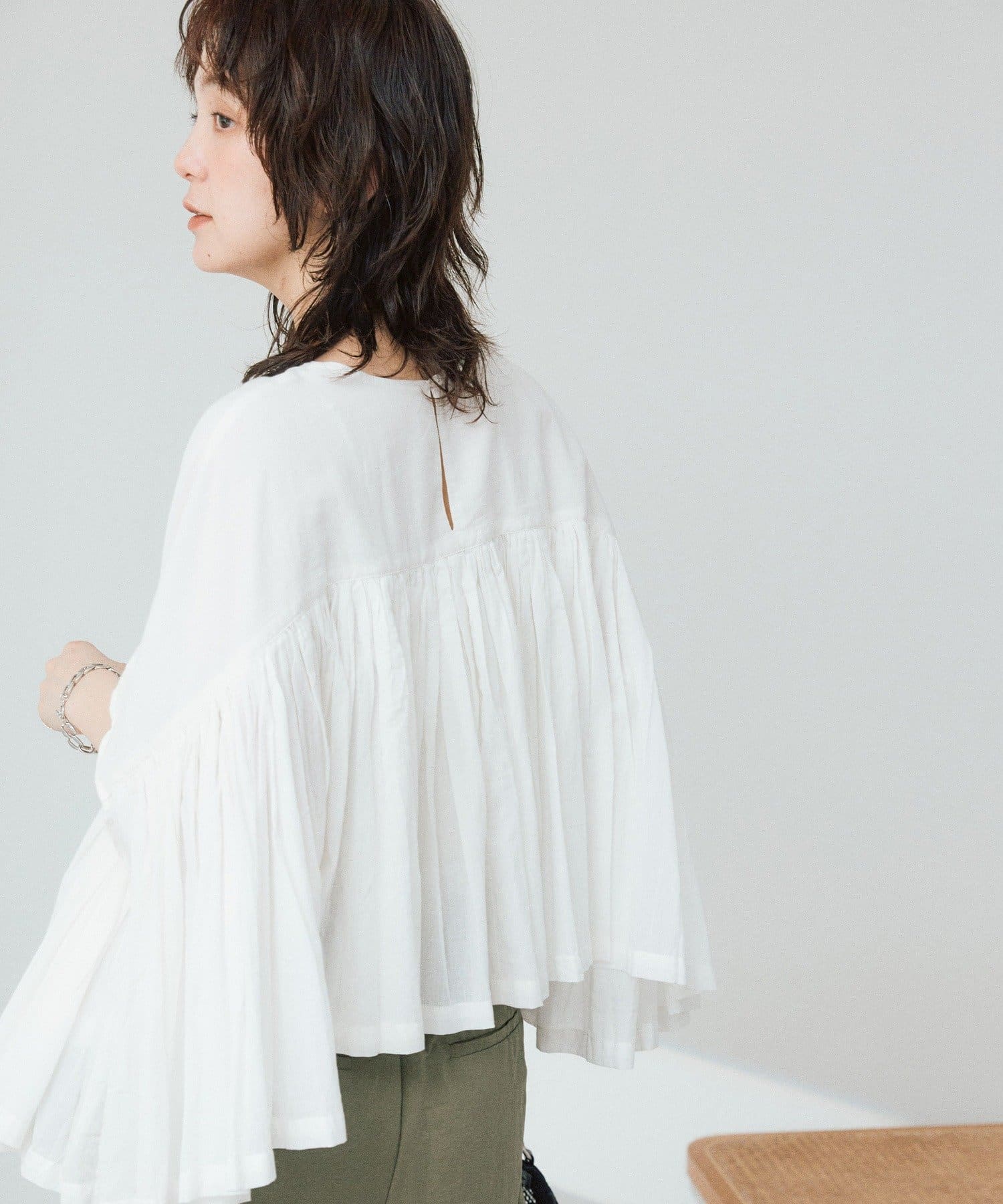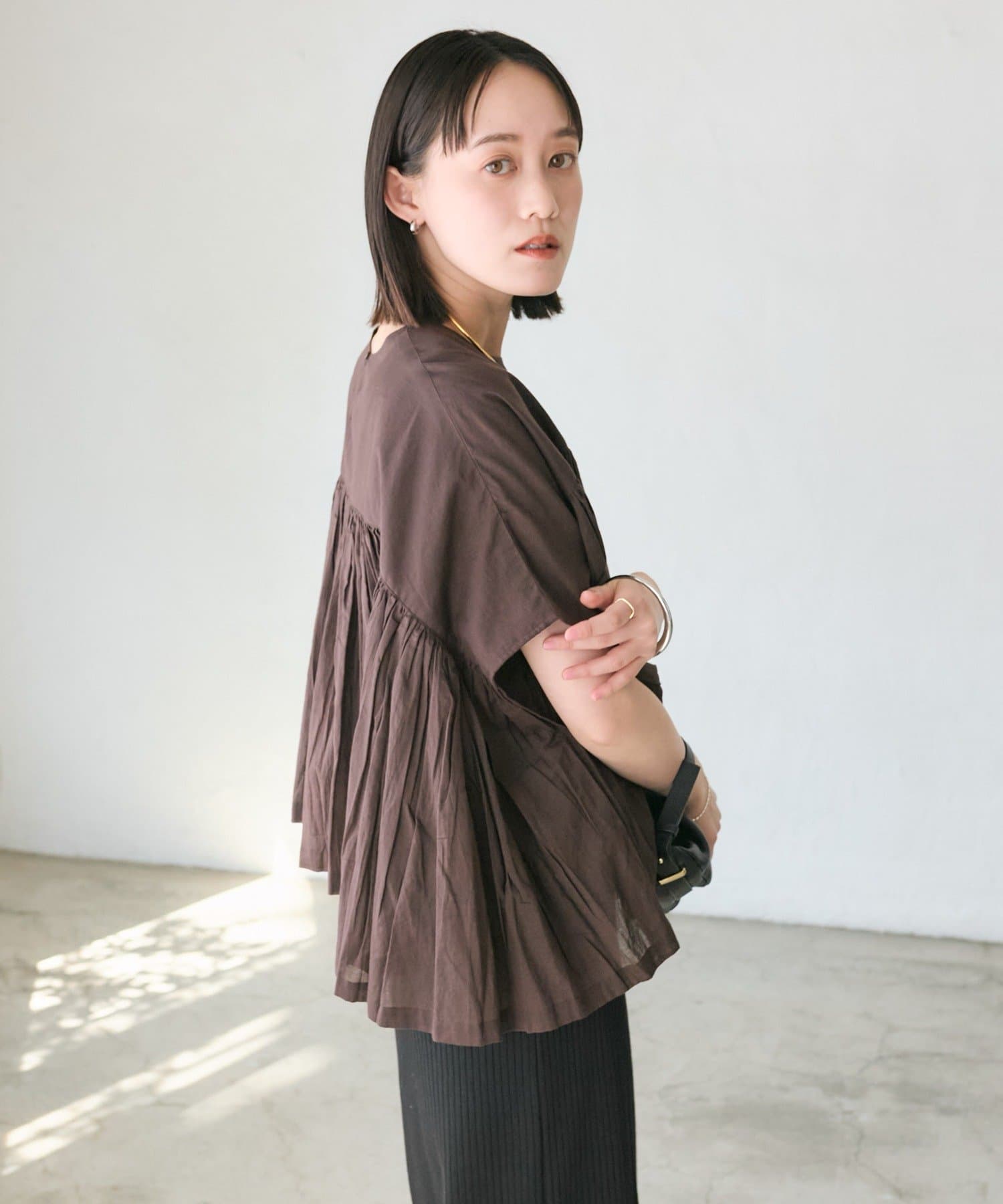 ・胸元の切り替え部分から袖下までギャザーをいれたことで、動きのある軽やかなデザインがポイント。