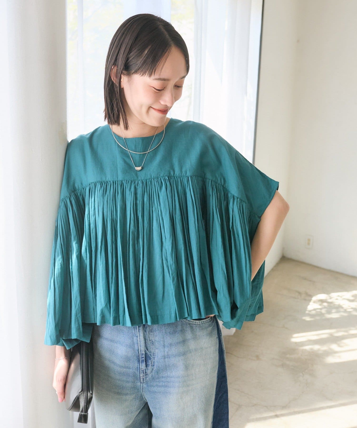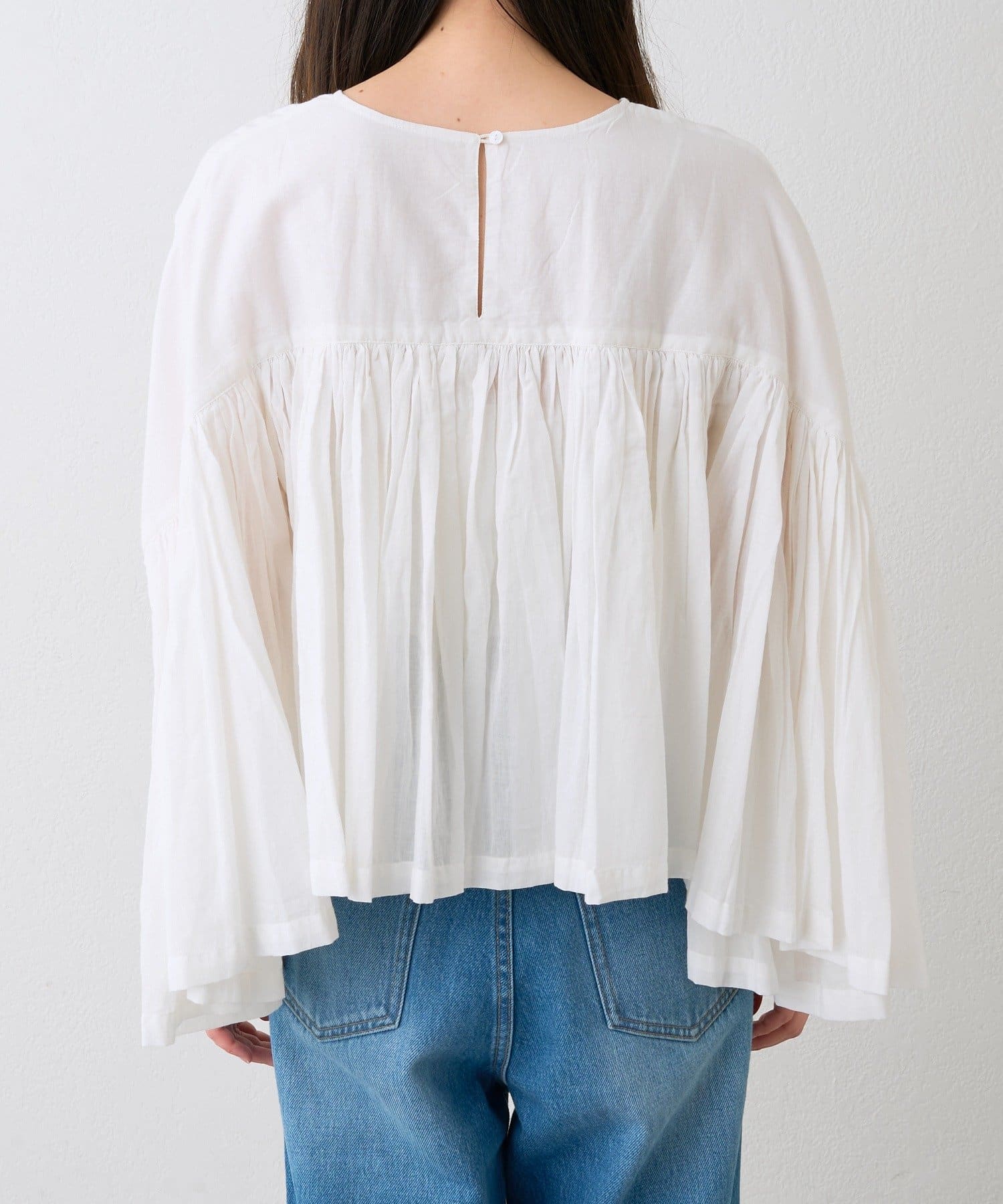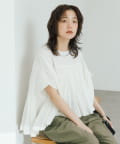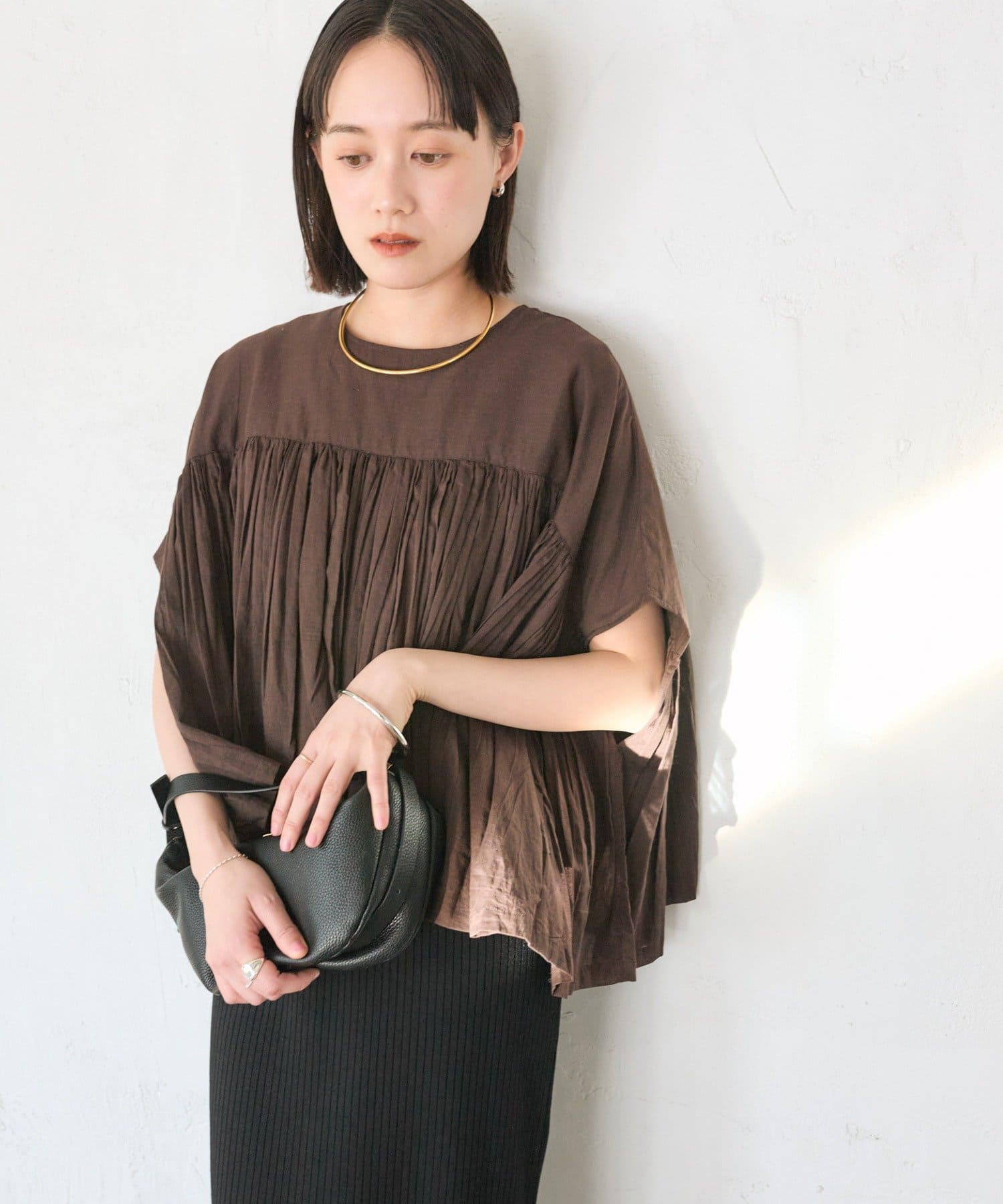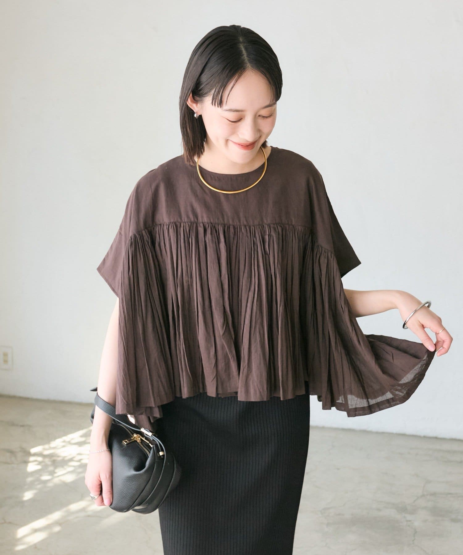 ・胸元の切り替え部分から袖下までギャザーをいれたことで、動きのある軽やかなデザインがポイント。